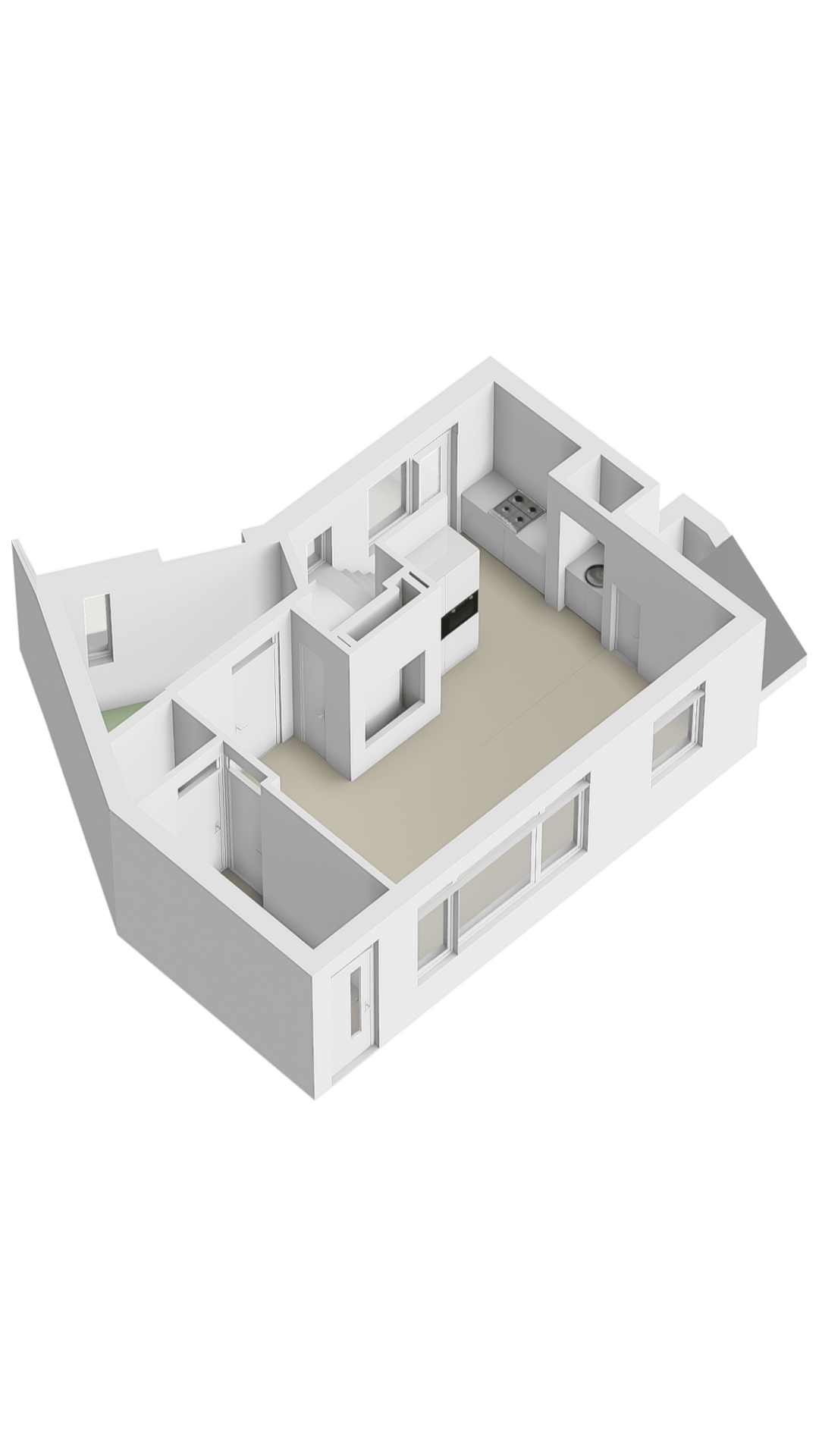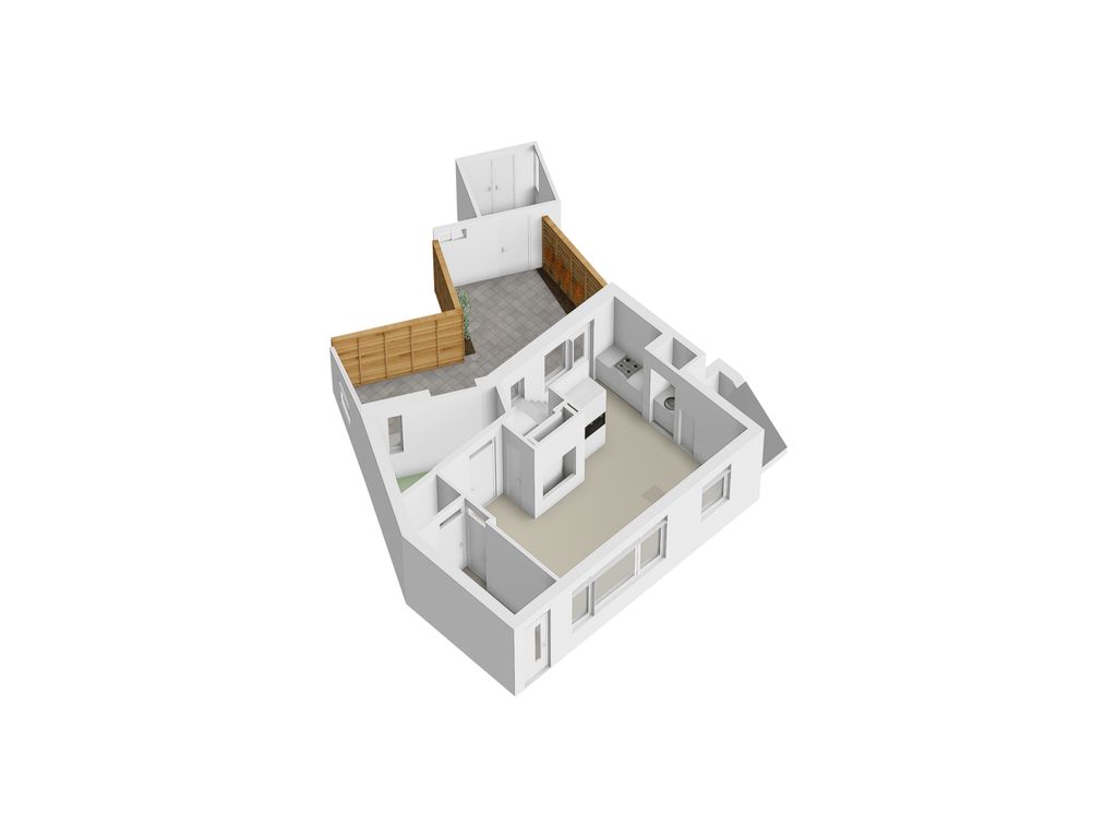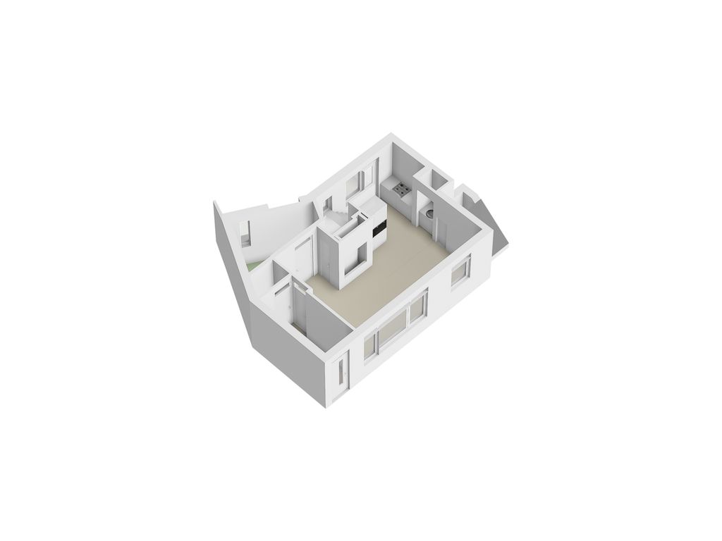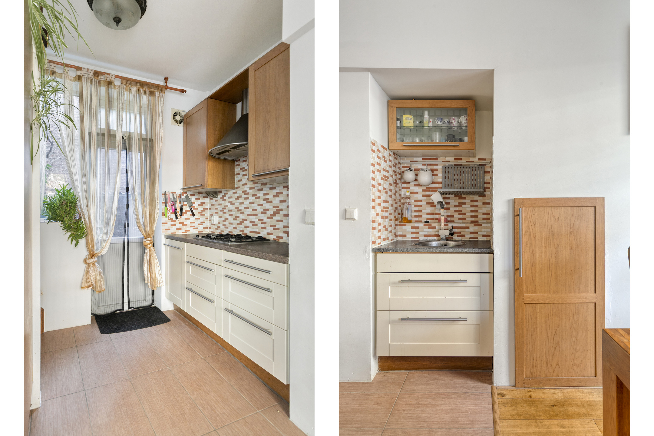 De hal van het appartement biedt toegang tot de woonkamer met open keuken. In de hal bevindt zich het toilet, welke halfhoog is betegeld en is voorzien van een hangend closet en handwasbakje. Het appartement is voorzien van grote raampartijen en heeft een fijne lichtinval. Aansluitend aan de woonkamer van circa 21 m² bevindt zich een extra ruimte van circa 5 m², welke uitstekend geschikt is als kantoor-/hobbyruimte, of als gastenkamer. De open keuken van circa 8 m² is voorzien van een op maat passende inrichting met o.a. 4-pits gaskookplaat, afzuigkap, koelkast, oven en magnetron. Op de begane grond is voldoende bergruimte te vinden waaronder een grote trapkast!