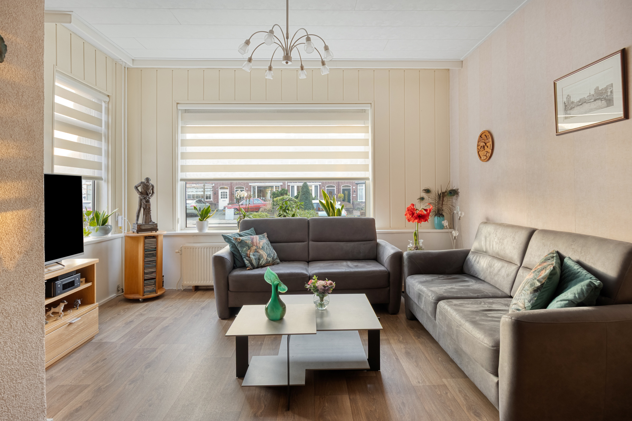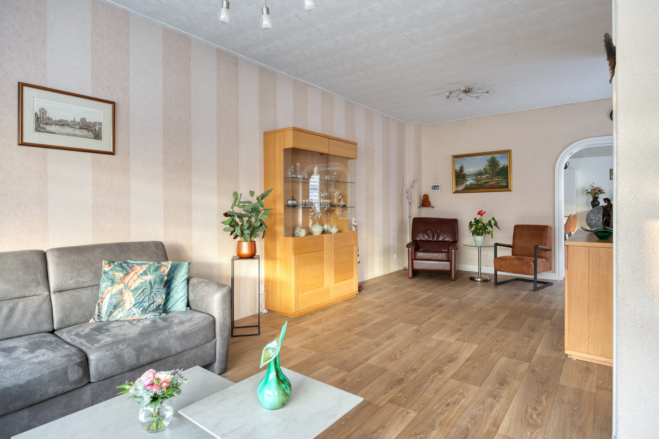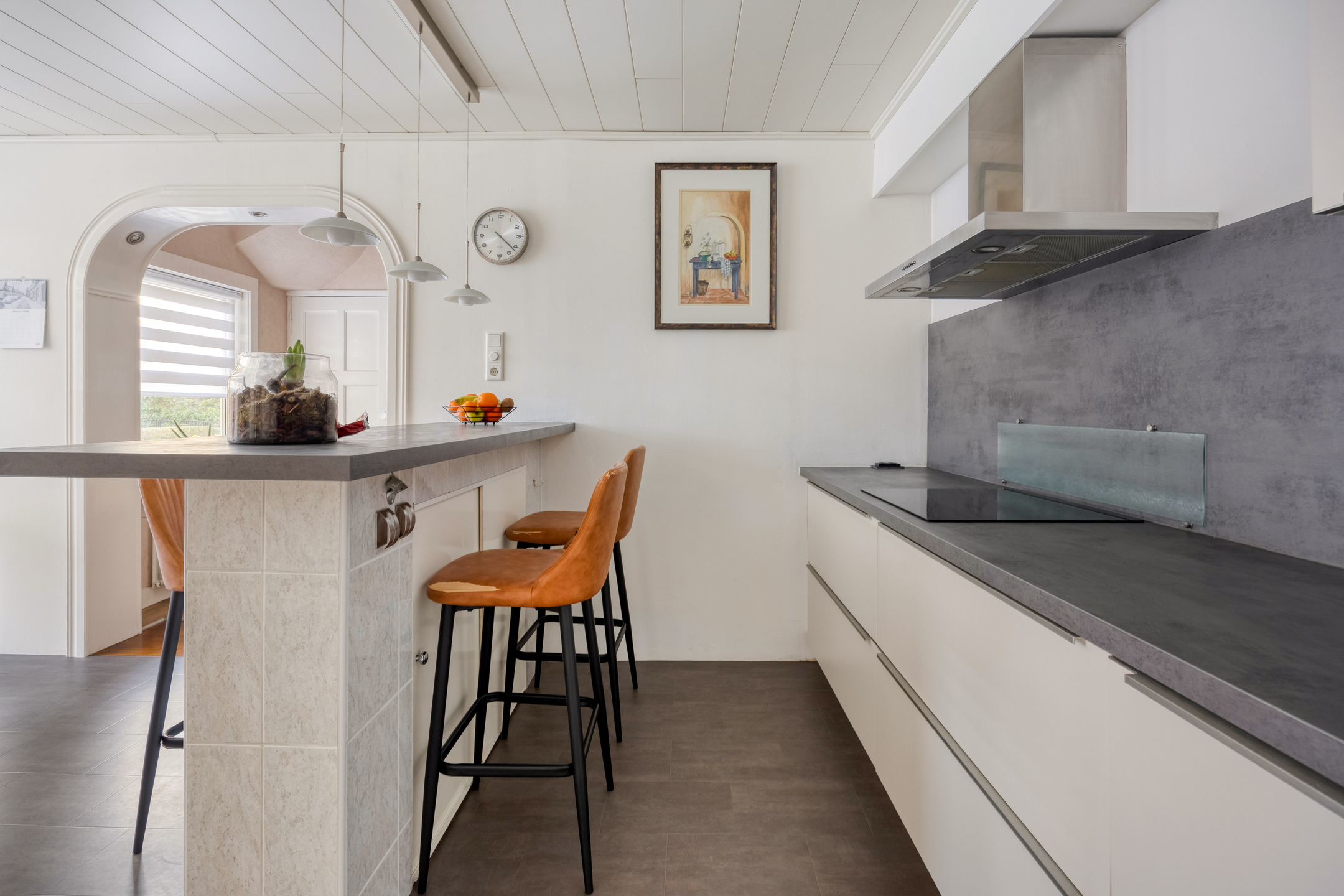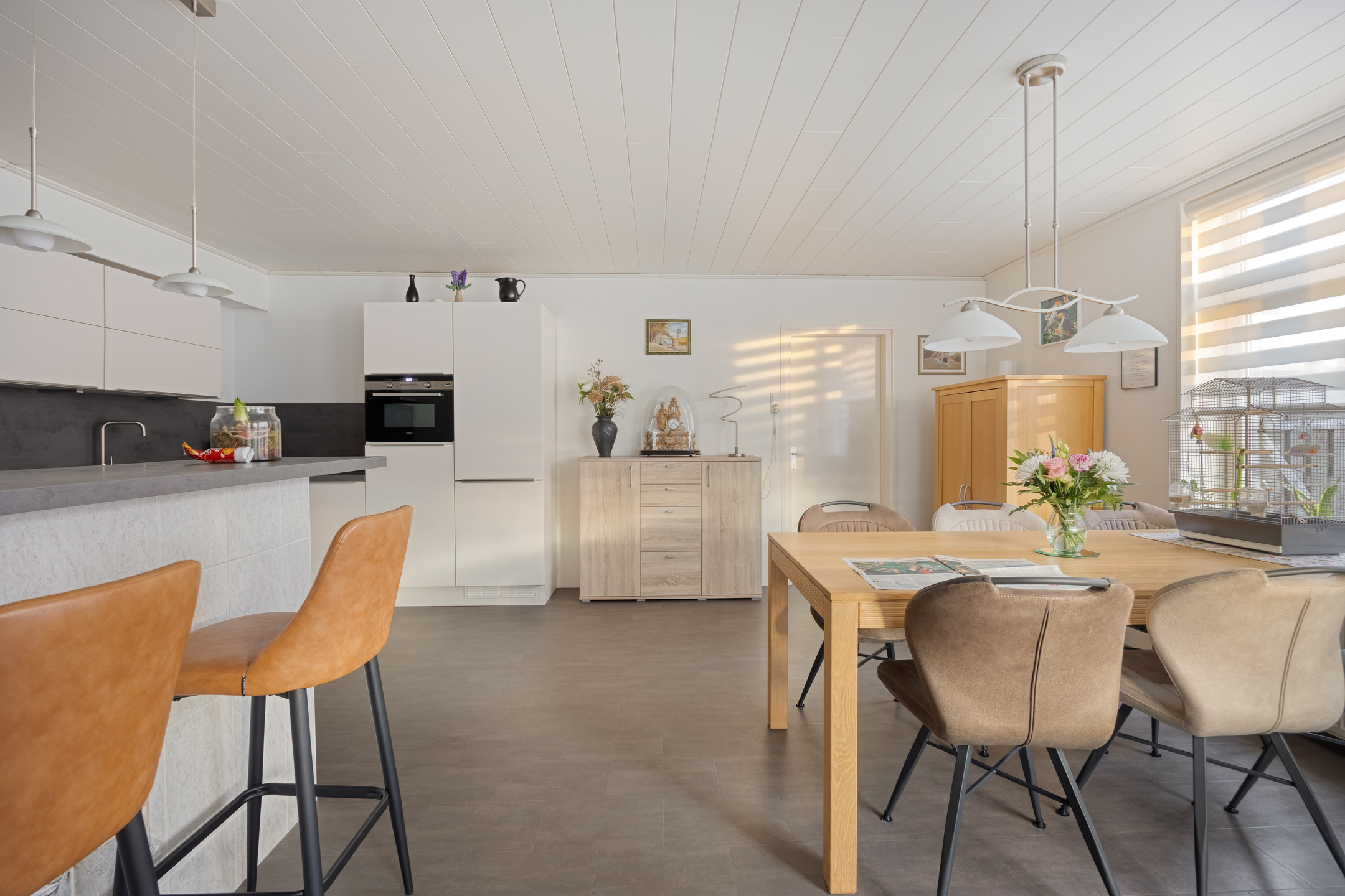 Hal/portaal met trapopgang, garderoberuimte en een deur naar de sfeervolle woonkamer (circa 34 m²). De woonkamer is voorzien van panelen plafond- en wandafwerking, voldoende daglicht door middel van grote raampartijen die uitzicht bieden op de royale voor- en zijtuin, een laminaatvloer en een trap-/bergkast waarin de elektrische installatie. Toog naar de riante woonkeuken van circa 27 m² met daarin de in 2019 geplaatste moderne keuken in hoekopstelling met kleine bar en inbouwapparatuur. O.a. voorzien van een afzuigkap, inductie kookplaat, koel-/vriescombinatie, combi-oven, vaatwasmachine, een moderne hoekkast en veel bergruimte. Vanuit de keuken toegang tot de hal met daarin toegang tot de royale, inpandige, geheel betegelde badkamer welke is voorzien van een panelen plafond, apart ligbad, douchecabine, een wastafelmeubel en een design radiator. Gang met daarin het geheel betegelde toilet met handwasbakje, opstelling wasmachine-/drogeraansluiting en deur naar de achtertuin.
