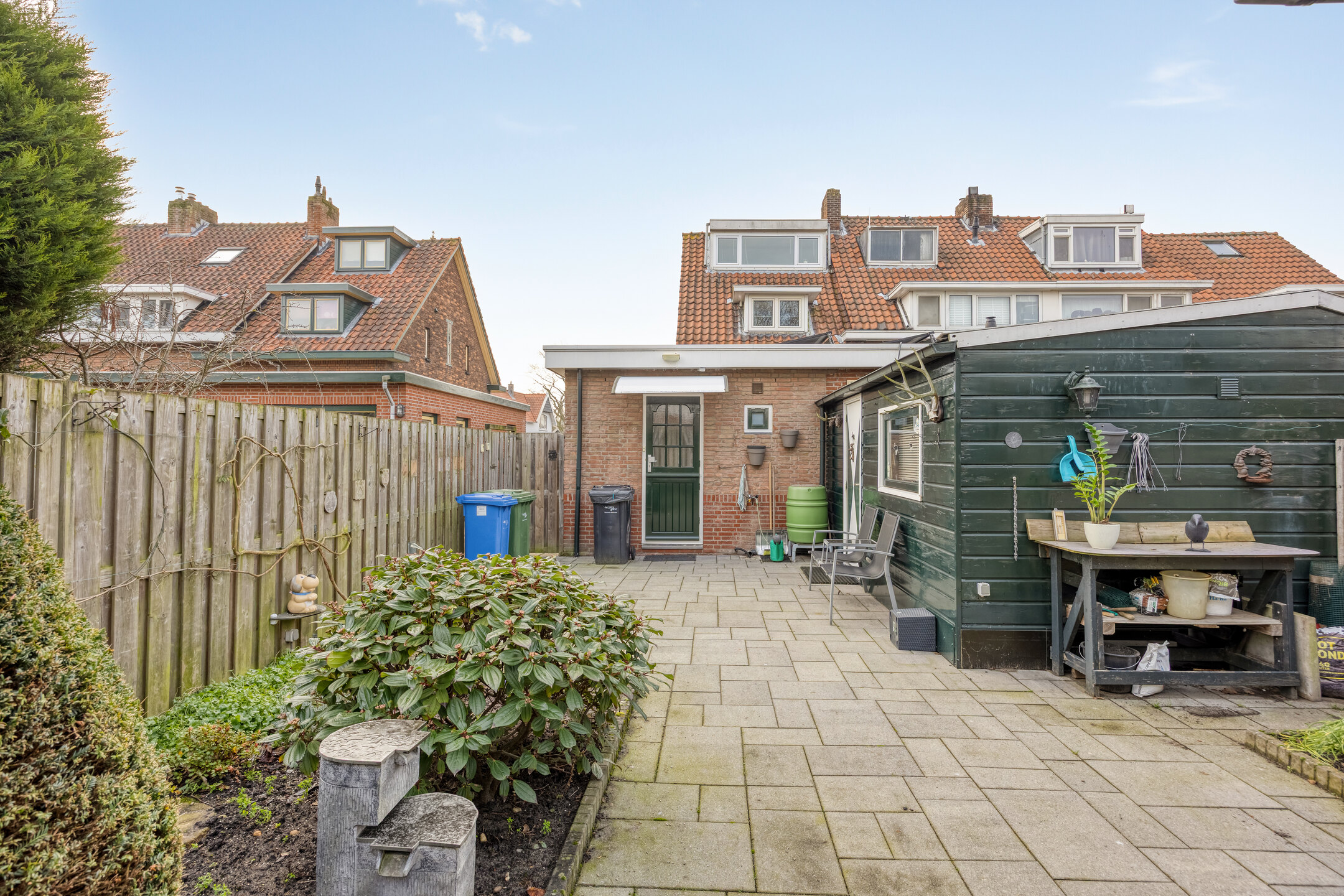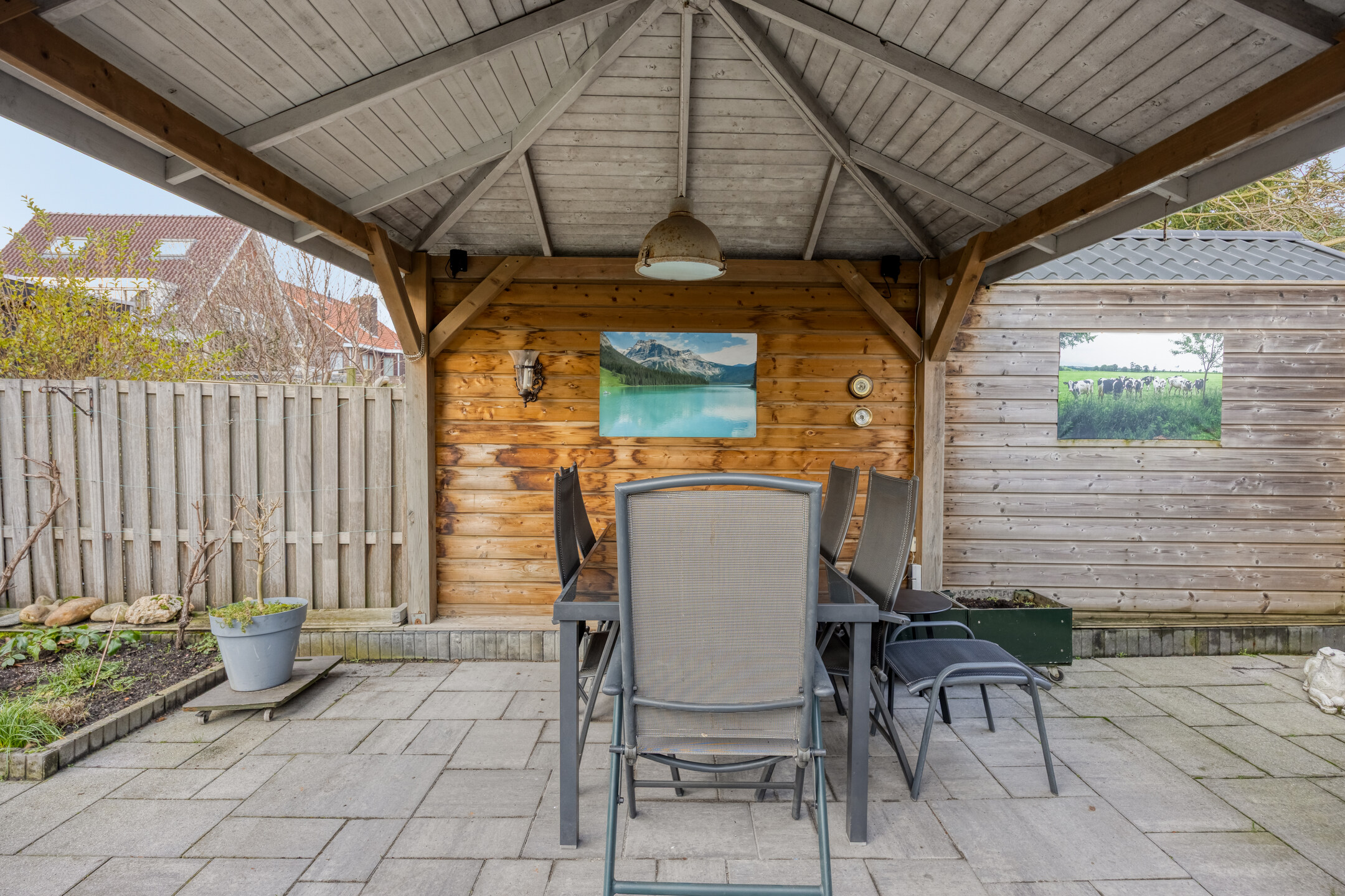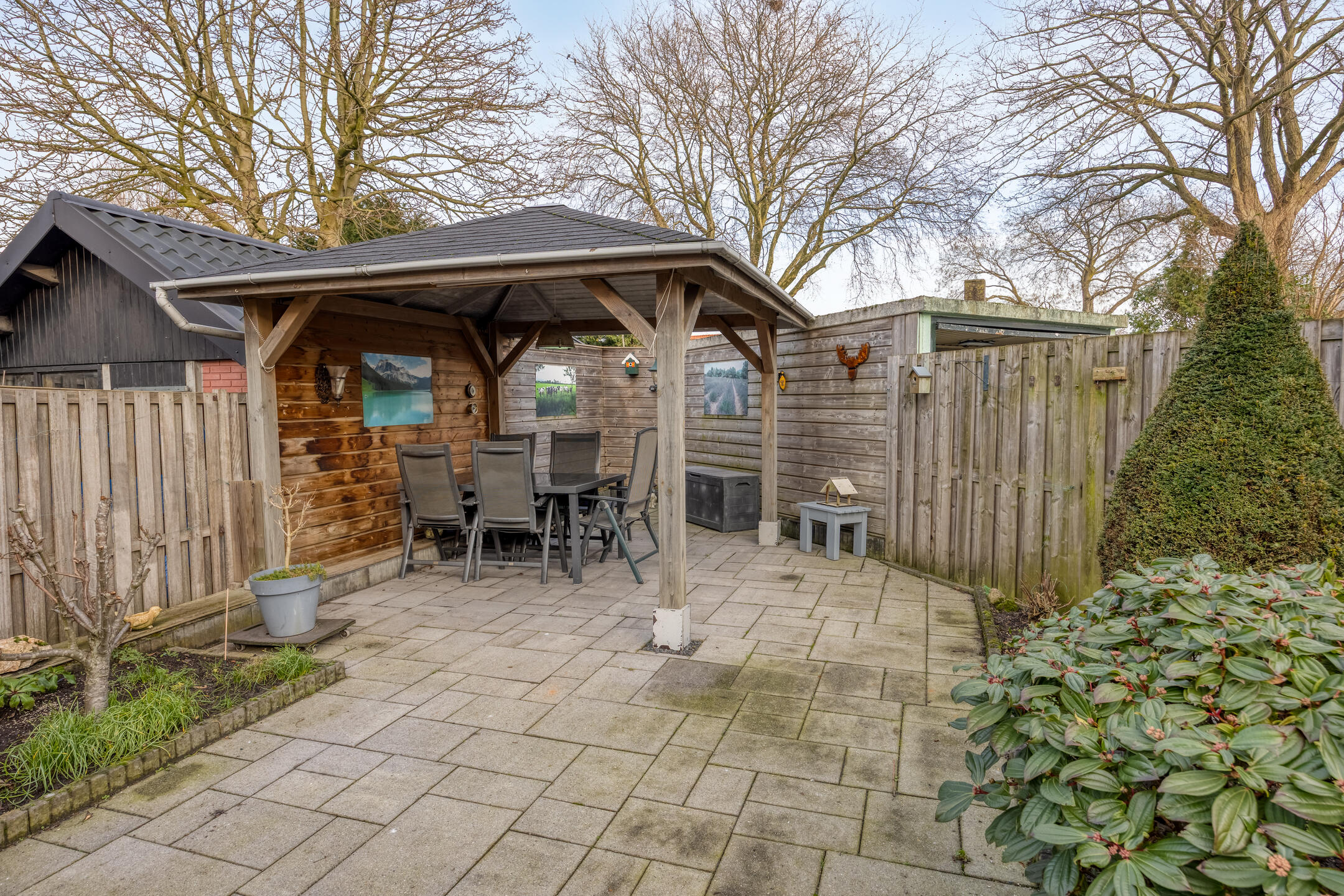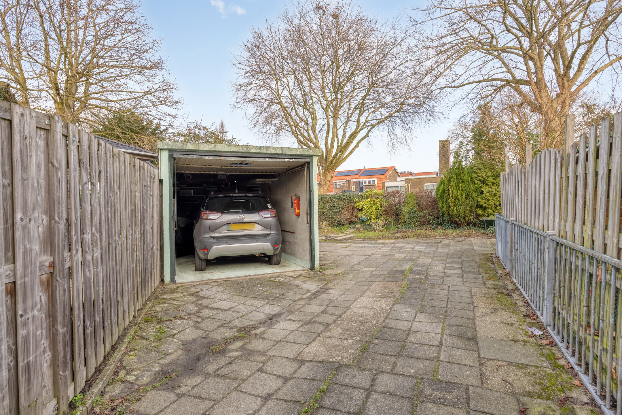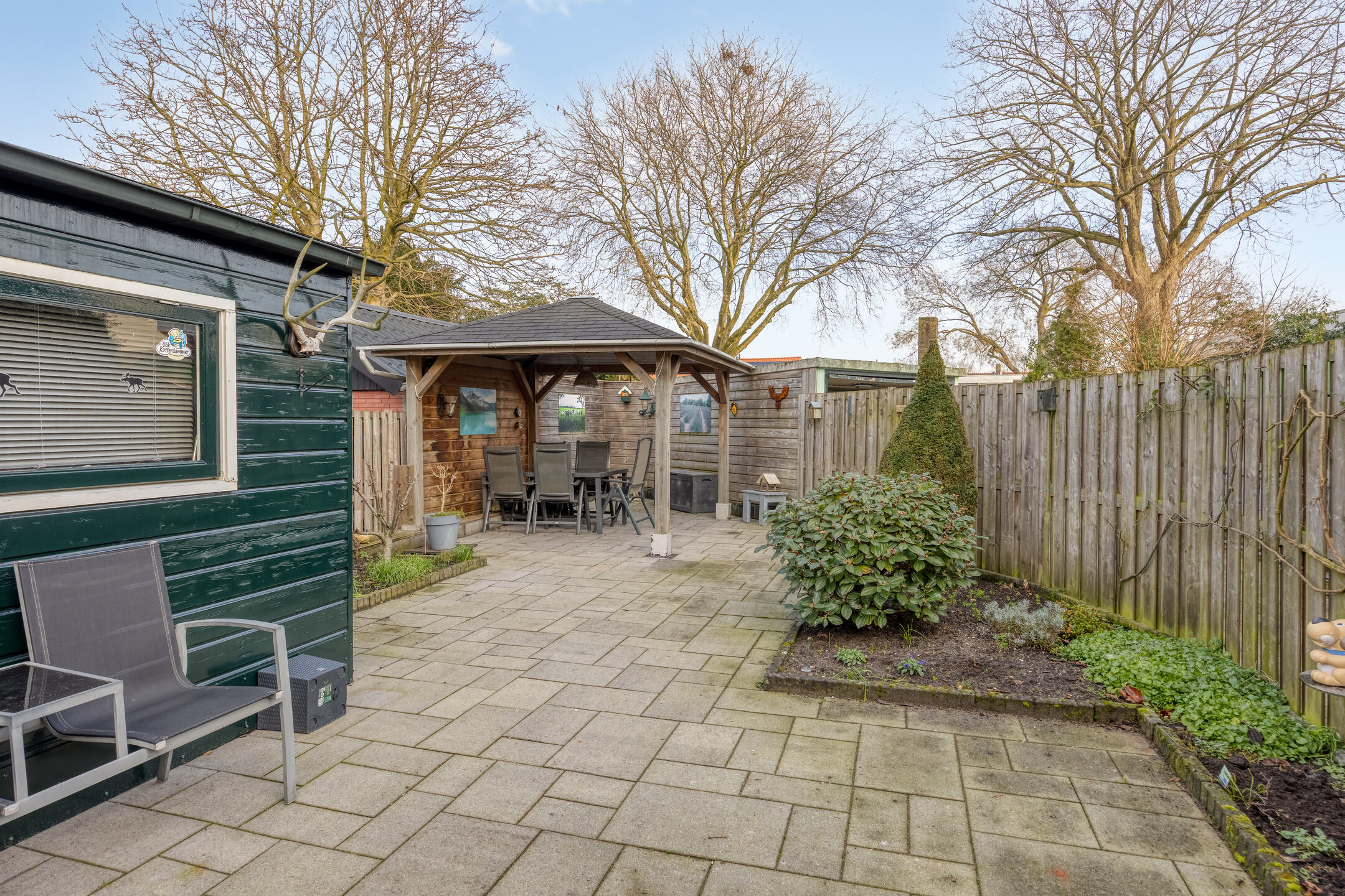 De royale tuin is gelegen op het zuidoosten en biedt de gehele dag zon en veel privacy. Aan de achtergevel van de woning is een ruime houten berging gesitueerd met daarin o.a. de cv-combiketel “Vaillant” bj. 2017. Verder in de achtertuin staat een sfeervolle houten prieel, schuttingen rondom en een vrijstaande stenen prefab garage met een elektrische deur. Om bij de garage te komen maak je deels gebruik van het pad bij de buren (recht van overpad).