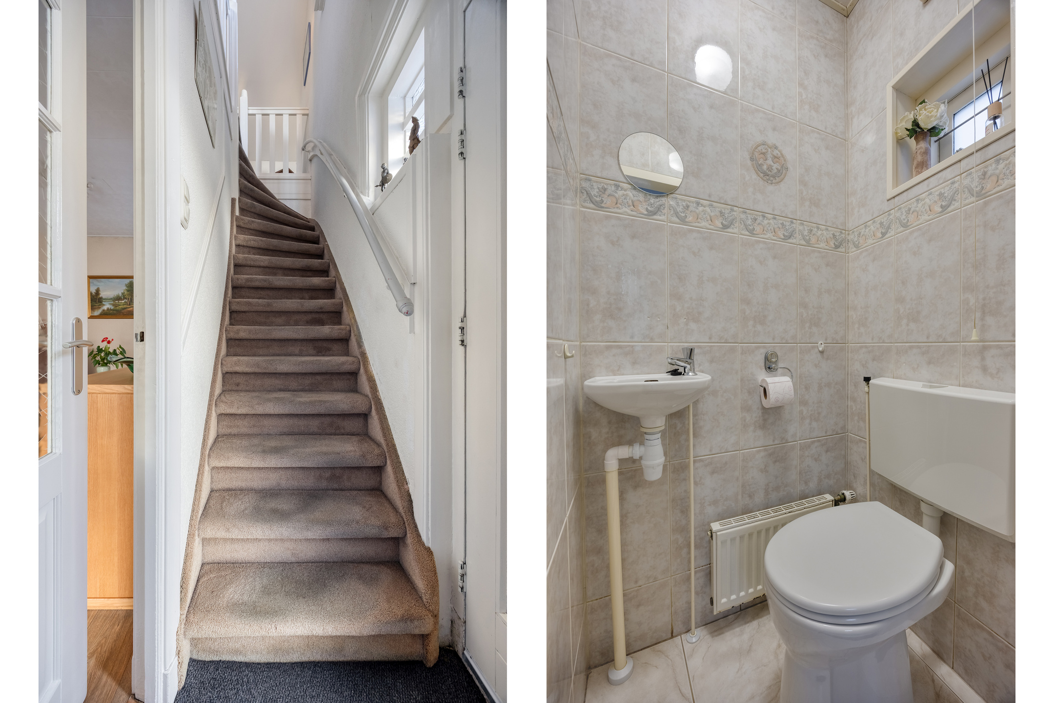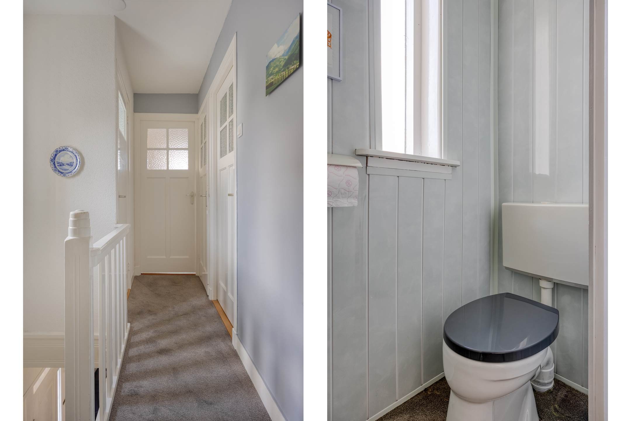 De overloop geeft toegang tot de 2 slaapkamers, het toilet met handwasbakje en de vaste trap naar de 2e verdieping.