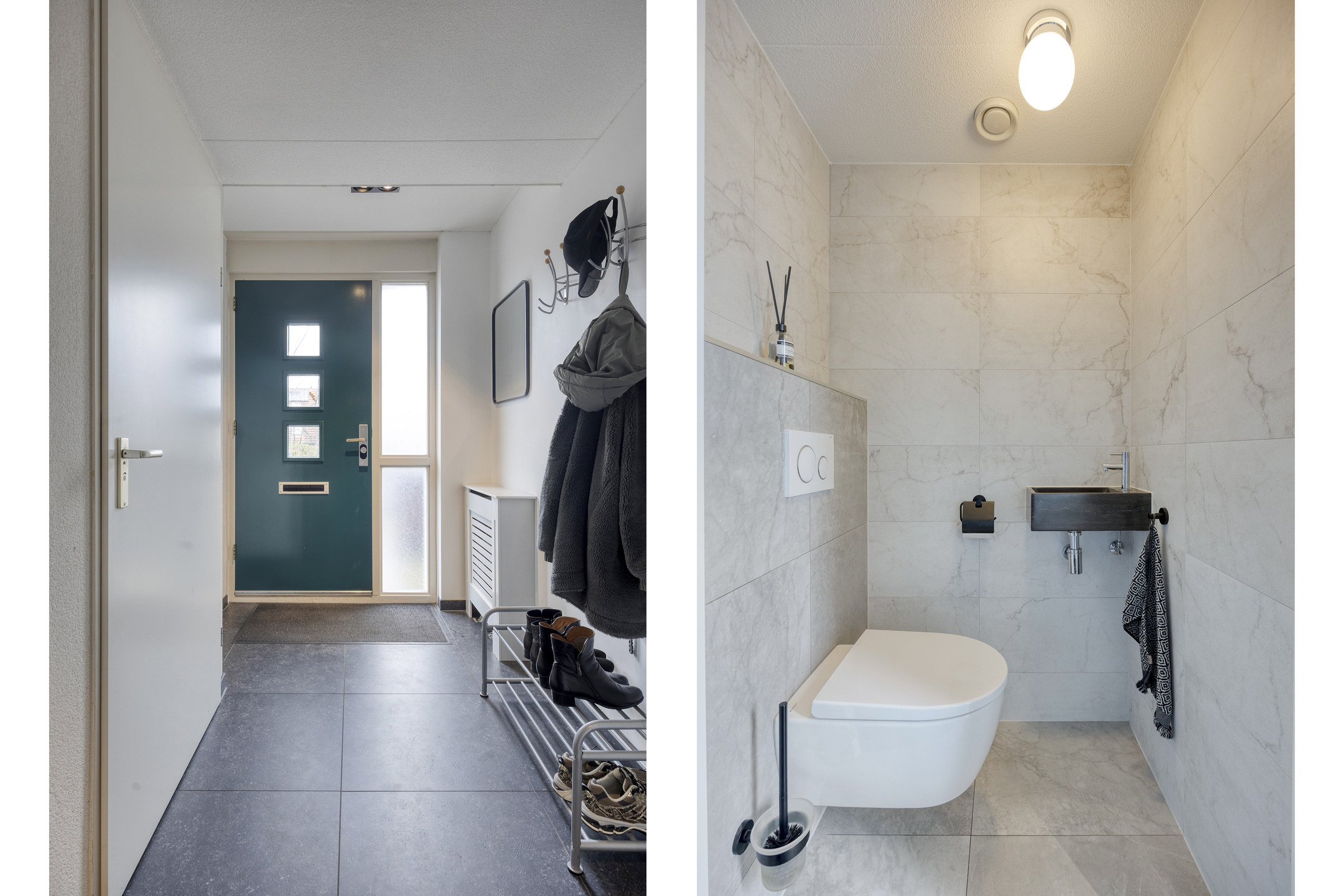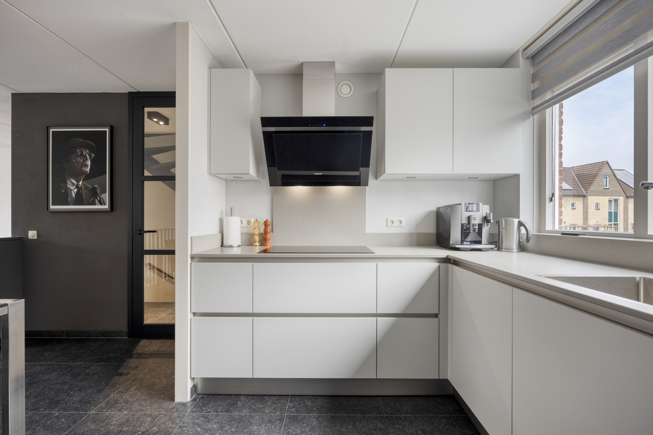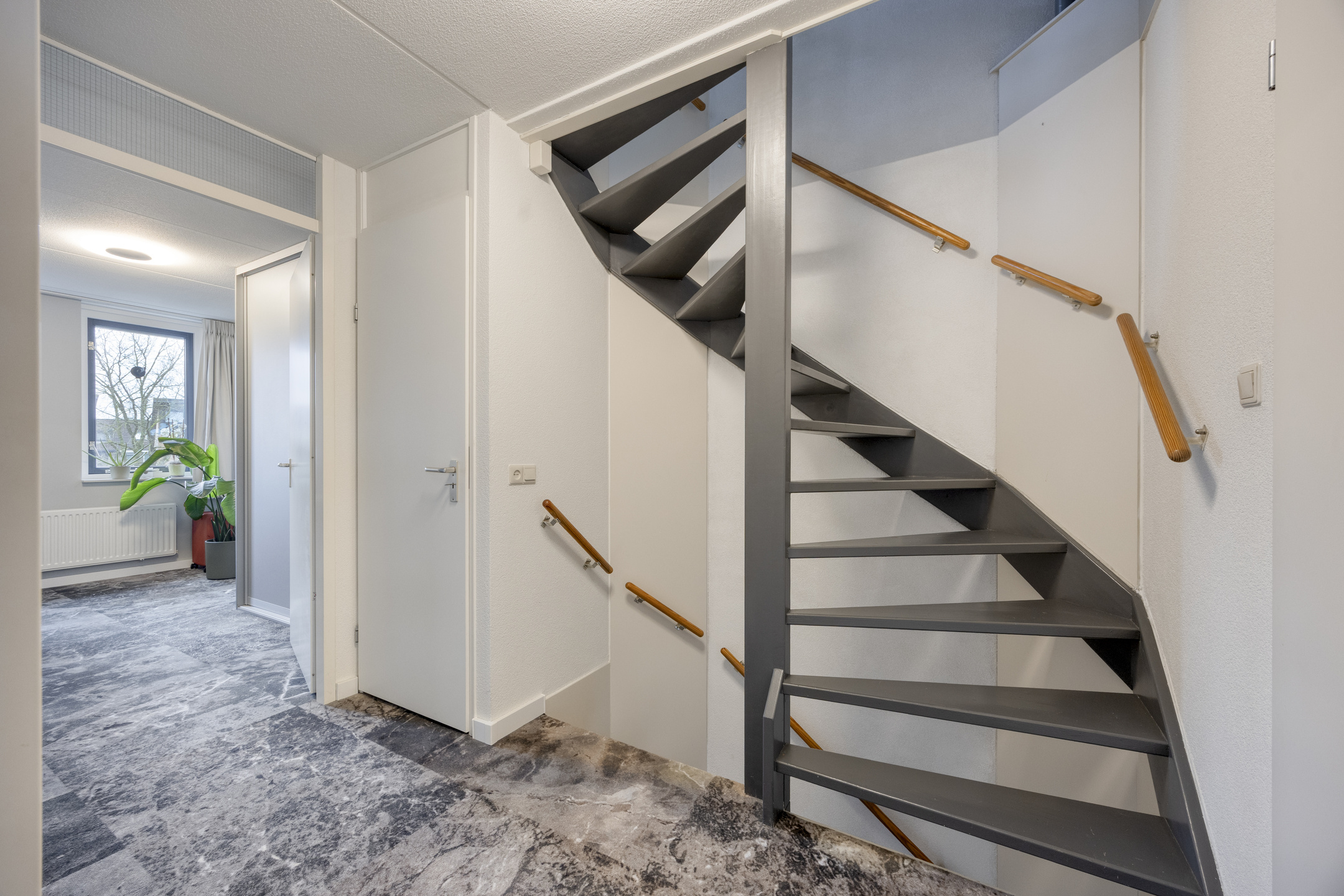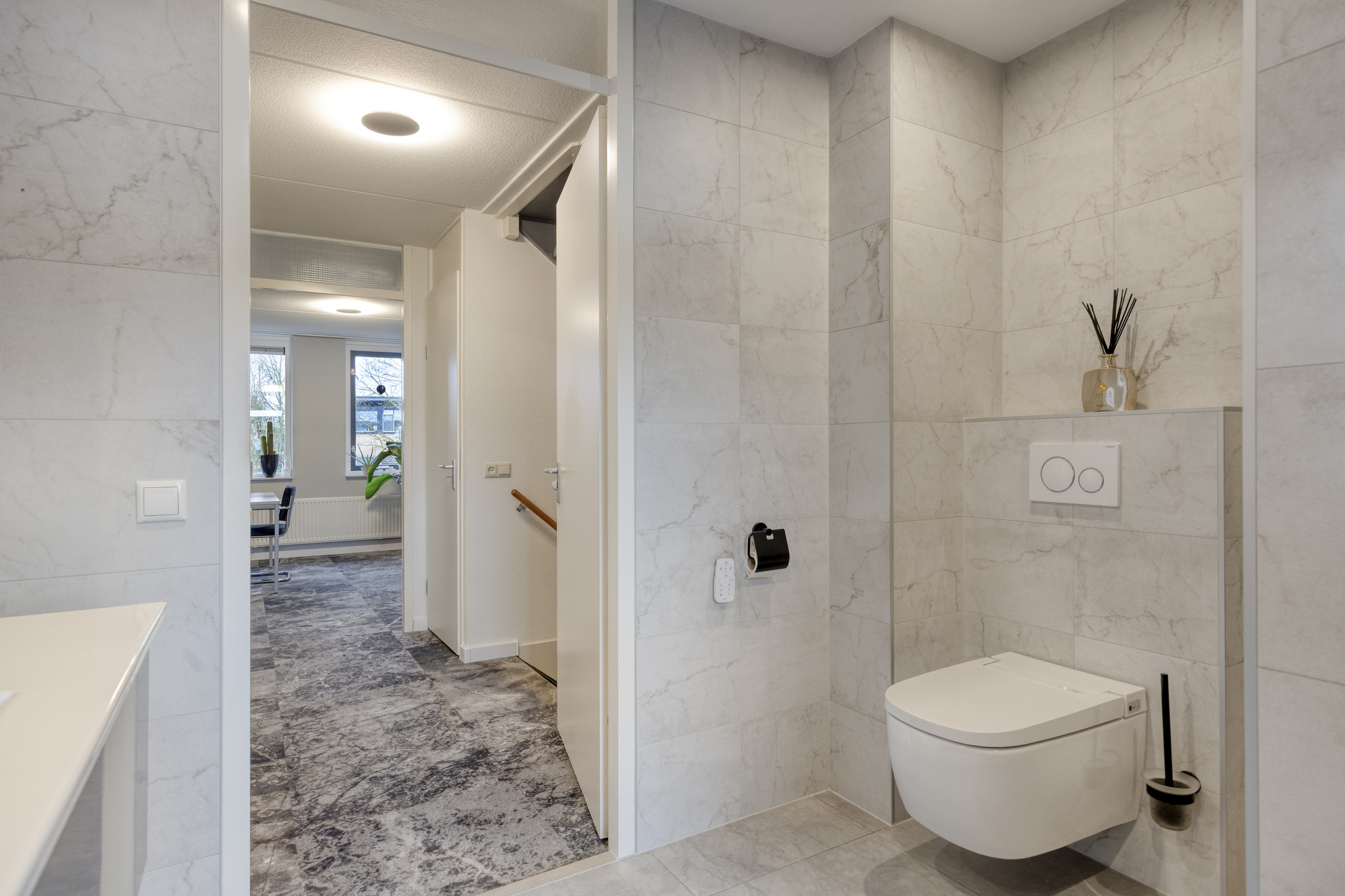 Begane grond: Via een stenen buitentrap, bordes en entree/voordeur. Trapopgang naar de 1e verdieping en toegang naar de garage. De wanden zijn voorzien van lichte spachtelputz afwerking, een tegelvloer met vloerverwarming, de garderoberuimte, meterkast (met 3-fase aansluiting) en een modern, luxe in 2022 geplaatst toilet met handwasbakje. Via een trendy glazendeur toegang tot de woonkeuken. De sfeervolle woonkeuken (geplaatst in 2018) is gesitueerd aan de voorzijde van de woning en is in hoekopstelling geplaatst en voorzien van een greeploze inrichting met composiet bovenblad en diverse ingebouwde apparatuur zoals een inductiekookplaat, afzuigschouw, vaatwasser, combimagnetron en koelkast (alle apparatuur is van het merk “Siemens” minus inductiekookplaat "AEG"). Voorts voorzien van diverse lades en een luxe hoekkast. Tegelvloer met een 2-groeps vloerverwarming. De sfeervolle woonkamer (circa 27 m²) is gelegen aan de achterzijde (split-level) en biedt door middel van een aluminium schuifpui toegang tot de achtertuin op het zuiden. De zonnige achtergevel geeft door de aanwezigheid van de hoge raampartijen een prachtig lichtinval. De woonkamer is tevens uitgerust met spachtelputz wanden en een spuitwerk plafond.