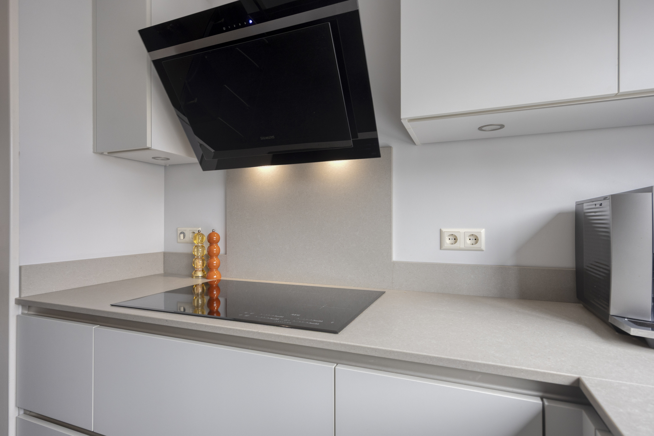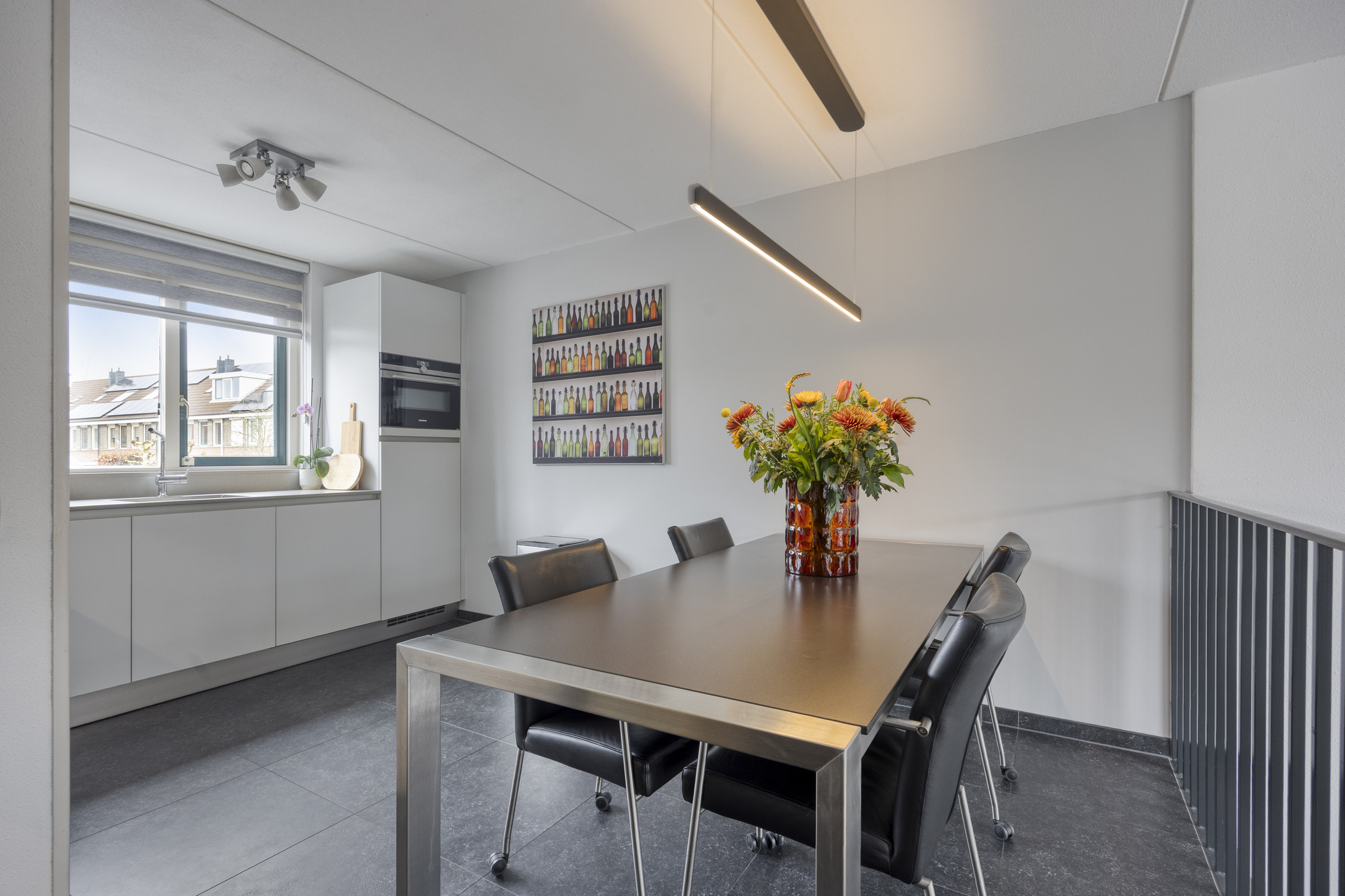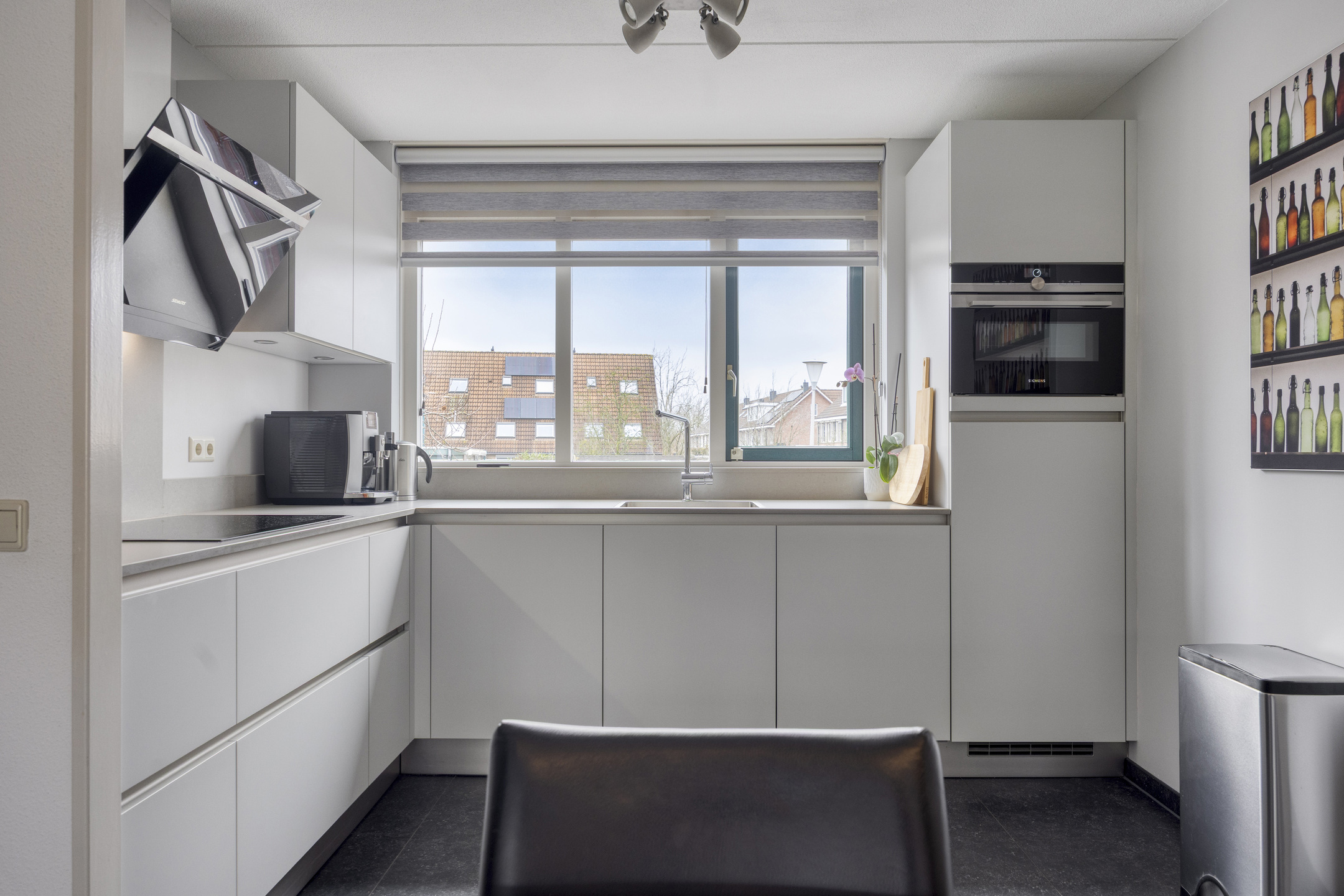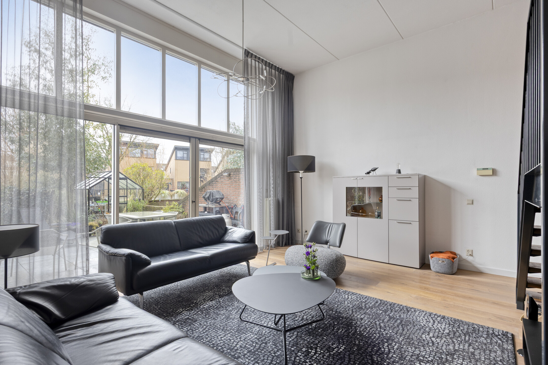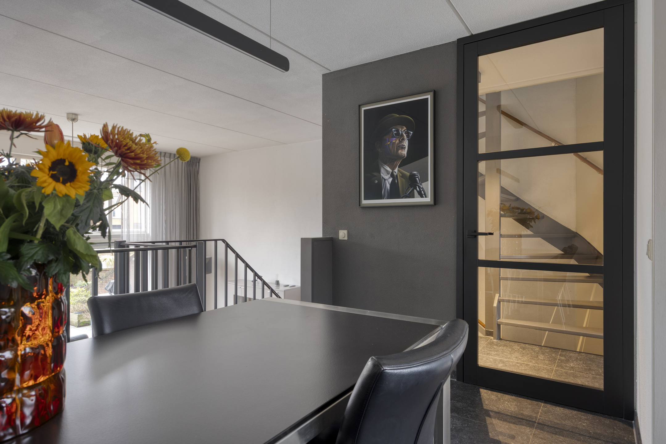 Begane grond: Via een stenen buitentrap, bordes en entree/voordeur. Trapopgang naar de 1e verdieping en toegang naar de garage. De wanden zijn voorzien van lichte spachtelputz afwerking, een tegelvloer met vloerverwarming, de garderoberuimte, meterkast (met 3-fase aansluiting) en een modern, luxe in 2022 geplaatst toilet met handwasbakje. Via een trendy glazendeur toegang tot de woonkeuken. De sfeervolle woonkeuken (geplaatst in 2018) is gesitueerd aan de voorzijde van de woning en is in hoekopstelling geplaatst en voorzien van een greeploze inrichting met composiet bovenblad en diverse ingebouwde apparatuur zoals een inductiekookplaat, afzuigschouw, vaatwasser, combimagnetron en koelkast (alle apparatuur is van het merk “Siemens” minus inductiekookplaat "AEG"). Voorts voorzien van diverse lades en een luxe hoekkast. Tegelvloer met een 2-groeps vloerverwarming. De sfeervolle woonkamer (circa 27 m²) is gelegen aan de achterzijde (split-level) en biedt door middel van een aluminium schuifpui toegang tot de achtertuin op het zuiden. De zonnige achtergevel geeft door de aanwezigheid van de hoge raampartijen een prachtig lichtinval. De woonkamer is tevens uitgerust met spachtelputz wanden en een spuitwerk plafond.