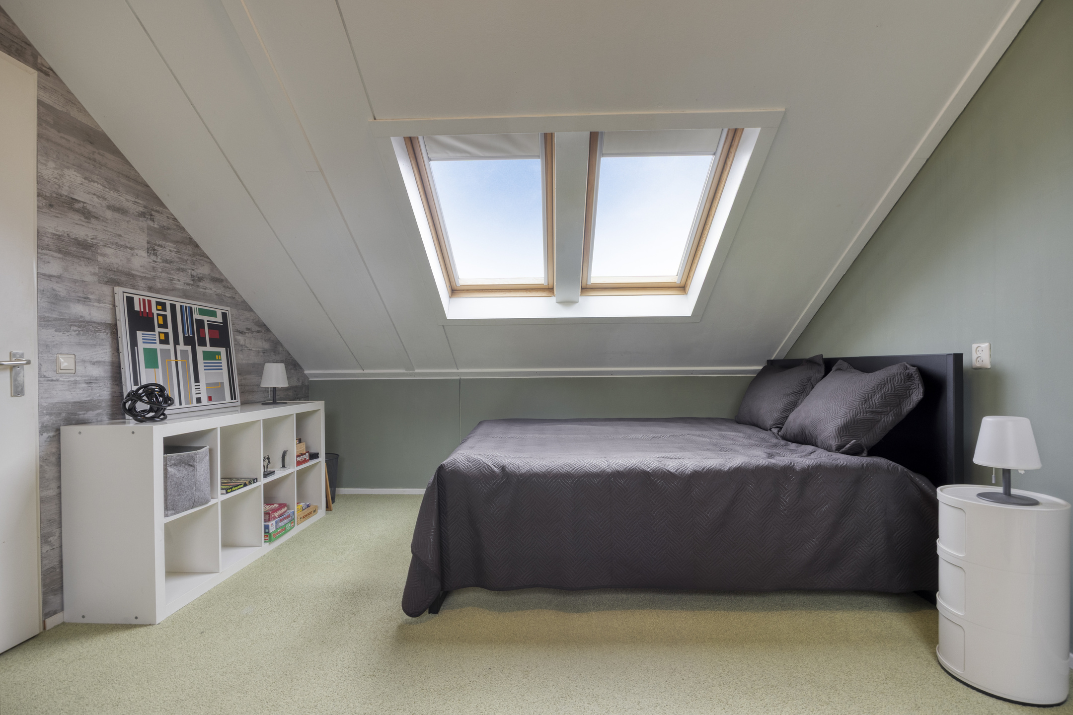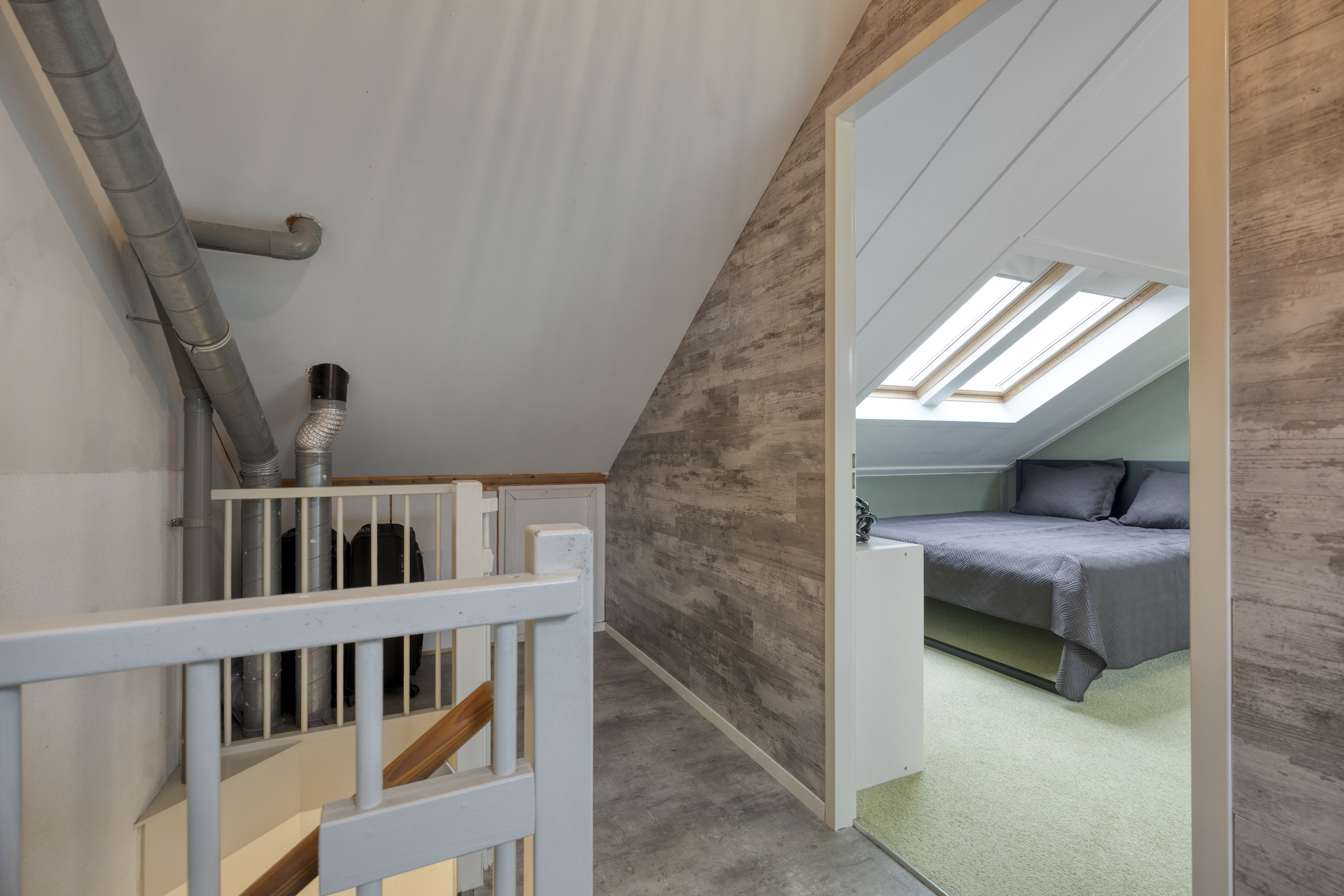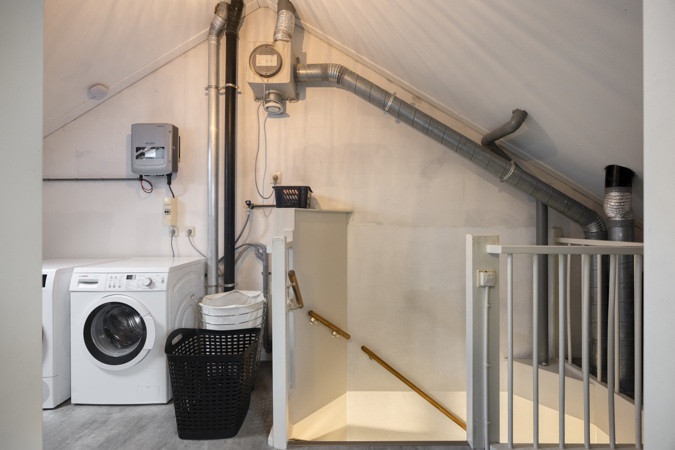 Via een vaste trap bereik je de overloop voorzien van een Velux dakraam en de opstelling van de wasmachine, droger, de omvormer van de zonnepanelen en de mechanische afzuiging. Aansluitend de sfeervolle 4e slaapkamer van circa 17,2 m² welke is voorzien van 3 grote dakramen en bergruimte achter de knieschotten.