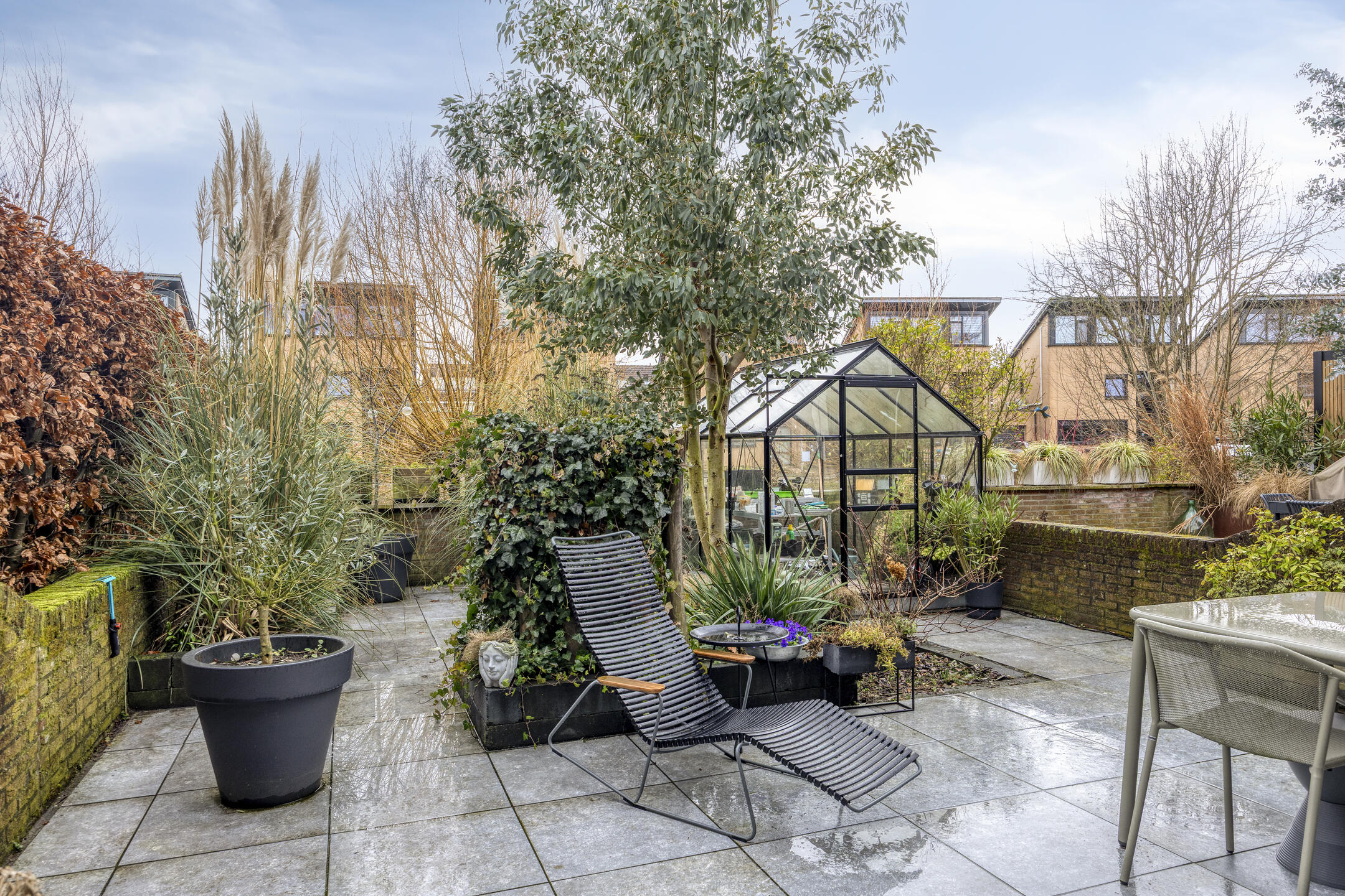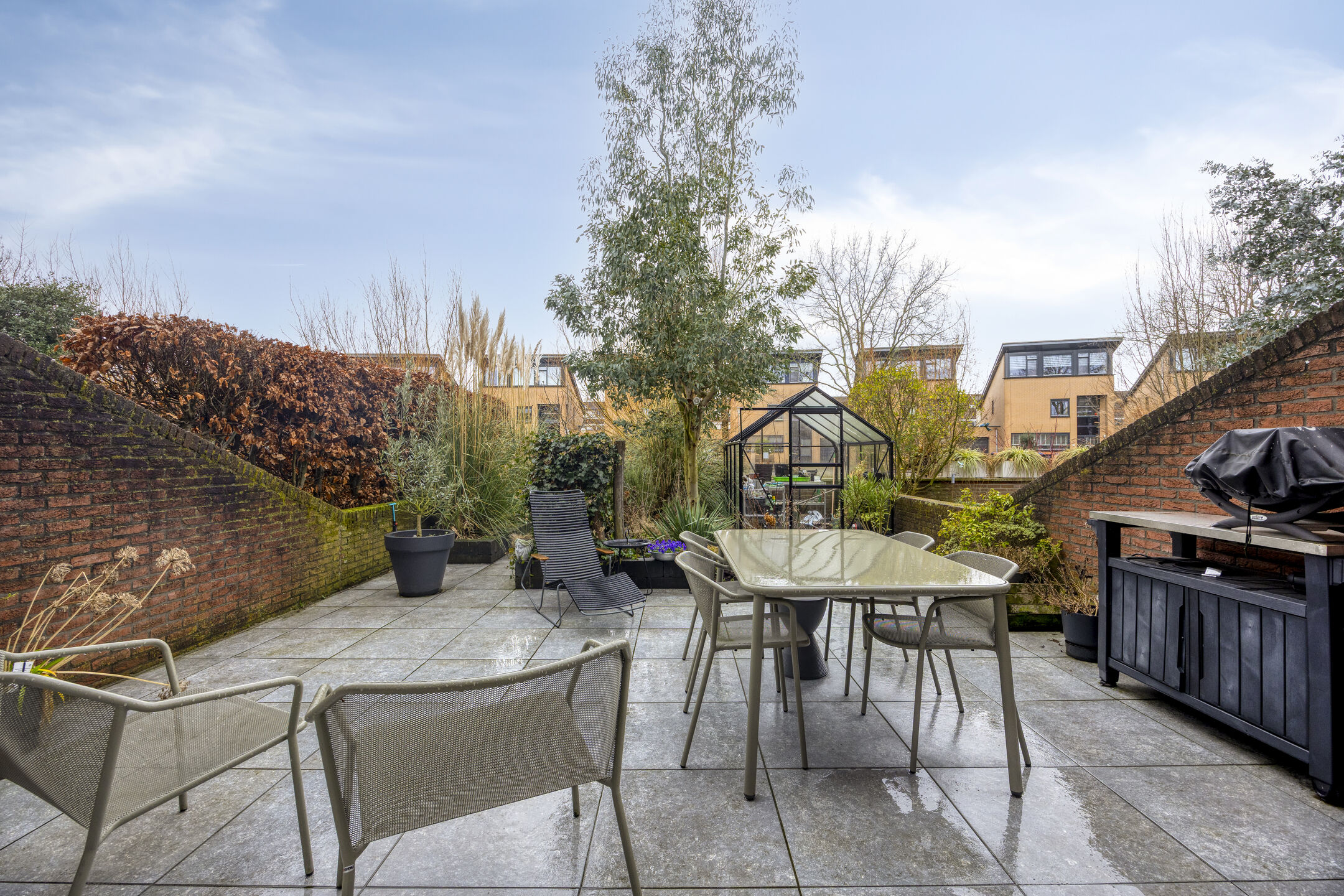 De achtertuin (onderhoudsarm) is in 2023 opnieuw aangelegd en volledig voorzien van keramische tegels. Heerlijk terras en veel privacy, een hobby-kweekkas en aan de achtergevel treft je een elektrische zonwering (2024) en elektrische screens. Er is een buitenkraan aanwezig evenals buitenverlichting. Aan de voorzijde beschik je over een bordes en een eigen oprit met opstelplaats voor kliko’s. Er is een oplaadpunt aanwezig voor de elektrische auto (3 fase/11 ampere).