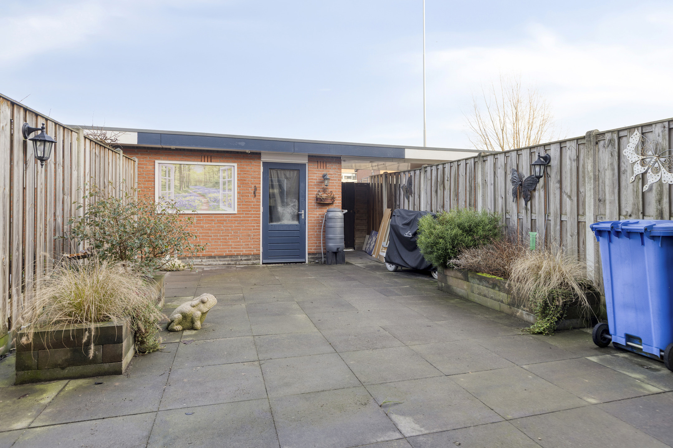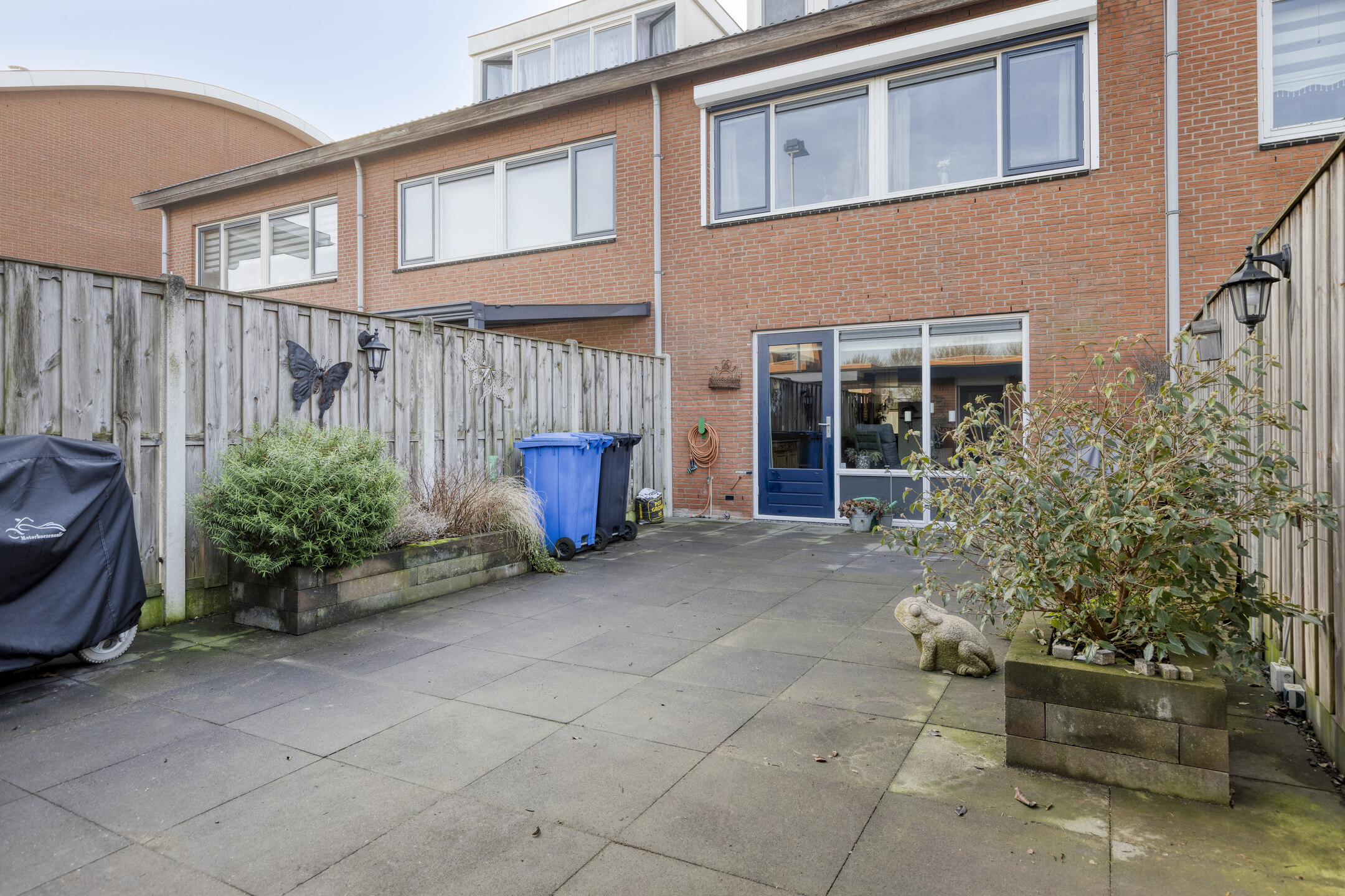 De tuin is onderhoudsarm aangelegd met plantenborders en degelijke erfafscheiding.
