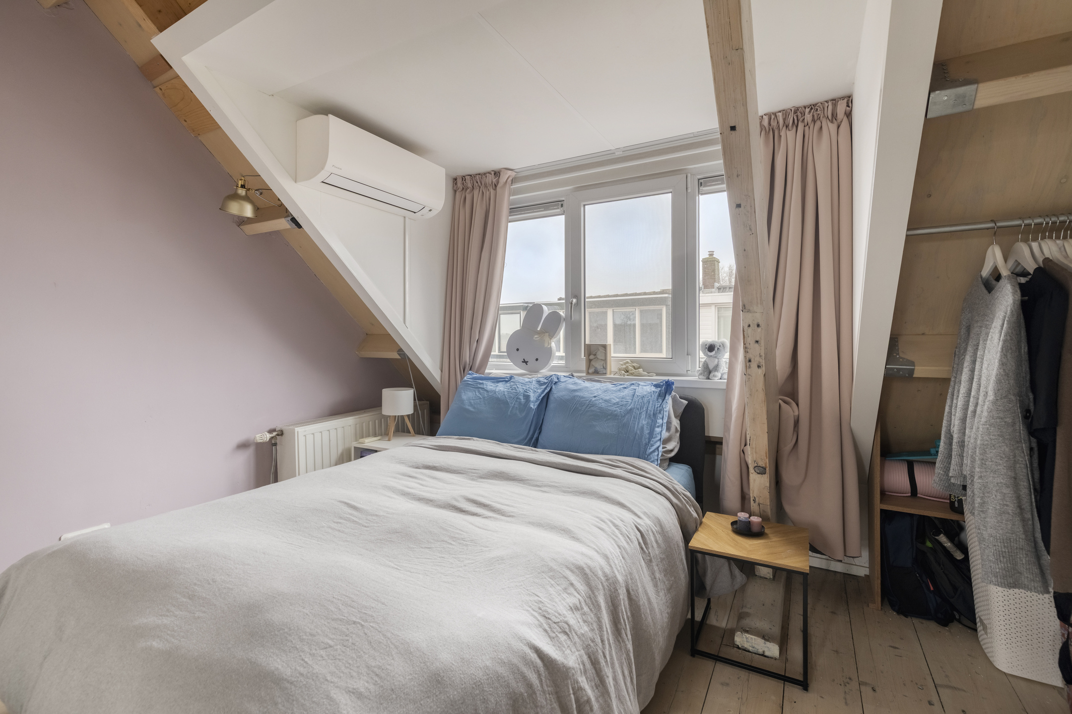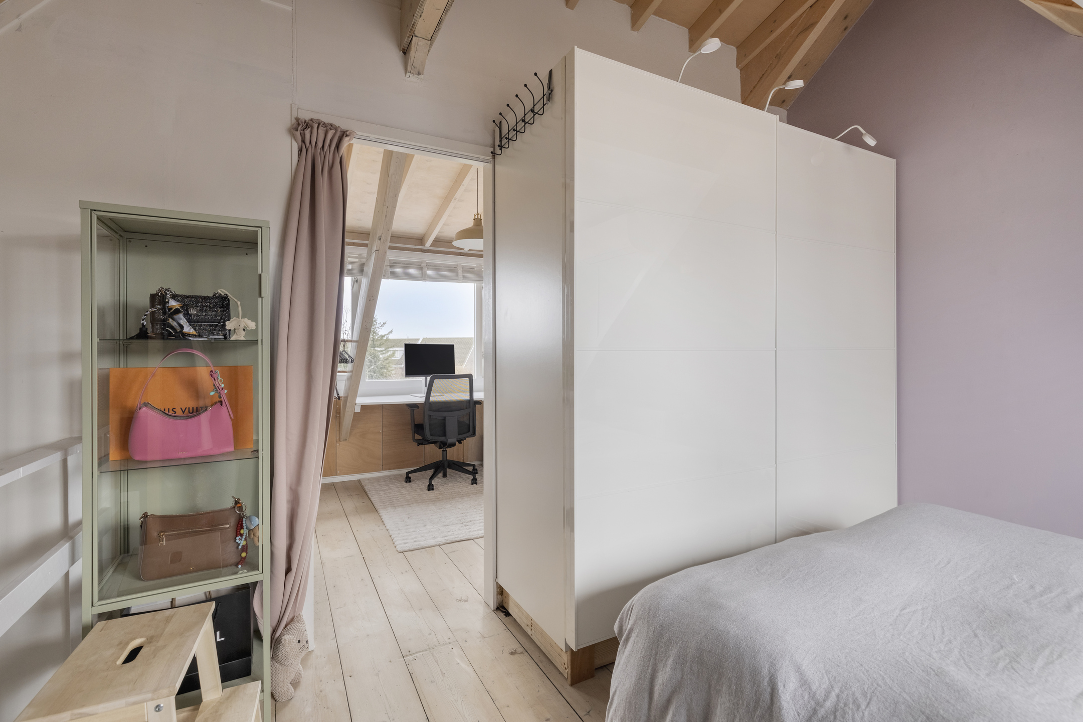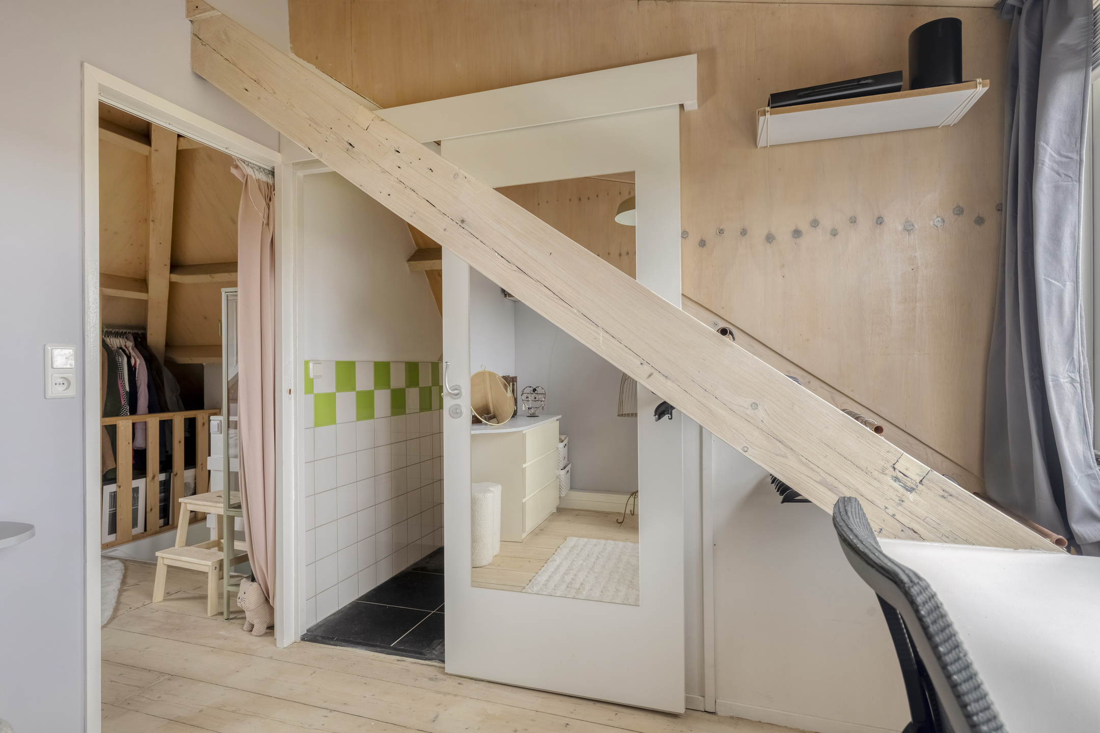Overloop waarop een toilet “Sanibroyeur” (32 mm afvoer) met handwasbakje. Aansluitend 2 kamers, welke beiden zijn voorzien van een dakkapel en één kamer met een vaste kastenwand en een airco-installatie (bj. 2021). Indien gewenst kan van deze 2 kamers ook één grote kamer gemaakt worden. Op de vloer liggen houten planken in white wash uitvoering.