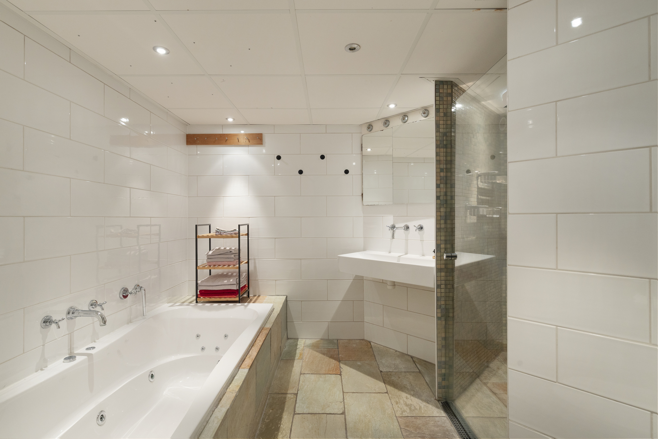 De hoogte van het onderhuis is circa 2.40 meter en daardoor uitermate geschikt voor dagelijks gebruik. Het onderhuis is te bereiken door middel van een vaste trap vanuit de hal op de begane grond. Tuinkamer met toegang tot de achtertuin, een systeemplafond en een airco-installatie. Een 2-groeps vloerverwarmingsinstallatie in een bergkast, met tevens daarin de nieuwe cv-combiketel “Intergas” (bj. 2024) en de wasmachine aansluiting. Geheel betegelde, inpandige badkamer voorzien van een toilet, een royale inloopdouche met regendouche, een 2-persoons ligbad met whirlpool, een wastafel met make-up spiegel, systeemplafond met sterrenverlichting en vloerverwarming.