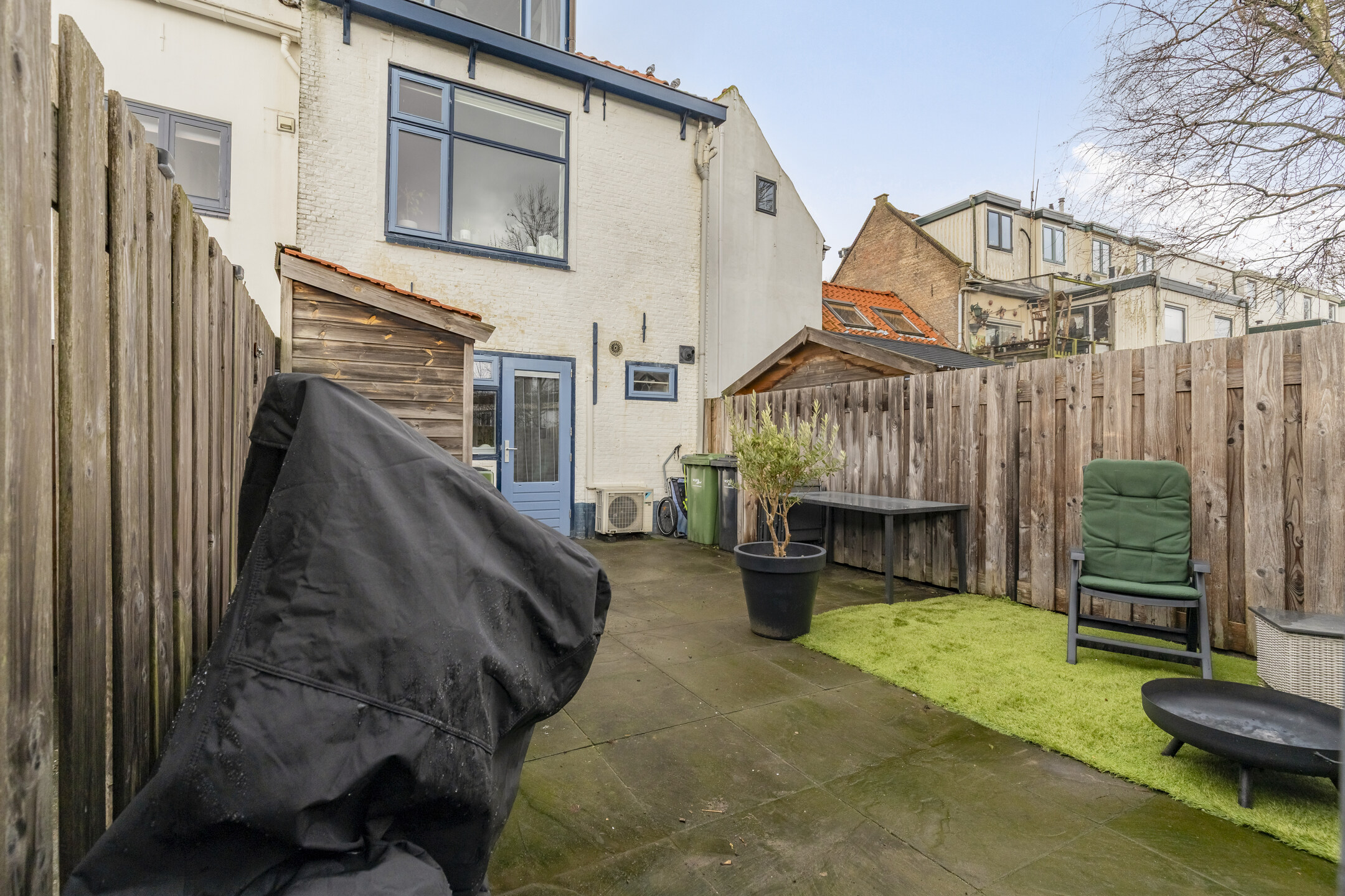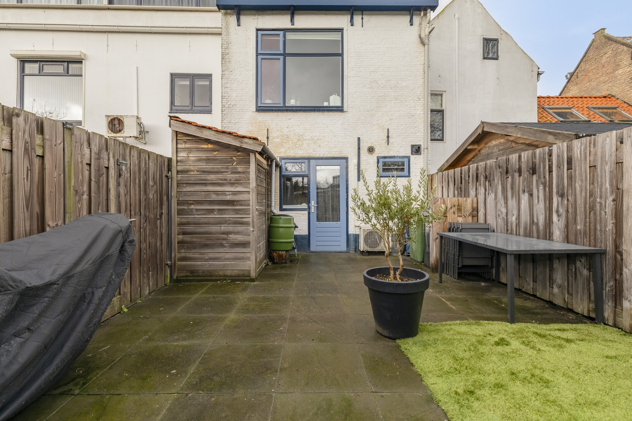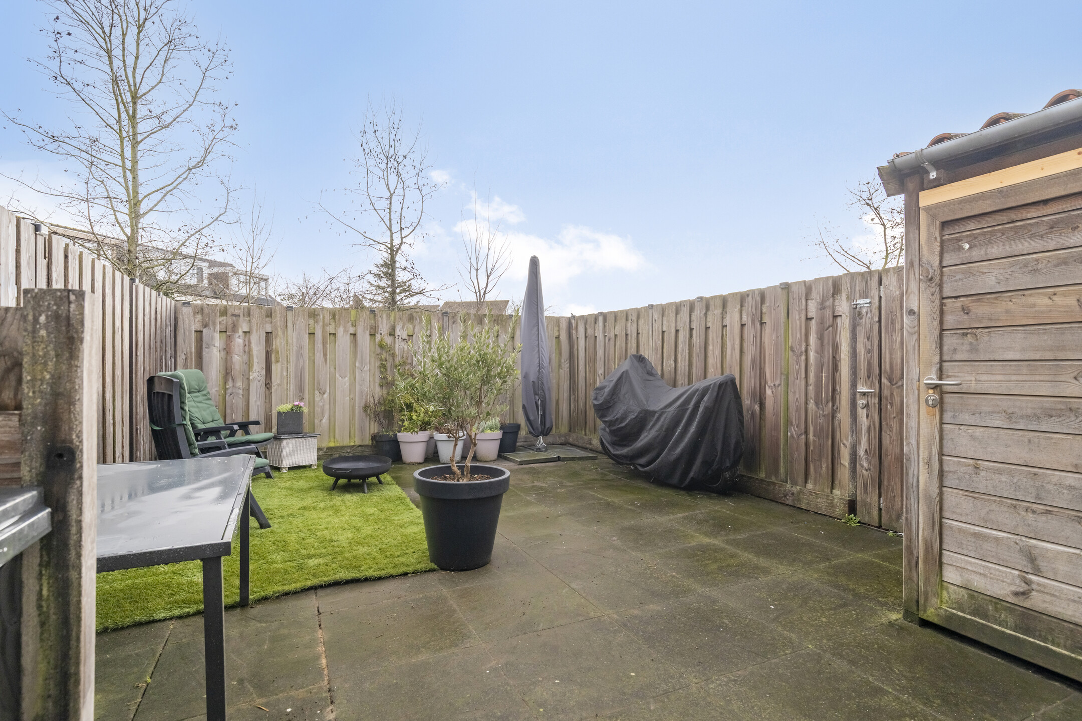De achtertuin is gelegen op het zuid/oosten, biedt volledige privacy en is geheel omheind. Bereikbaar door middel van een zij-uitgang naar de achterzijde. Houten blokhut handig voor fiets en/of opslag tuinmeubelen.