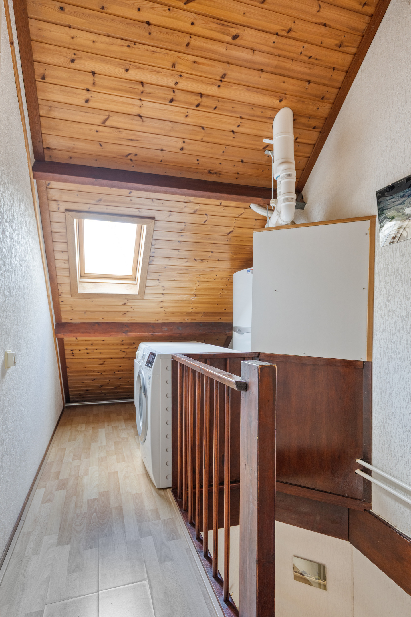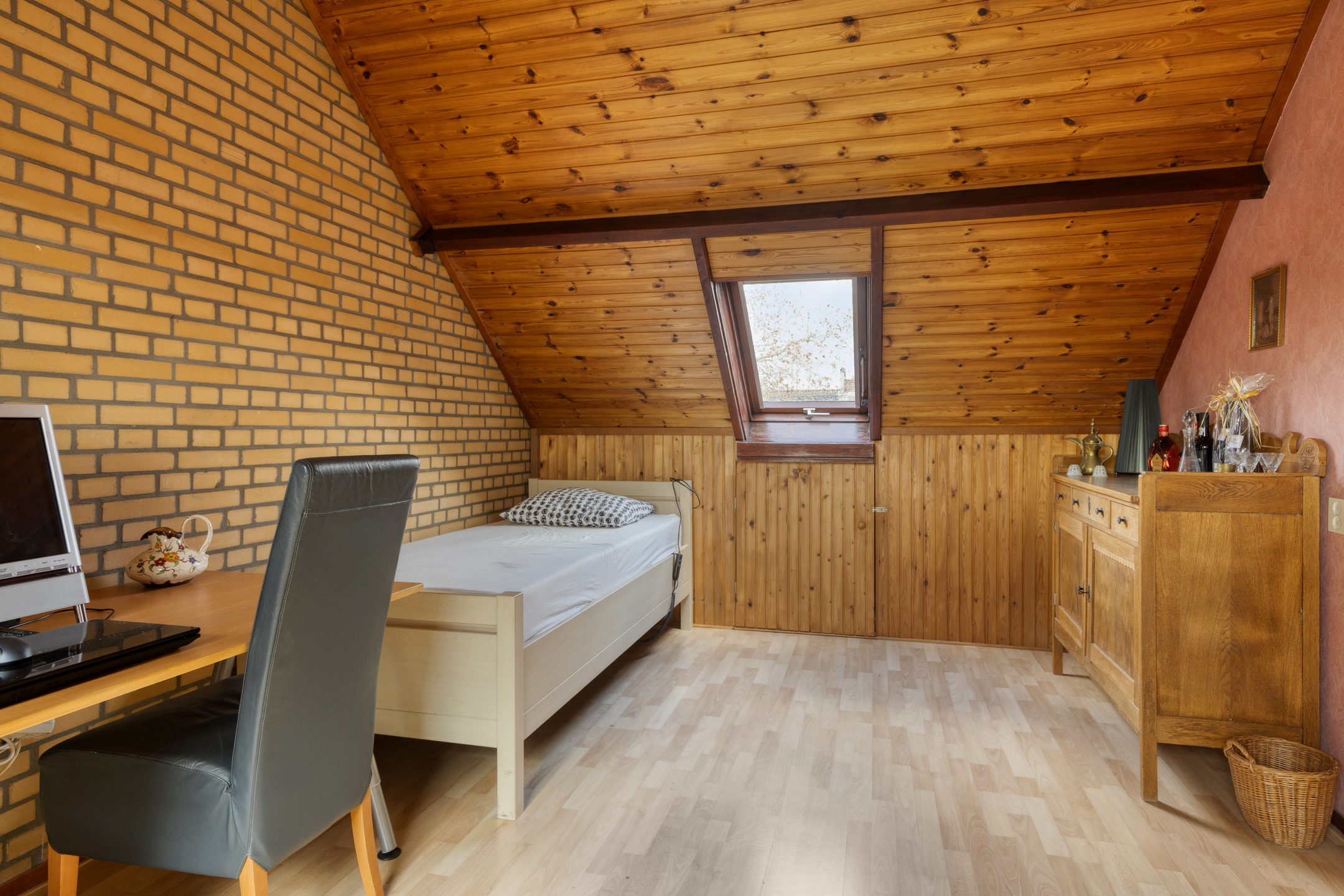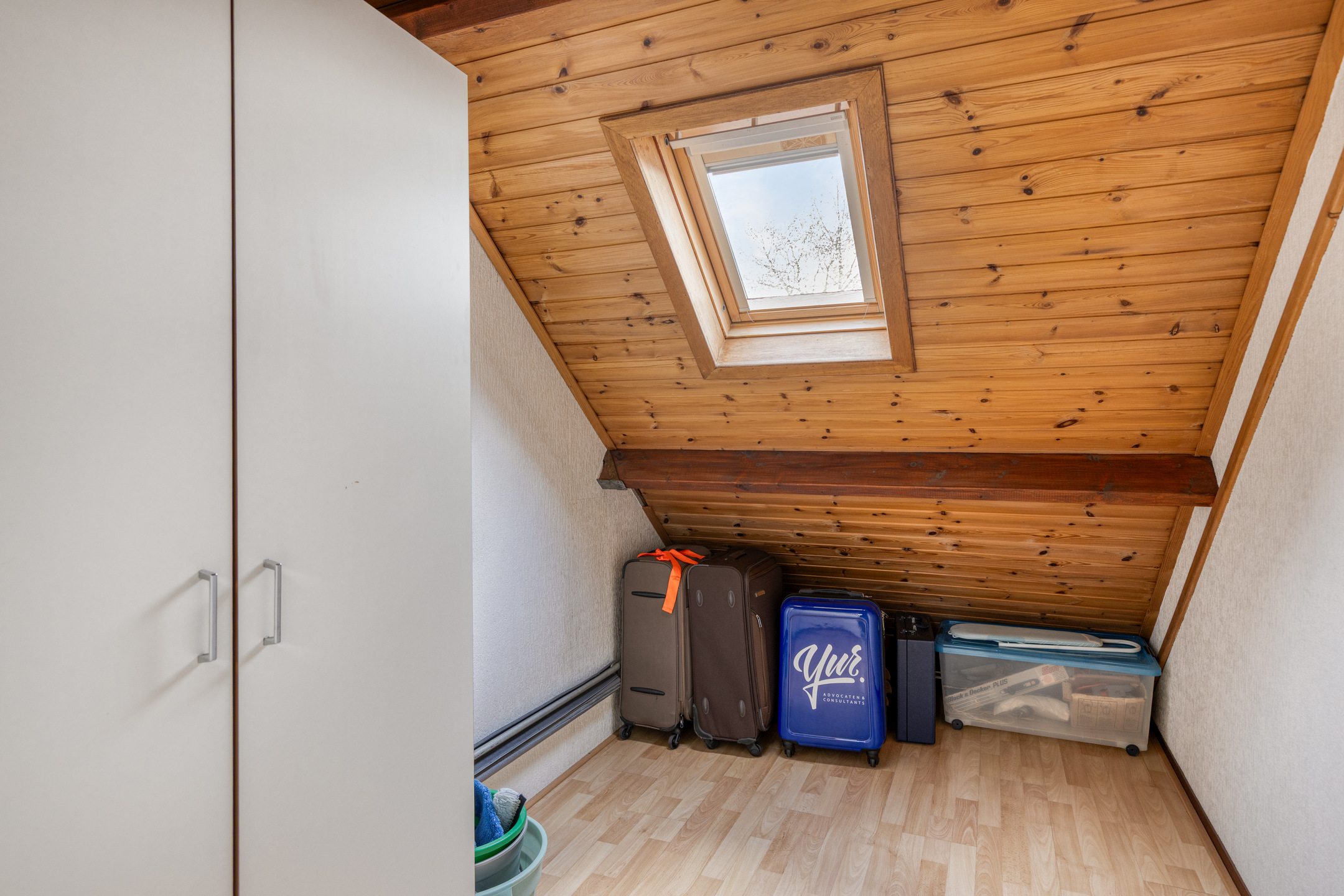 Via de vaste trap is de 2e verdieping te bereiken. Overloop voorzien van een Velux dakraam, de cv-combiketel ’Vaillant’ (bj. 2021) en de wasmachine-/drogeraansluiting. Berghok van circa 3,5 m² welke is voorzien van een Velux dakraam, deze ruimte is ideaal als extra opbergruimte. Slaapkamer 3 van circa 15,6 m² welke is voorzien van 2 dakramen aan voor-/achterzijde en grotendeels is afgetimmerd met houten delen. Diverse bergruimte achter de knieschotten. De overloop en de slaapkamer zijn voorzien van een laminaatvloer.