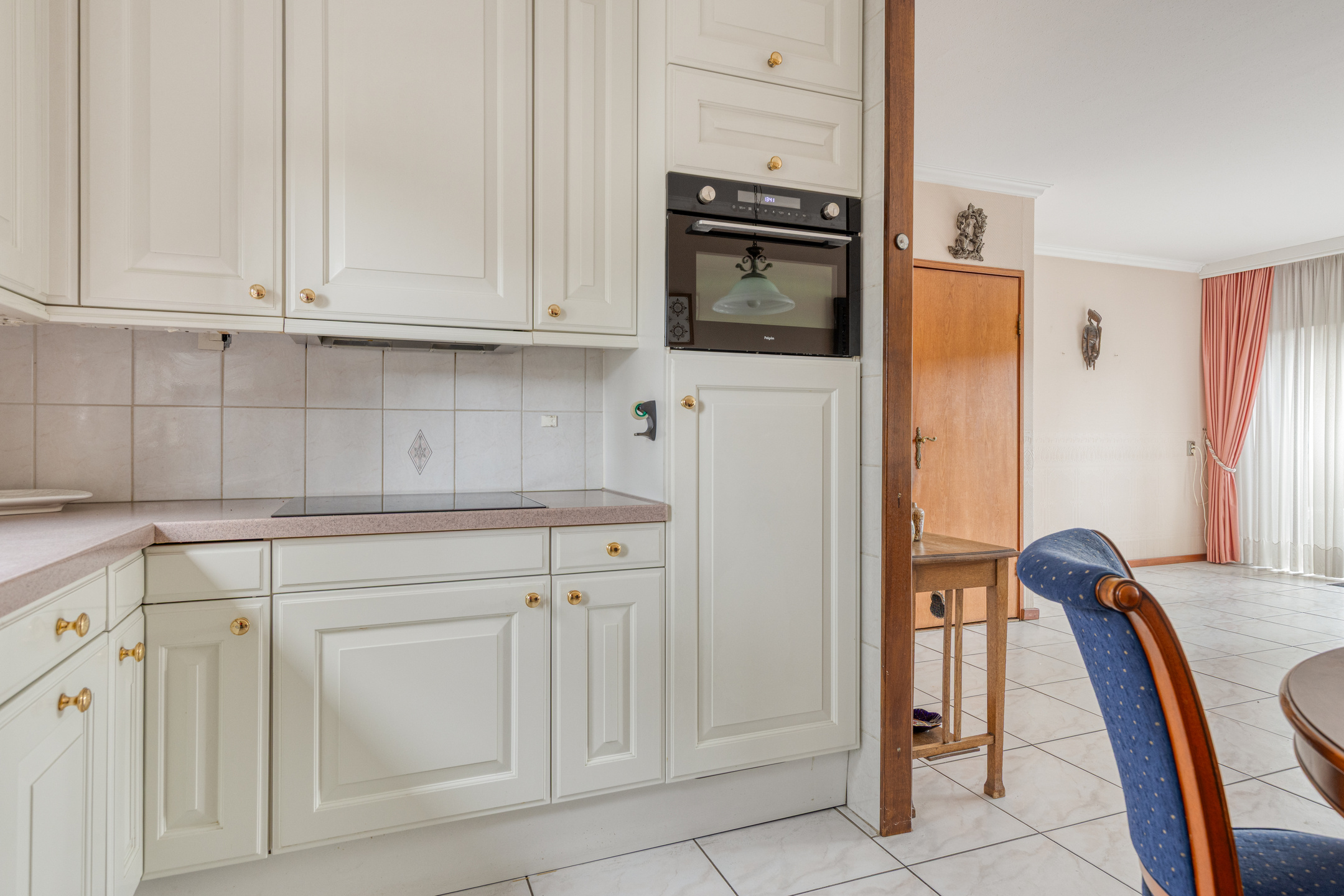 Entree gang voorzien van garderoberuimte, toilet met handwasbakje en meterkast (5 groepen met aardlekschakelaar). Trap naar de 1e verdieping. Via deur naar de tuingerichte woonkamer (circa 28 m²) met uitzicht op de heerlijke achtertuin. Royale trap-/bergkast en deur naar de achtertuin. Aan de voorzijde van de woning gelegen open keuken van circa 7 m², voorzien van een keukenblok in hoekopstelling en voorzien van o.a. een vaatwasmachine, inductiekookplaat, afzuigkap, koelkast, combi-magnetron, close-in-boiler, carrouselkast en diverse kastruimte. De gehele begane grond is voorzien van een lichte tegelvloer met een 2-groeps vloerverwarming.