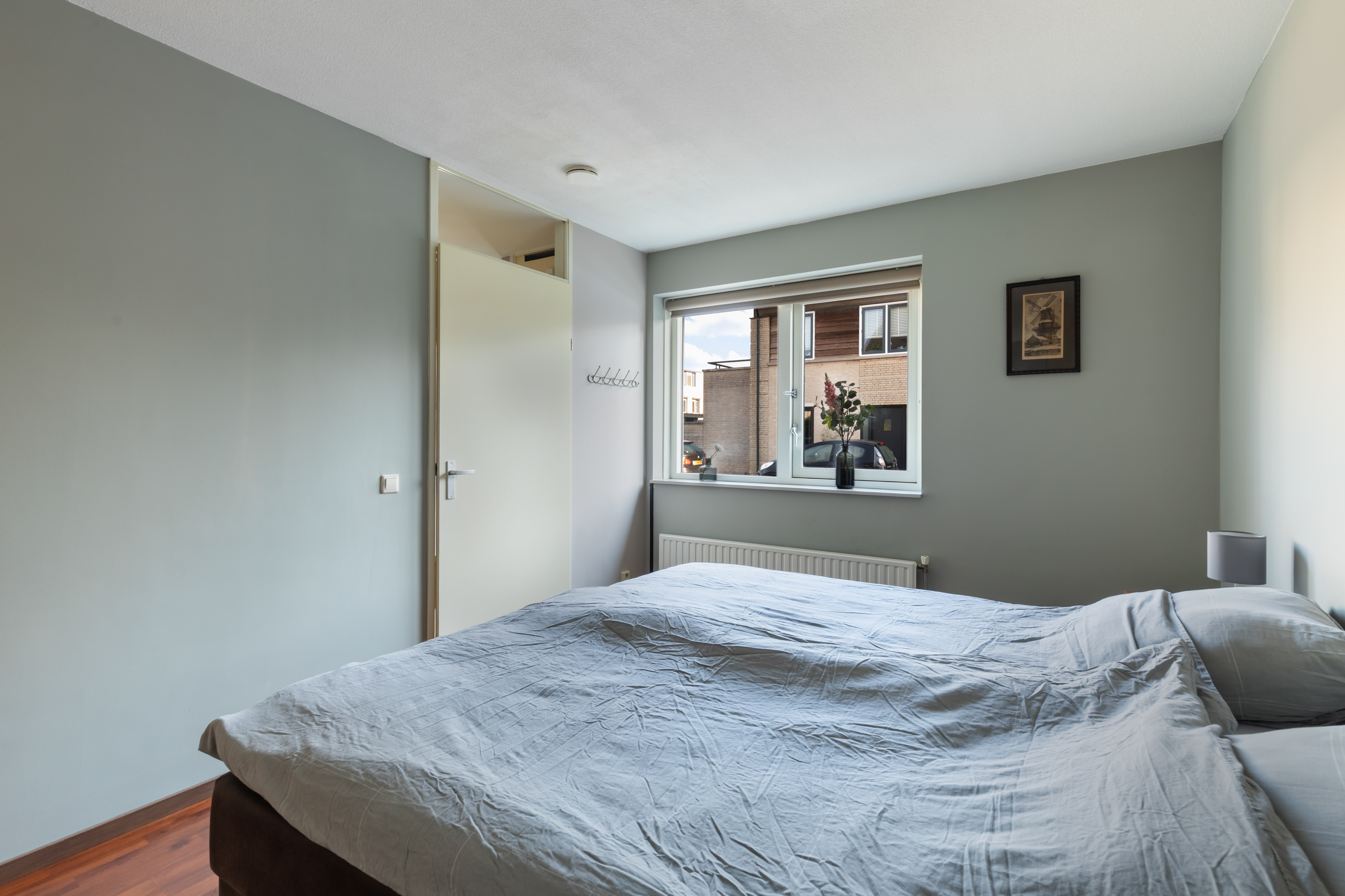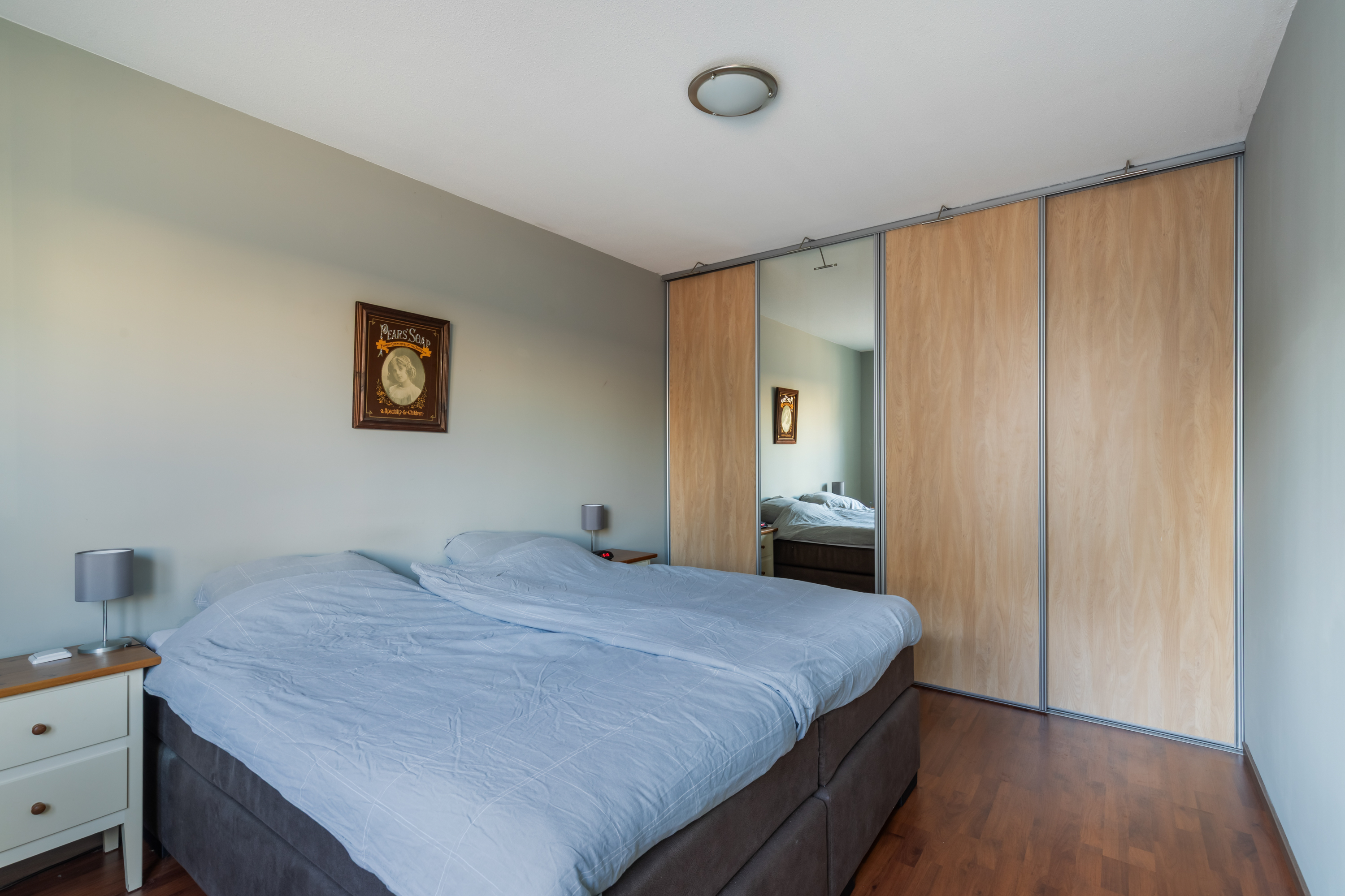 De slaapkamer is circa 14 m² groot. Voorzien van een 4-deurs schuifkastenwand met spiegeldeur en verlichting. Het raam is voorzien van een elektrisch rolluik.