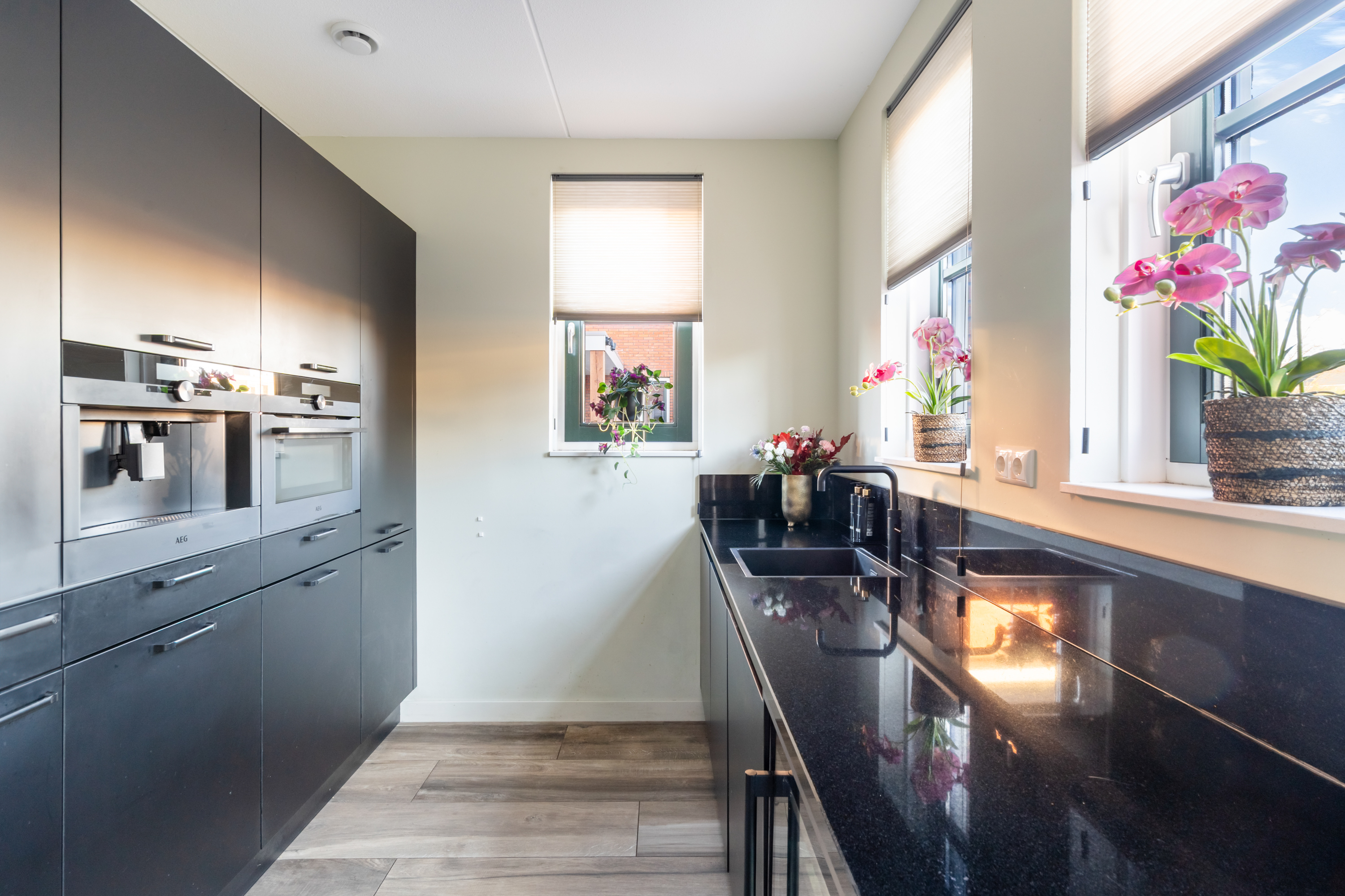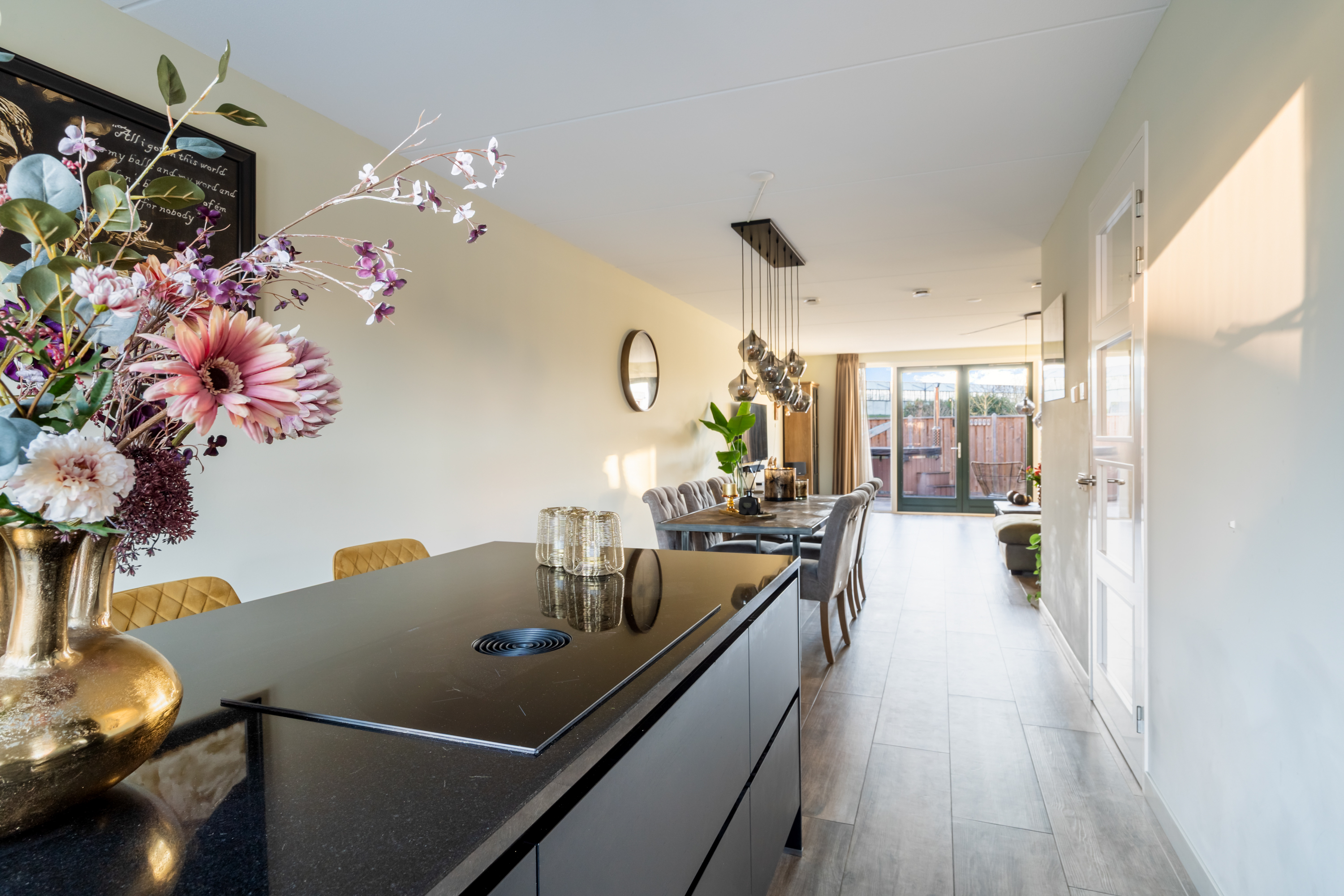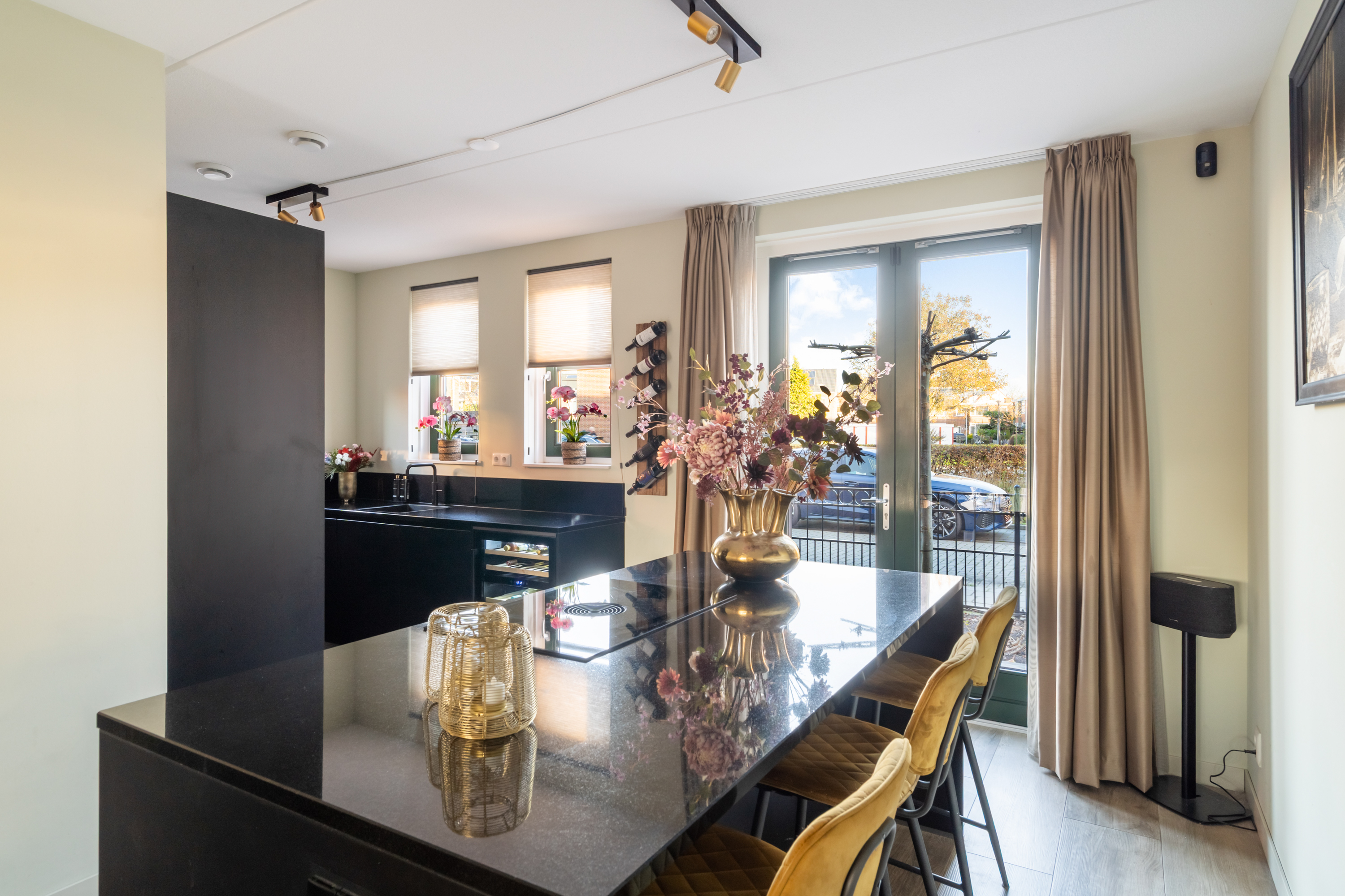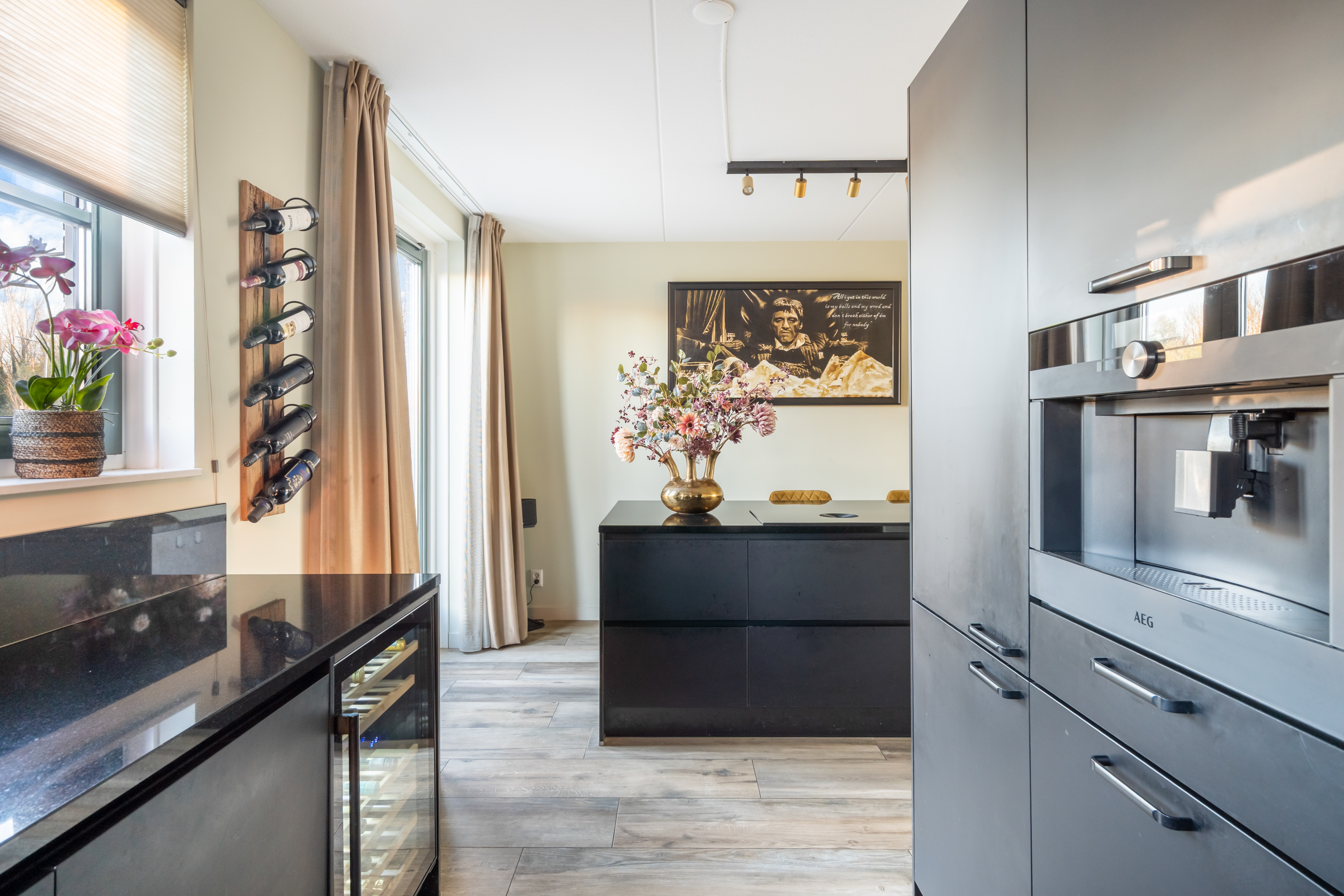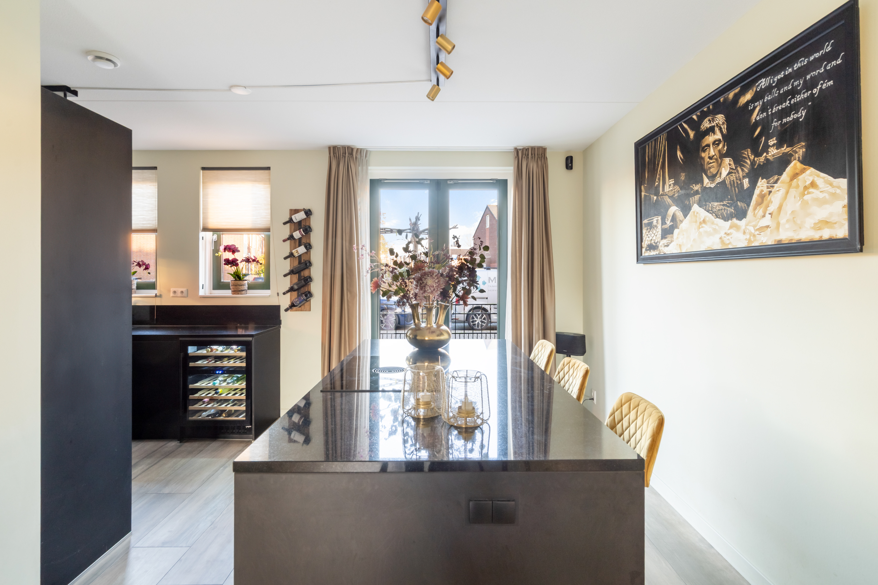 Entree hal met garderobekast, meterkast. Trapopgang met stoffering naar de 1e verdieping. Luxe betegeld toilet met fonteintje. Via een glasdeur naar de heerlijk lichte woonkamer welke is voorzien van een glazen achterpui met openslaande deuren naar de zonnige tuin. Renovlies op de wanden. De luxe en complete open keuken met kookeiland is aan de voorzijde gelegen en voorzien van een zwart mat keukenblok aan beide zijden met voldoende kastruimte, lades, inductiekookplaat met “Bora” afzuiging, koel-/vriescombinatie, koffiemachine, combi-oven, vaatwasmachine, wijnkoelkast, quooker en natuursteen bovenblad. Laag glas aan de voorzijde van de keuken met openslaande deuren. De hal, woonkamer en keuken zijn voorzien van een fraaie tegelvloer met houtstructuur en met een 6-groeps vloerverwarming + koeling.