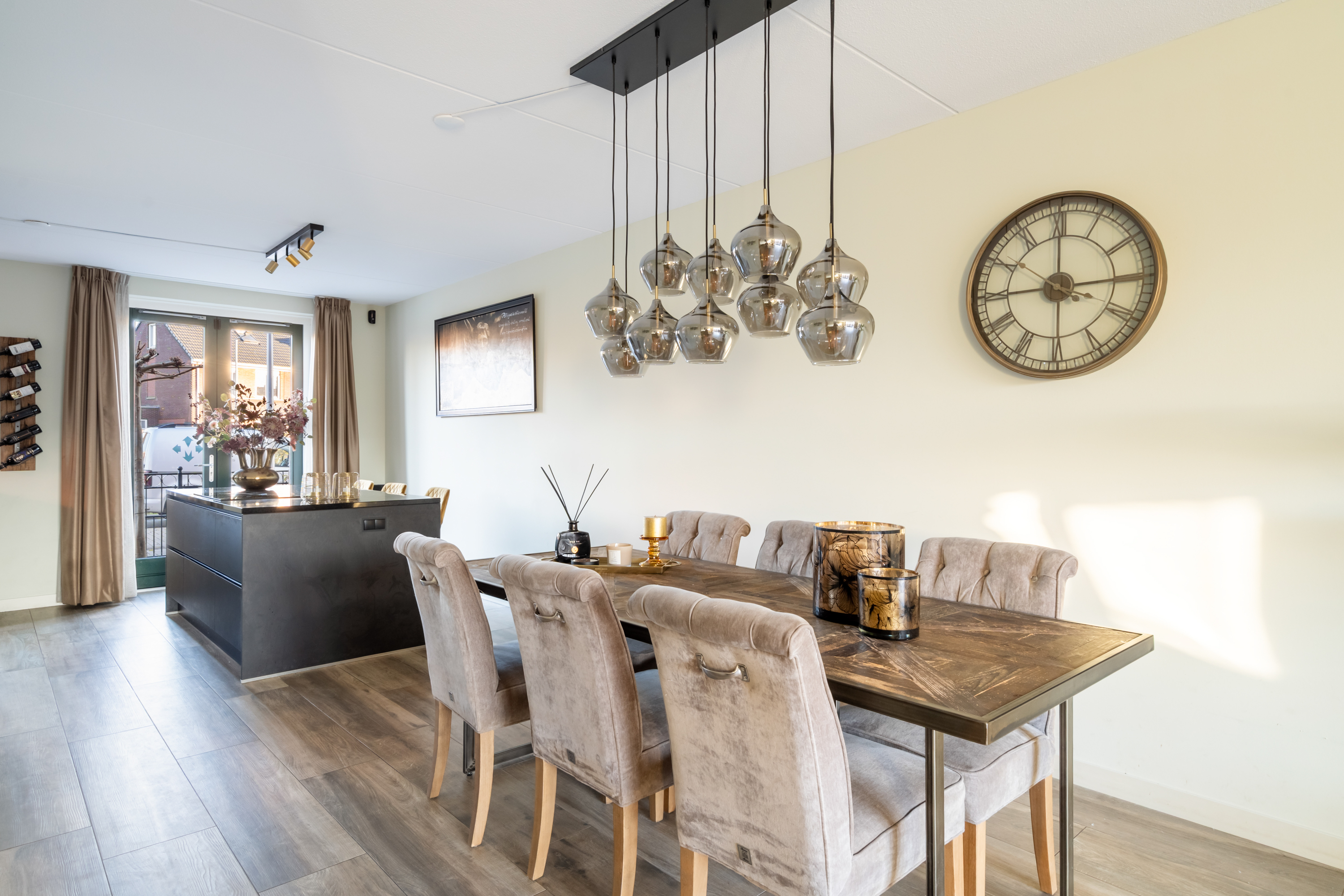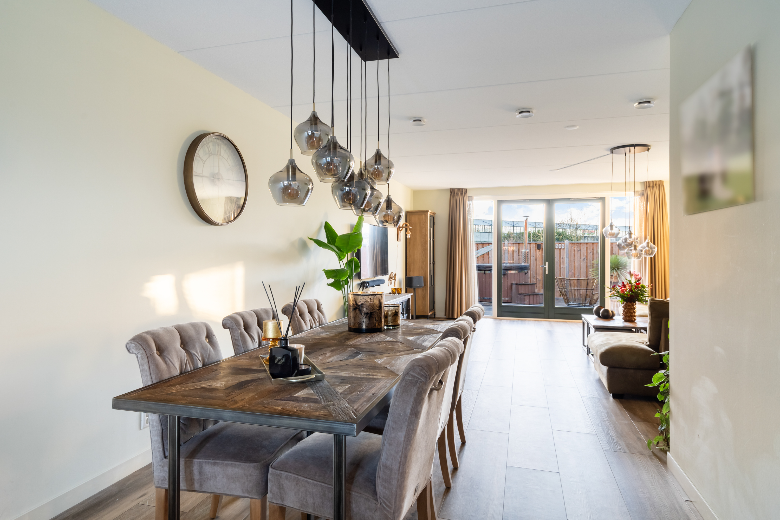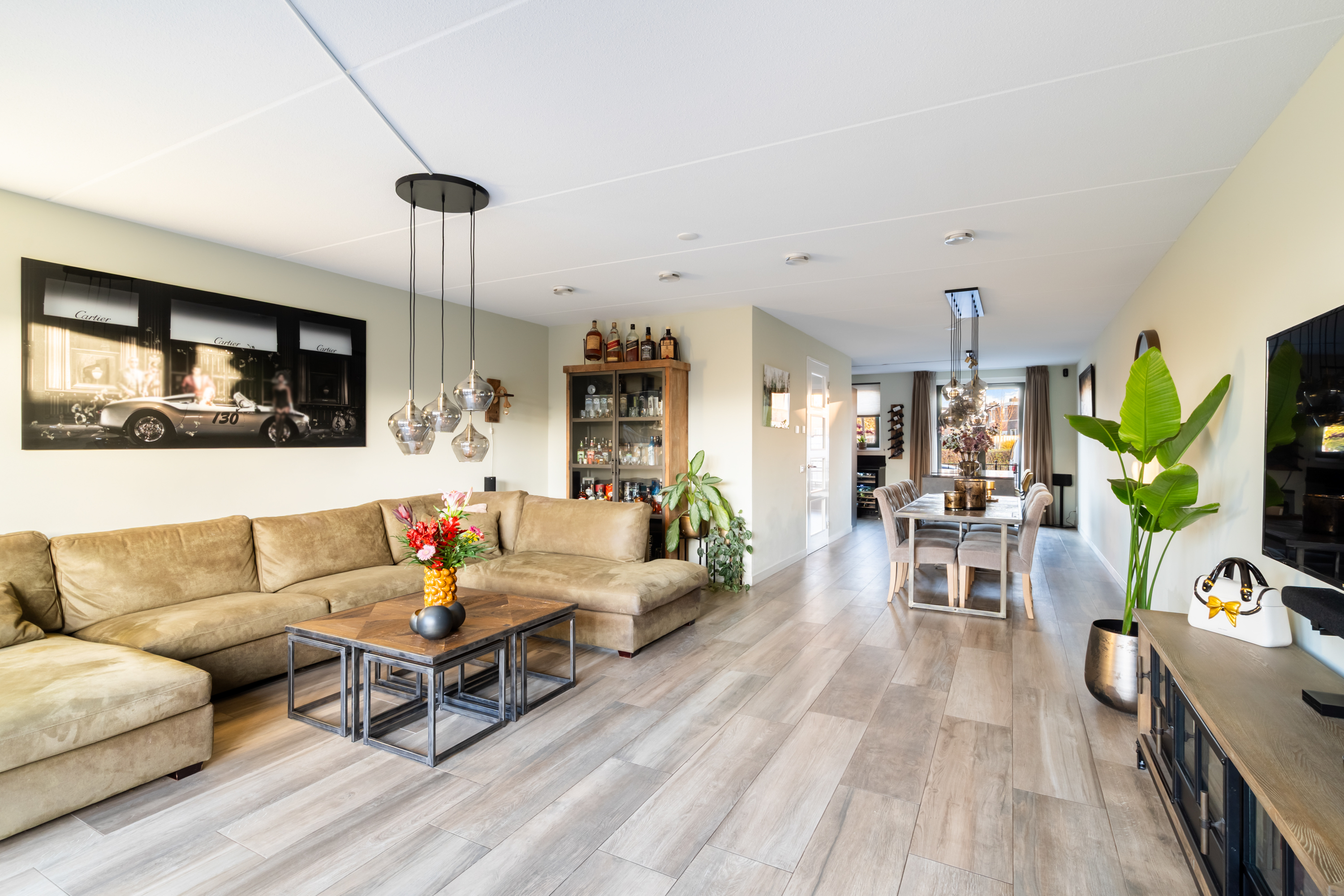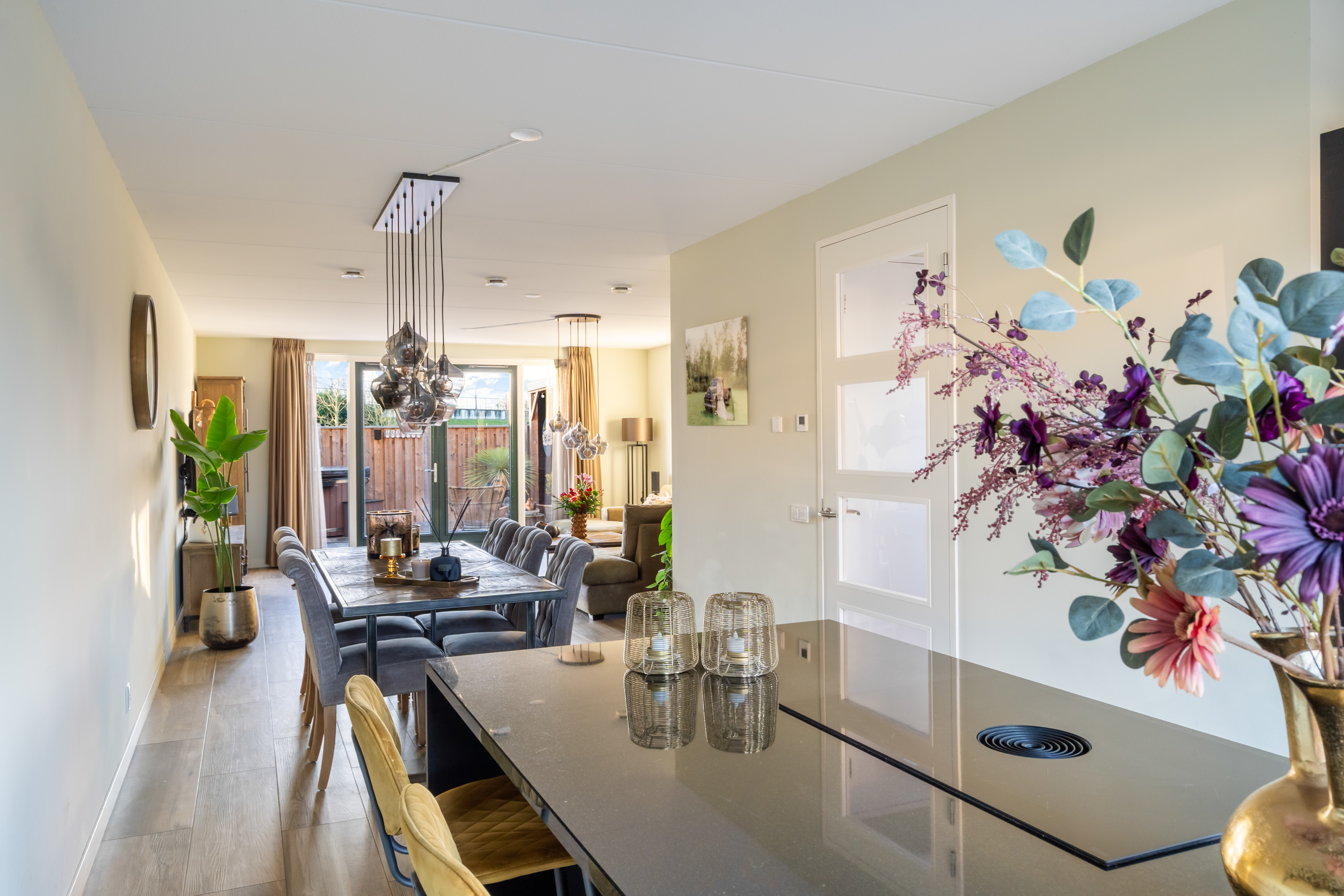Entree hal met garderobekast, meterkast. Trapopgang met stoffering naar de 1e verdieping. Luxe betegeld toilet met fonteintje. Via een glasdeur naar de heerlijk lichte woonkamer welke is voorzien van een glazen achterpui met openslaande deuren naar de zonnige tuin. Renovlies op de wanden. De luxe en complete open keuken met kookeiland is aan de voorzijde gelegen en voorzien van een zwart mat keukenblok aan beide zijden met voldoende kastruimte, lades, inductiekookplaat met “Bora” afzuiging, koel-/vriescombinatie, koffiemachine, combi-oven, vaatwasmachine, wijnkoelkast, quooker en natuursteen bovenblad. Laag glas aan de voorzijde van de keuken met openslaande deuren. De hal, woonkamer en keuken zijn voorzien van een fraaie tegelvloer met houtstructuur en met een 6-groeps vloerverwarming + koeling.