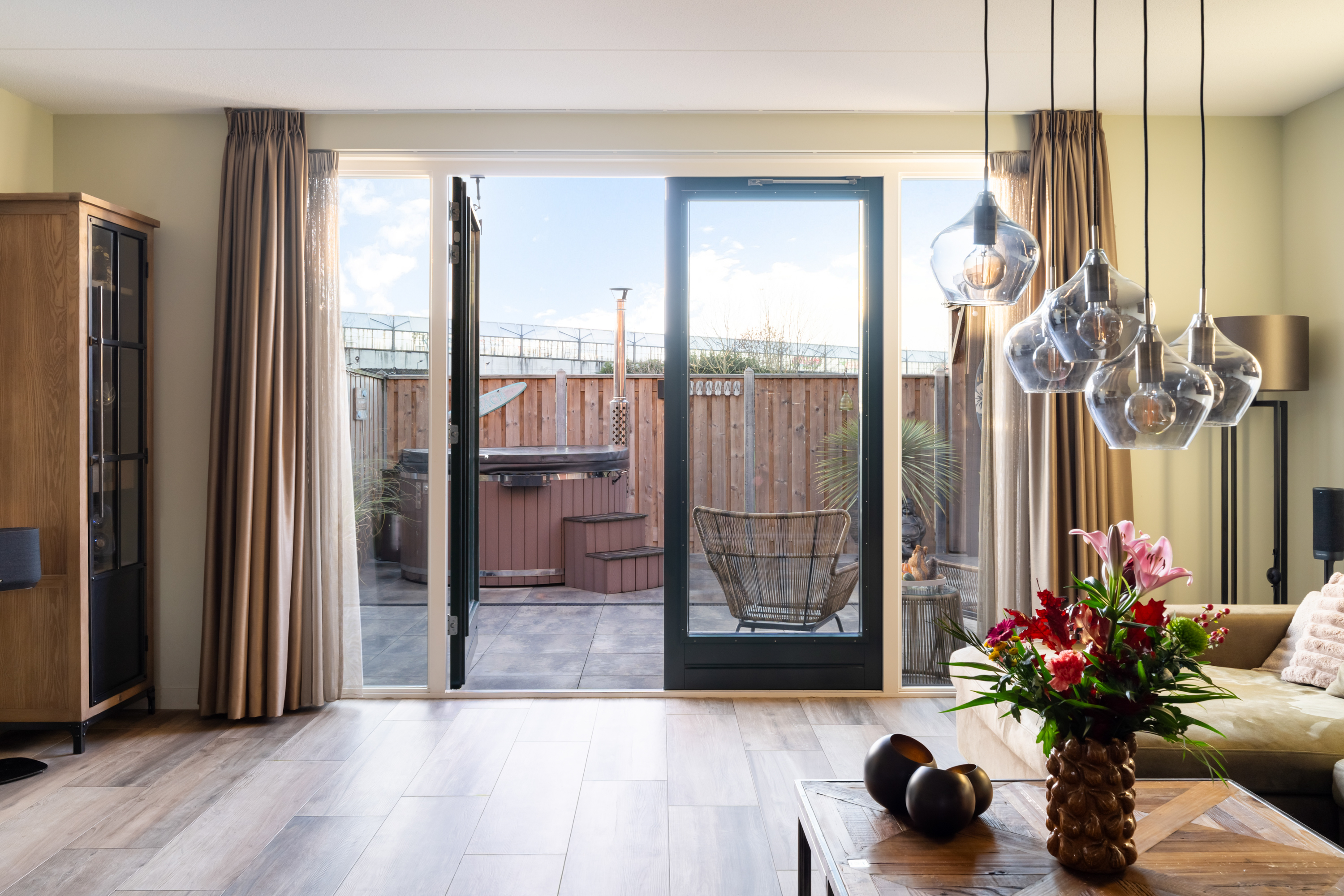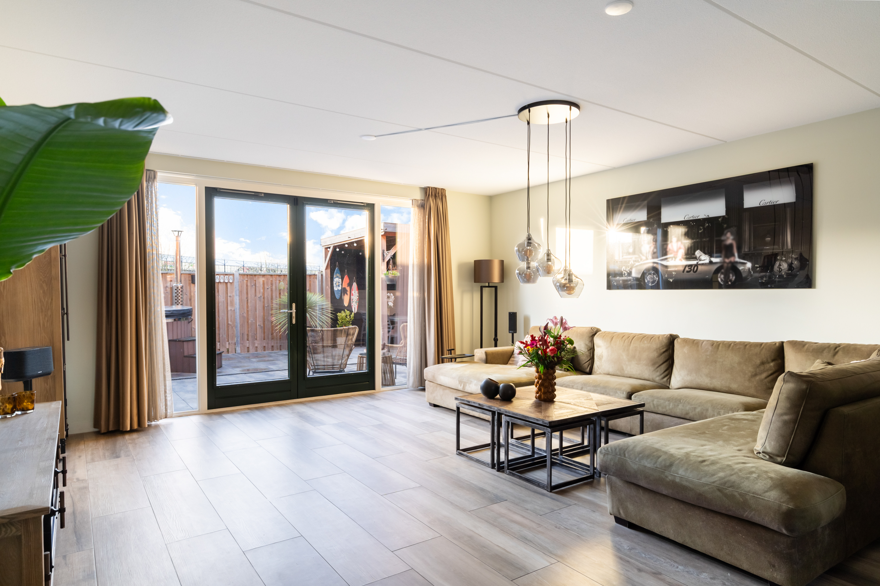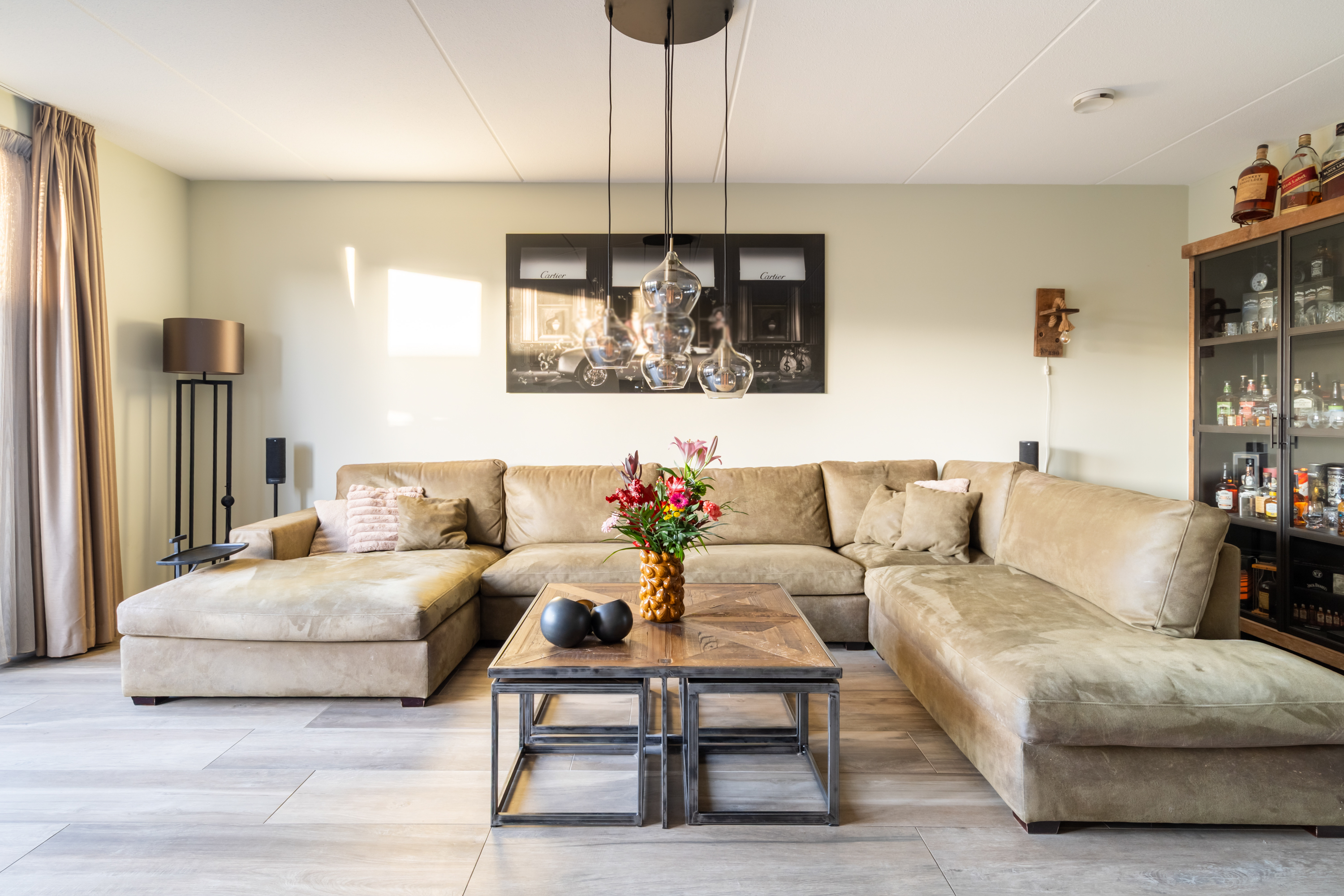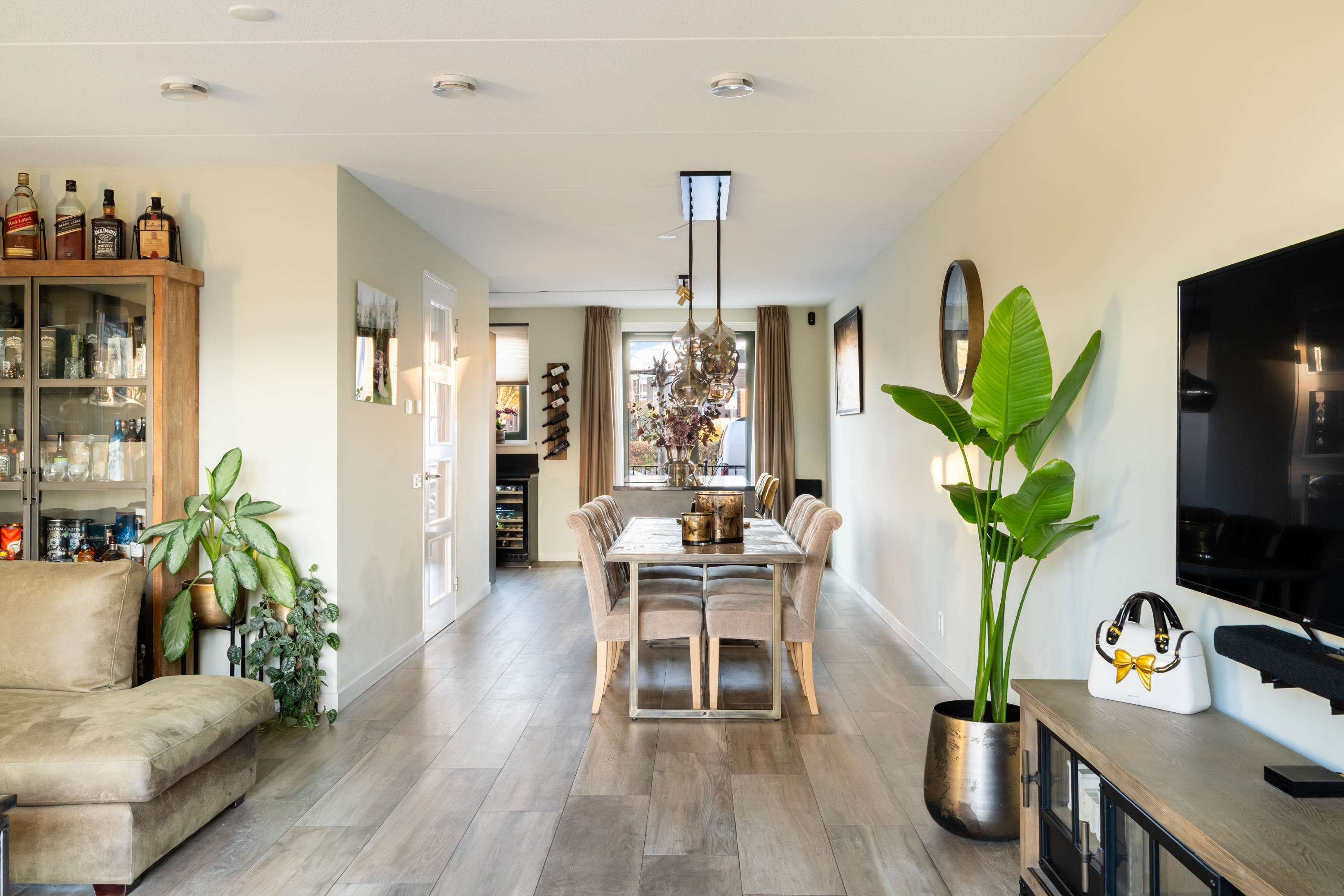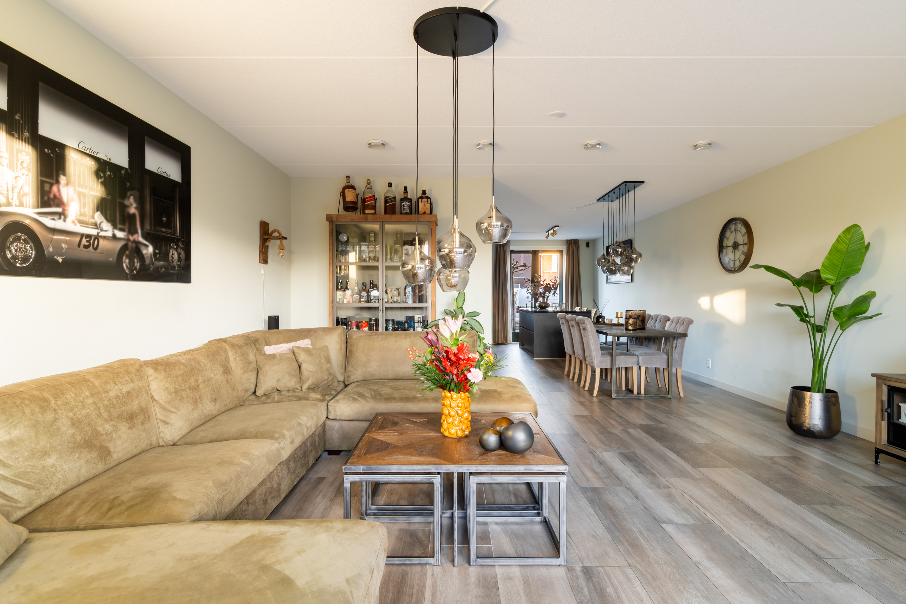 Entree hal met garderobekast, meterkast. Trapopgang met stoffering naar de 1e verdieping. Luxe betegeld toilet met fonteintje. Via een glasdeur naar de heerlijk lichte woonkamer welke is voorzien van een glazen achterpui met openslaande deuren naar de zonnige tuin. Renovlies op de wanden. De luxe en complete open keuken met kookeiland is aan de voorzijde gelegen en voorzien van een zwart mat keukenblok aan beide zijden met voldoende kastruimte, lades, inductiekookplaat met “Bora” afzuiging, koel-/vriescombinatie, koffiemachine, combi-oven, vaatwasmachine, wijnkoelkast, quooker en natuursteen bovenblad. Laag glas aan de voorzijde van de keuken met openslaande deuren. De hal, woonkamer en keuken zijn voorzien van een fraaie tegelvloer met houtstructuur en met een 6-groeps vloerverwarming + koeling.