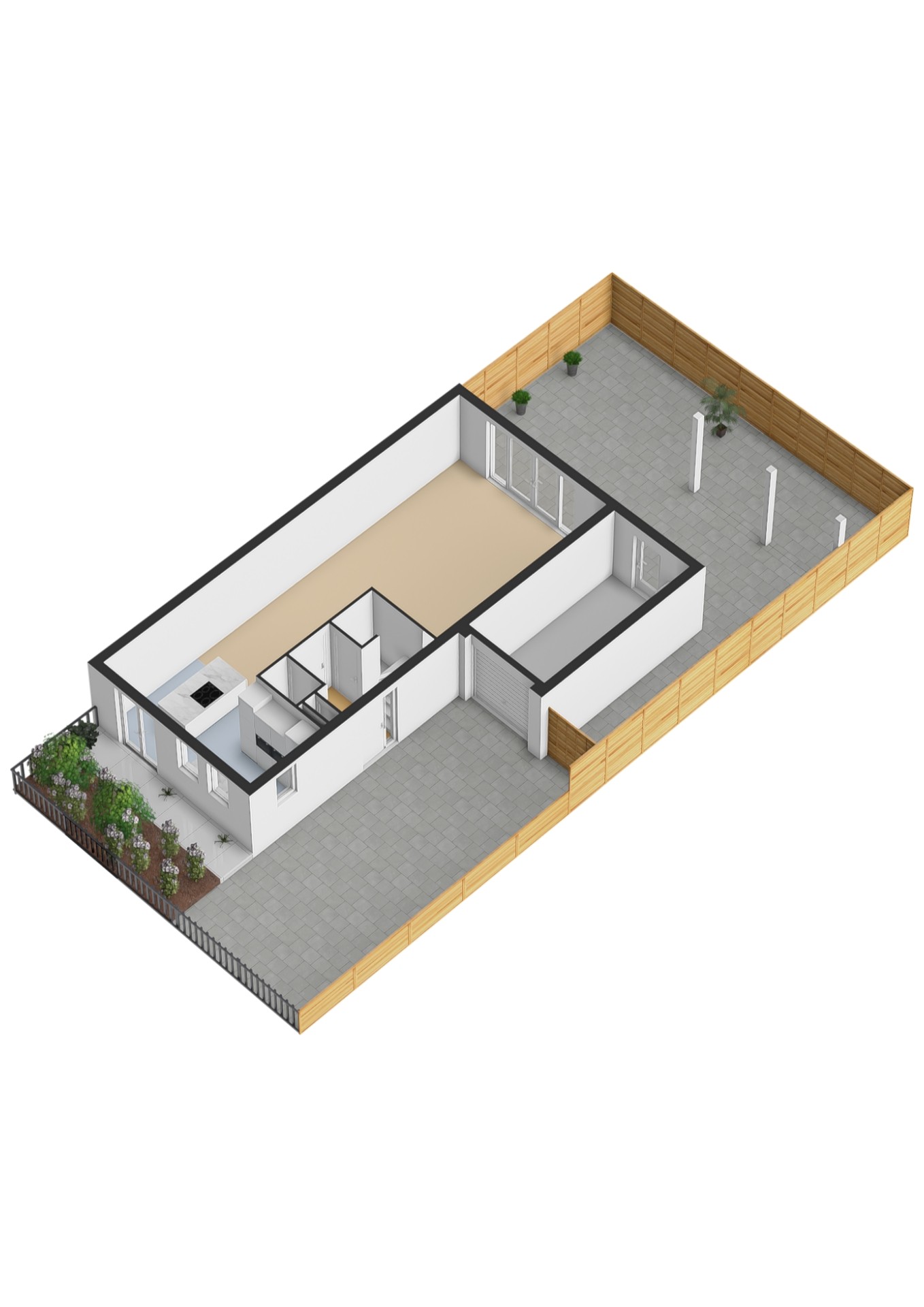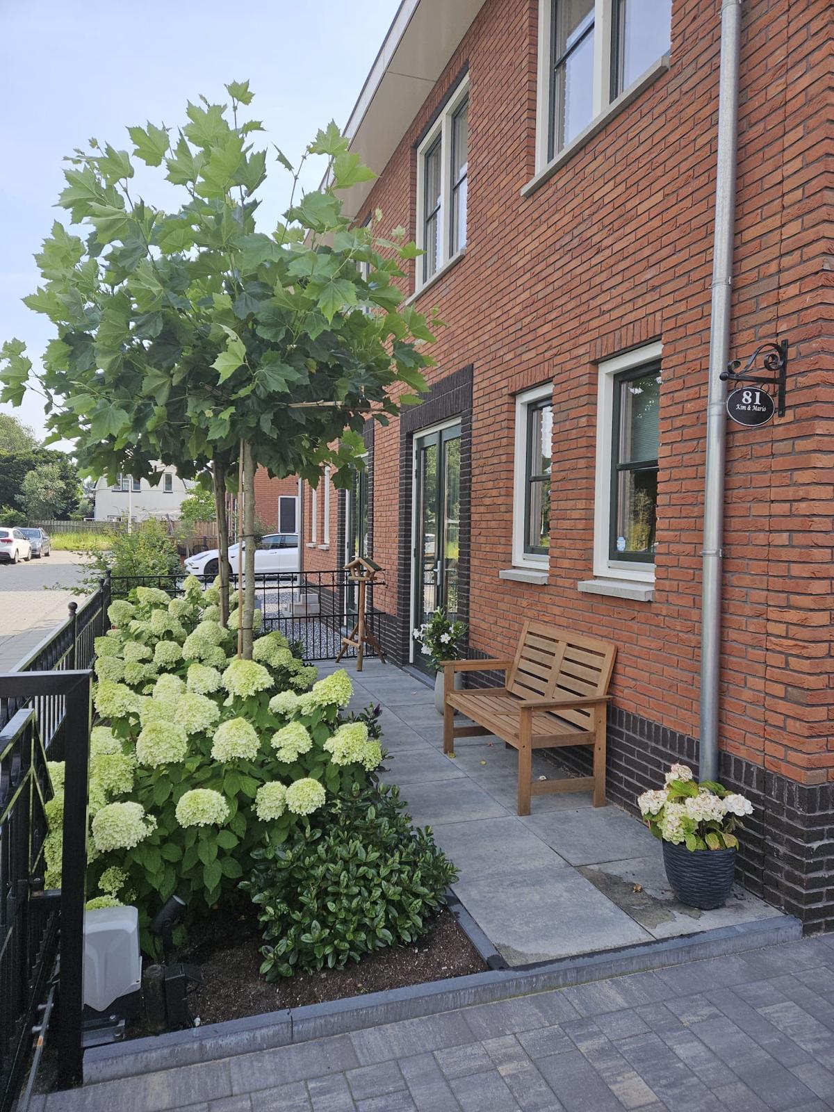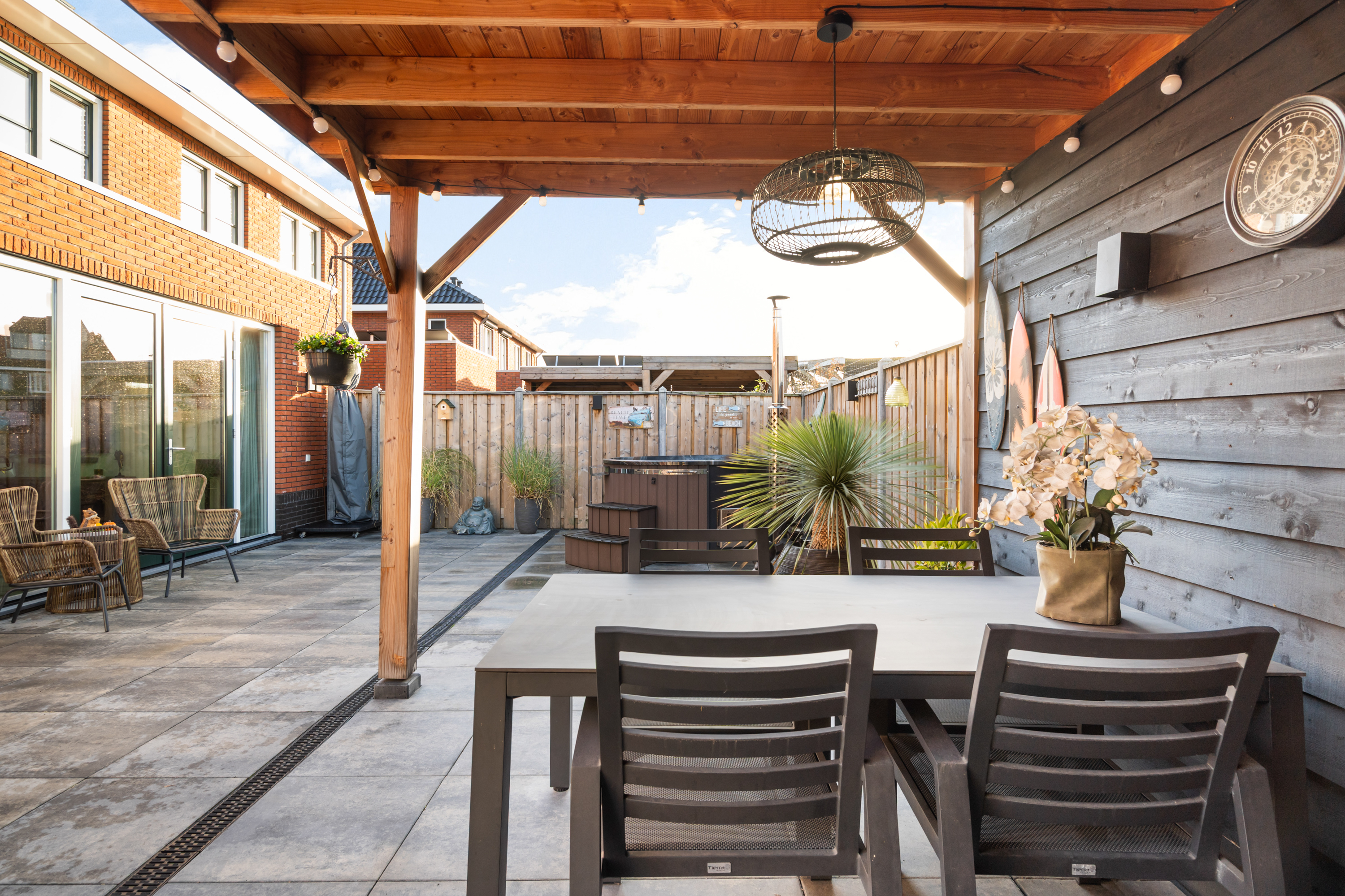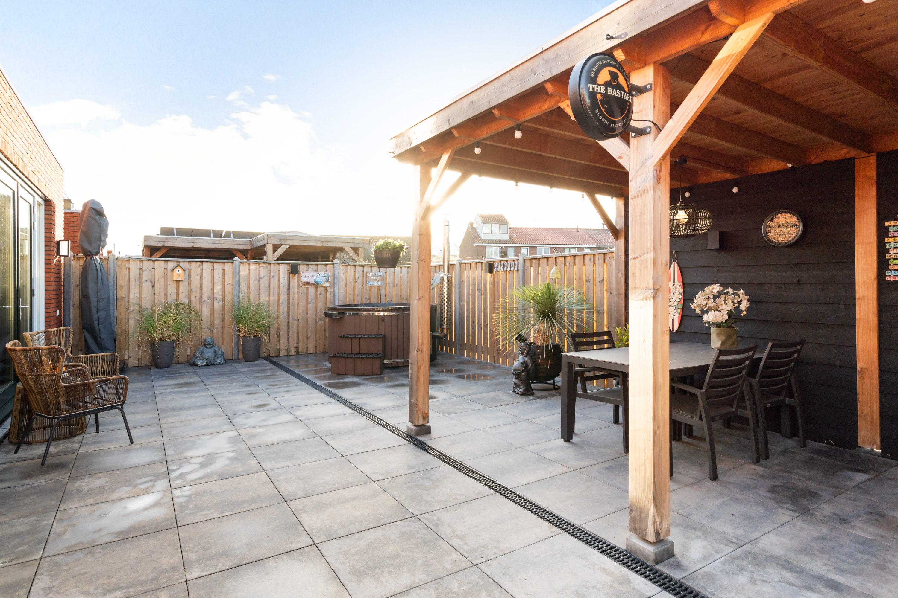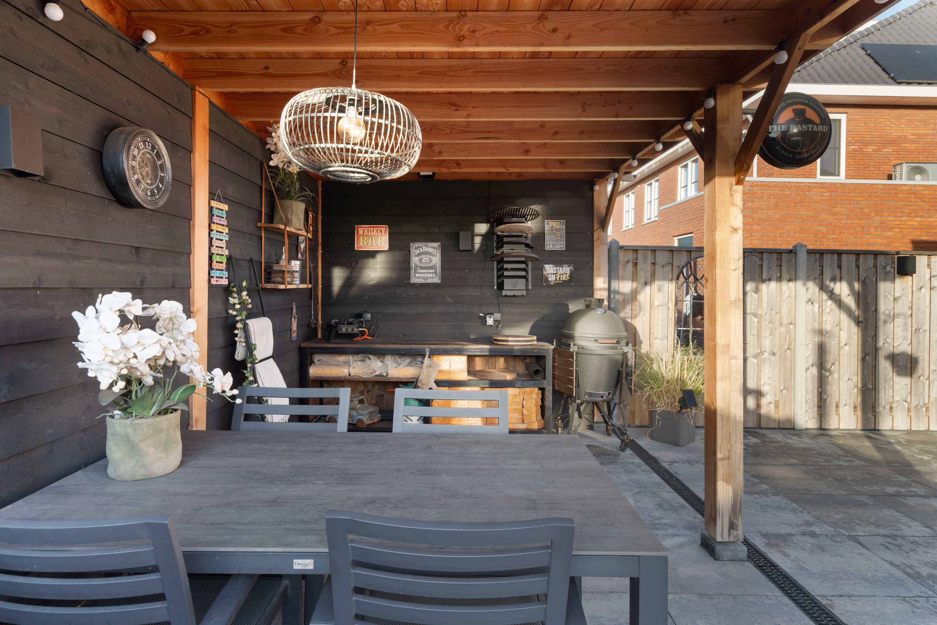 De achtertuin is gelegen op het zuidwesten, heeft veel privacy en is circa 70 m² groot, is geheel omheind en geheel voorzien van straatwerk. Achter in de tuin staat tevens een sfeervolle houten overkapping welke is voorzien van elektra. Naast de woning is tevens nog een garage circa 15 m² welke is voorzien van een elektrische roldeur. Via een afgesloten poort aan de zijkant van de woning, kom je aan de voorzijde van de woning met parkeermogelijkheden voor 2 auto’s. De voortuin is onderhoudsvriendelijk gemaakt en voorzien van een sfeervol sierhek met elektrische poort, bestrating en 2 dakplantanen.
