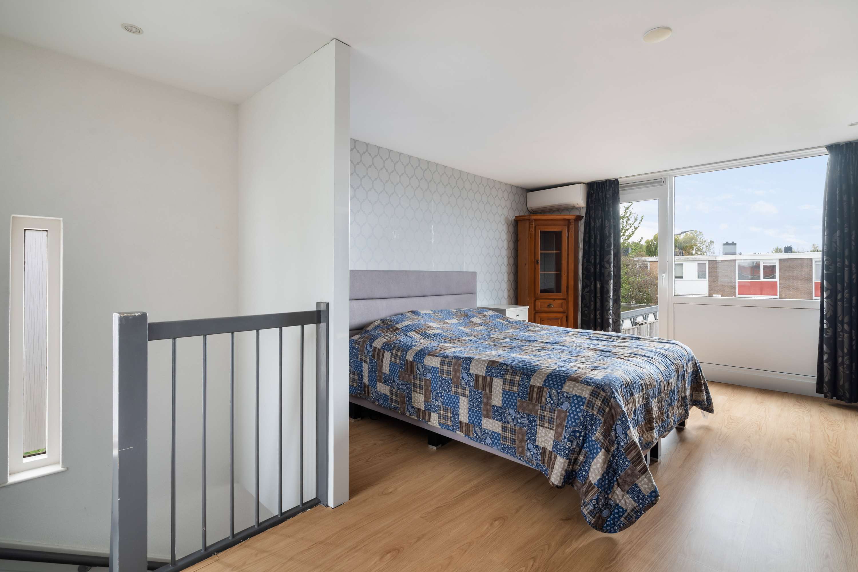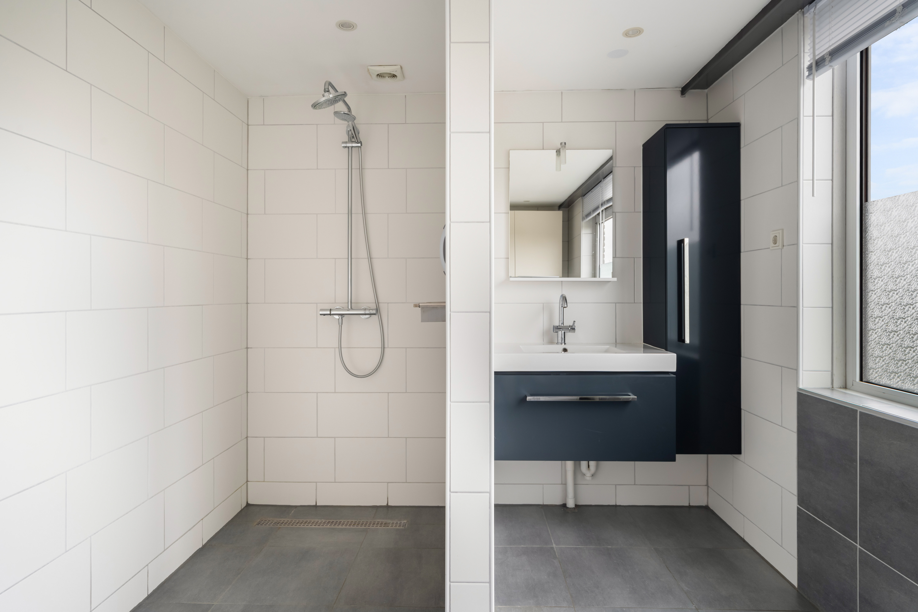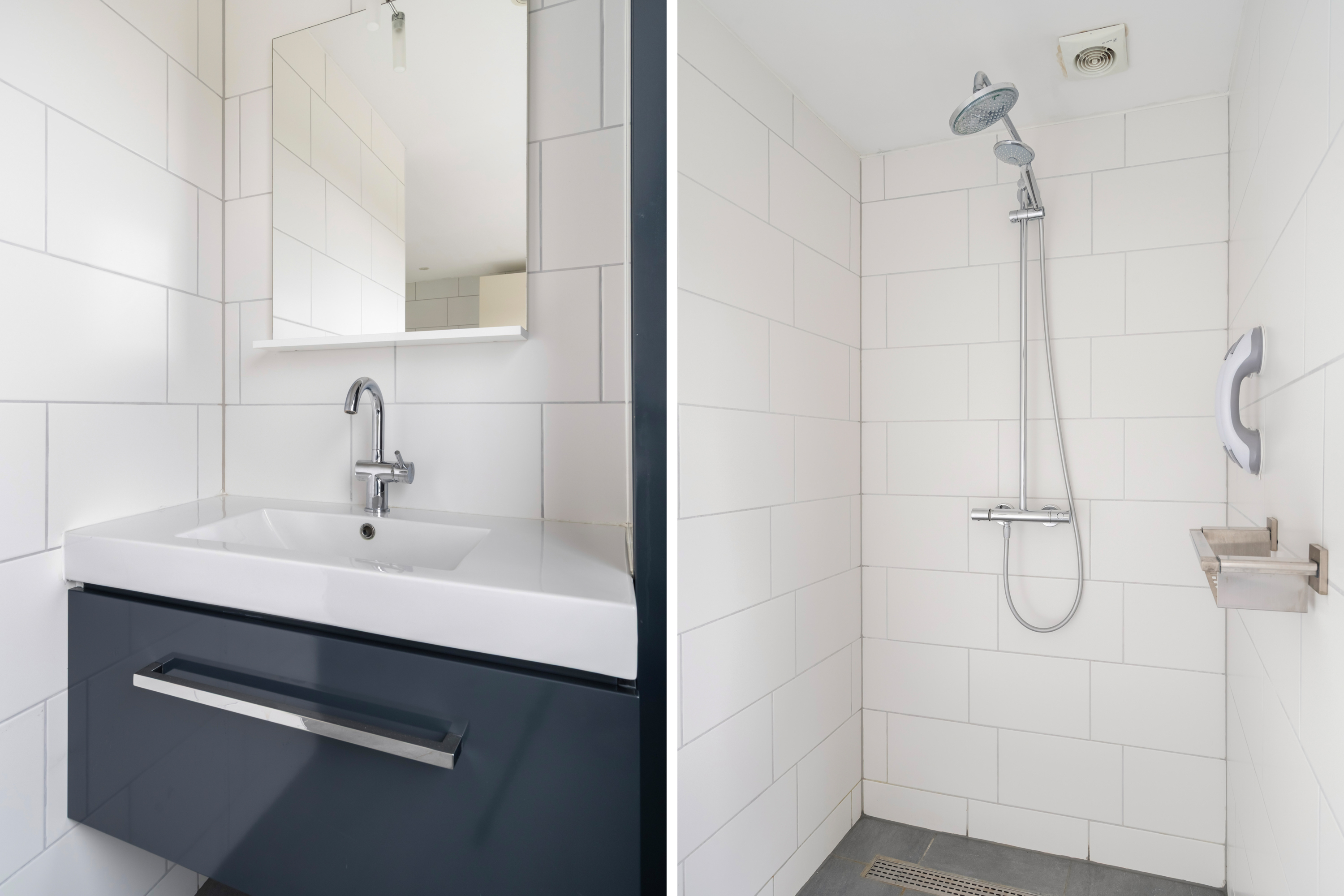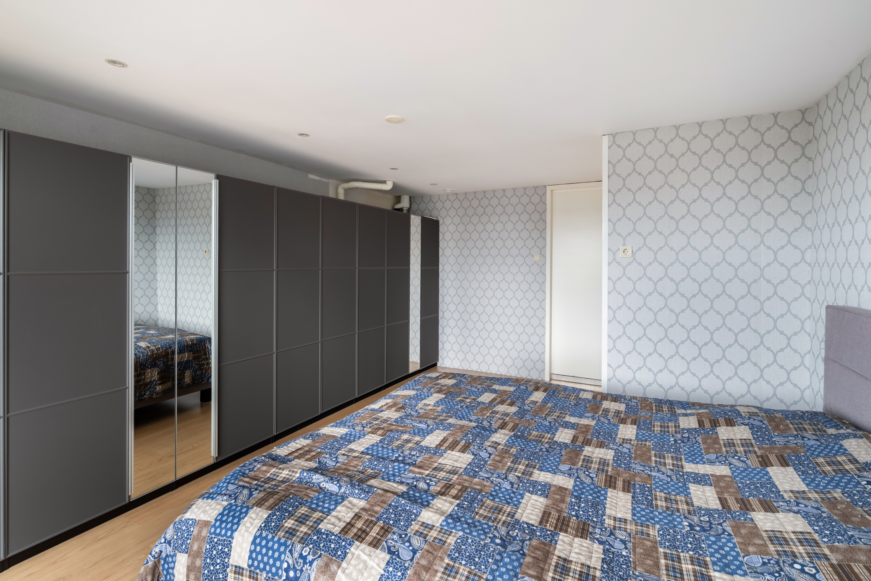 Overloop met toegang tot de vaste kastenwand met opstelling van de CV-ketel “Intergas” 2014. 1 ruime slaapkamer (circa 23 m²) aan de achterzijde van de woning (voorheen 2 kamers) welke is voorzien van een airco installatie (2022). De slaapkamer is keurig afgewerkt en v.v. een laminaatvloer. De moderne badkamer (voorheen slaapkamer) is geheel betegeld en voorzien van een royale inloopdouche met regendouche, 2e toilet, badkamermeubel met wastafel, mechanische afzuiging en de wasmachine/droger aansluiting.