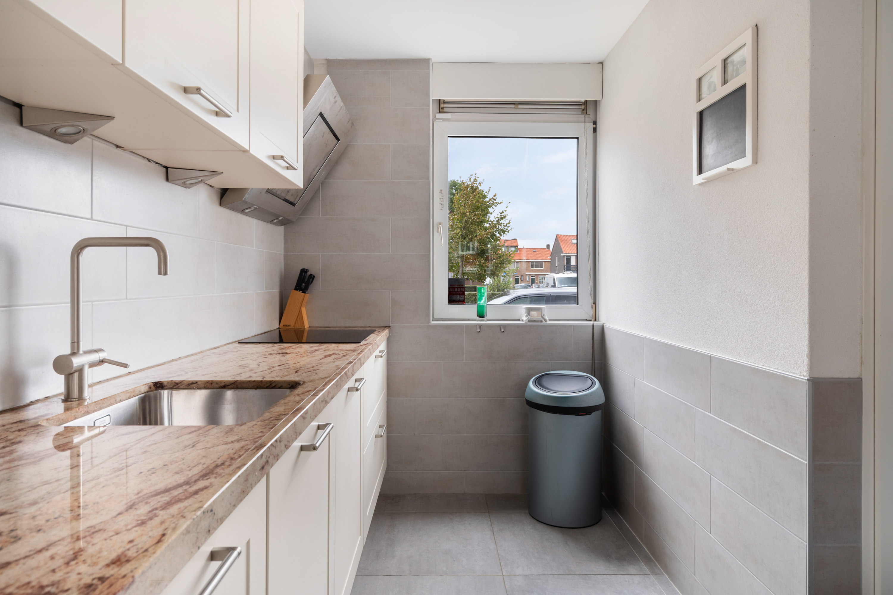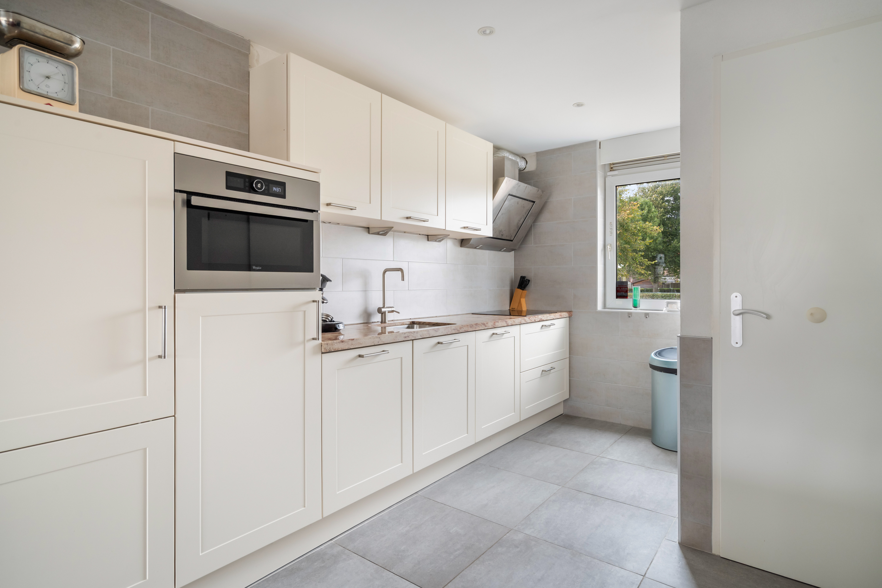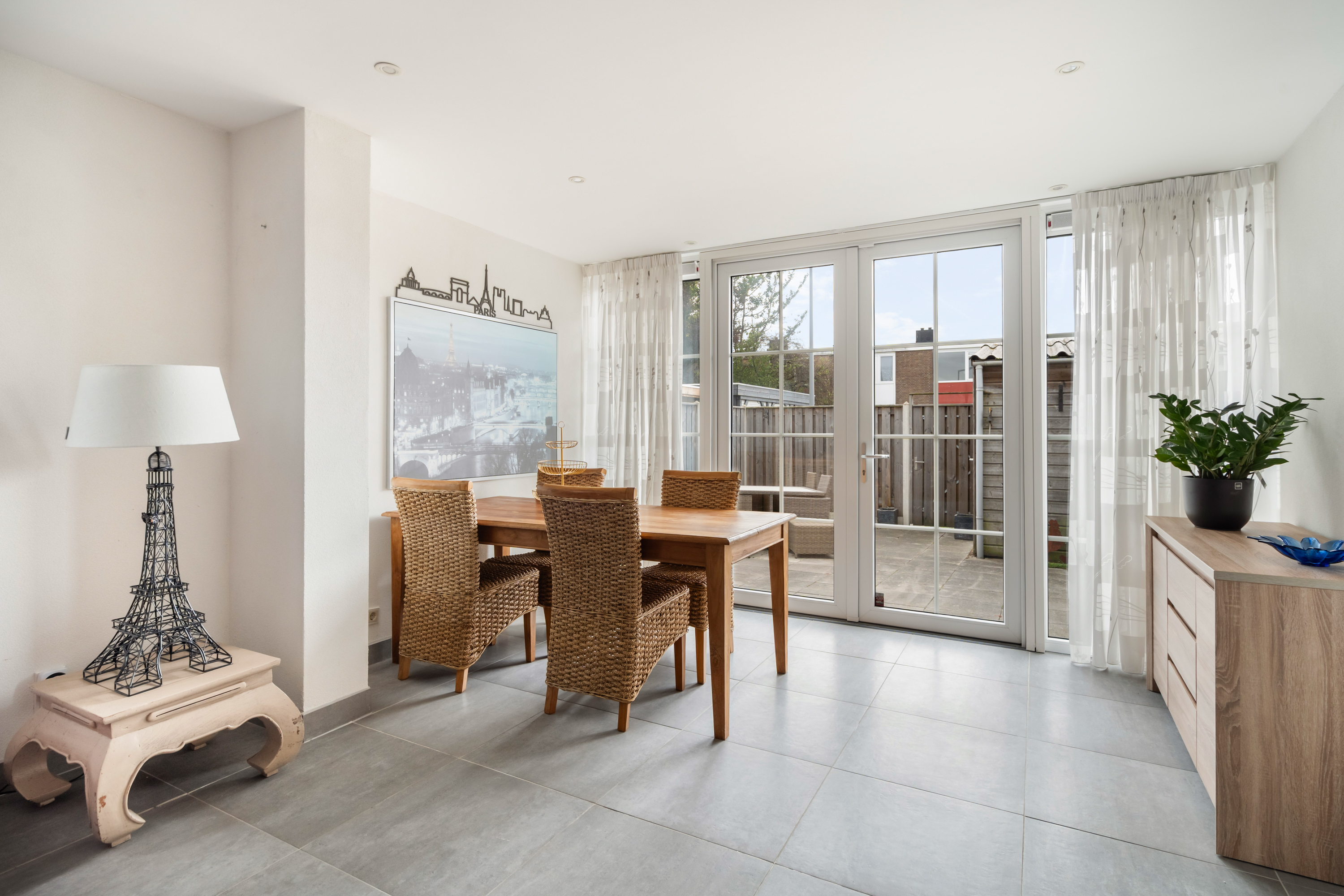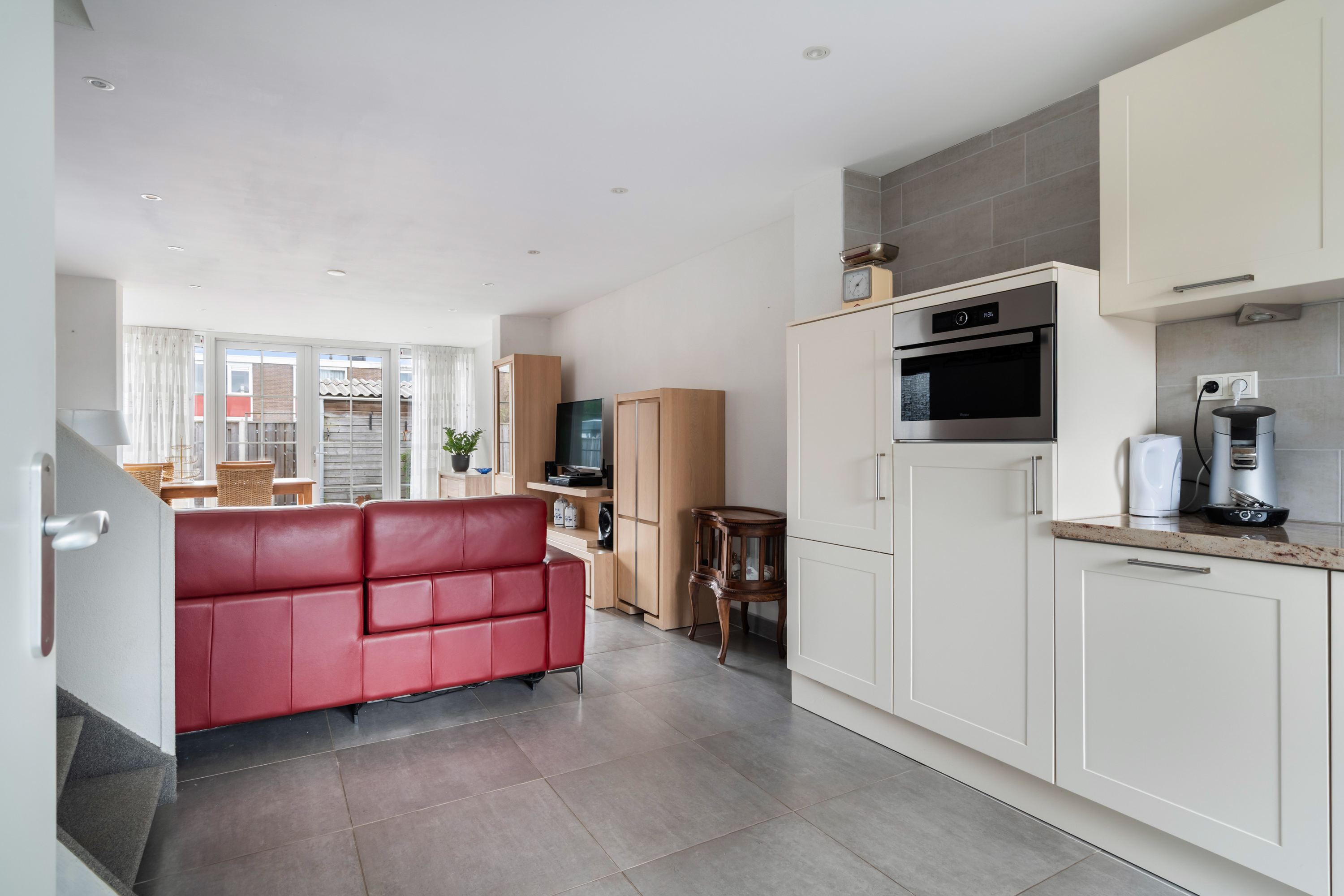 Entree, gang, waarin een modern toilet v.v. hangend closet (2015). Toegang naar de woonkamer, met trap-/bergkast met daarin de vloerverwarmingsinstallatie en een nieuwe groepenkast. De keuken is gelegen aan de voorzijde van de woning en is voorzien van voorzien van een moderne opstelling v.v. alle benodigde inbouwapparatuur zoals o.a. inductiekookplaat, afzuigschouw, combi-magnetron, vaatwasser, koelkast, vriezer, marmeren bovenblad, diverse kastruimte en lades. Aansluitend de in 2015 uitgebouwde woonkamer van circa 26 m² welke is voorzien van een vaste trap naar de 1e verdieping, een extra zijraam en strak afgewerkte muren en plafonds. De openslaande deuren geven toegang tot de keurig aangelegde onderhoudsvrije achtertuin gelegen op het zuiden. De gehele begane grond is v.v. een trendy tegelvloer met vloerverwarming (2015).