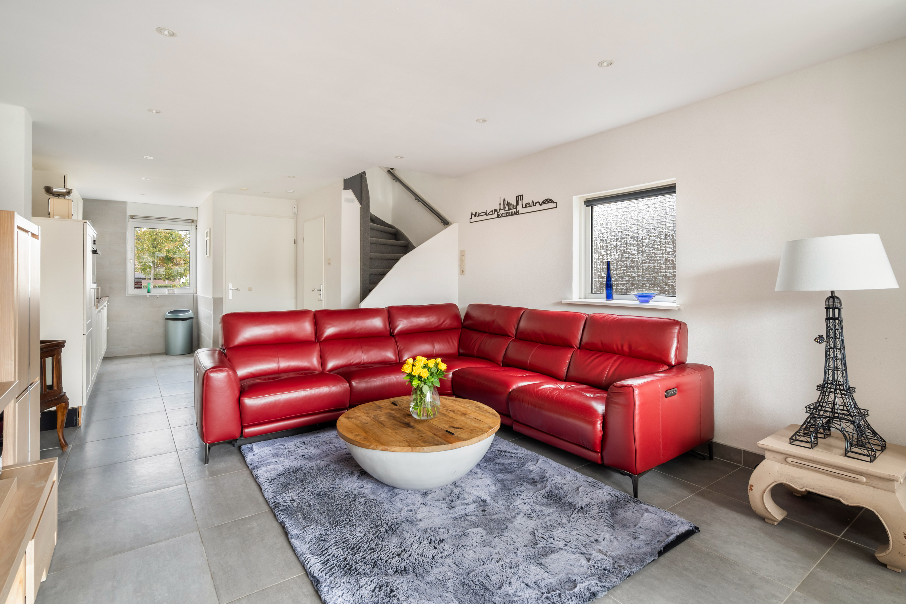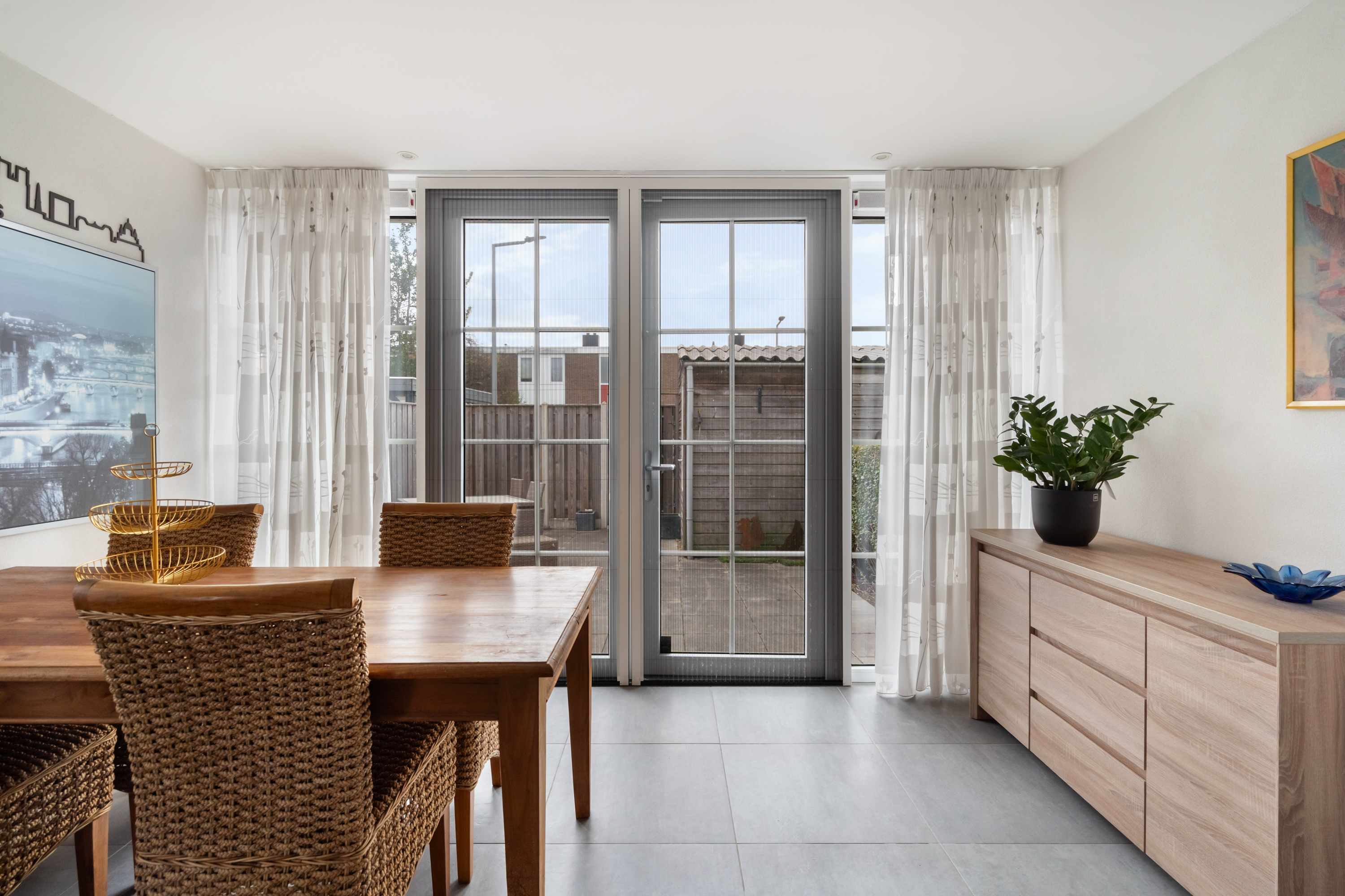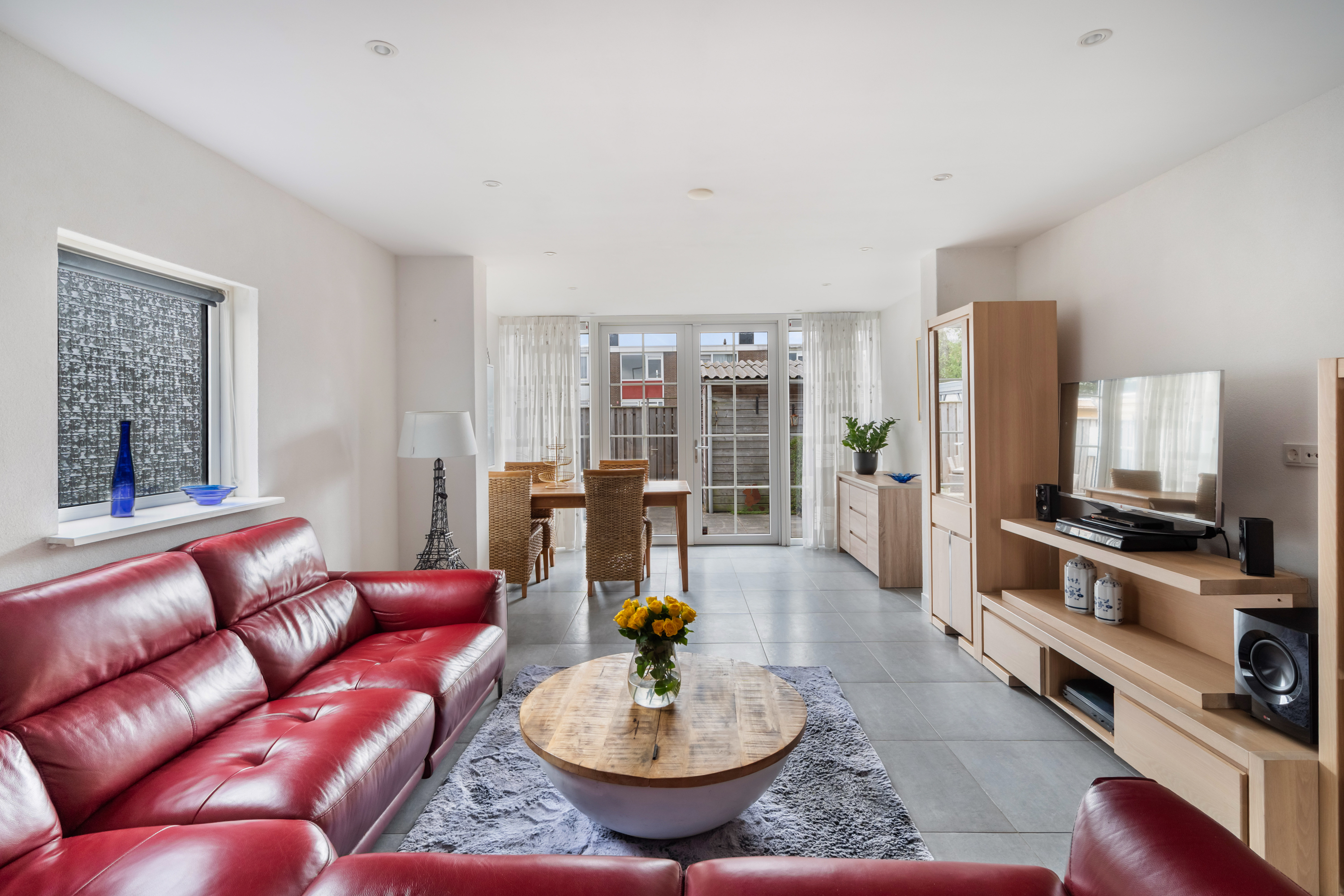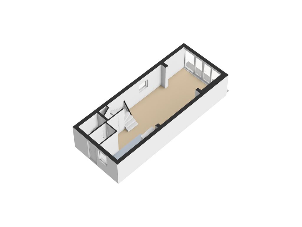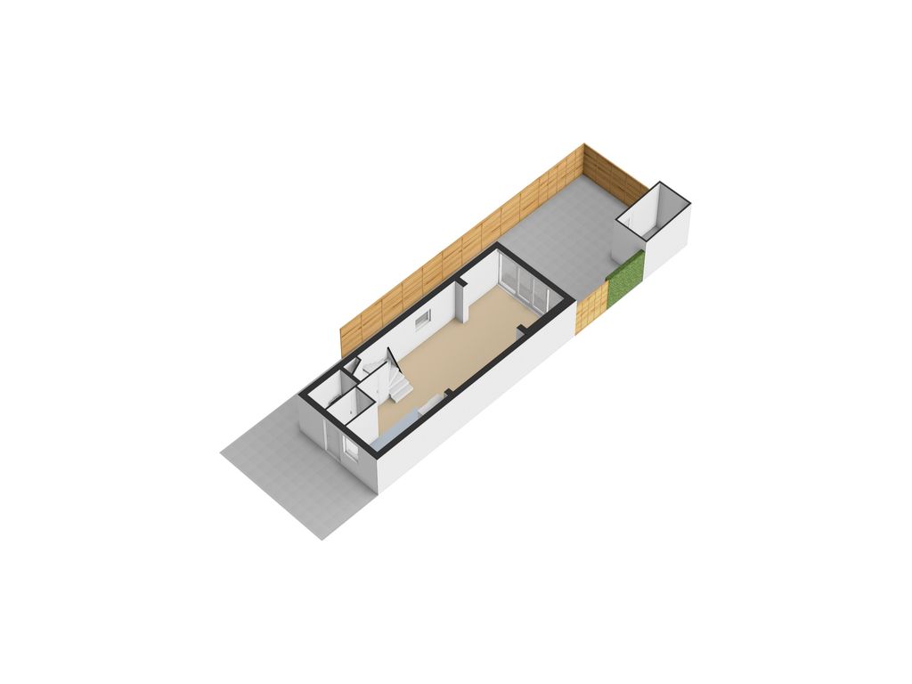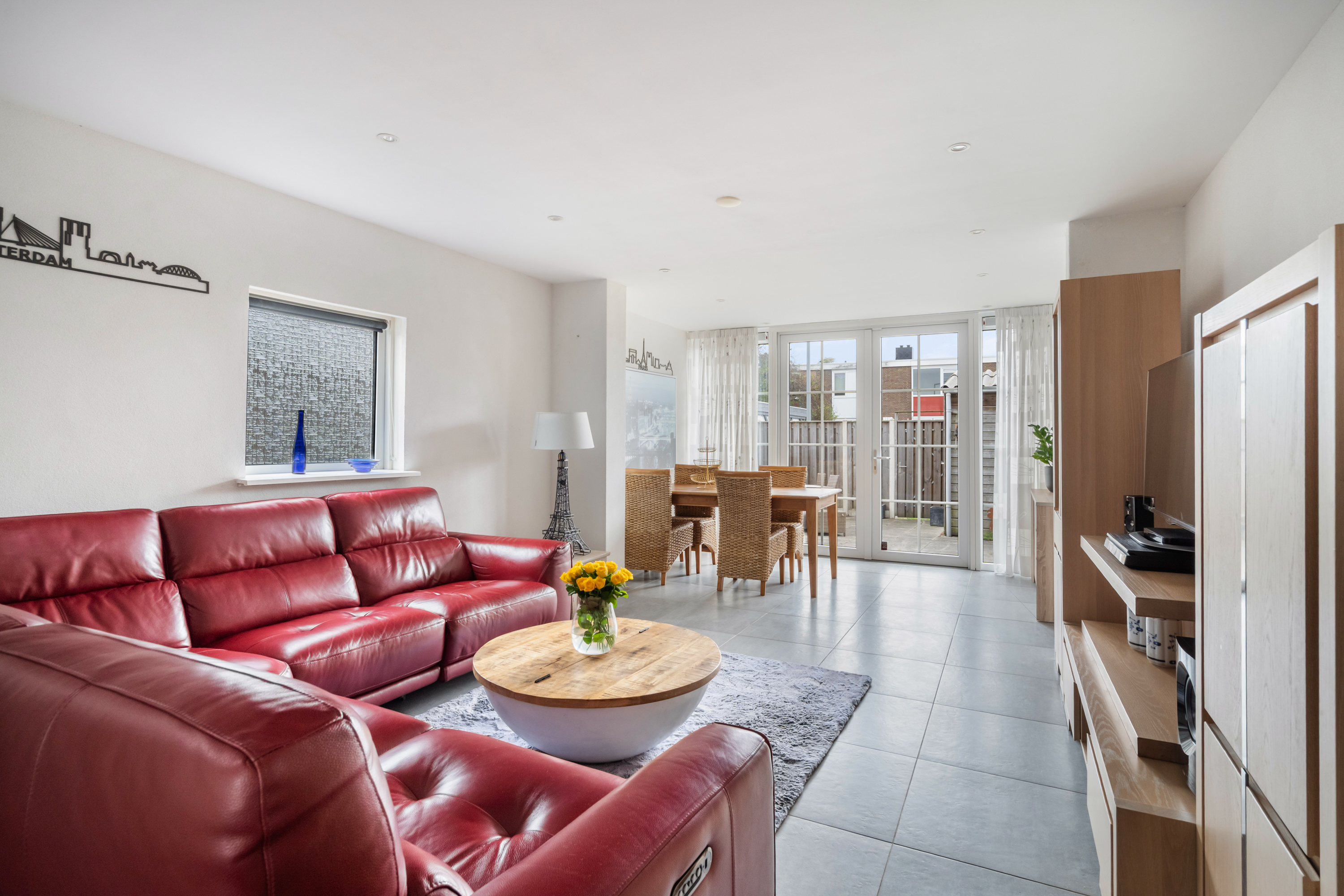 Entree, gang, waarin een modern toilet v.v. hangend closet (2015). Toegang naar de woonkamer, met trap-/bergkast met daarin de vloerverwarmingsinstallatie en een nieuwe groepenkast. De keuken is gelegen aan de voorzijde van de woning en is voorzien van voorzien van een moderne opstelling v.v. alle benodigde inbouwapparatuur zoals o.a. inductiekookplaat, afzuigschouw, combi-magnetron, vaatwasser, koelkast, vriezer, marmeren bovenblad, diverse kastruimte en lades. Aansluitend de in 2015 uitgebouwde woonkamer van circa 26 m² welke is voorzien van een vaste trap naar de 1e verdieping, een extra zijraam en strak afgewerkte muren en plafonds. De openslaande deuren geven toegang tot de keurig aangelegde onderhoudsvrije achtertuin gelegen op het zuiden. De gehele begane grond is v.v. een trendy tegelvloer met vloerverwarming (2015).