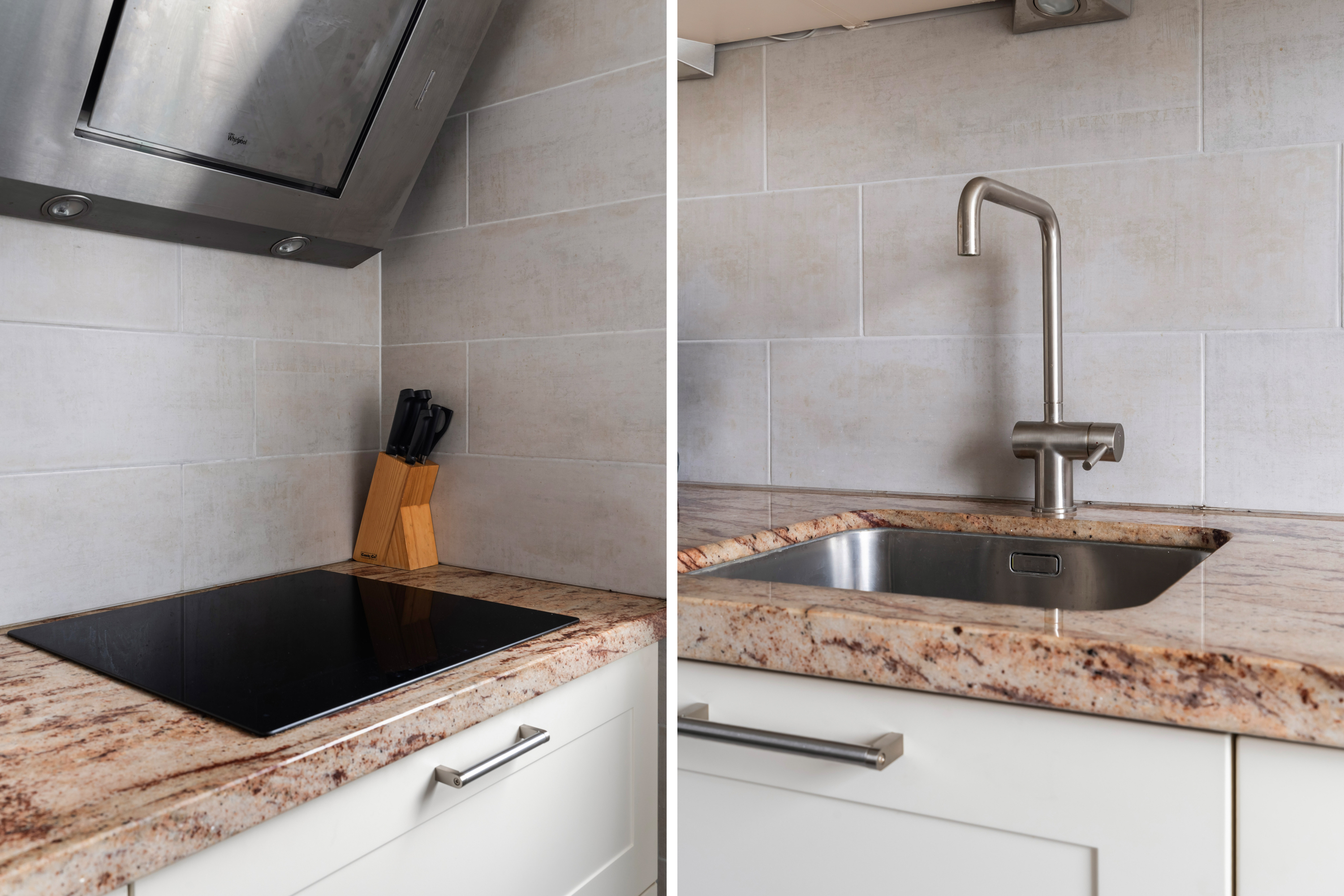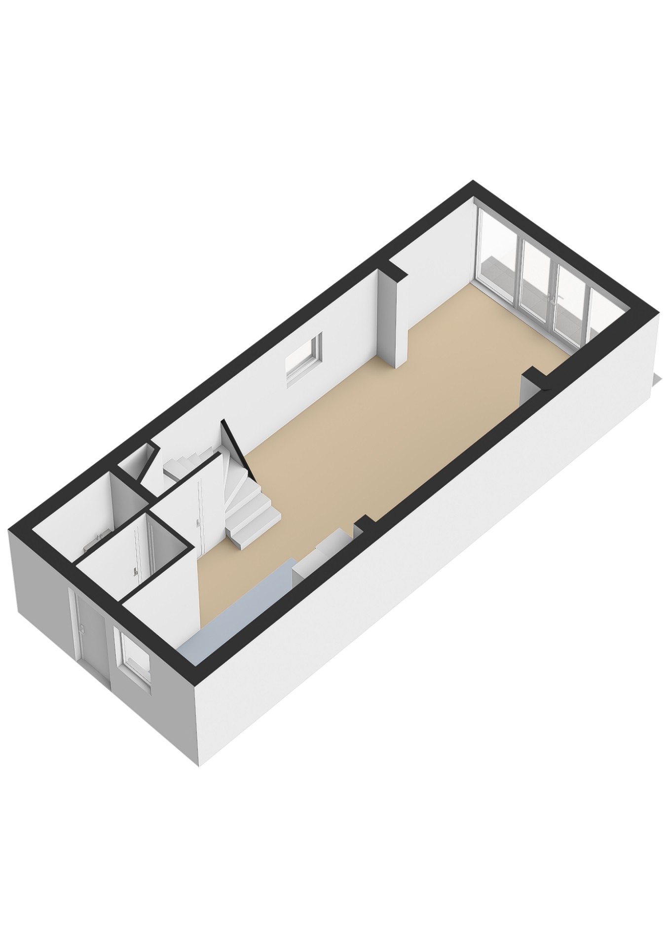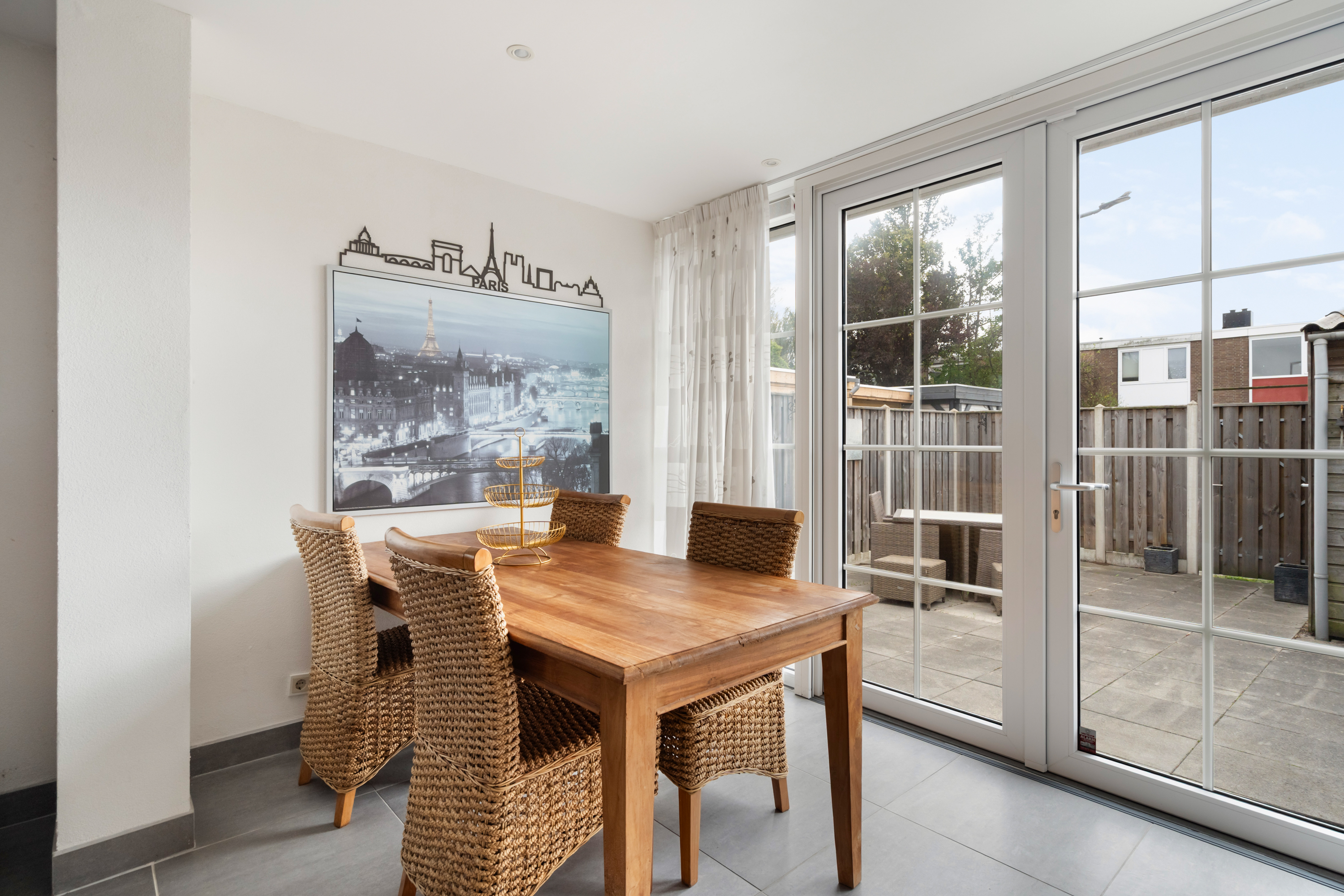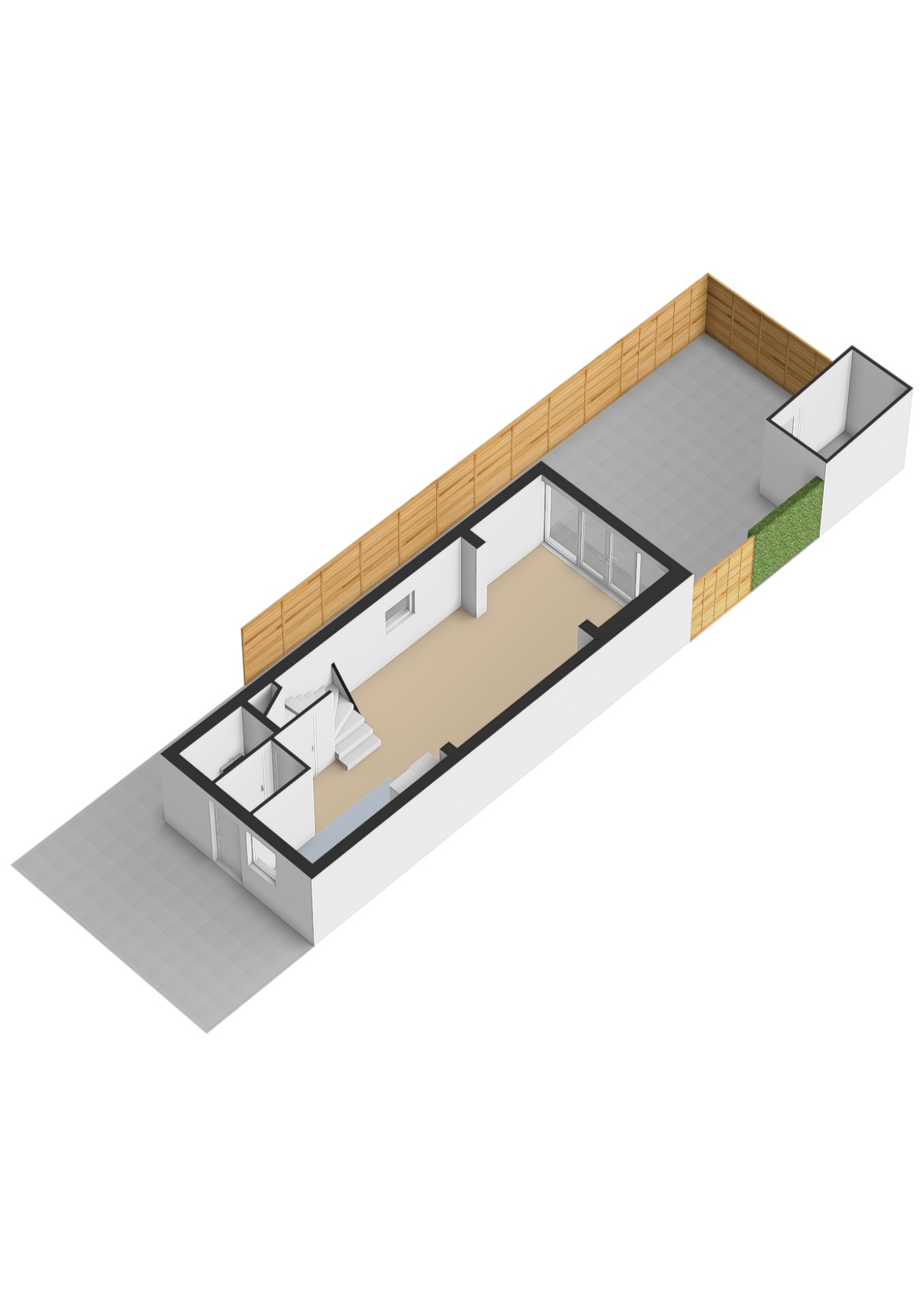 Entree, gang, waarin een modern toilet v.v. hangend closet (2015). Toegang naar de woonkamer, met trap-/bergkast met daarin de vloerverwarmingsinstallatie en een nieuwe groepenkast. De keuken is gelegen aan de voorzijde van de woning en is voorzien van voorzien van een moderne opstelling v.v. alle benodigde inbouwapparatuur zoals o.a. inductiekookplaat, afzuigschouw, combi-magnetron, vaatwasser, koelkast, vriezer, marmeren bovenblad, diverse kastruimte en lades. Aansluitend de in 2015 uitgebouwde woonkamer van circa 26 m² welke is voorzien van een vaste trap naar de 1e verdieping, een extra zijraam en strak afgewerkte muren en plafonds. De openslaande deuren geven toegang tot de keurig aangelegde onderhoudsvrije achtertuin gelegen op het zuiden. De gehele begane grond is v.v. een trendy tegelvloer met vloerverwarming (2015).