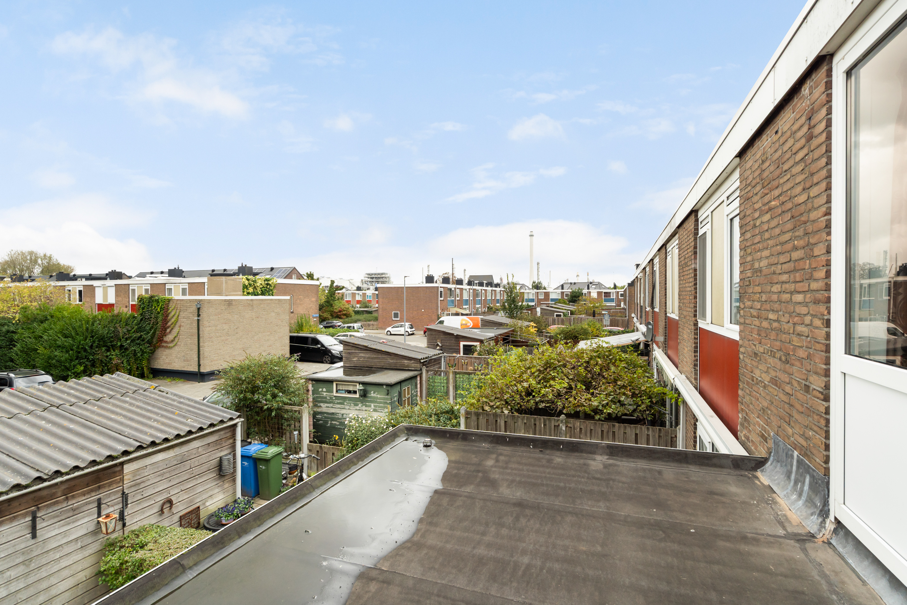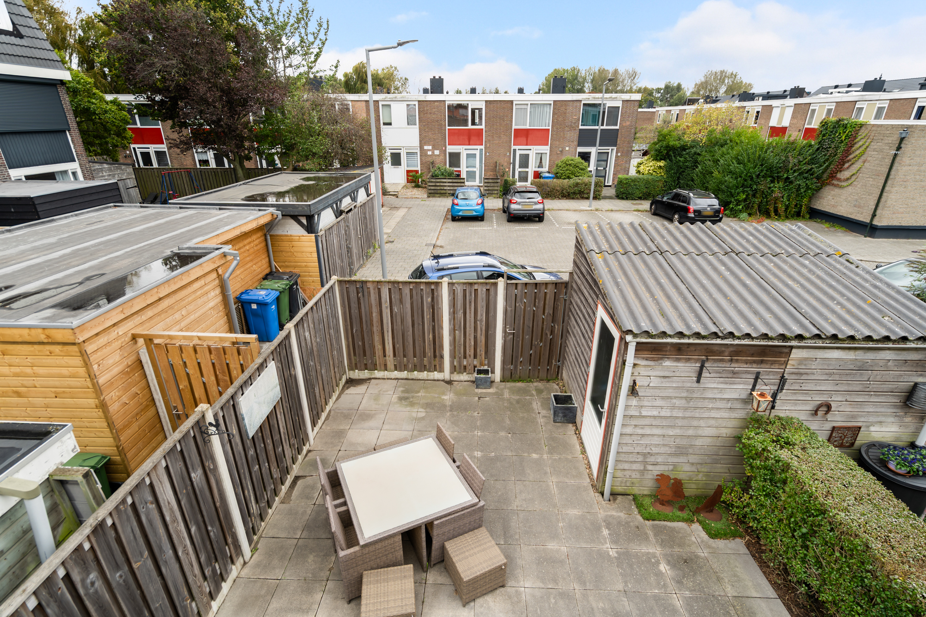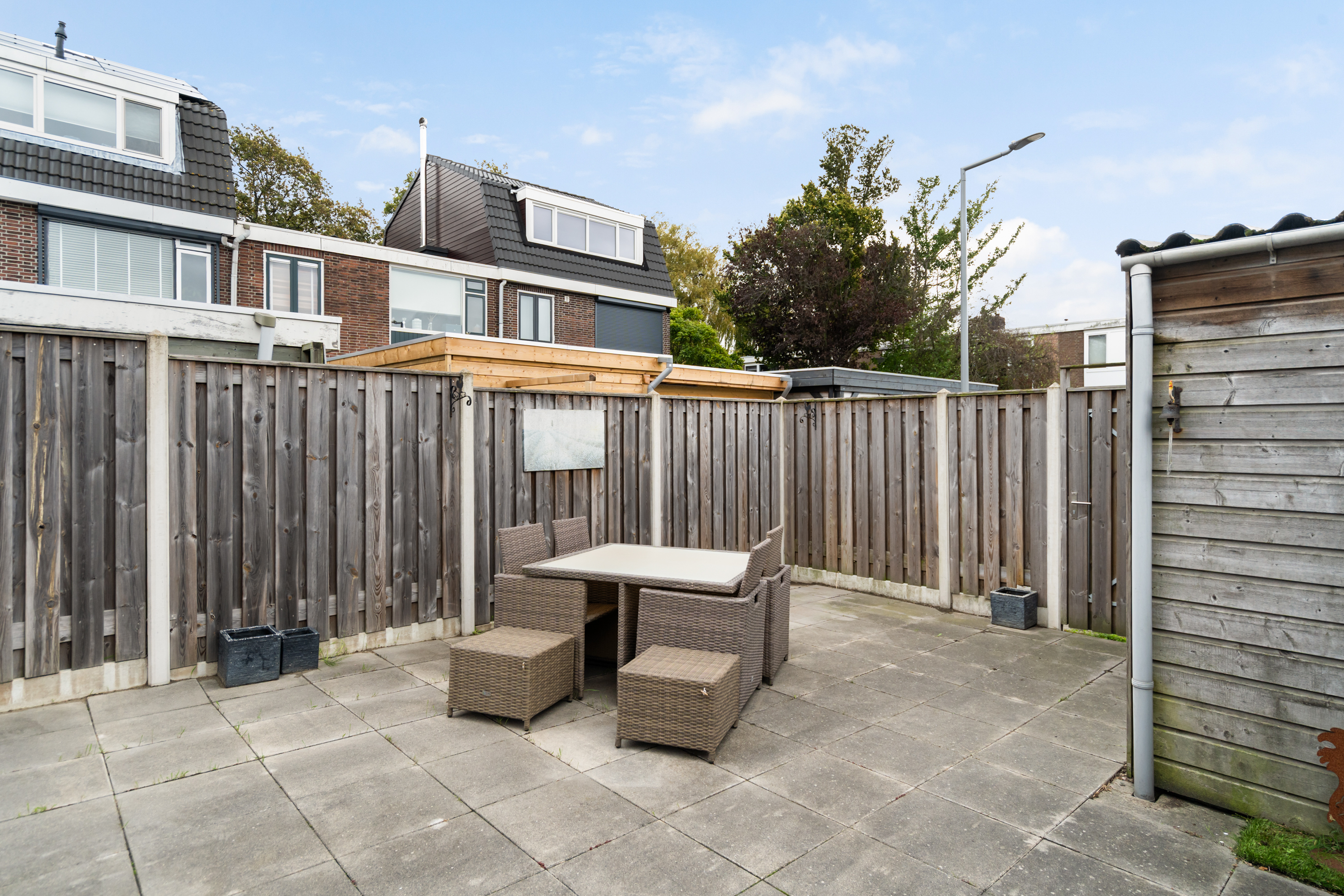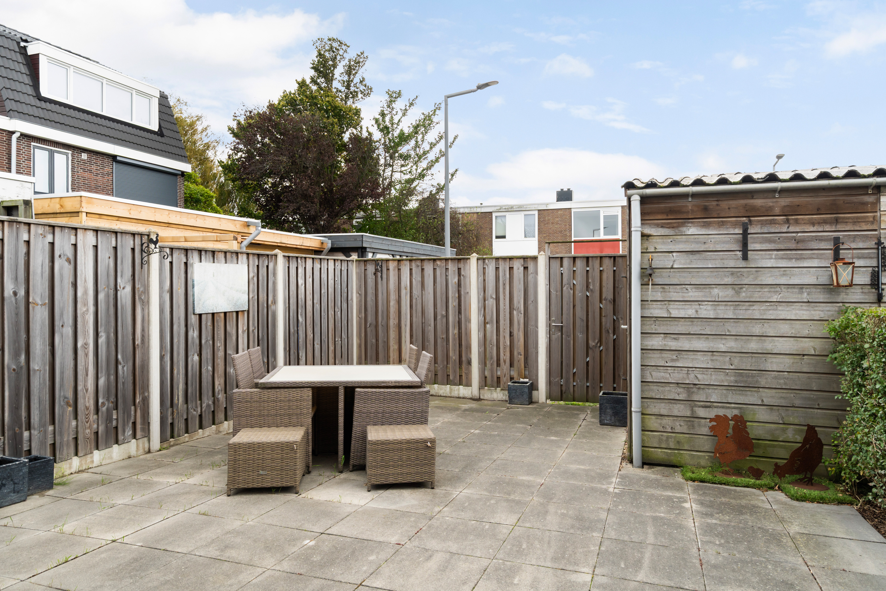 De achtertuin is gelegen op het zuiden, is geheel voorzien van bestrating en is grotendeels voorzien van degelijke schutting. Een houten berging voorzien van elektra en een achteruitgang. De voor- en zijtuin zijn voorzien van betegeling.