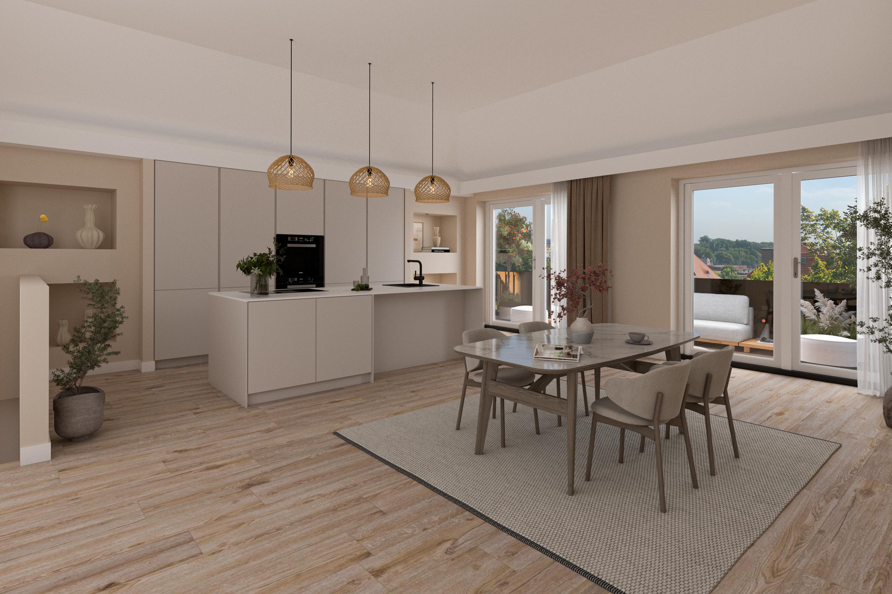 De keuken wordt voorzien van een kook-/spoeleiland met complete apparatuur van het merk “Siemens”, o.a. een vaatwasser, koel-/vriescombinatie, oven-magnetron en inductiekookplaat met geïntegreerde afzuiging. Aan de zijkant van de keuken is een speelse kovenwand gemaakt.