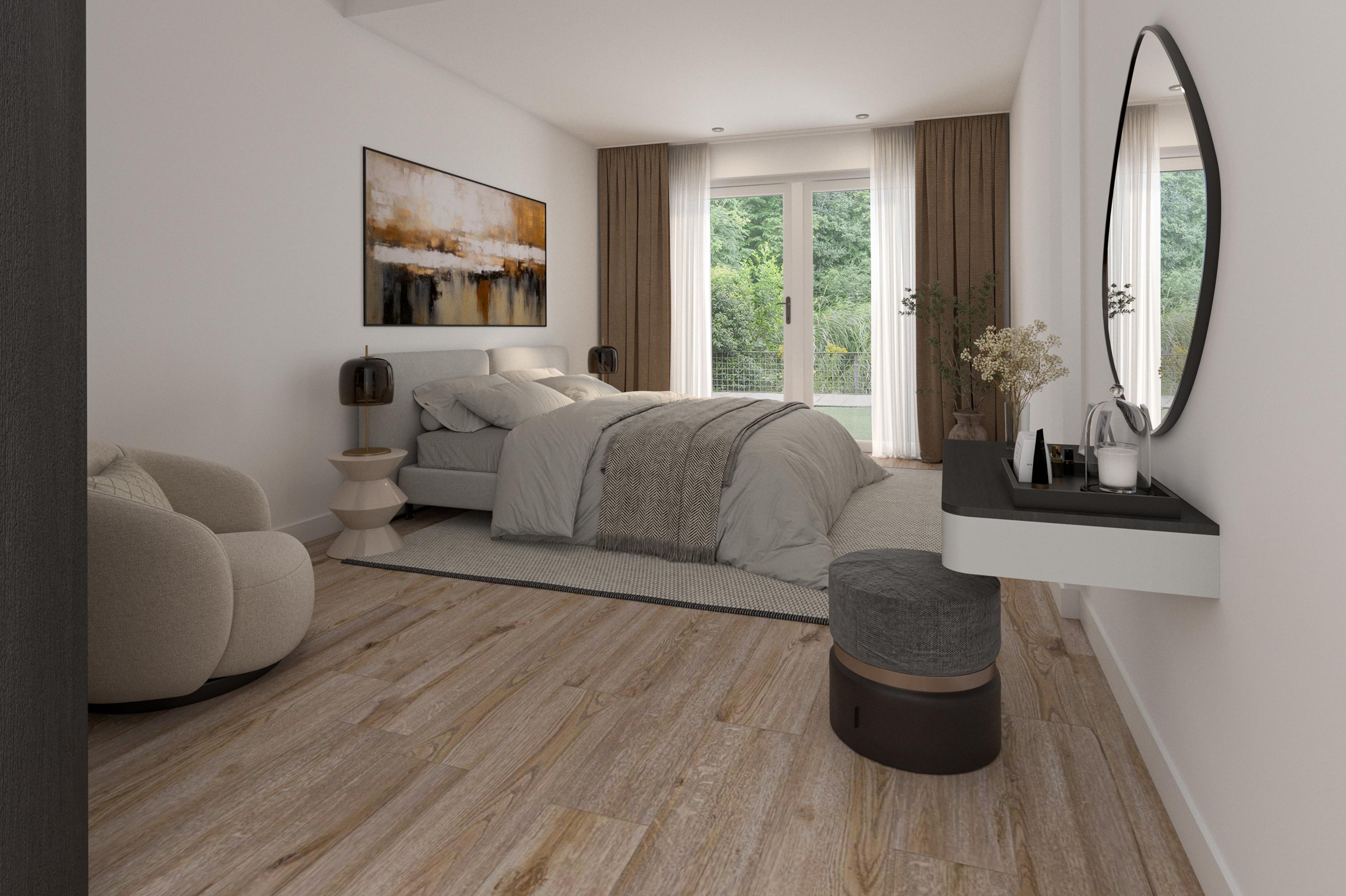 De inpandige badkamer is voorzien van een inloopdouche met scherm en regendouche, ligbad, spiegel met geïntegreerde verlichting, wastafelmeubel en design radiator.