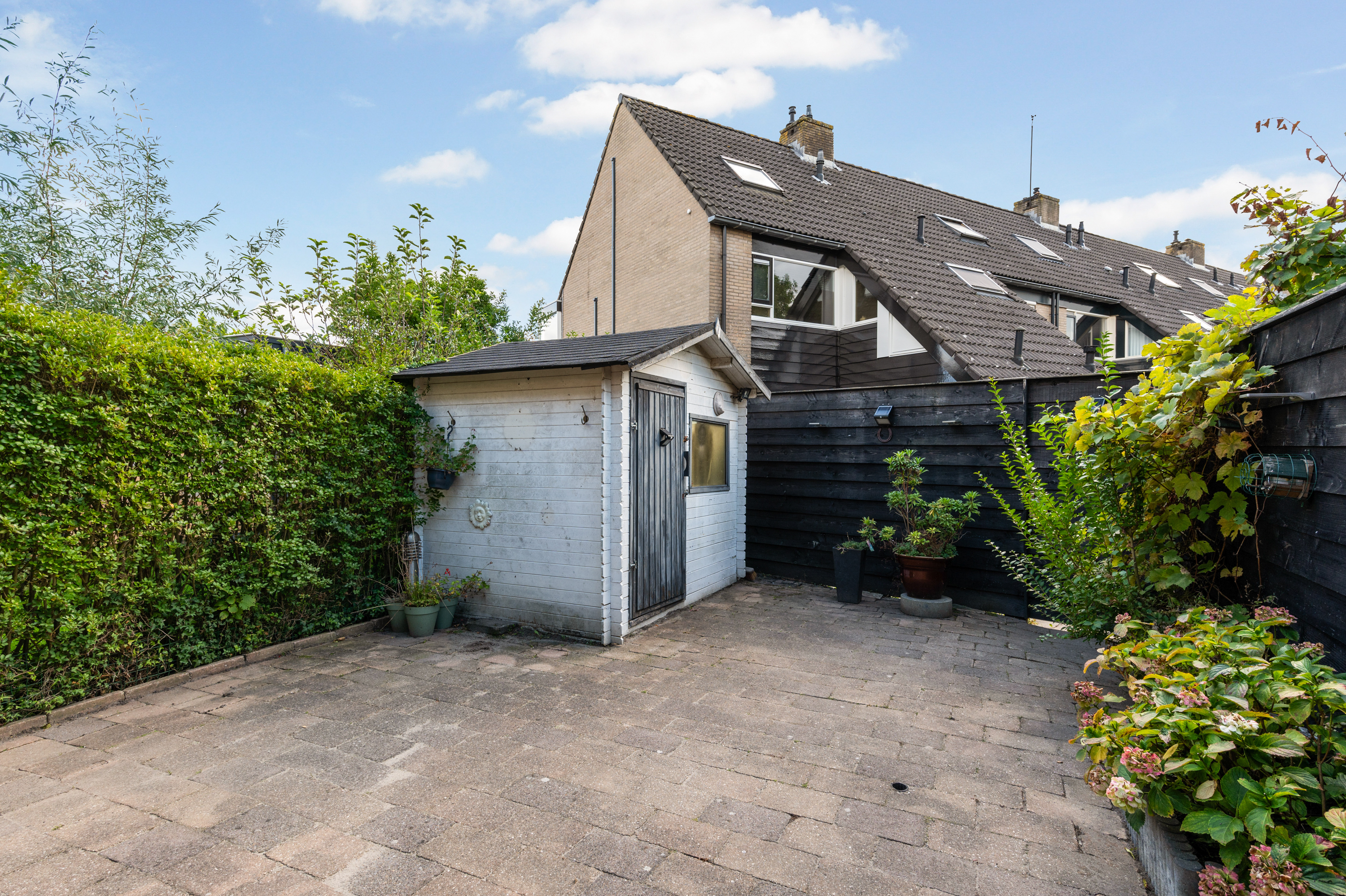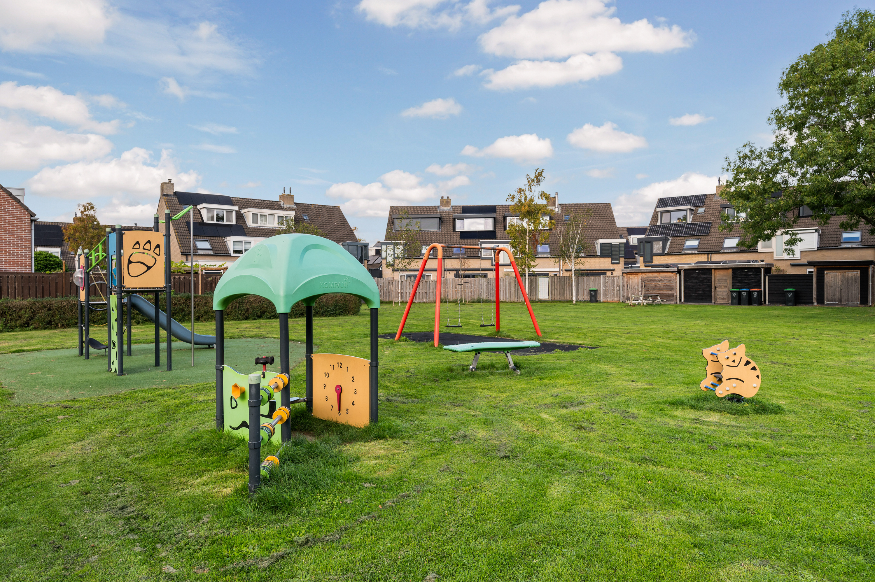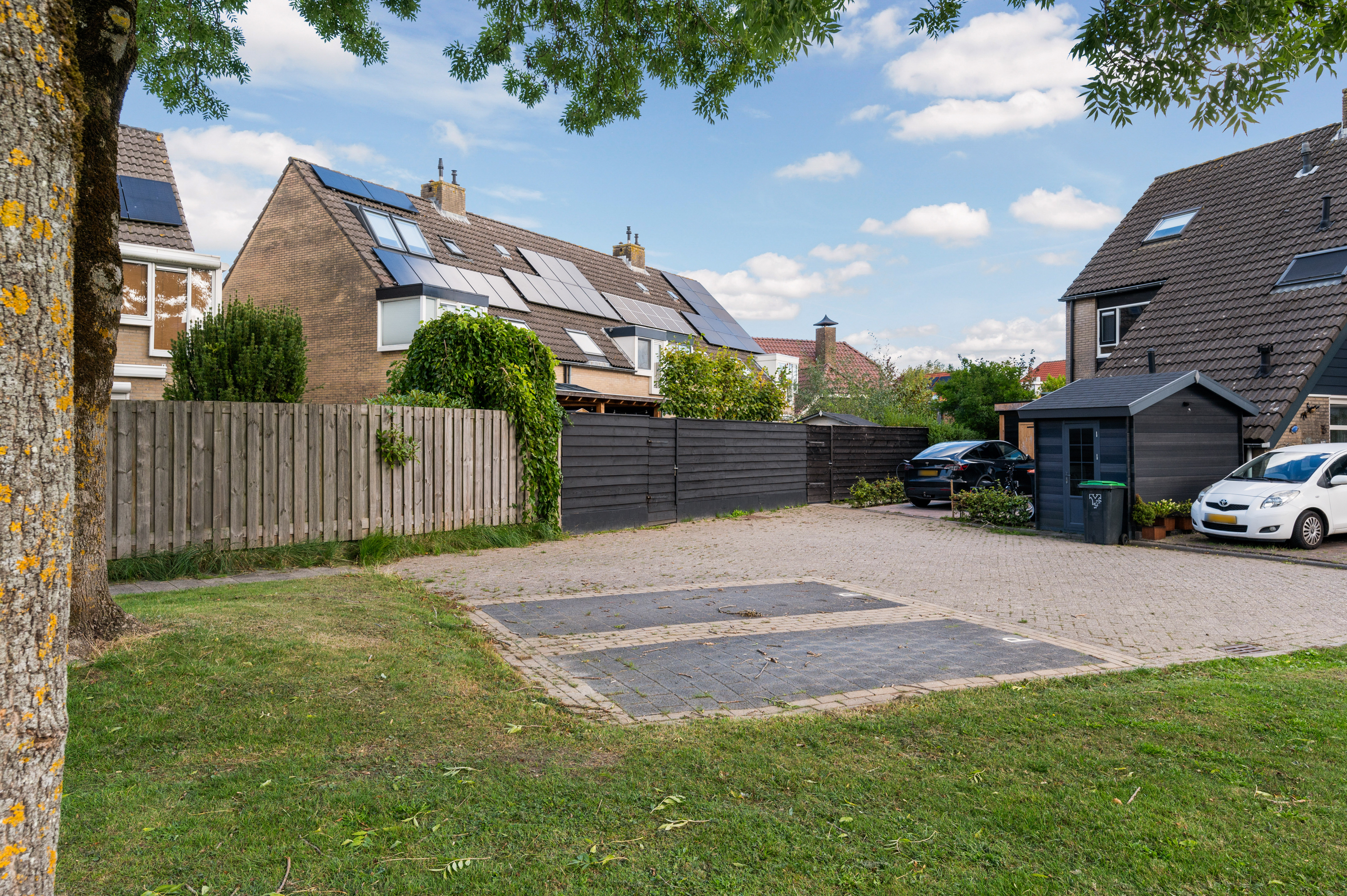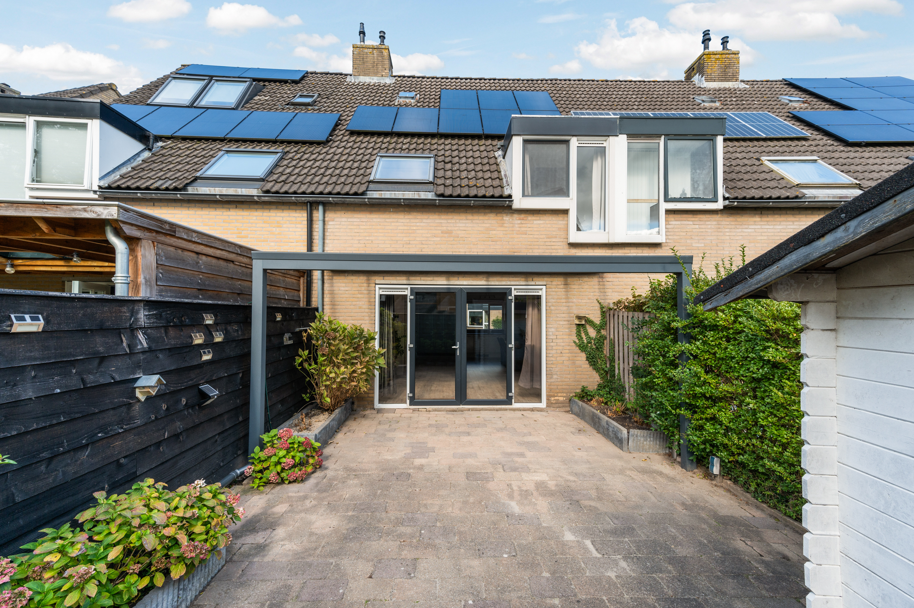 Geheel betegelde voortuin met parkeren eigen erf en toegang tot de stenen berging welke is voorzien van bergzolder, hier hangt tevens de omvormer van de zonnepanelen. De grotendeels betegelde achtertuin is gelegen op het zuiden en voorzien van een in 2023 geplaatste overkapping met zonwering en verlichting, een extra houten blokhut en een achteruitgang naar een gezellig speelveld.