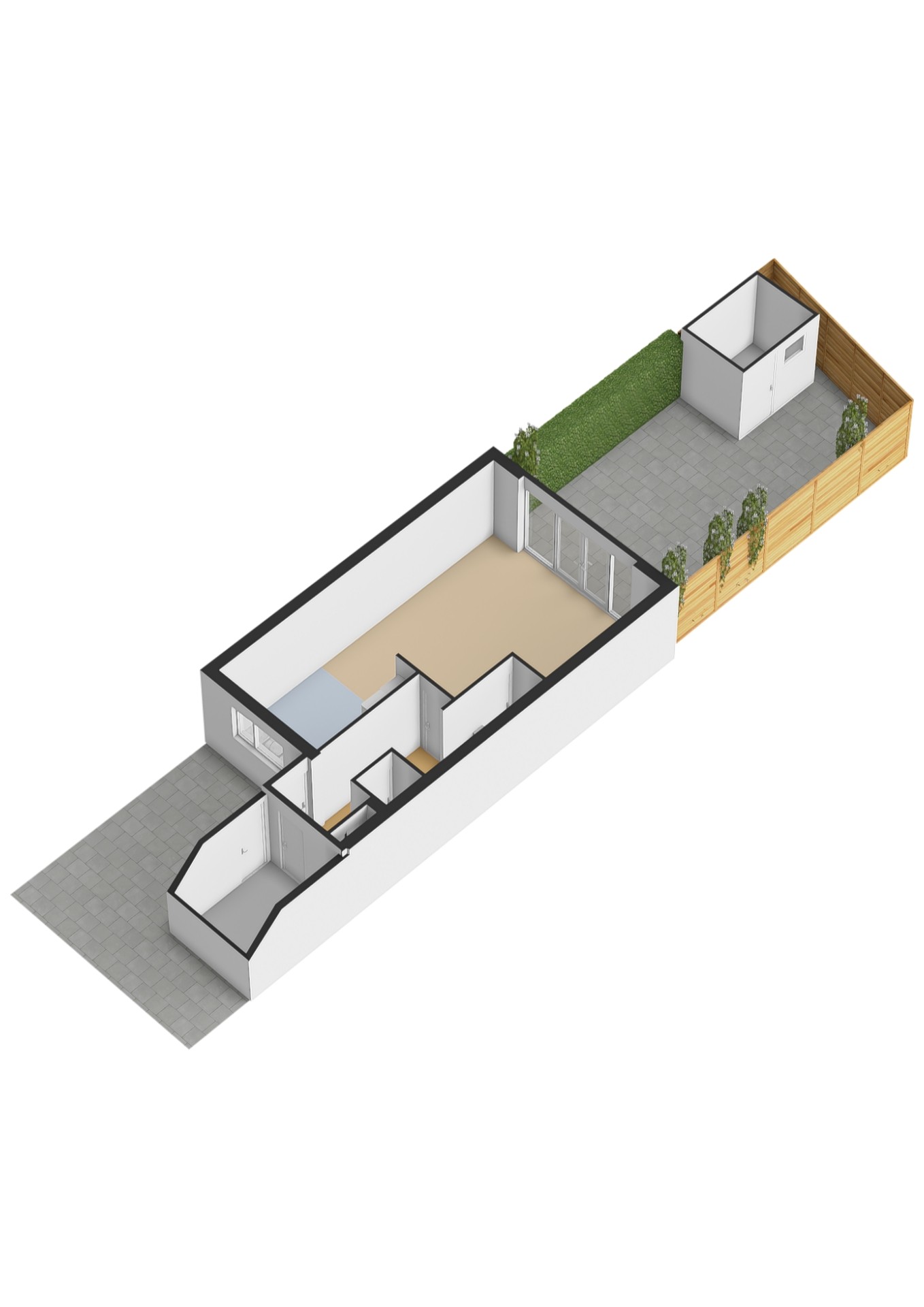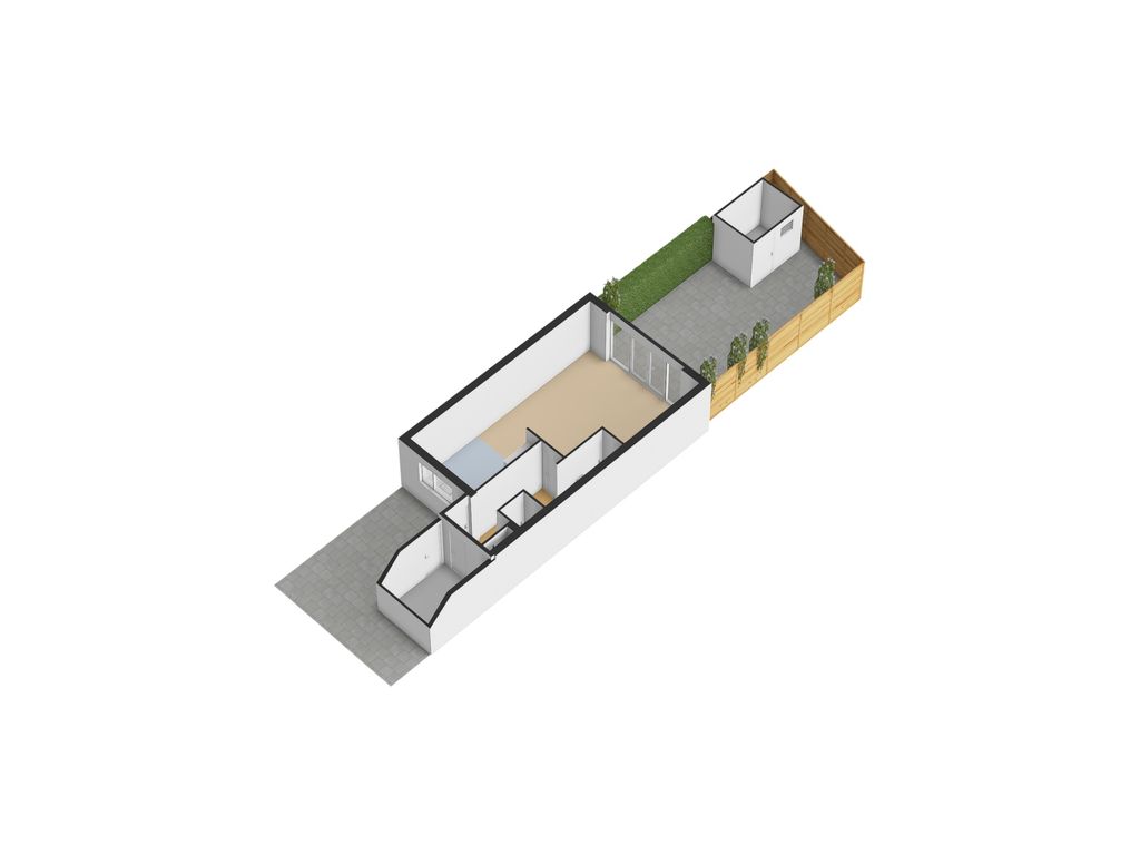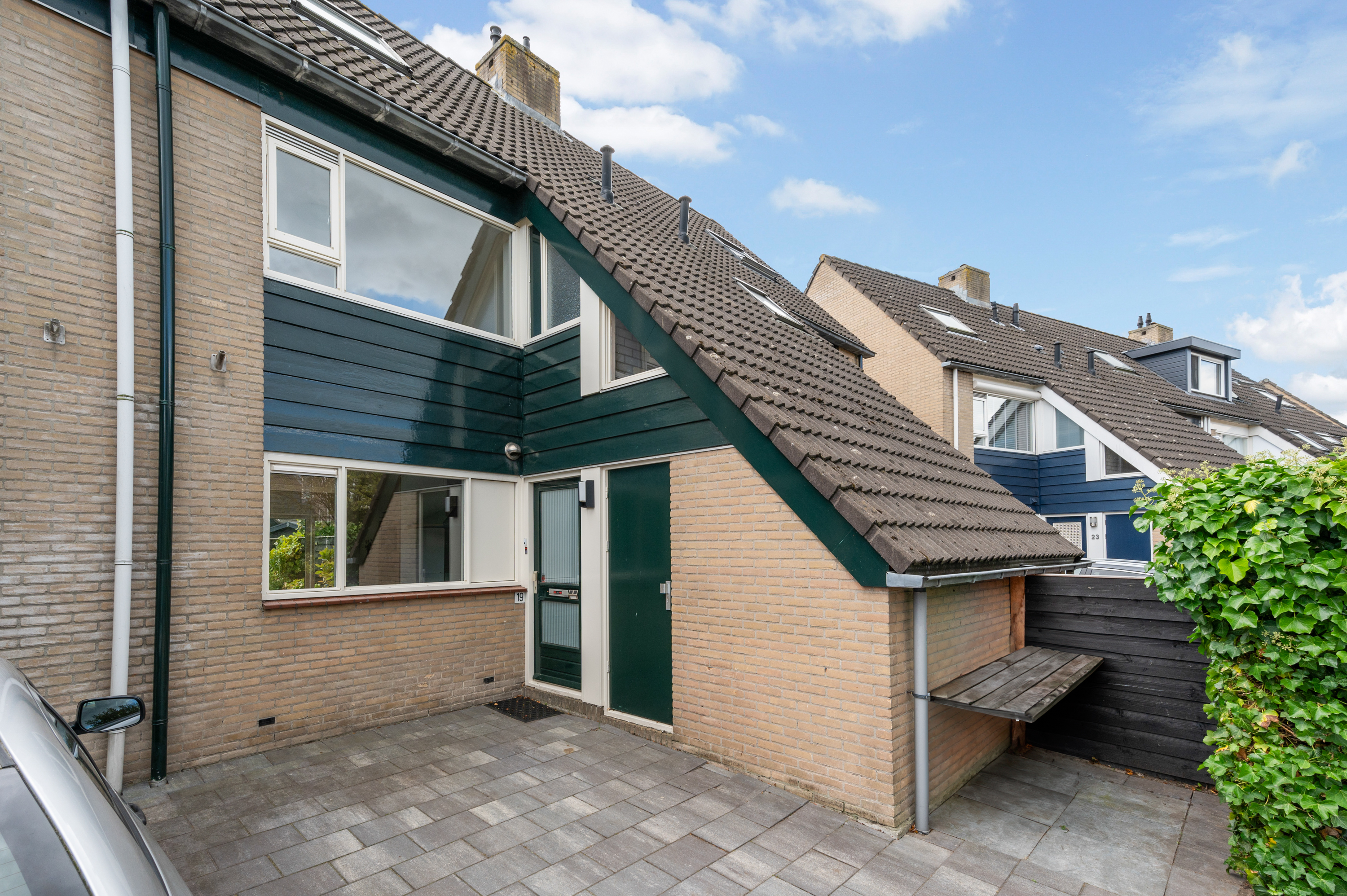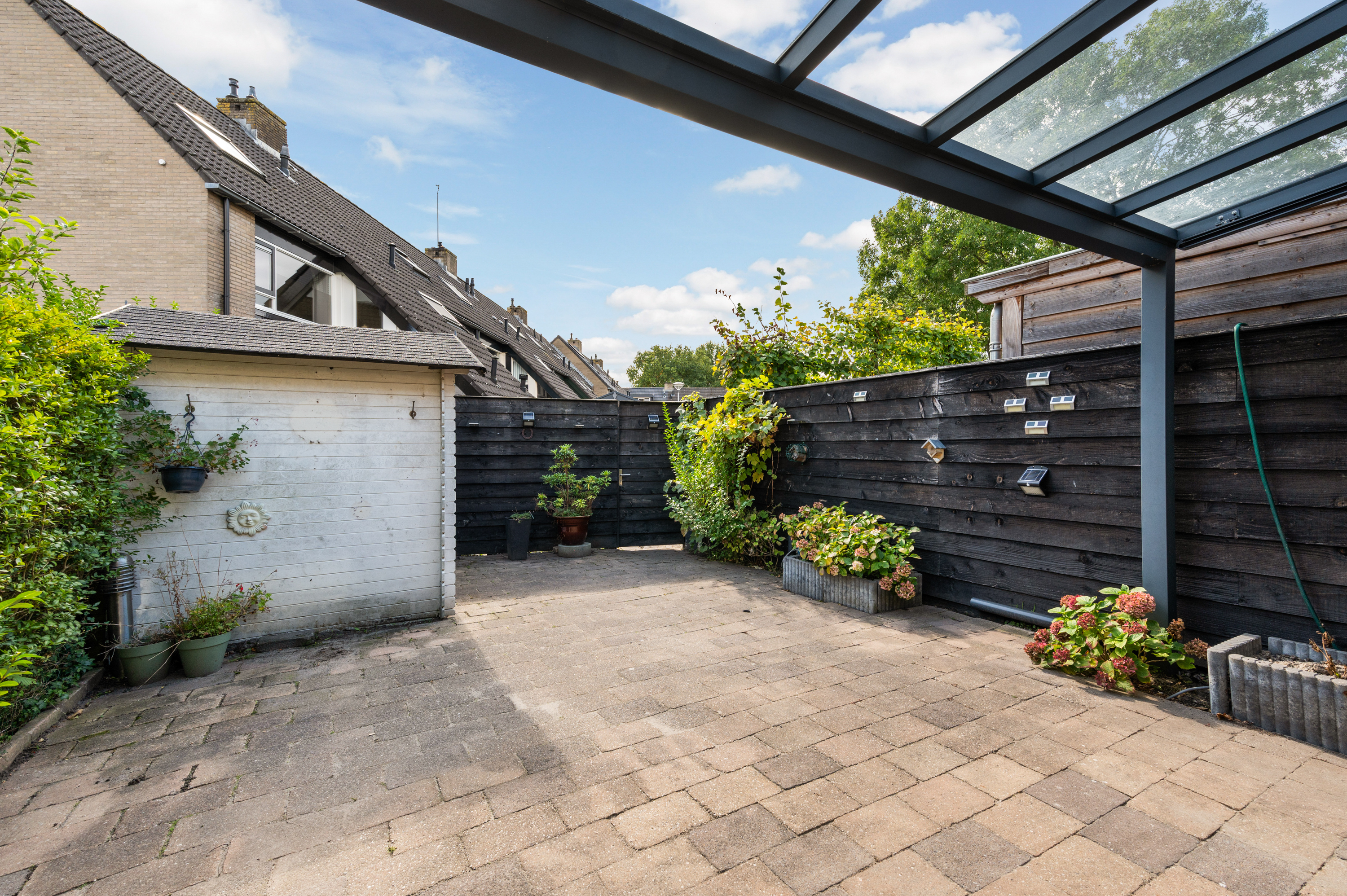 Geheel betegelde voortuin met parkeren eigen erf en toegang tot de stenen berging welke is voorzien van bergzolder, hier hangt tevens de omvormer van de zonnepanelen. De grotendeels betegelde achtertuin is gelegen op het zuiden en voorzien van een in 2023 geplaatste overkapping met zonwering en verlichting, een extra houten blokhut en een achteruitgang naar een gezellig speelveld.