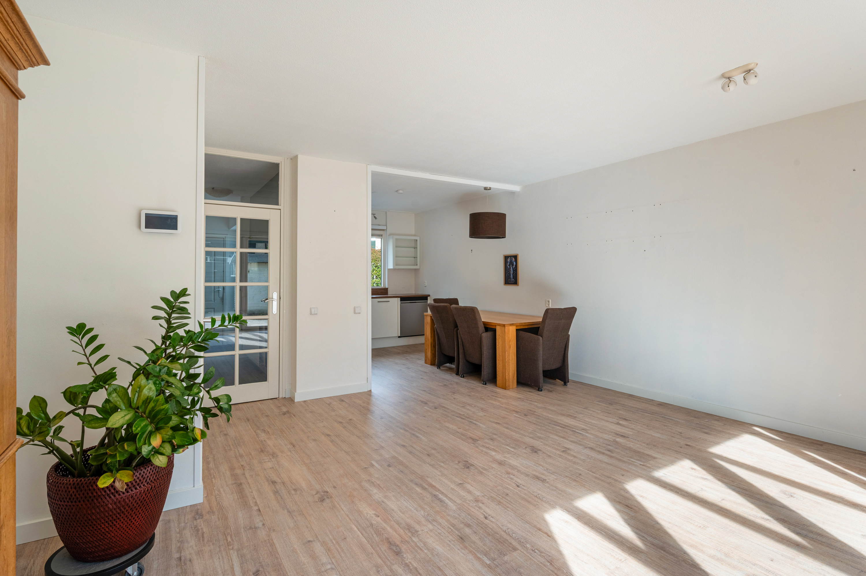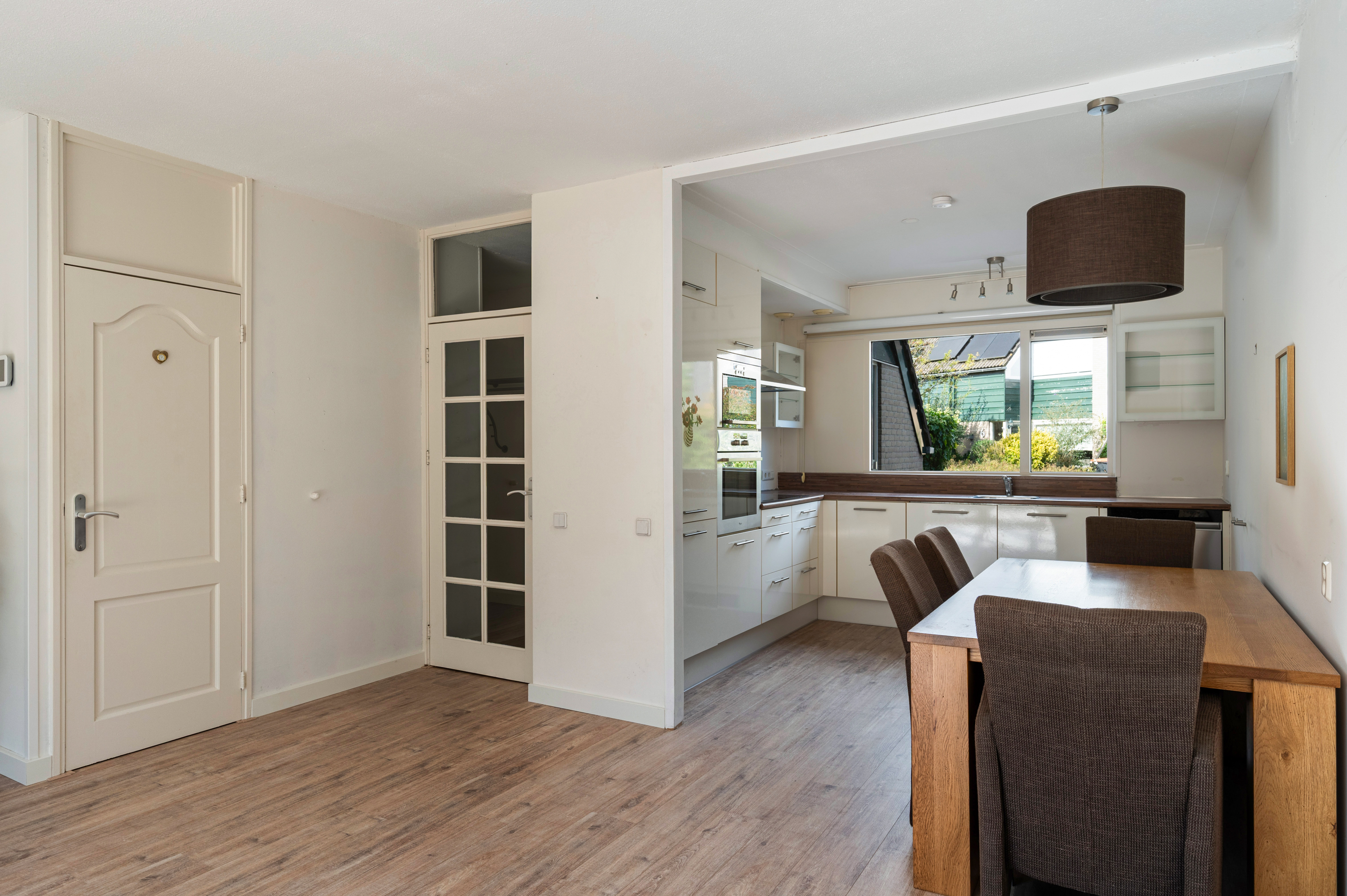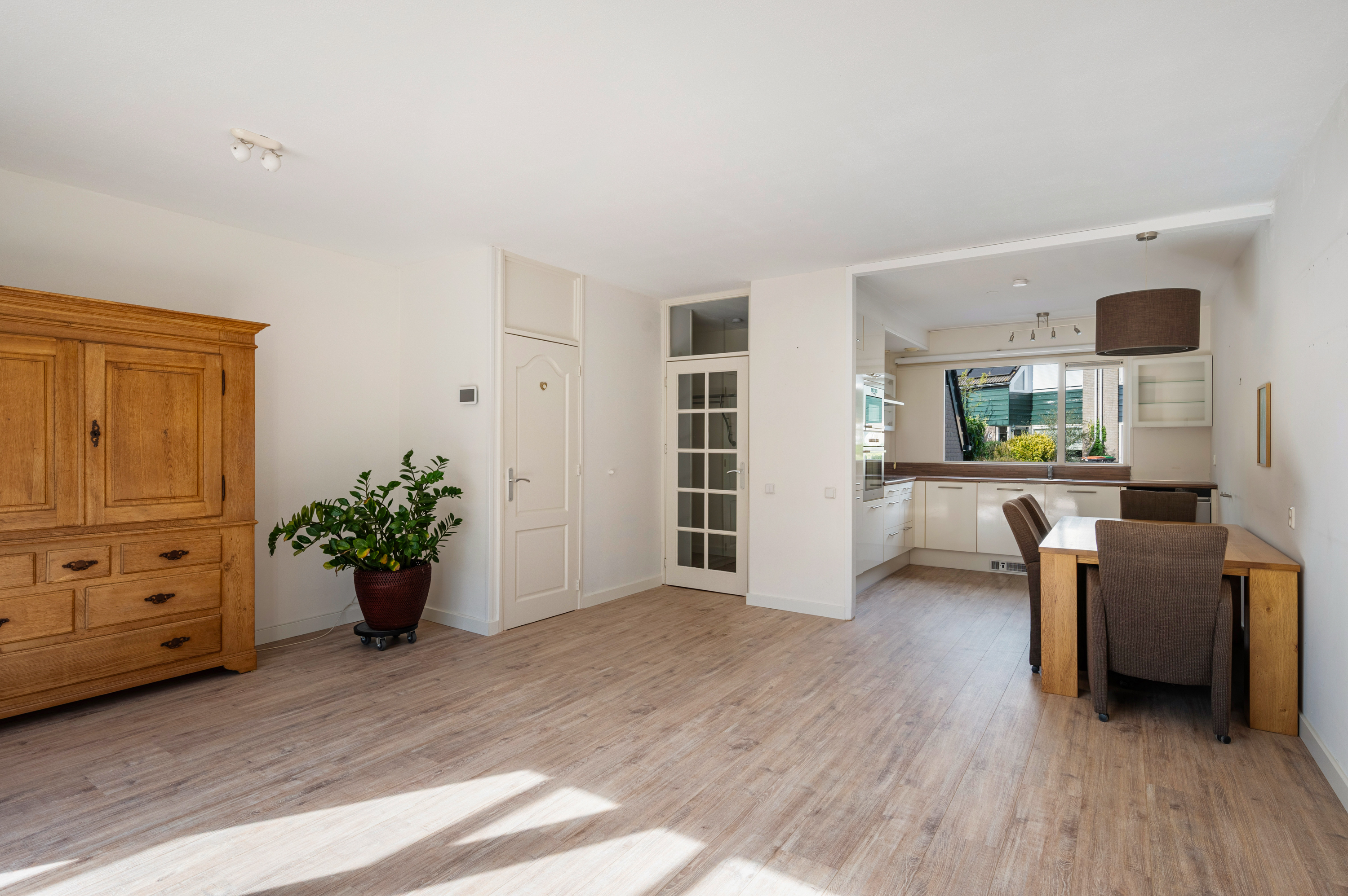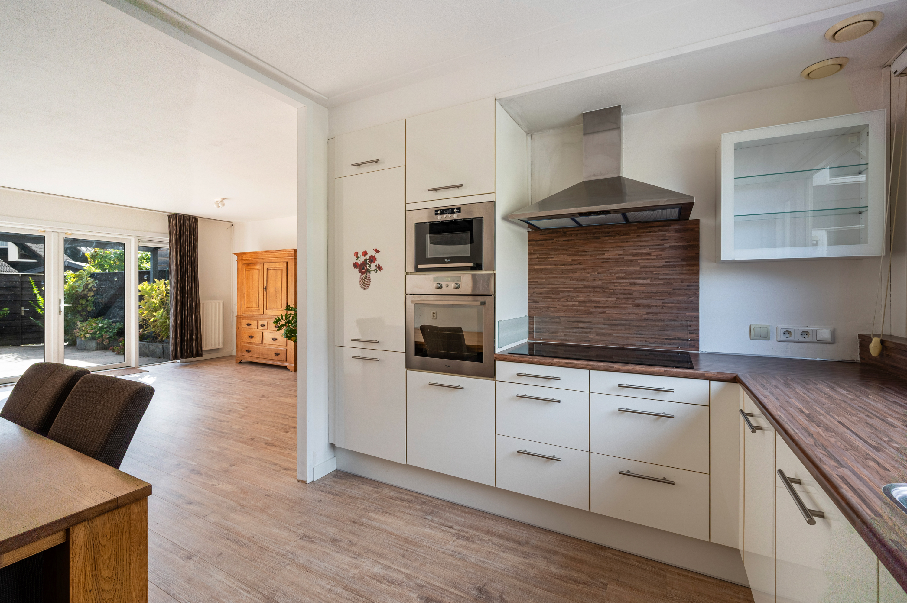 Entree hal welke toegang geeft tot de meterkast, de garderoberuimte, de inpandige berging, het toilet met handwasbakje en de trapopgang naar de eerste verdieping. Via een glasdeur toegang tot de woonkamer. De gezellige, tuingerichte woonkamer is netjes afgewerkt en is voorzien van een trap-/bergkast, stucwerkwanden en geeft toegang tot de zonnige achtertuin via openslaande tuindeuren. Aansluitend een in 2023 geplaatste aluminium overkapping voorzien van zonwering en verlichting. De keuken is gelegen aan de voorzijde van de woning en is voorzien van een kunststof keukenblok in hoekopstelling met o.a. een koel-/vriescombinatie, combimagnetron, inductiekookplaat, afzuigkap en een in 2025 geplaatste vaatwasmachine. Verder nog een kickspace (verwarming), een close-in-boiler, lades en kastruimte. De gehele begane grond is voorzien van een nieuwe, in 2025 gelegde laminaatvloer.