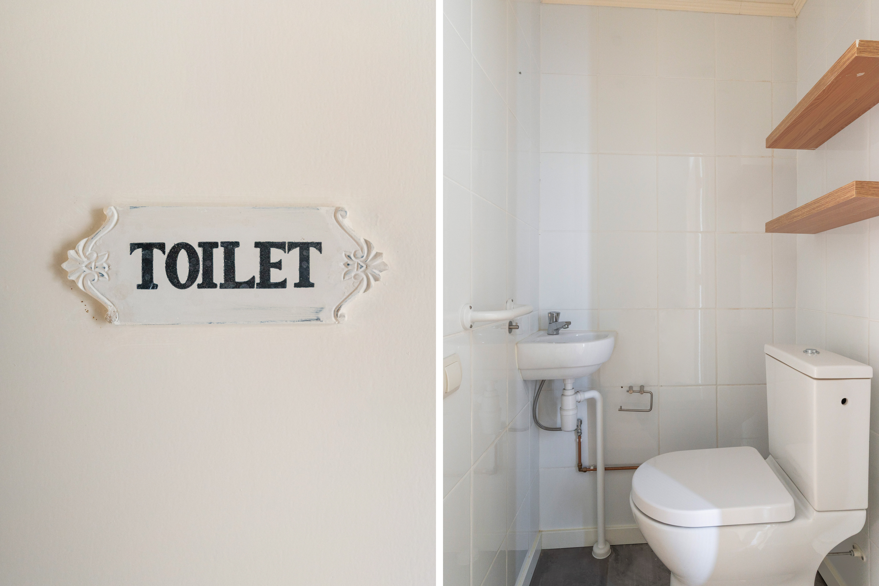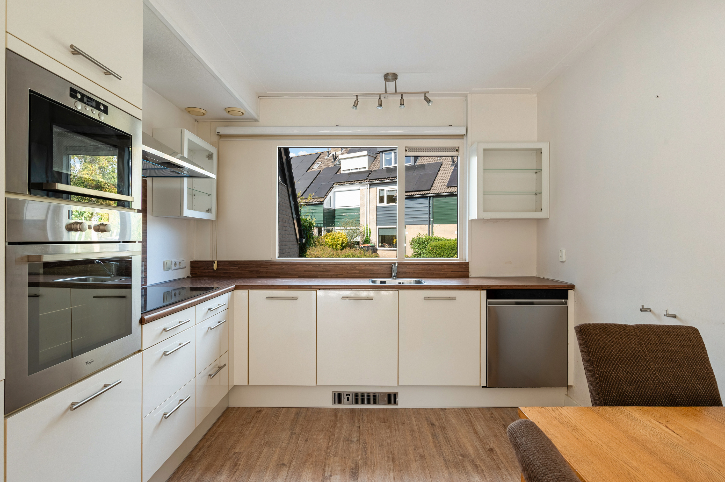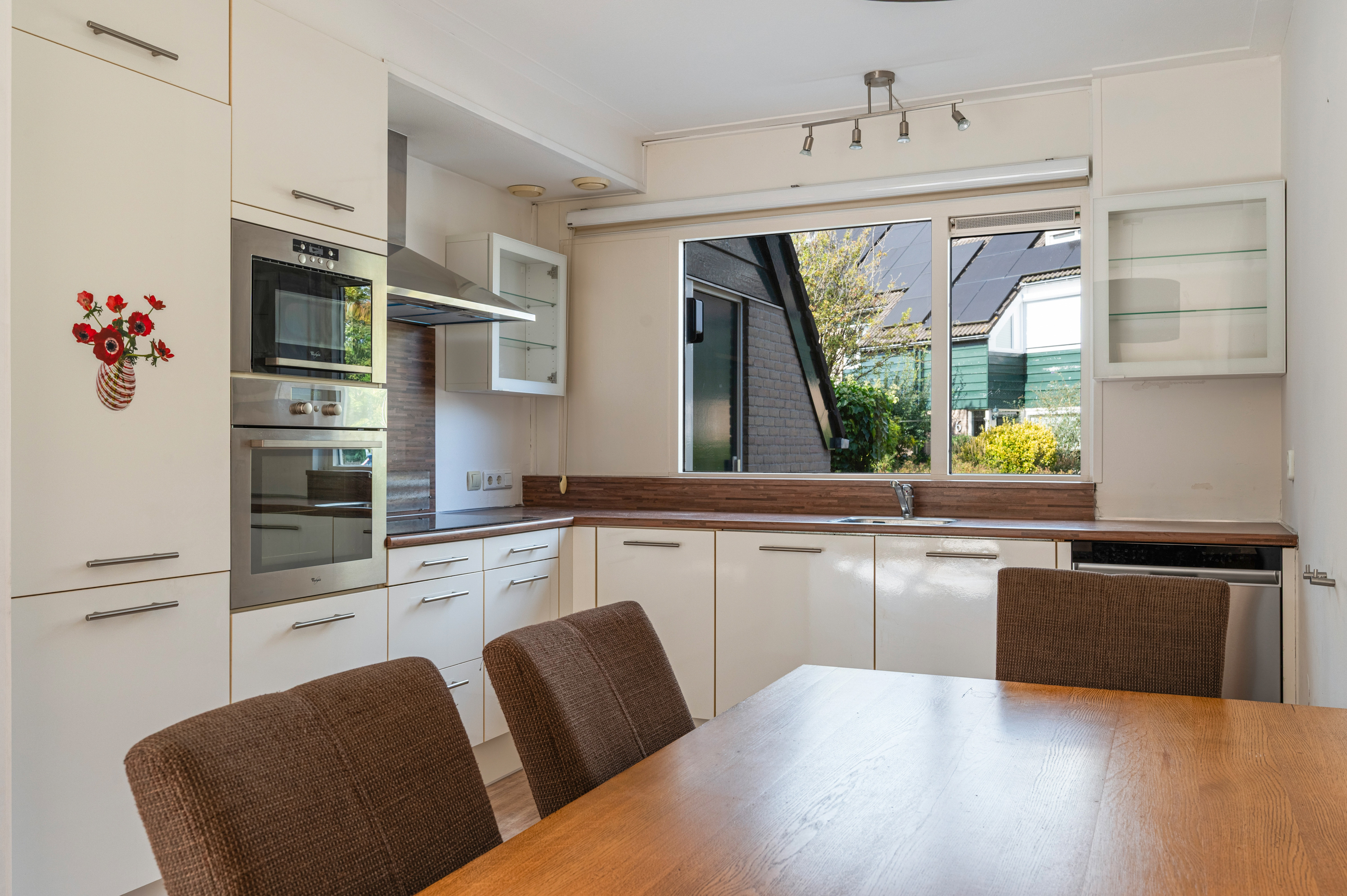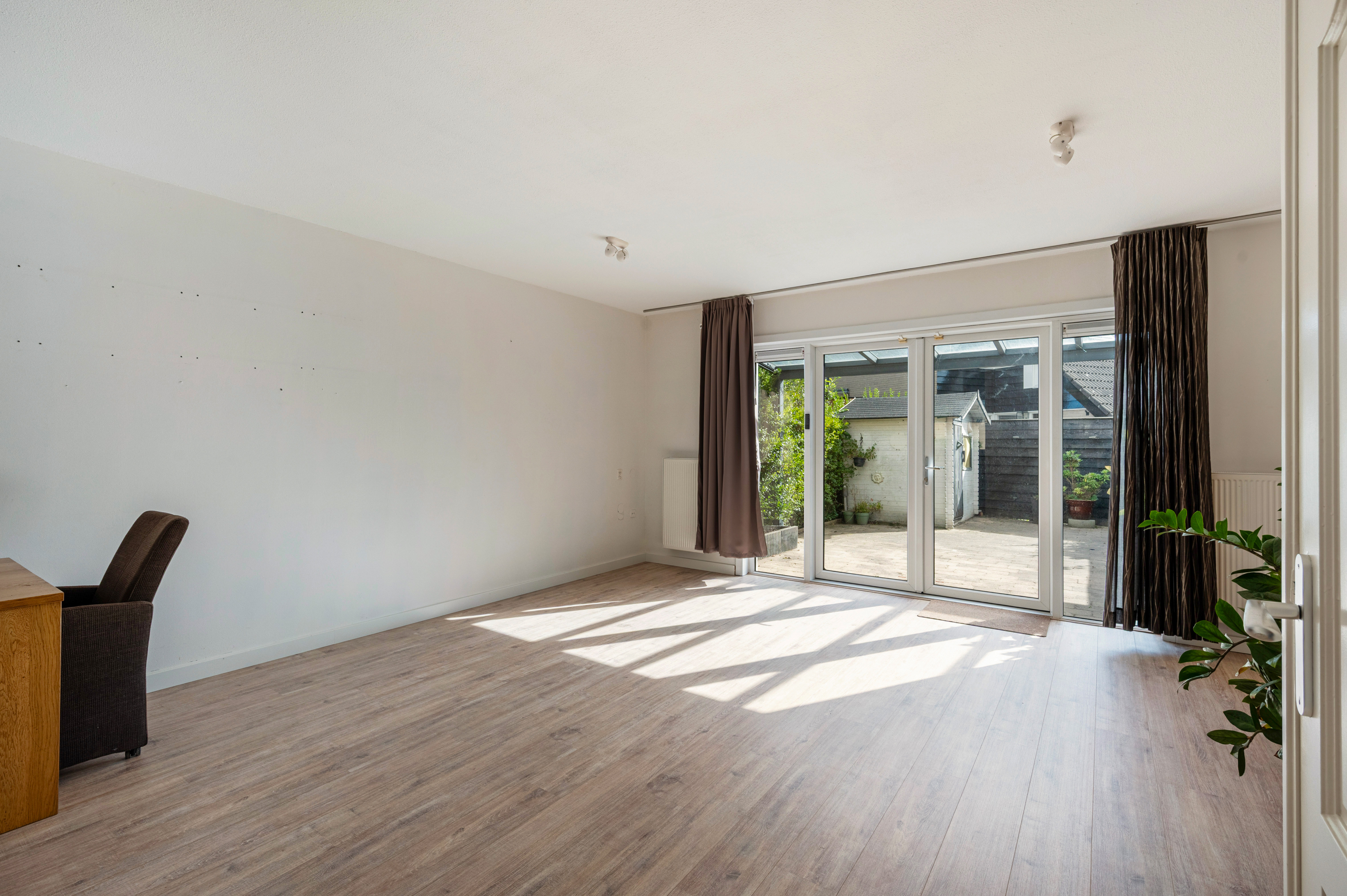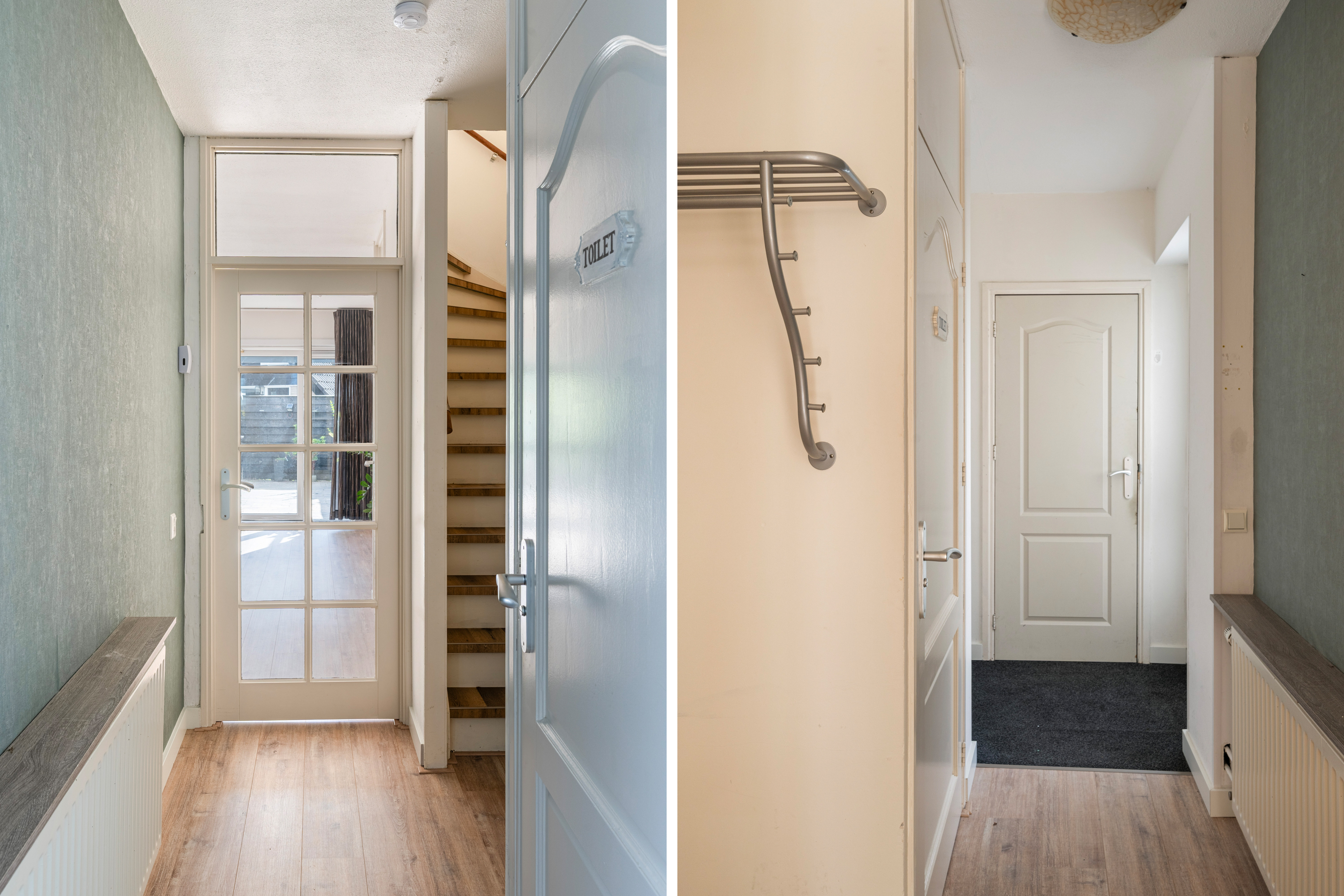 Entree hal welke toegang geeft tot de meterkast, de garderoberuimte, de inpandige berging, het toilet met handwasbakje en de trapopgang naar de eerste verdieping. Via een glasdeur toegang tot de woonkamer. De gezellige, tuingerichte woonkamer is netjes afgewerkt en is voorzien van een trap-/bergkast, stucwerkwanden en geeft toegang tot de zonnige achtertuin via openslaande tuindeuren. Aansluitend een in 2023 geplaatste aluminium overkapping voorzien van zonwering en verlichting. De keuken is gelegen aan de voorzijde van de woning en is voorzien van een kunststof keukenblok in hoekopstelling met o.a. een koel-/vriescombinatie, combimagnetron, inductiekookplaat, afzuigkap en een in 2025 geplaatste vaatwasmachine. Verder nog een kickspace (verwarming), een close-in-boiler, lades en kastruimte. De gehele begane grond is voorzien van een nieuwe, in 2025 gelegde laminaatvloer.