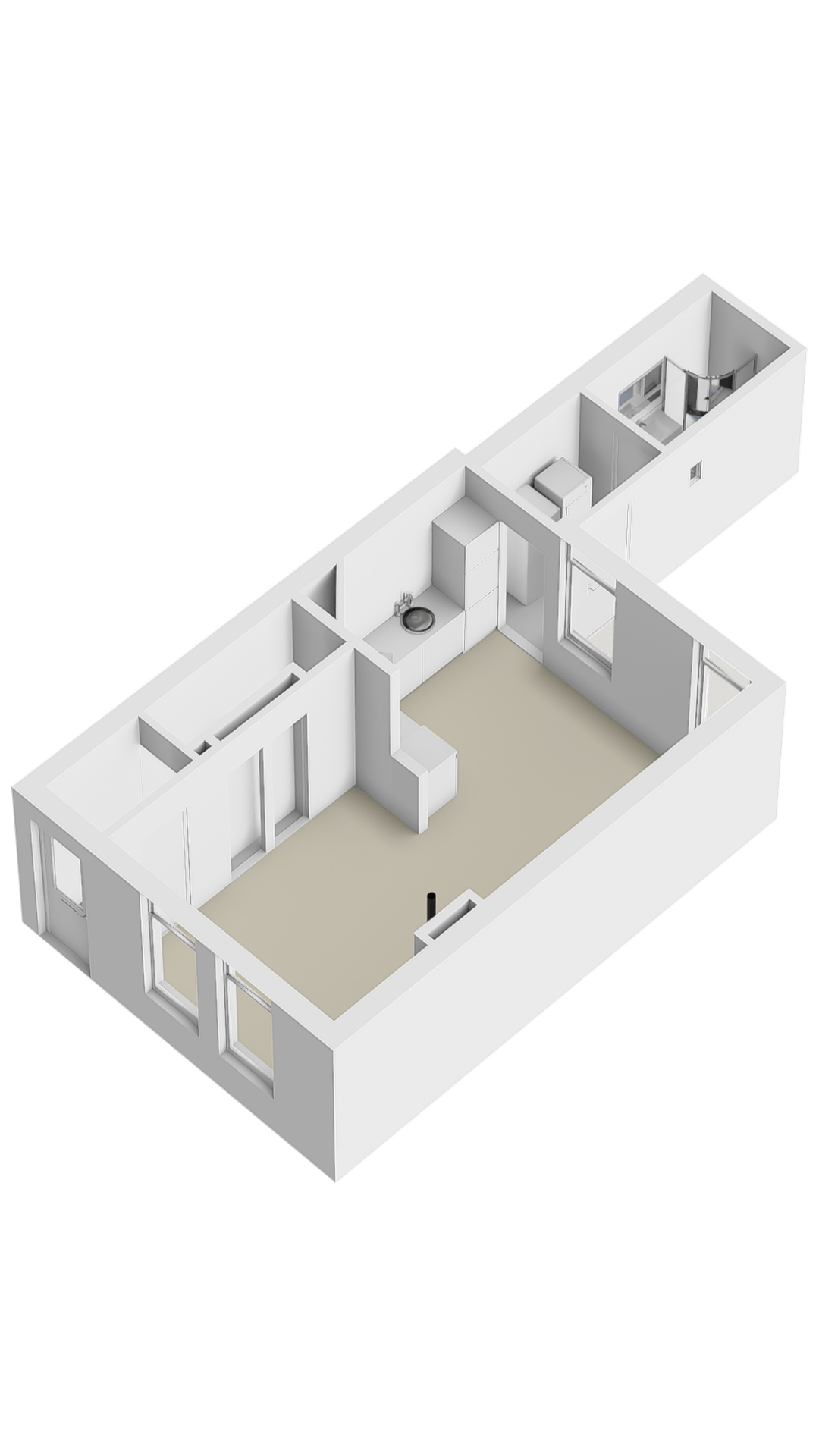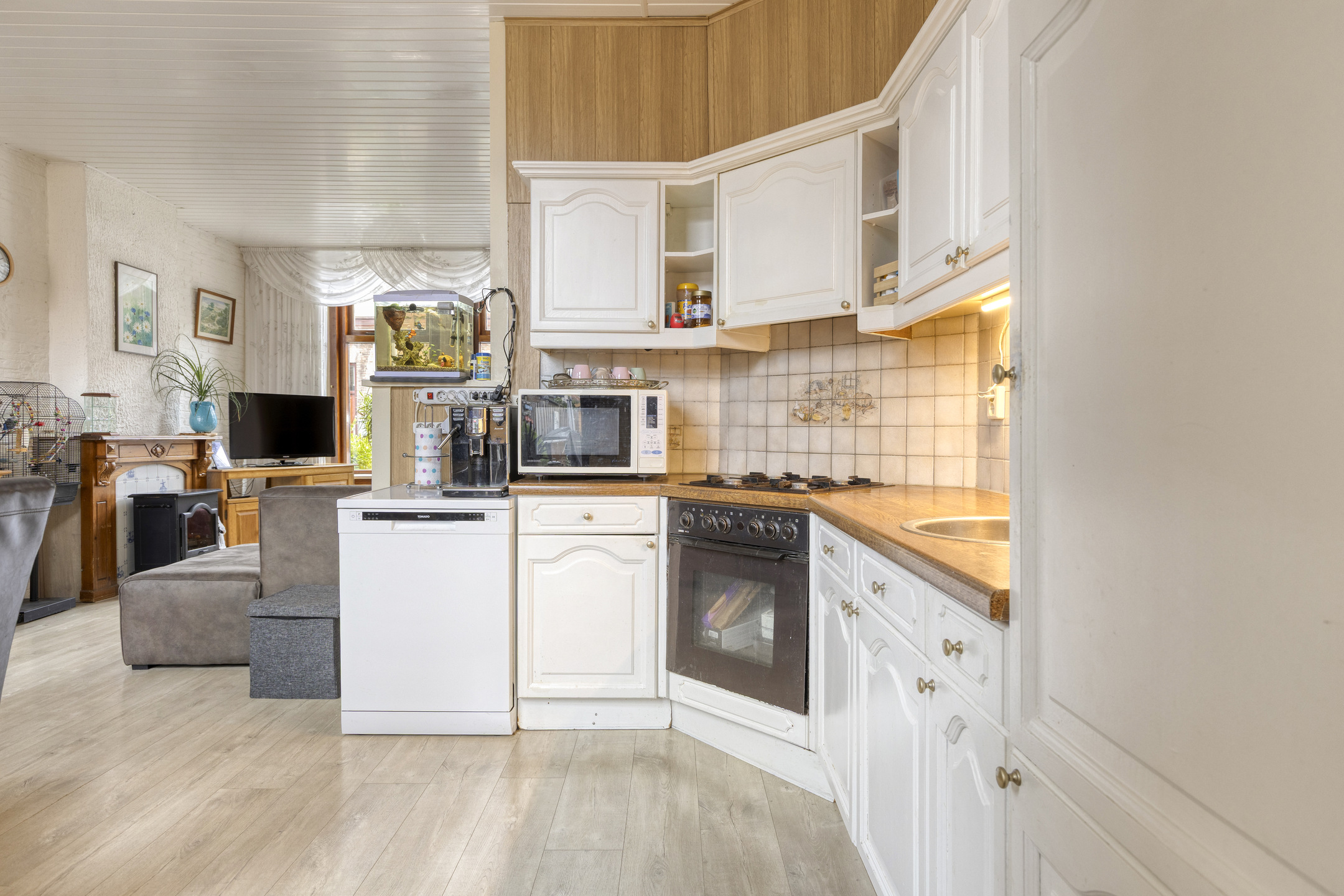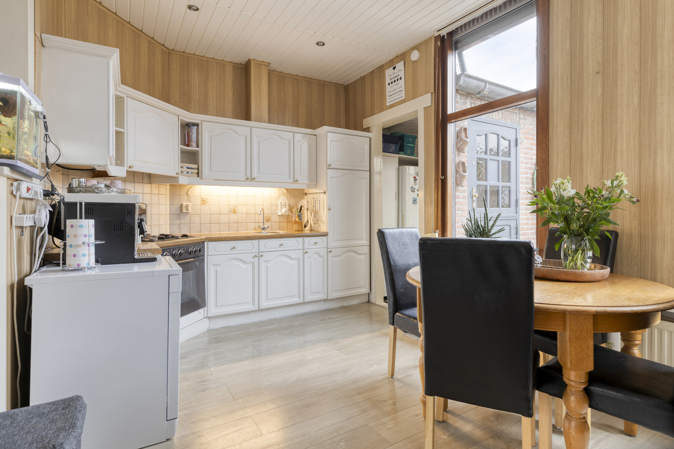 Entree portaal welke is voorzien van een trapopgang naar de 1e verdieping en meterkast (installatie van 2021). Toegang naar de royale gezellige woonkamer inclusief keuken van circa 36 m² welke is voorzien van een laminaatvloer, pvc plafond, sfeervolle sierschouw en 2 inbouwkasten. Aansluitend de keuken welke is voorzien van een eenvoudig keukenblok in hoekopstelling met diverse apparatuur, tussenhal met daarin de wasmachine-/drogeropstelling en een deur naar de achtertuin. Aansluitend de inpandige, geheel betegelde badkamer welke is voorzien van een douchecabine, wastafelmeubel, design radiator en een toilet.