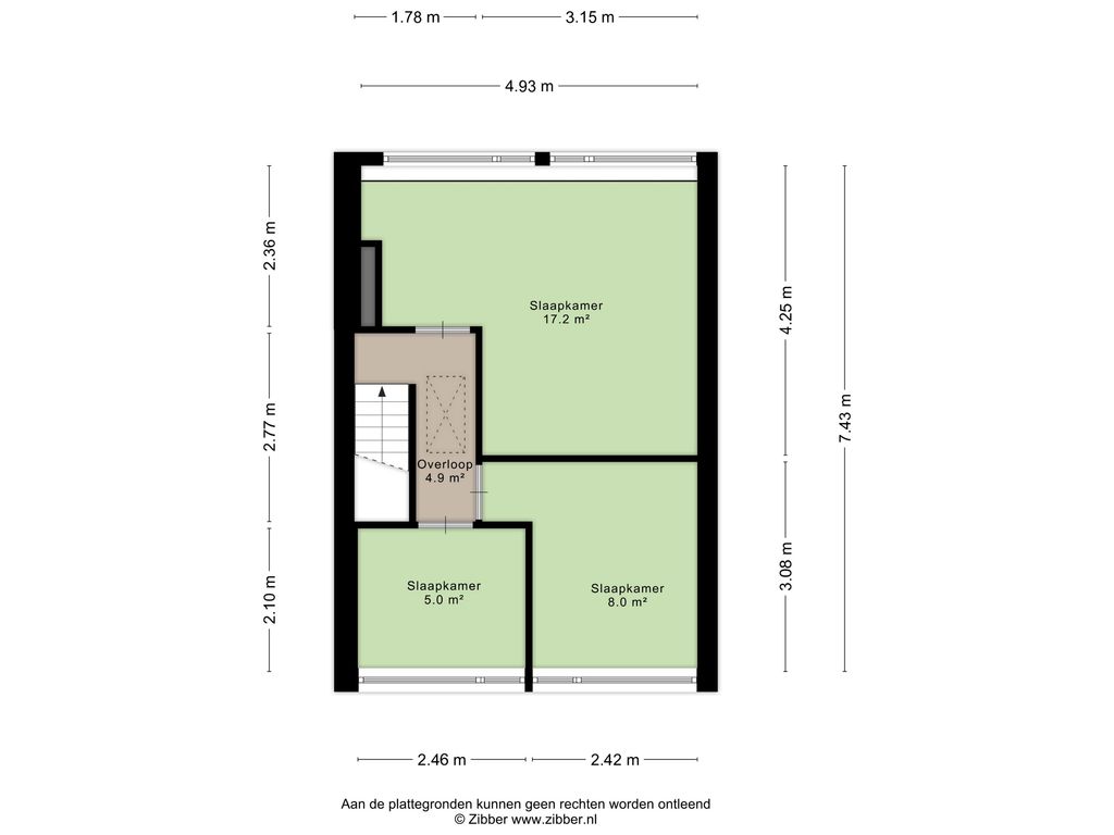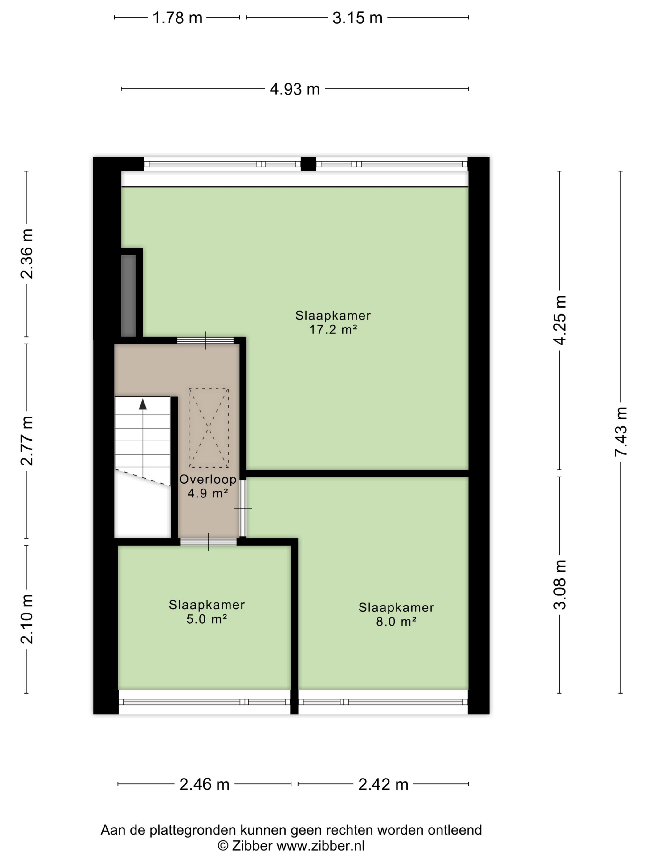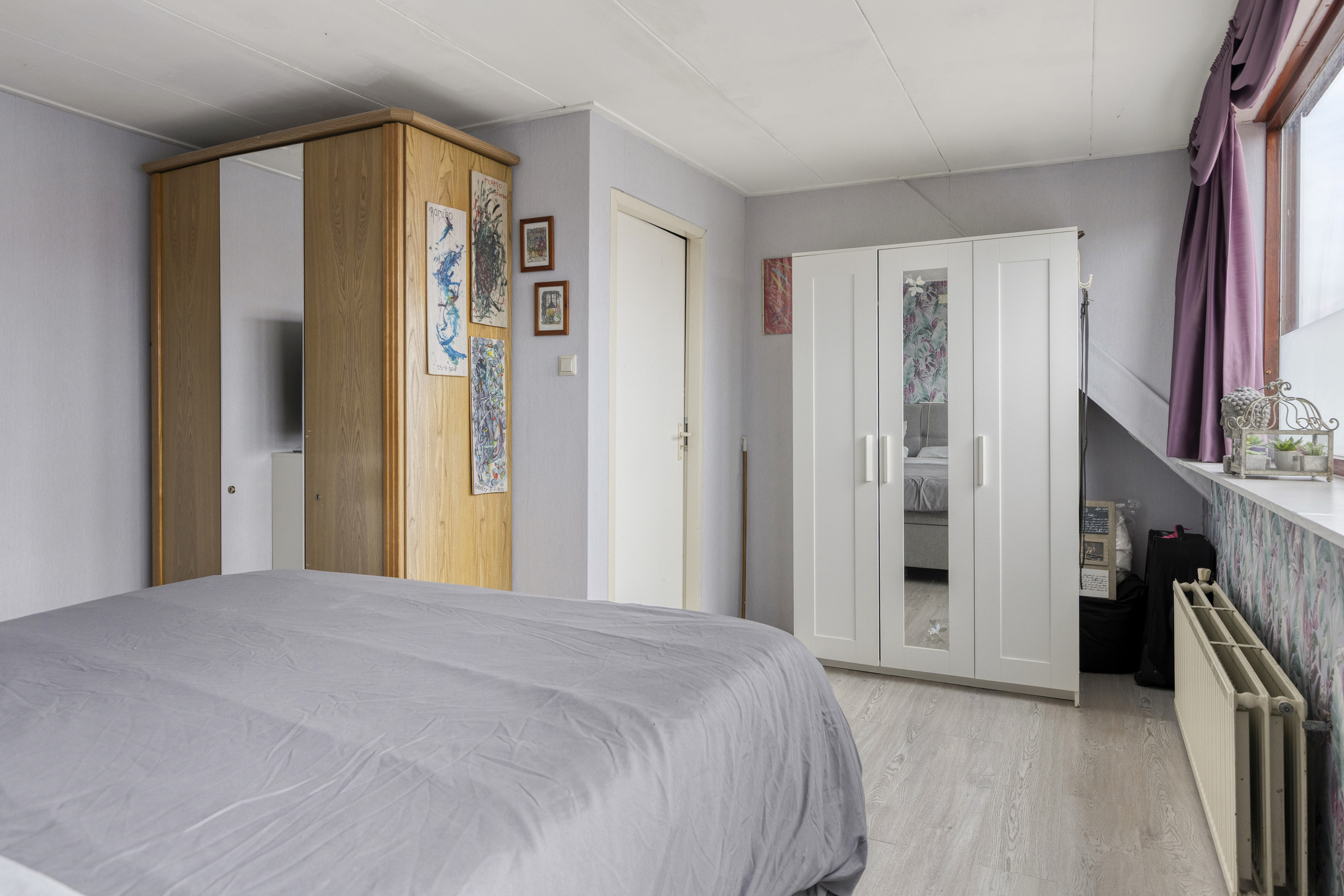 Overloop, waarop toegang naar de bergzolder, 1e grote slaapkamer (17 m²) gelegen aan de achterzijde van de woning en voorzien van een dakkapel. 2e en 3e slaapkamer (8 en 5 m²) gelegen aan de voorzijde en voorzien van een dakkapel. De slaapkamers zijn voorzien van een laminaatvloer.