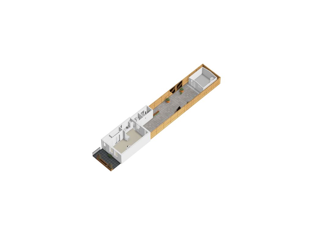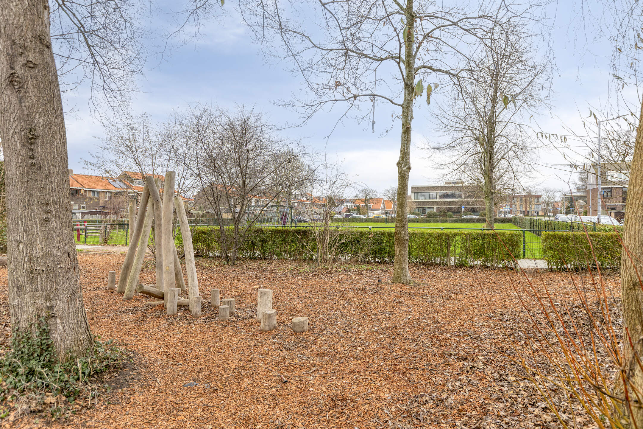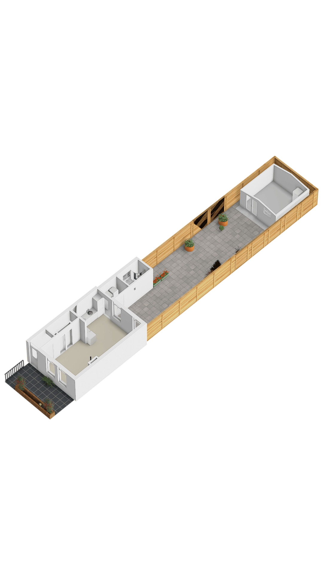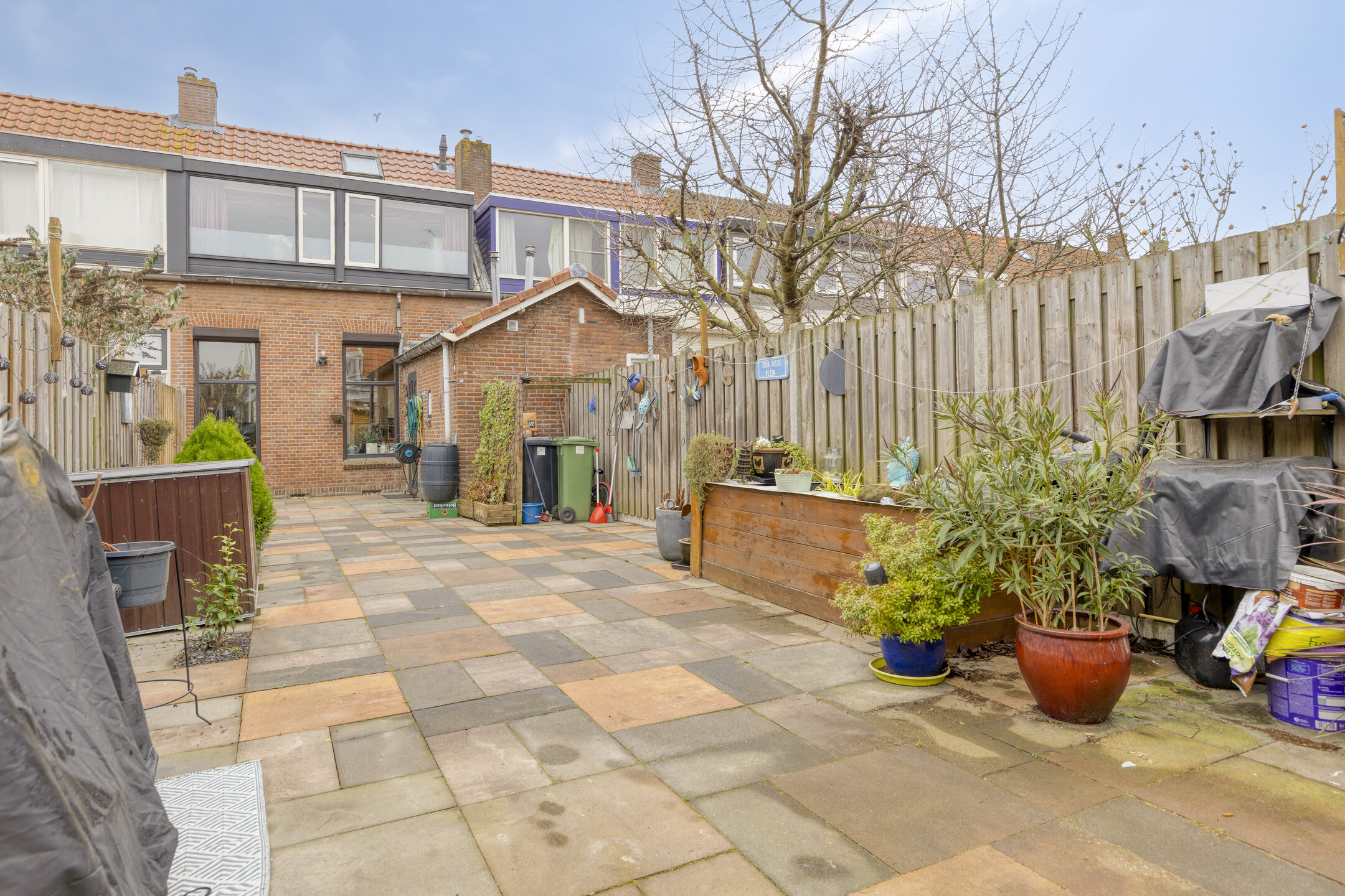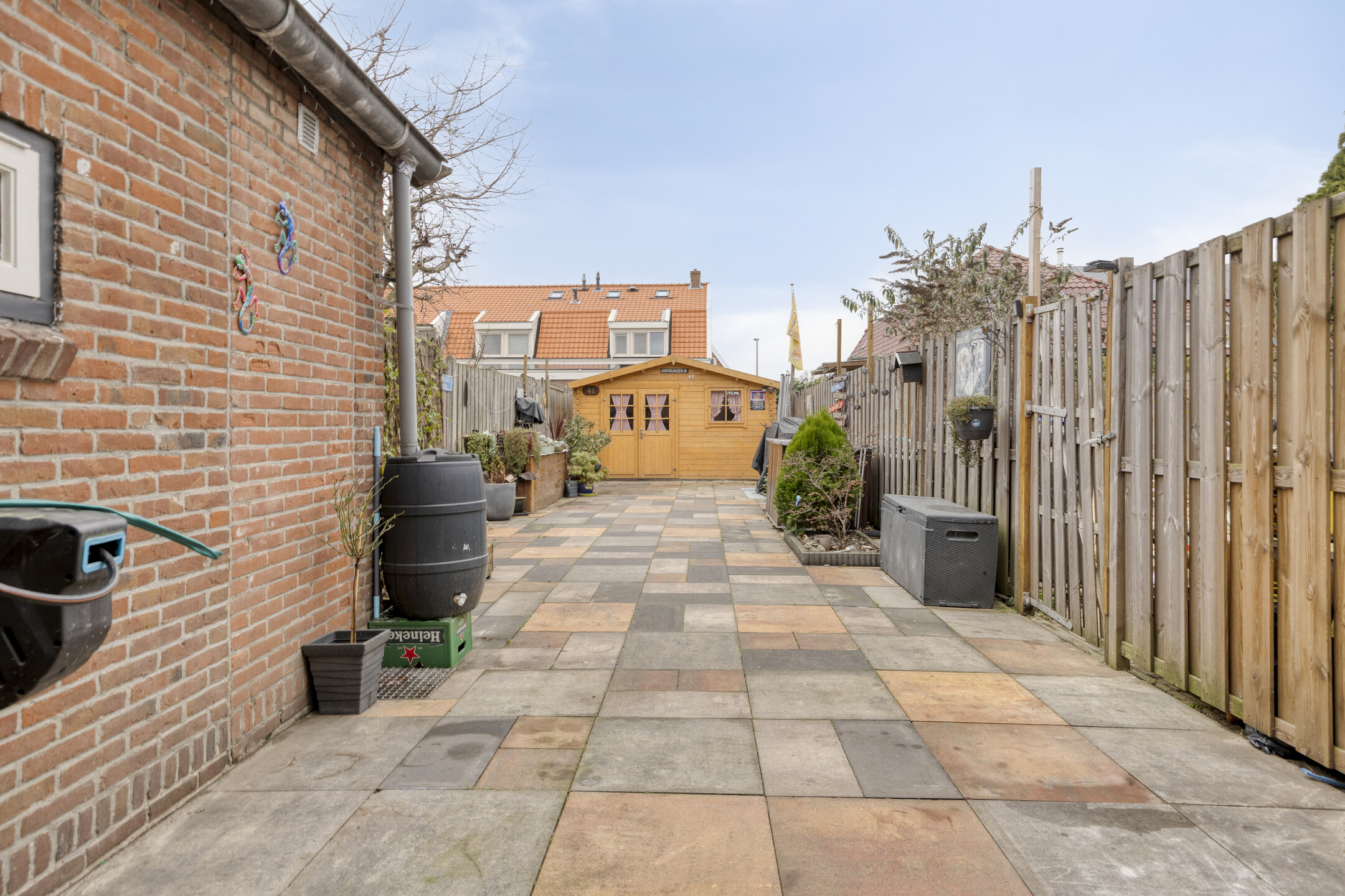 Nette voortuin en diepe achtertuin (20 meter diep), die geheel omheind is en is voorzien van een zonnig terras, een vijverpartij en achterin de tuin staat een ruime, in 2023 geplaatste houten blokhut van circa 15 m² voorzien van een gezellige bar en elektra.