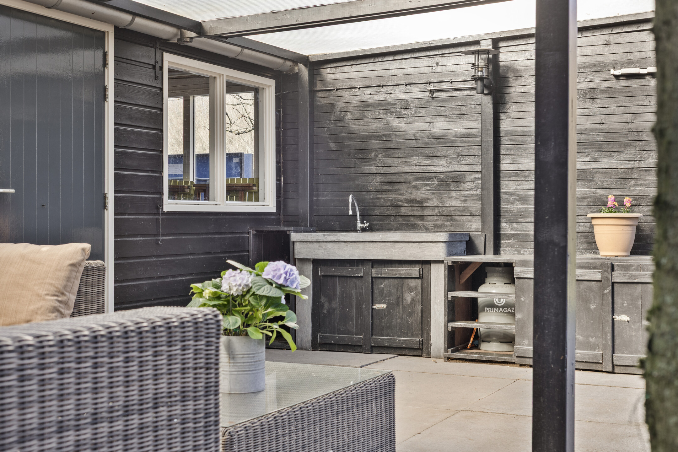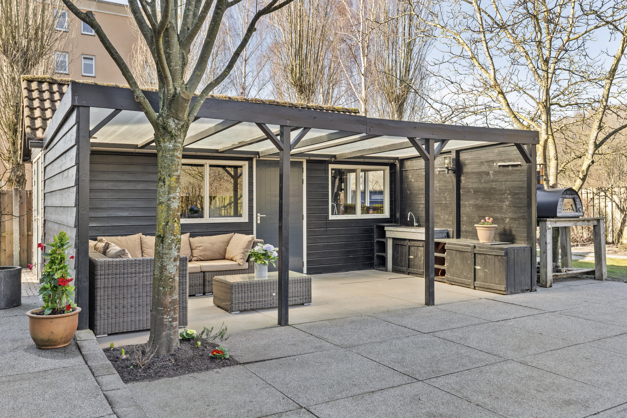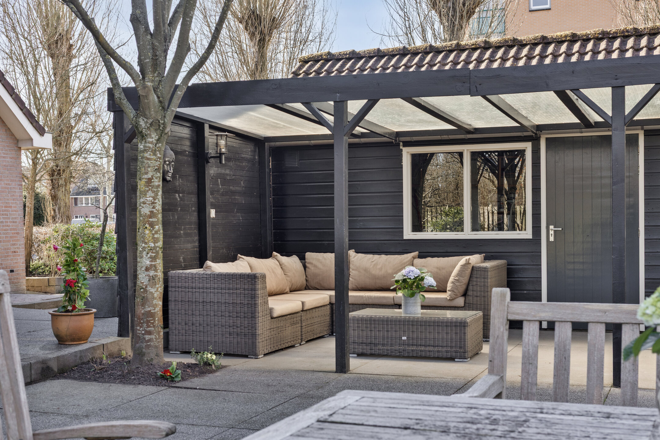 Berging: houten berging met overkapping in de achtertuin, totaal circa 38 m²