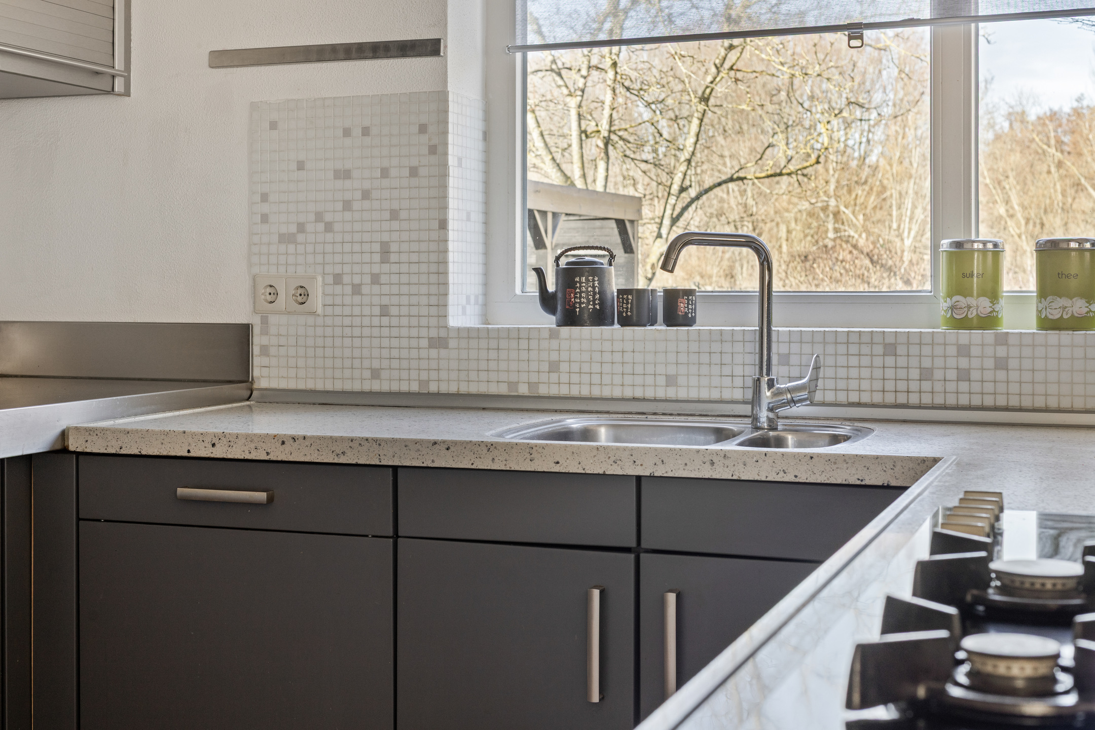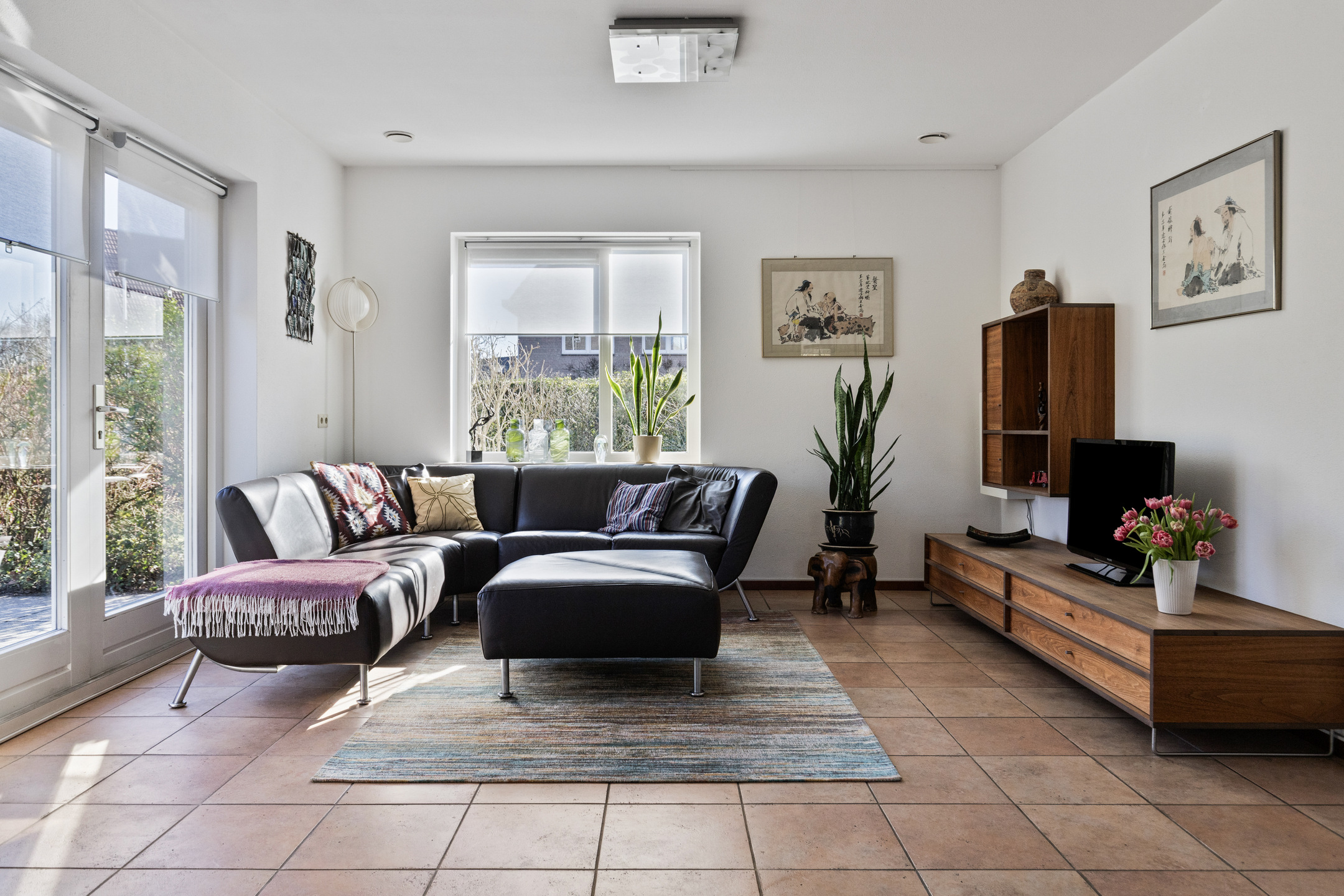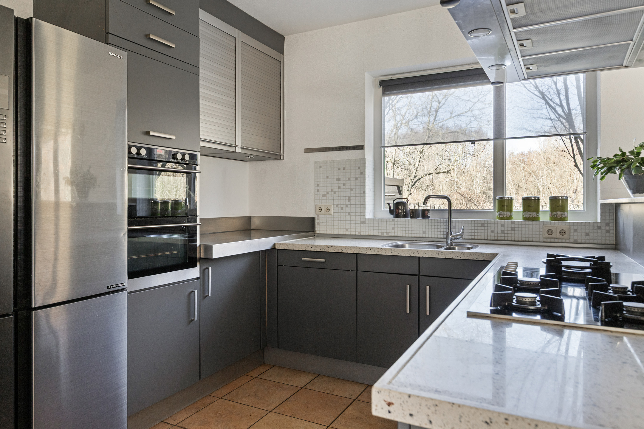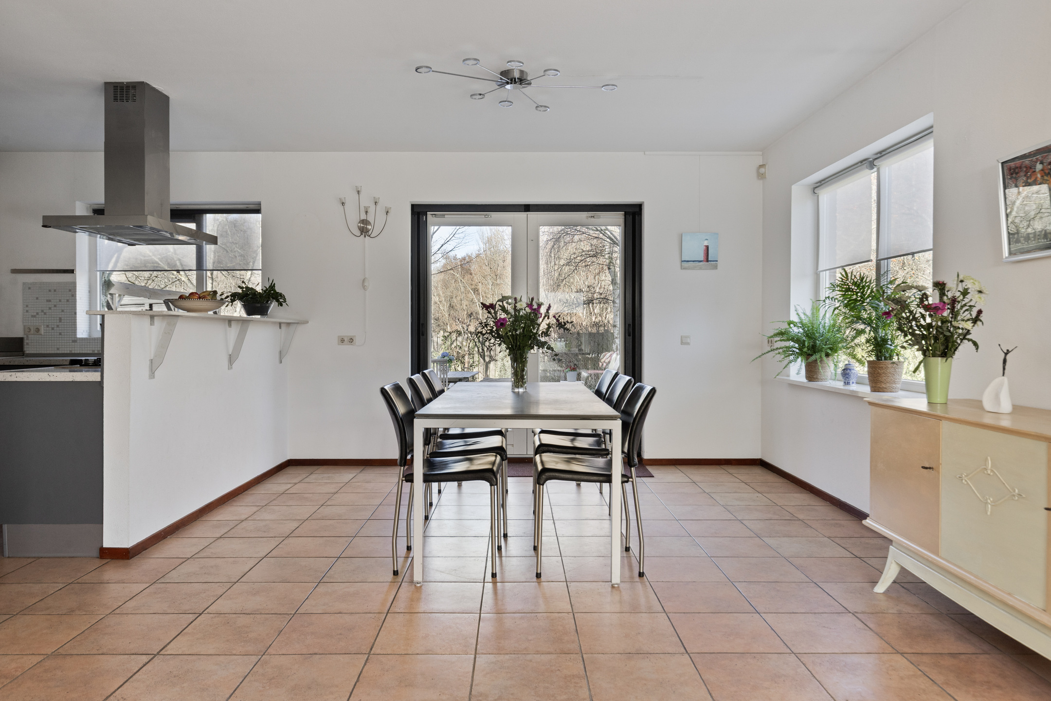 De woonkamer (van bijna 37 m²) is gelegen aan de rechterzijde van de woning, over de volledige diepte en biedt een fijne lichtinval door de vele raampartijen. Middels openslaande deuren aan de zijkant en aan de achterkant heb je toegang tot de tuin. De woonkamer beschikt over een vaste kast. Aansluitend de sem-open keuken met een inrichting geplaatst in U-opstelling. De keuken is voorzien van complete inbouwapparatuur zoals 5-pits gaskookplaat, afzuigkap, oven, magnetron en vaatwasmachine. De spoelbak bevindt zich onder het raam met een heerlijk zicht op de achtertuin.