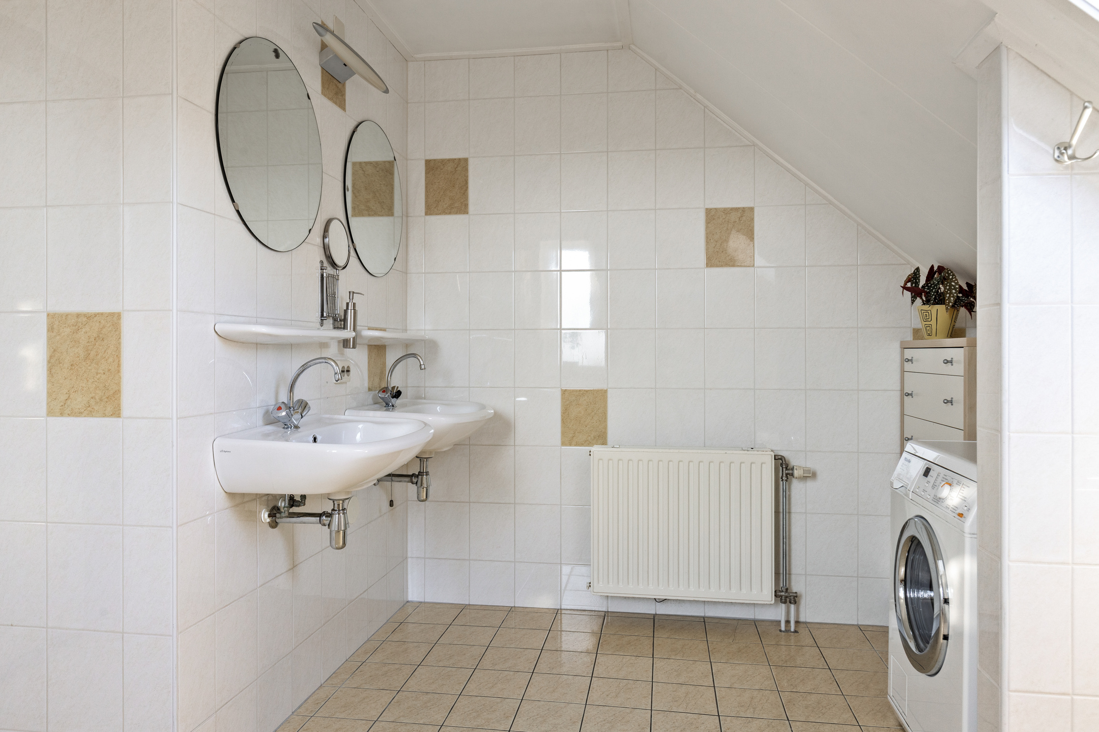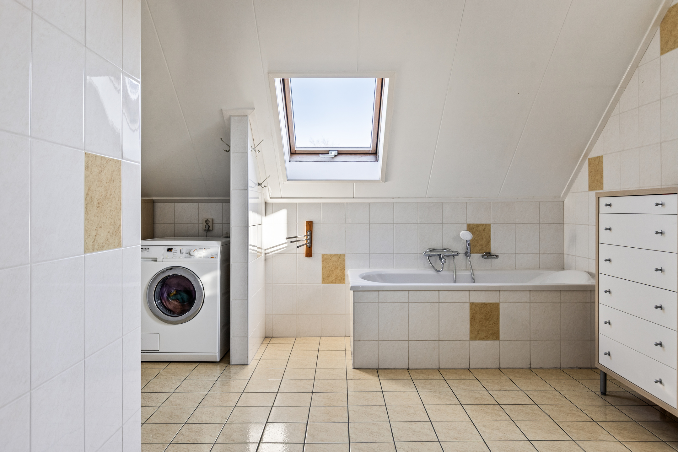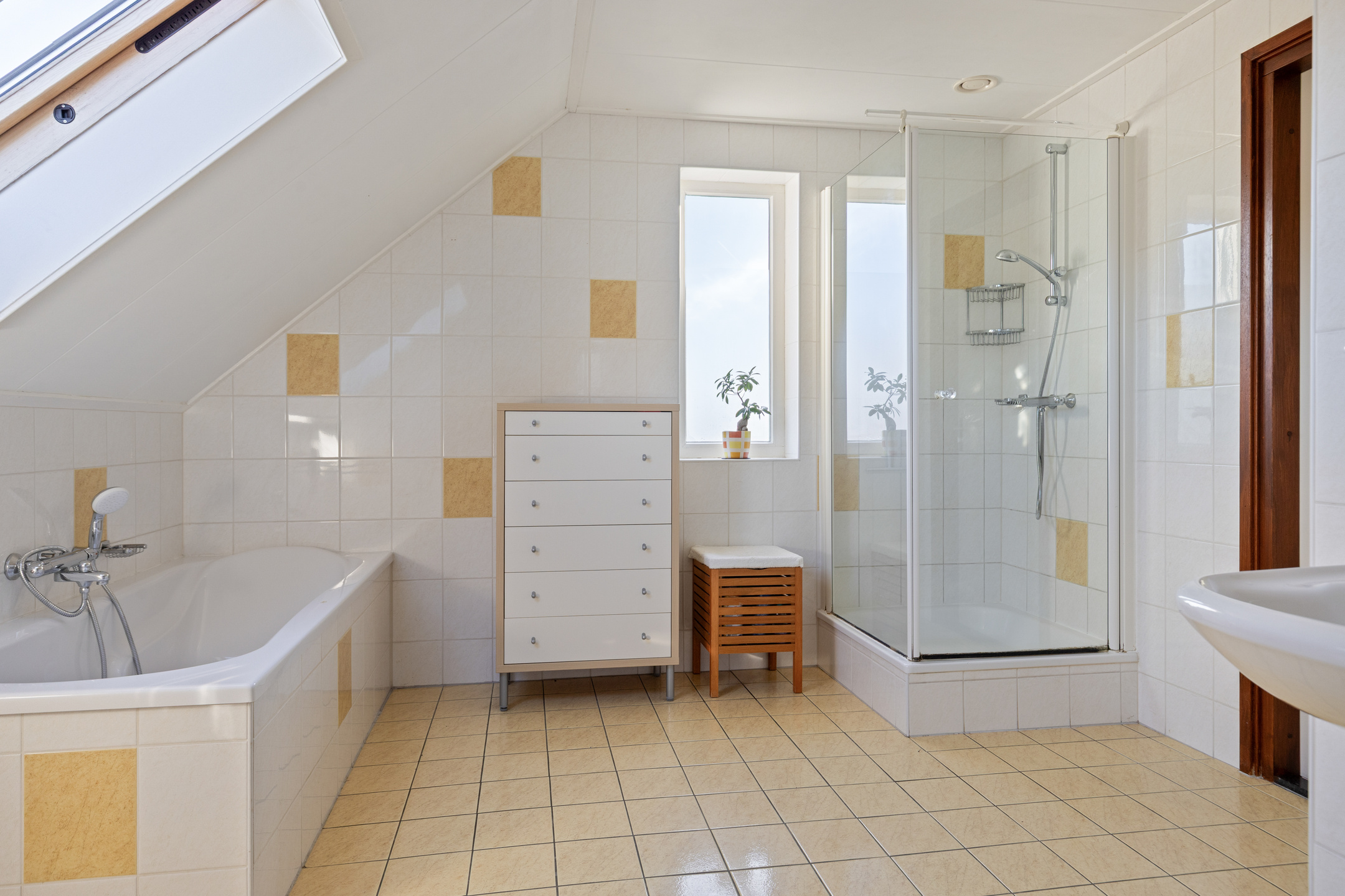 De zeer ruime badkamer van circa 13 m² is voorzien van betegeling tot aan het plafond, een ligbad, douchecabine, dubbele wastafel, design radiator en dakraam.