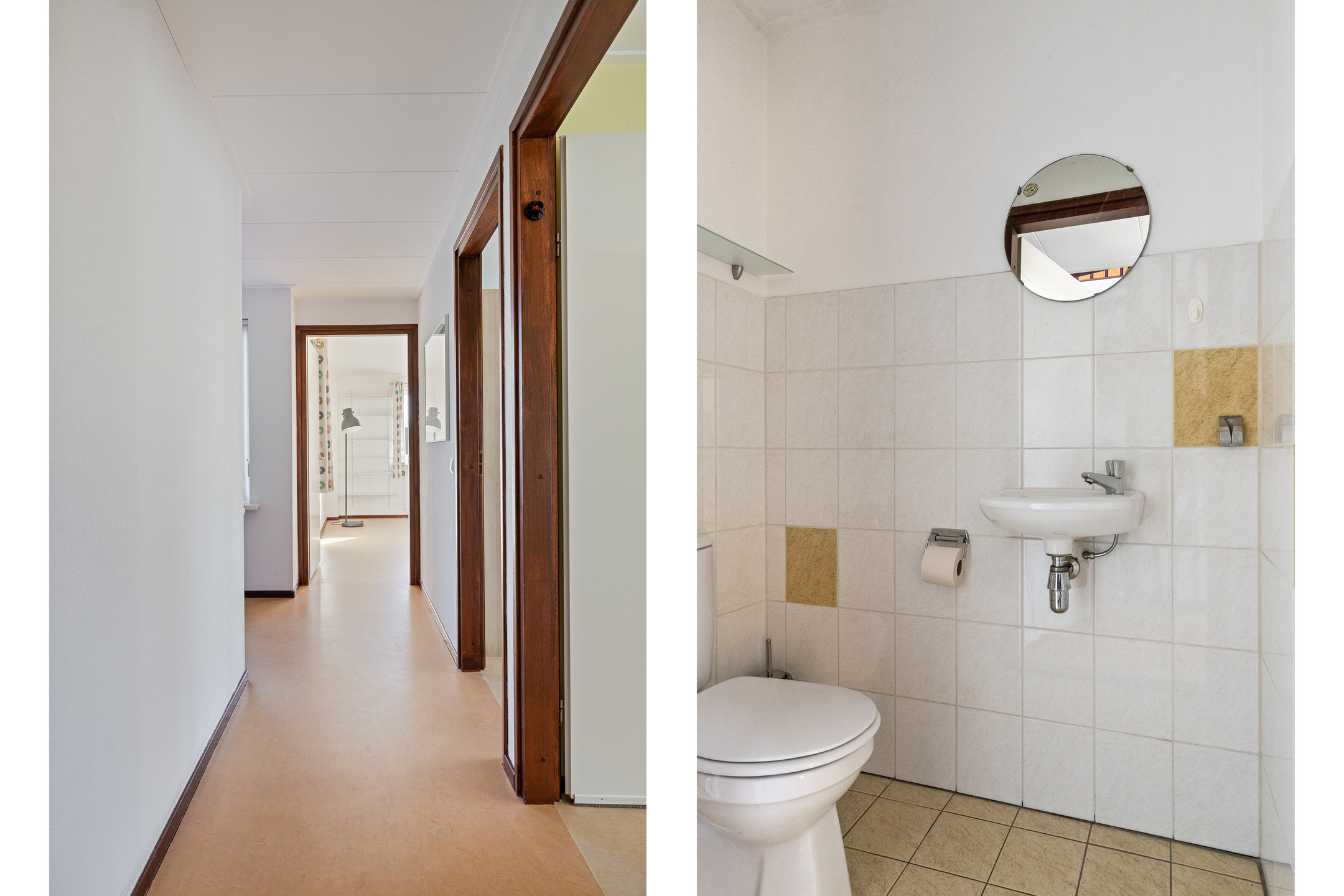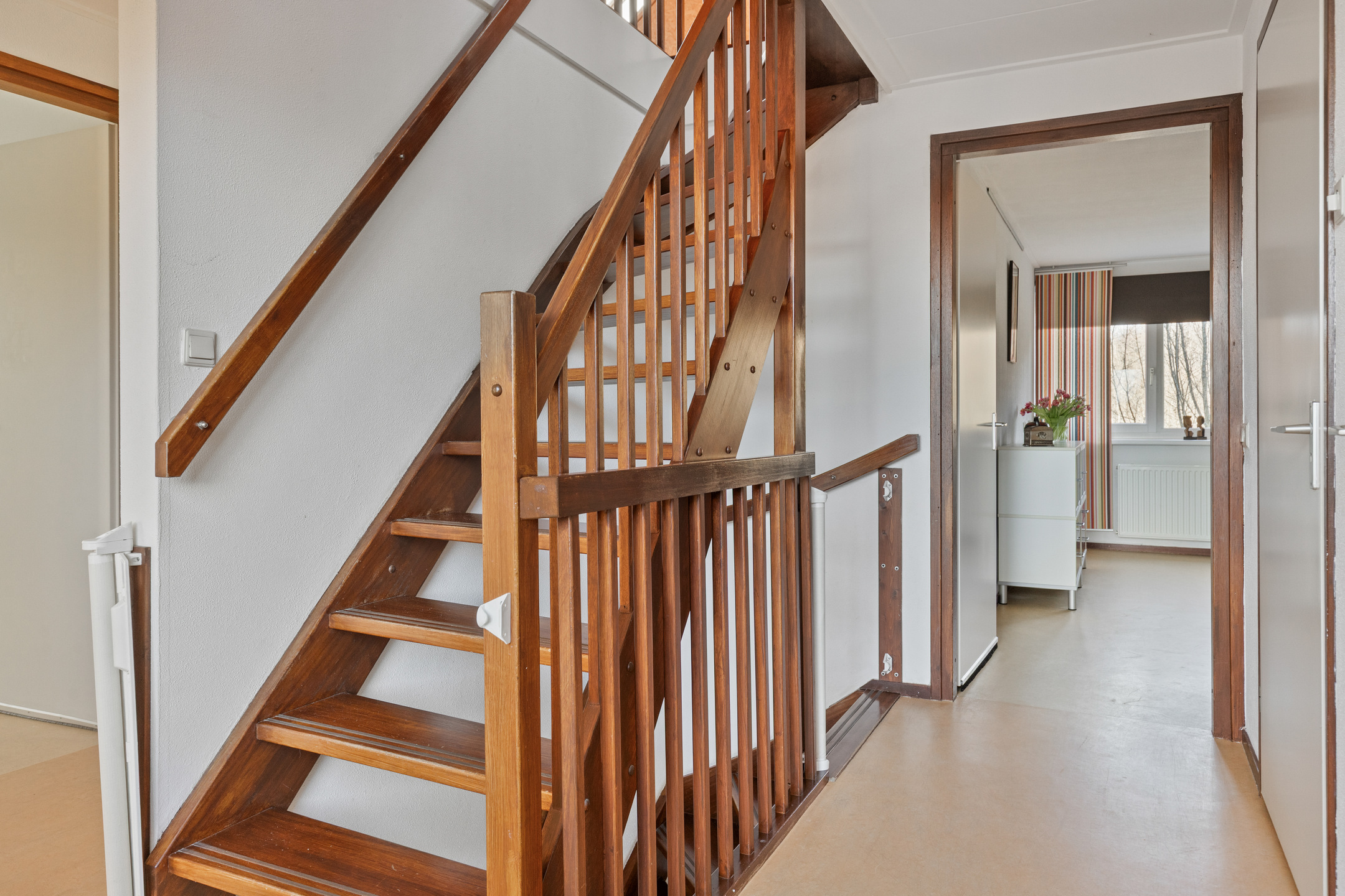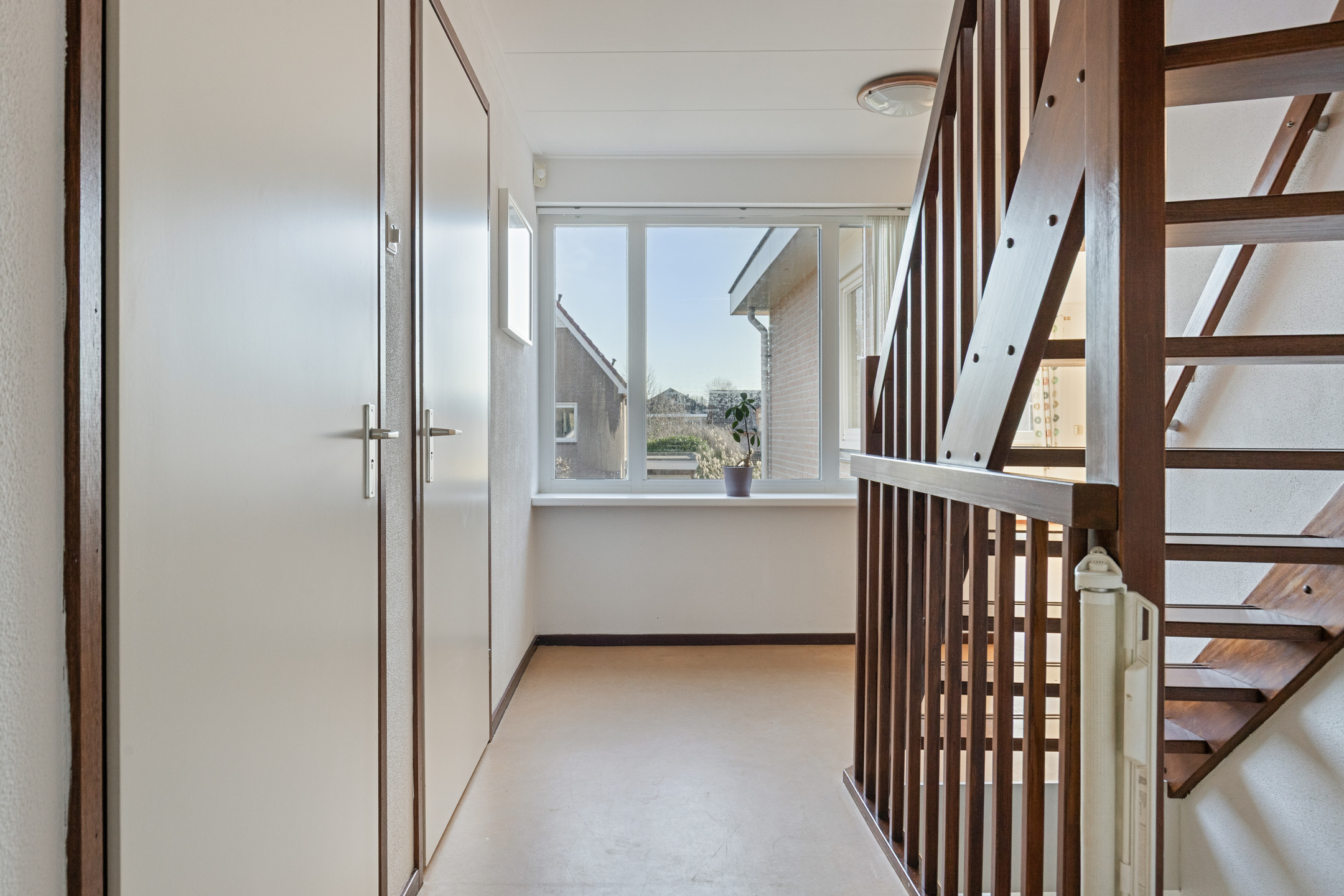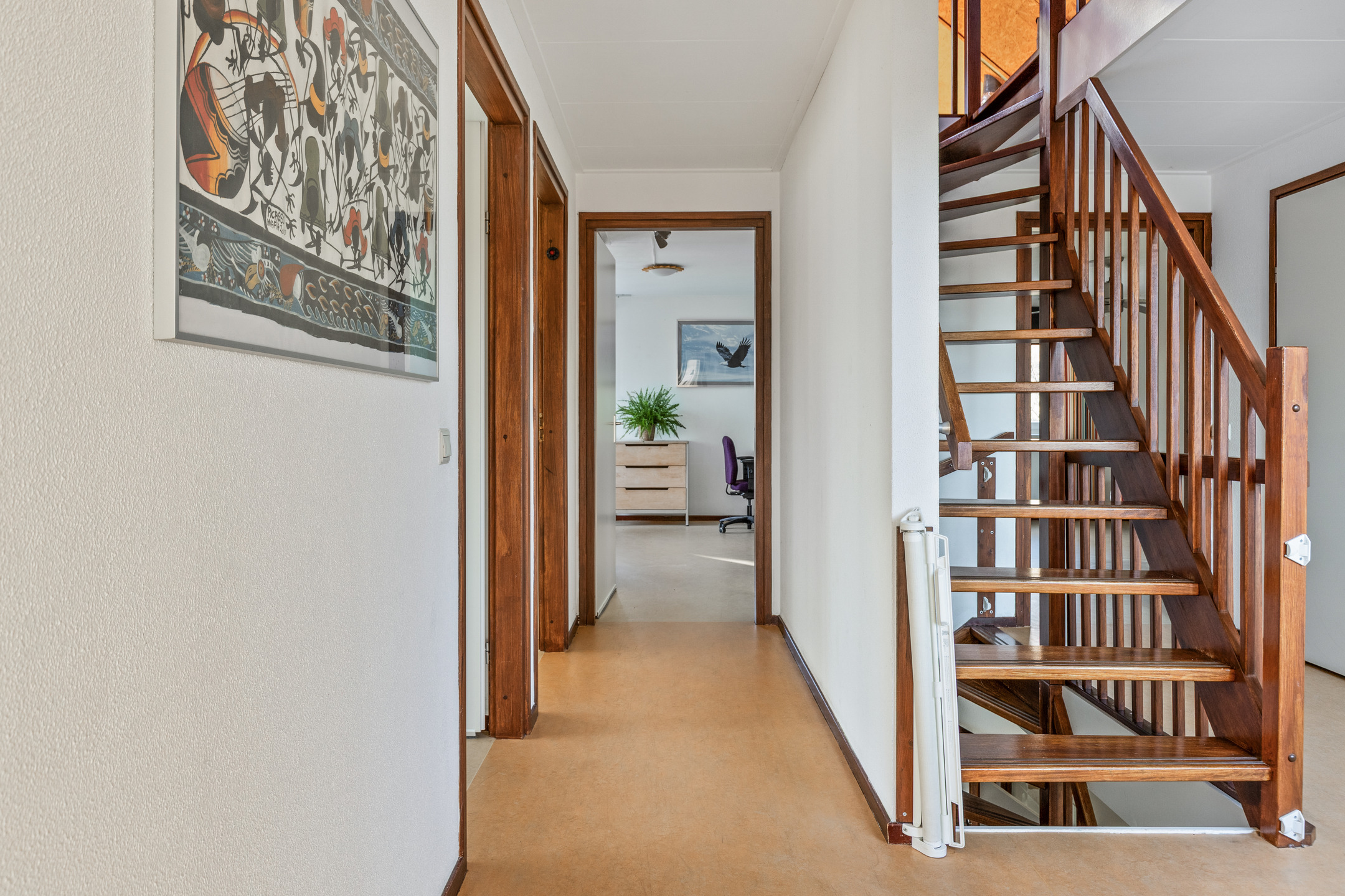 Overloop met centraal geplaatste vaste trapopgang naar de 2e verdieping, toegang tot de 5 slaapkamers, de badkamer en separaat toilet voorzien van handwasbakje.