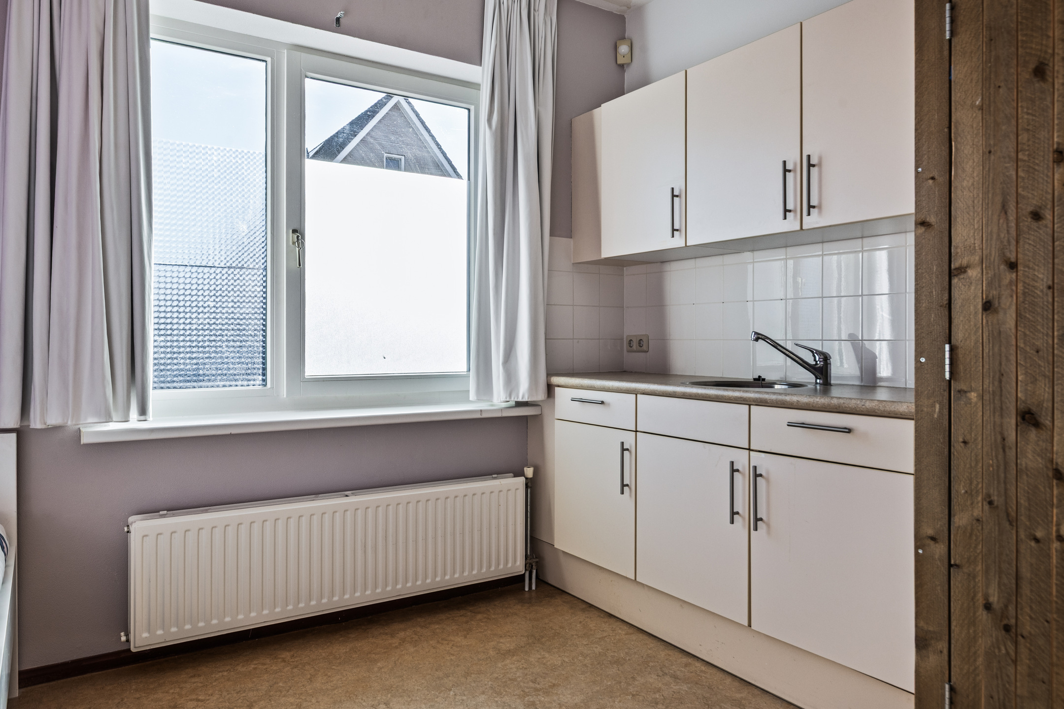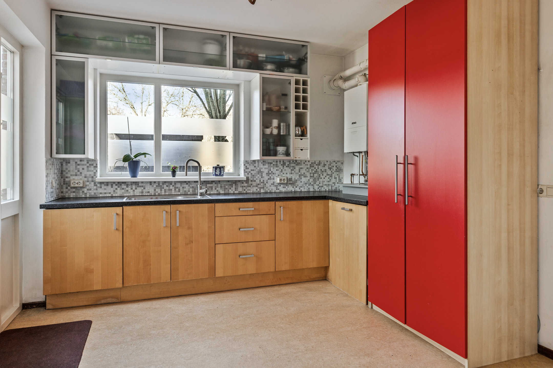 Aansluitend aan de keuken, de bijkeuken die op zijn beurt toegang geeft tot de tuin en de voormalige praktijkruimte. De bijkeuken is voorzien van een keukenblok met veel kastruimte en de cv-combiketel HR (Atag, 2019).