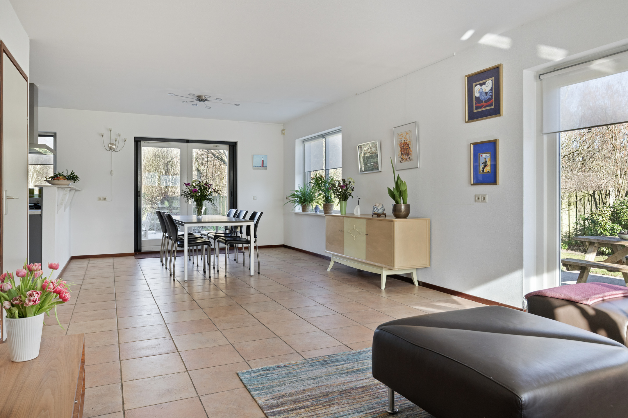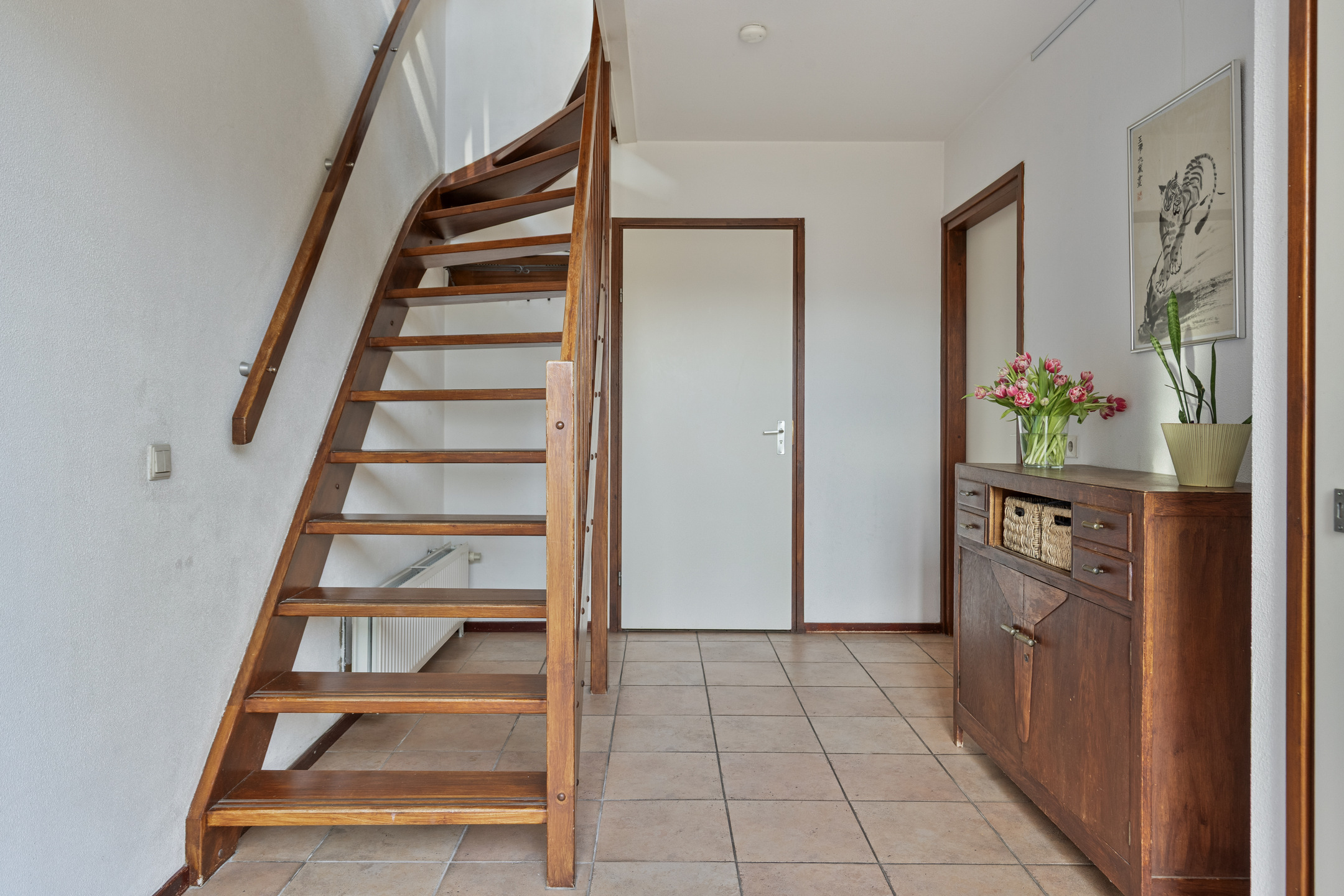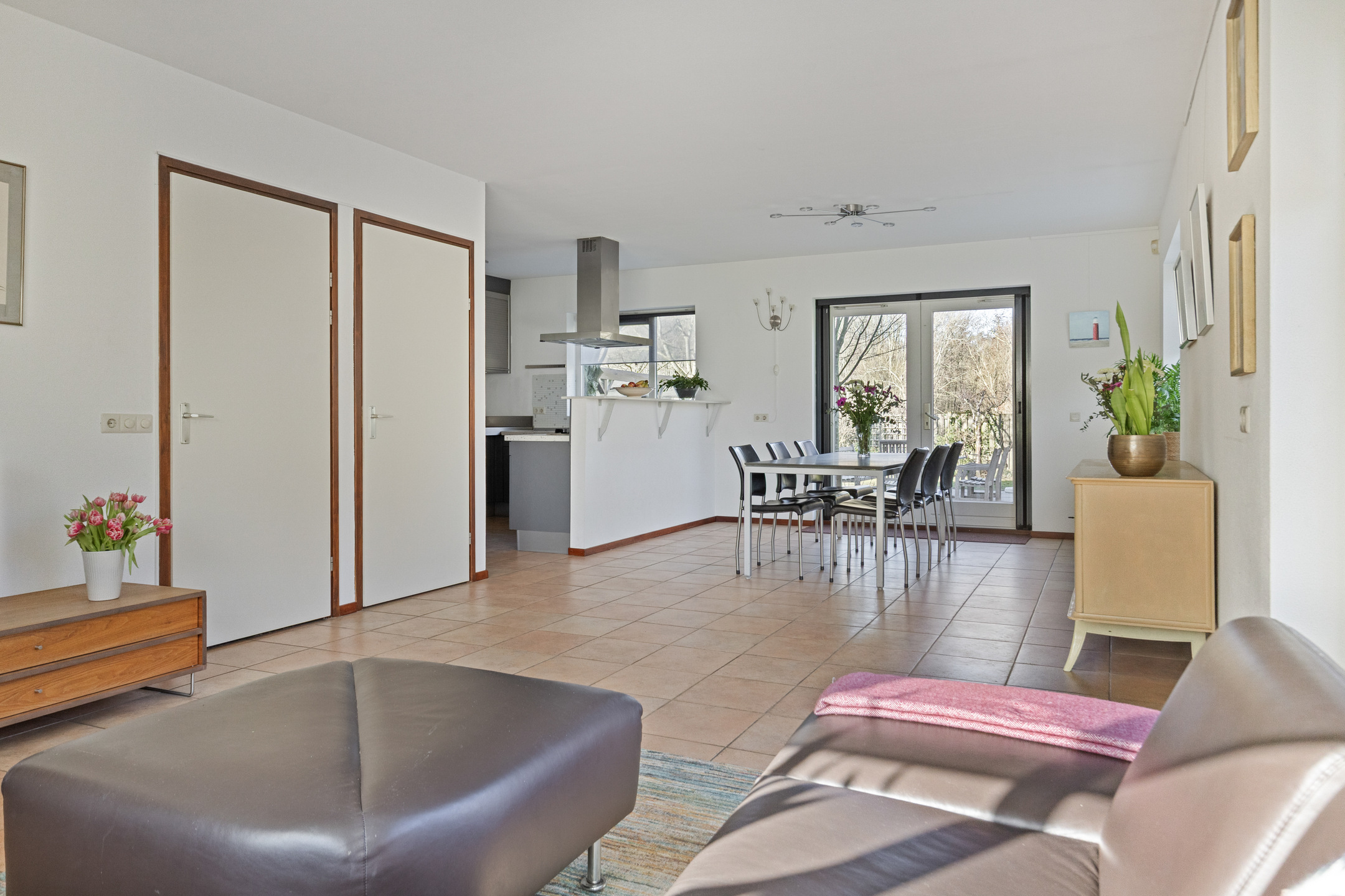 De hal, woonkamer en keuken zijn voorzien van een tegelvloer.