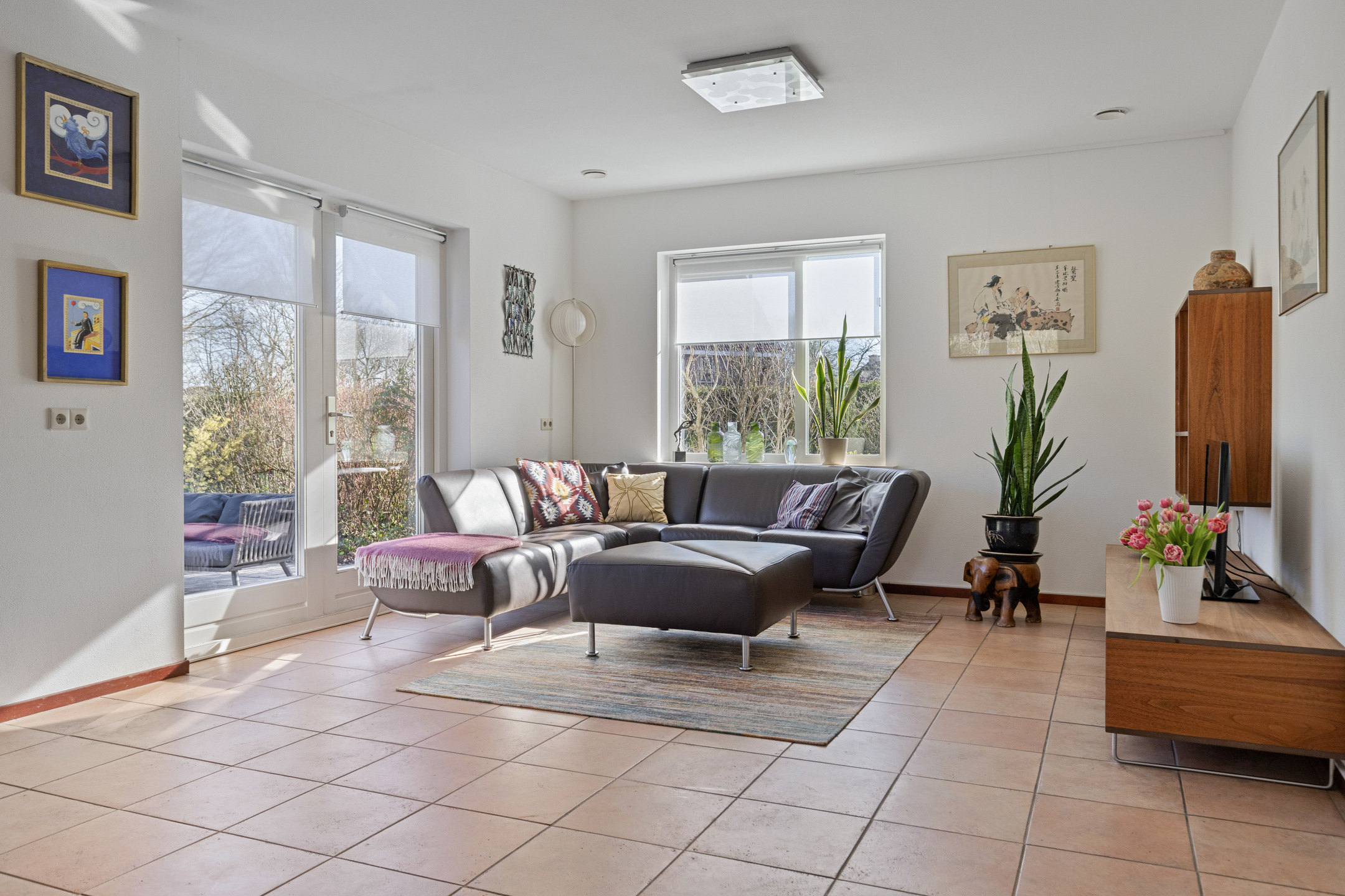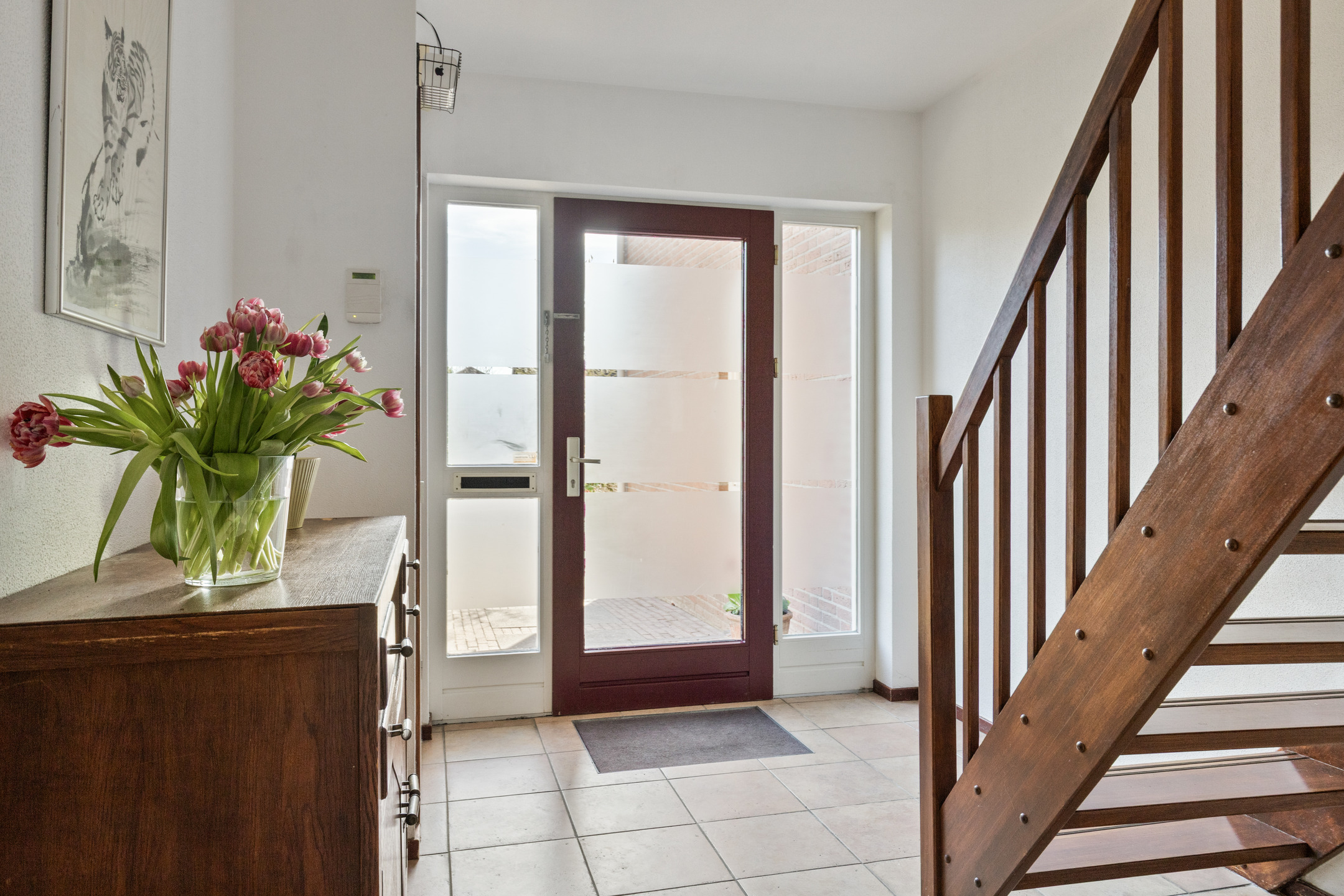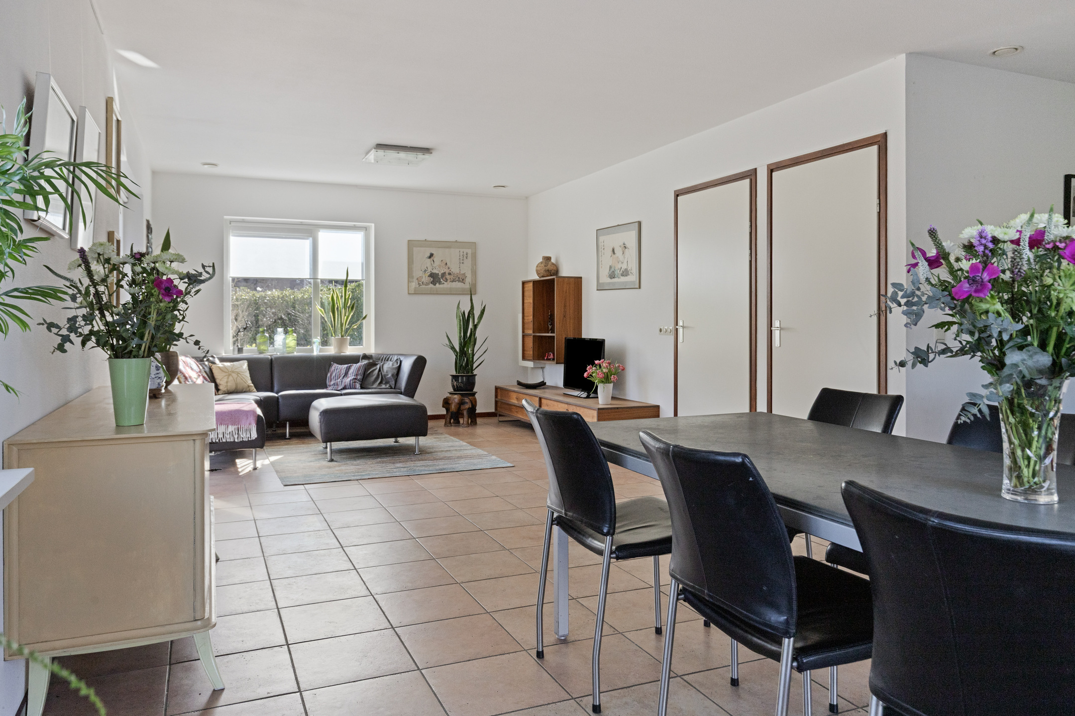 De hal, woonkamer en keuken zijn voorzien van een tegelvloer.