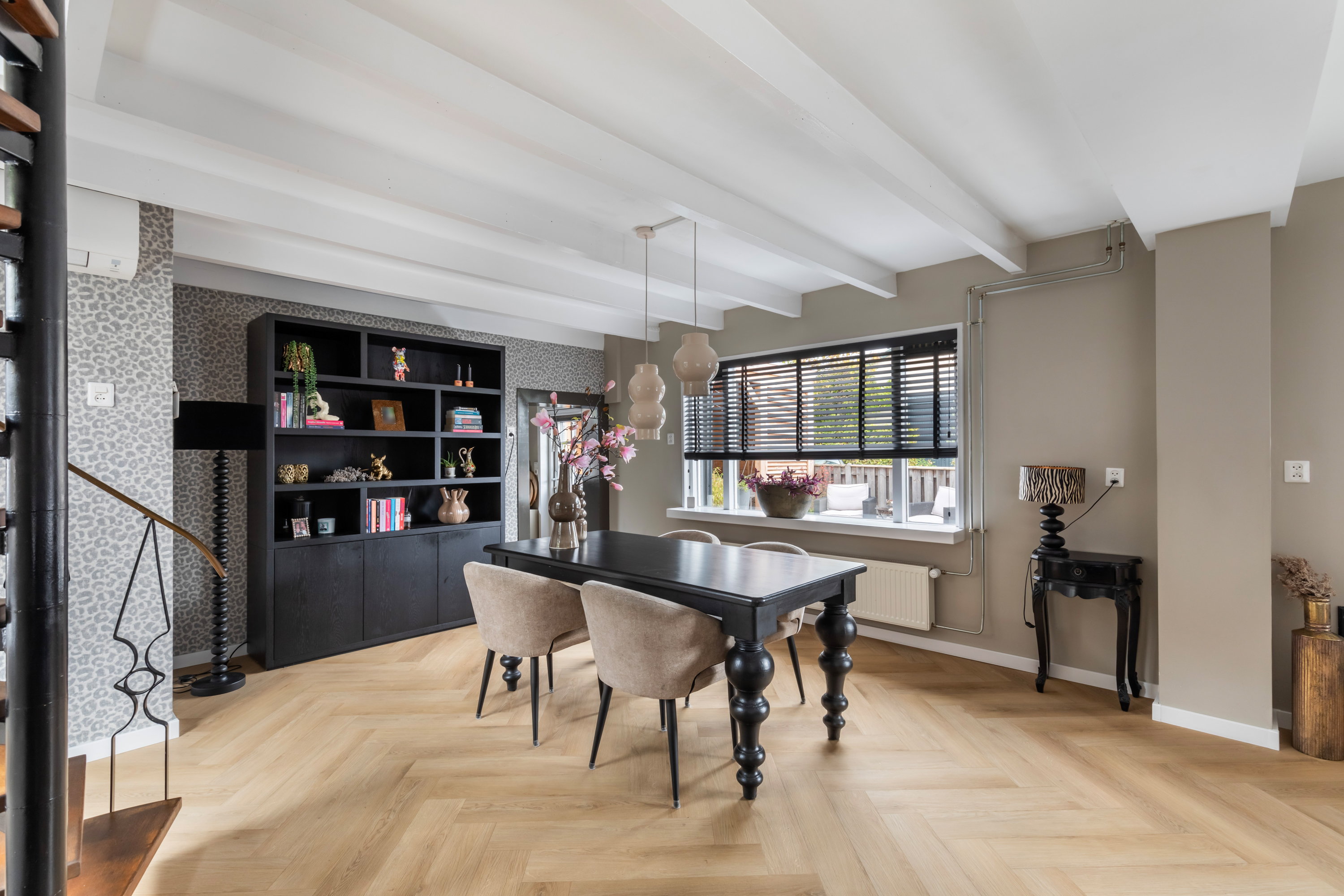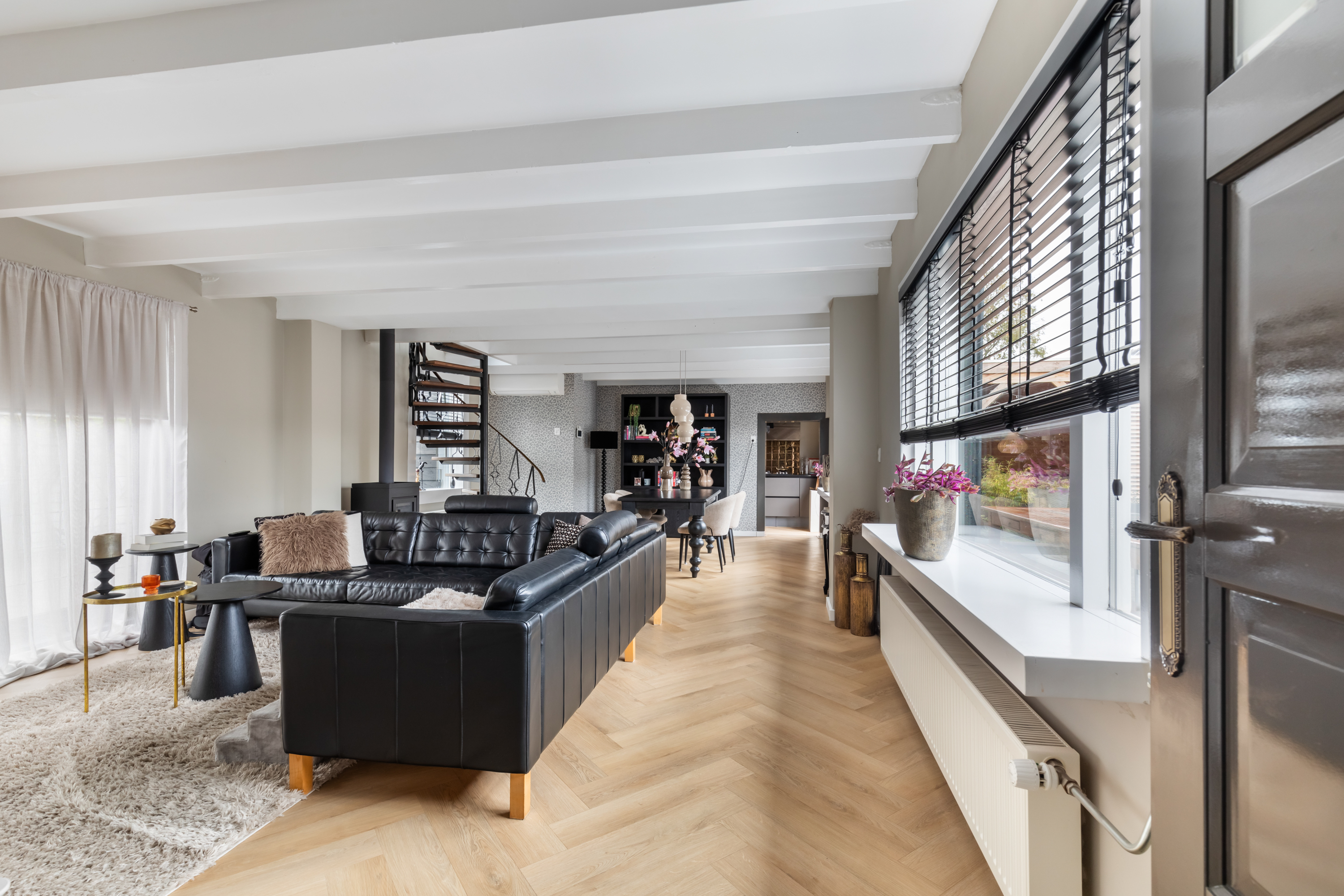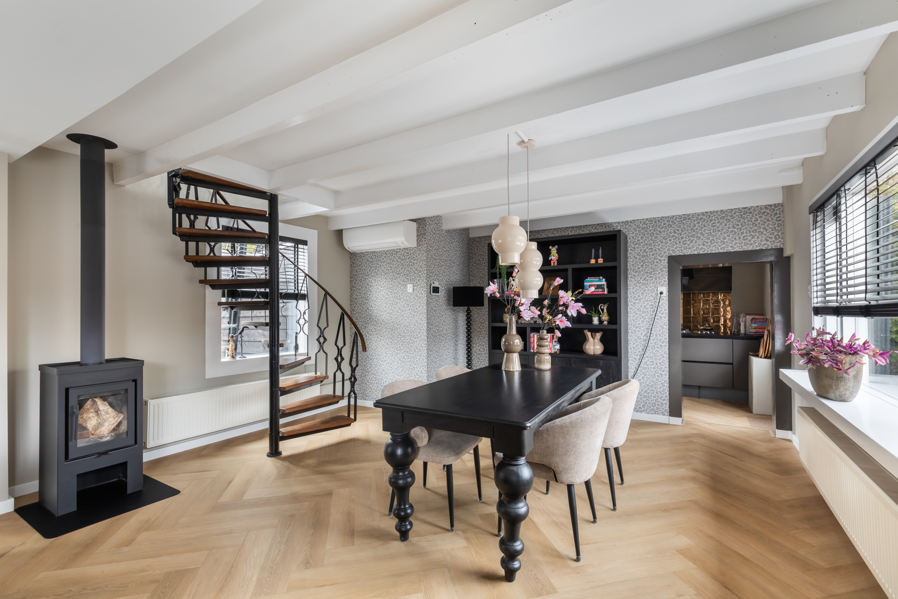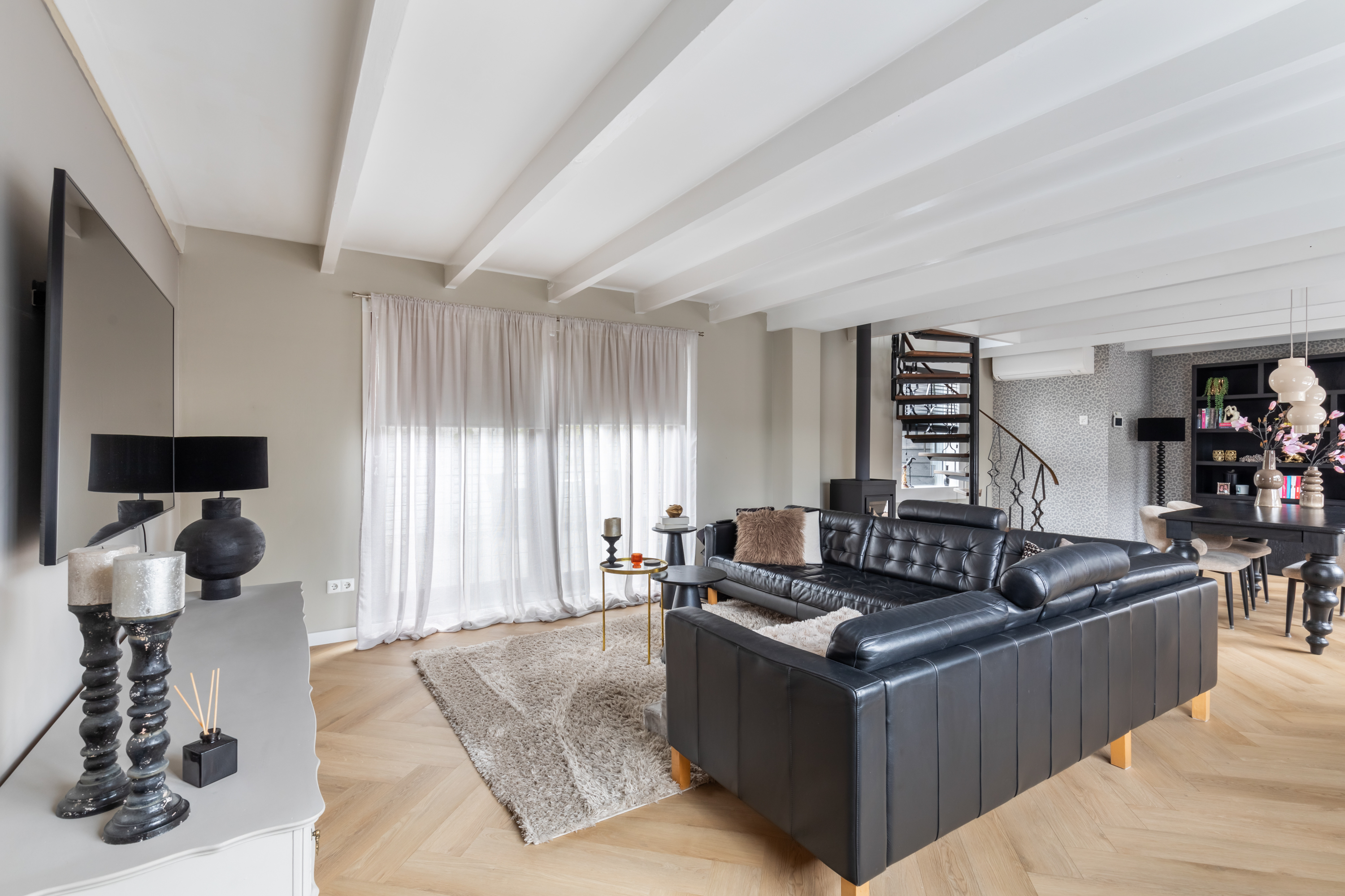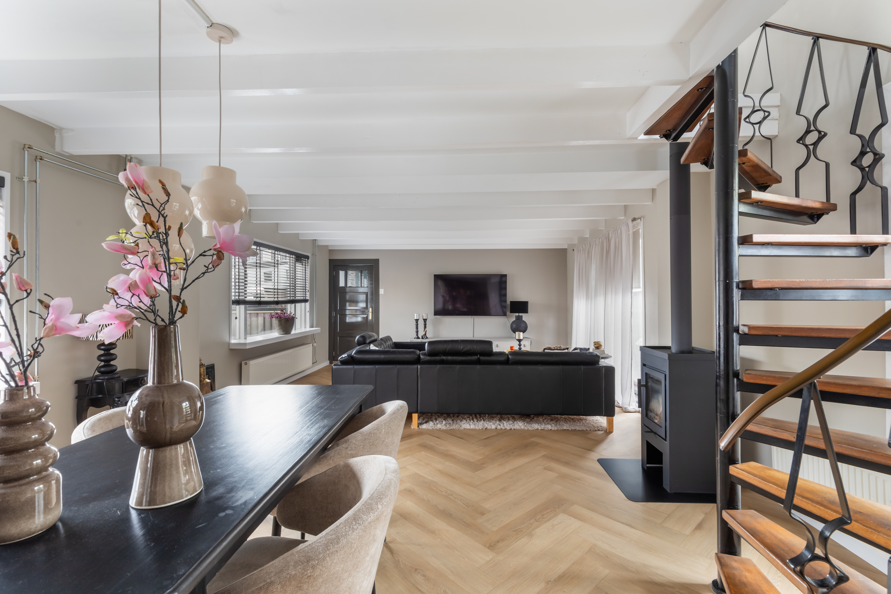 Zeer ruime woonkamer van circa 43 m²! Fraai en verzorgd afgewerkt met gezellige lichtinval door ramen aan de voor- en achterzijde, balkenplafond, airconditioning en een gezellige houtkachel. Middels schuifpui toegang tot de achtertuin. Middels spiltrap toegang tot de eerste verdieping.