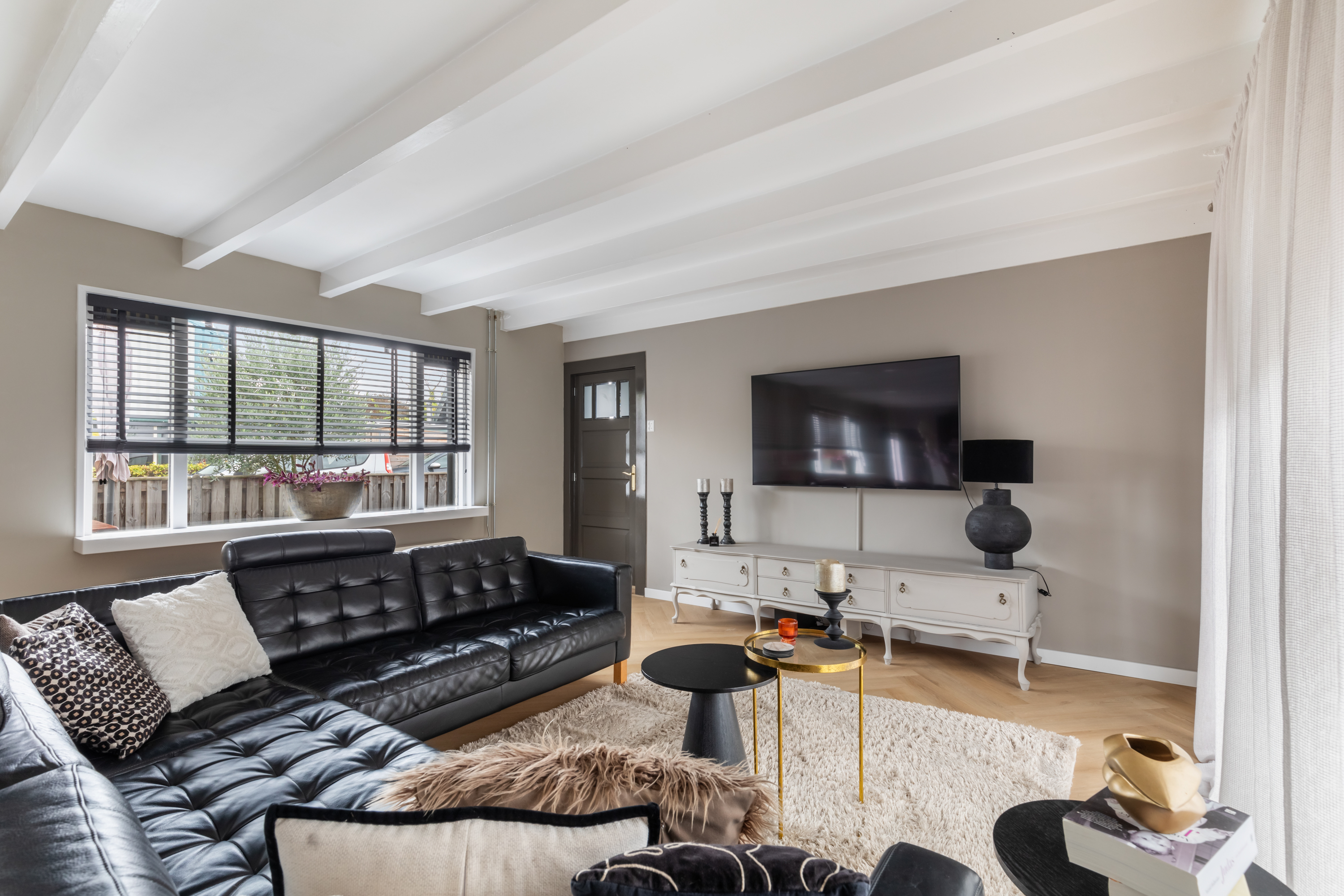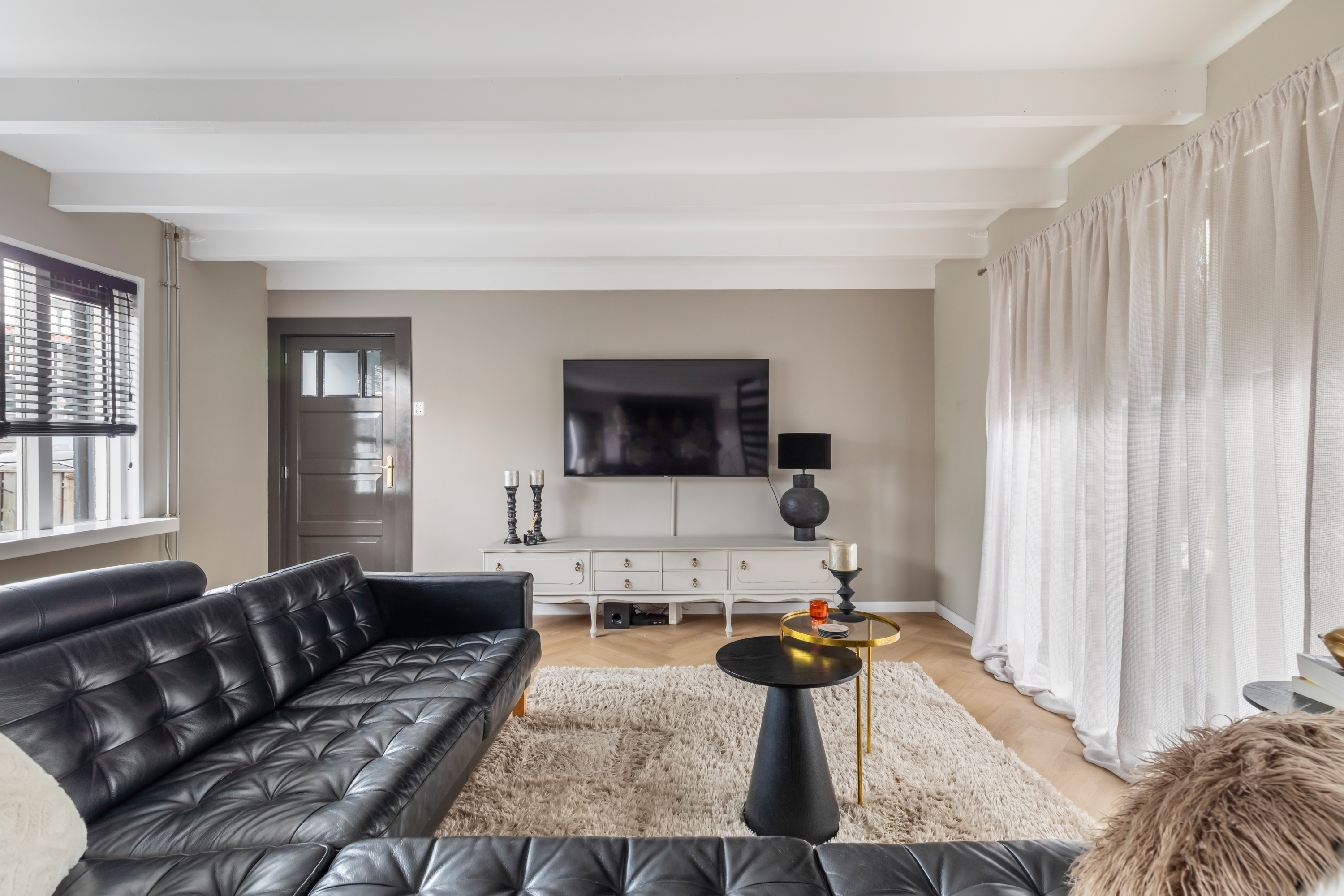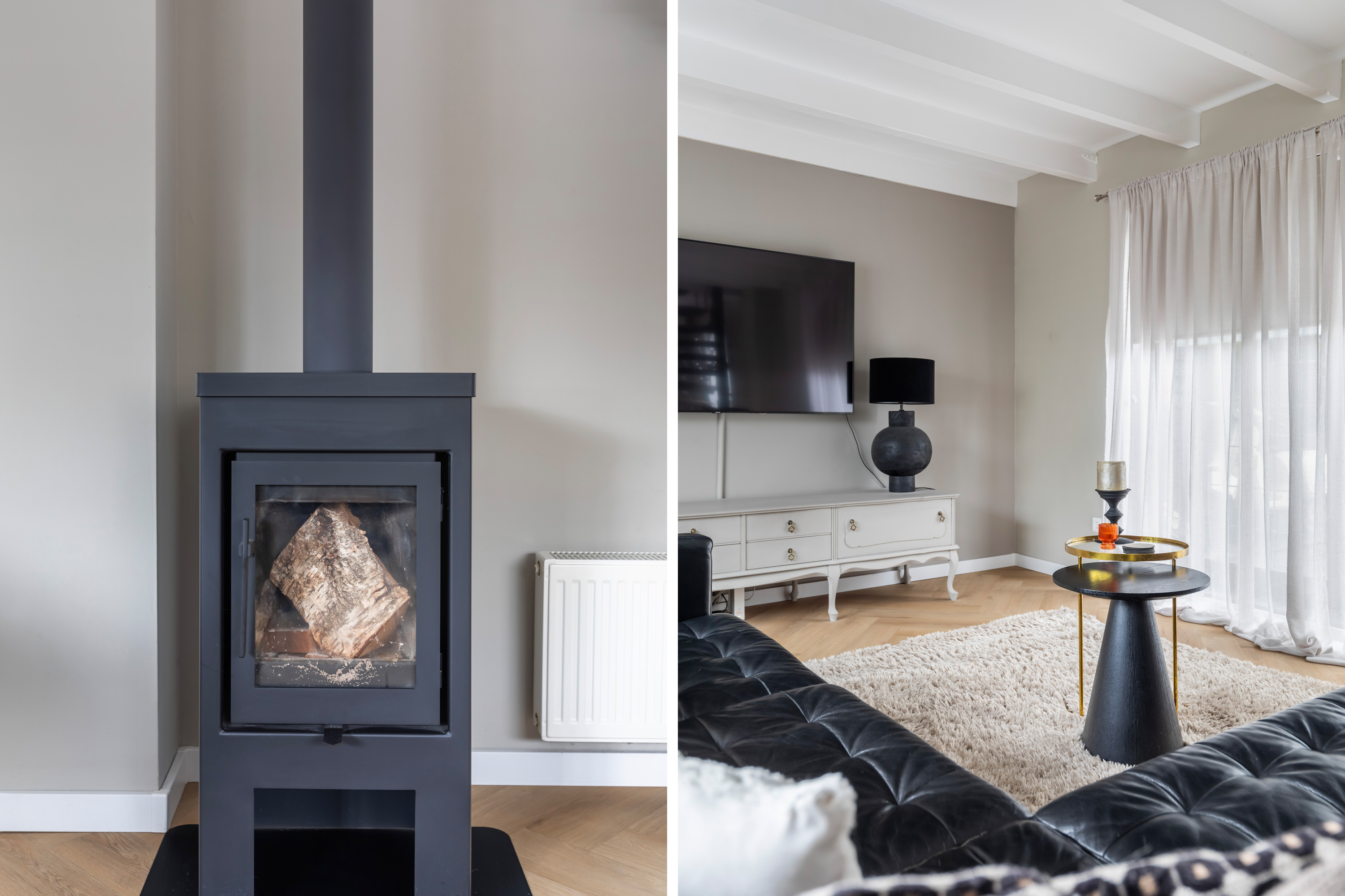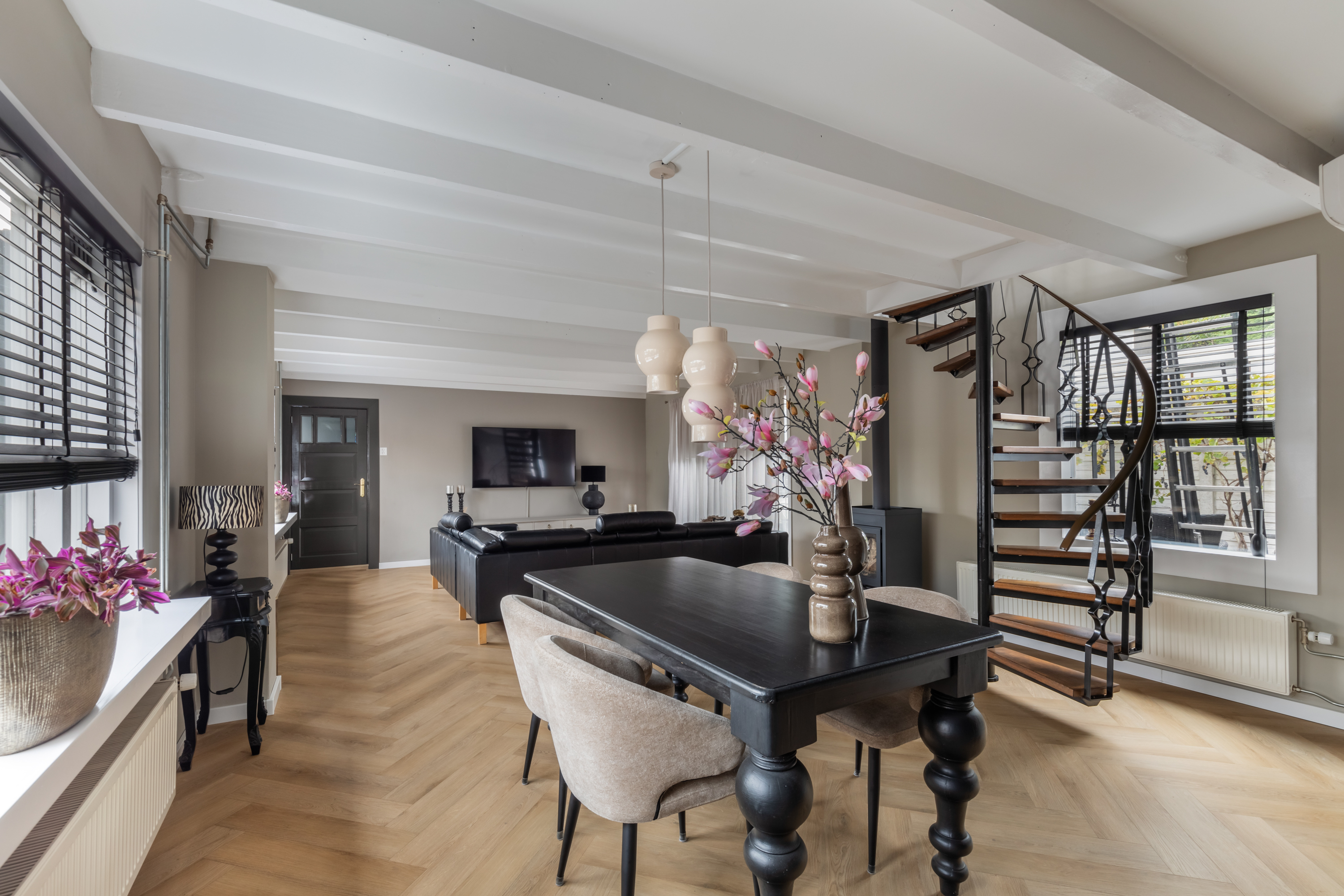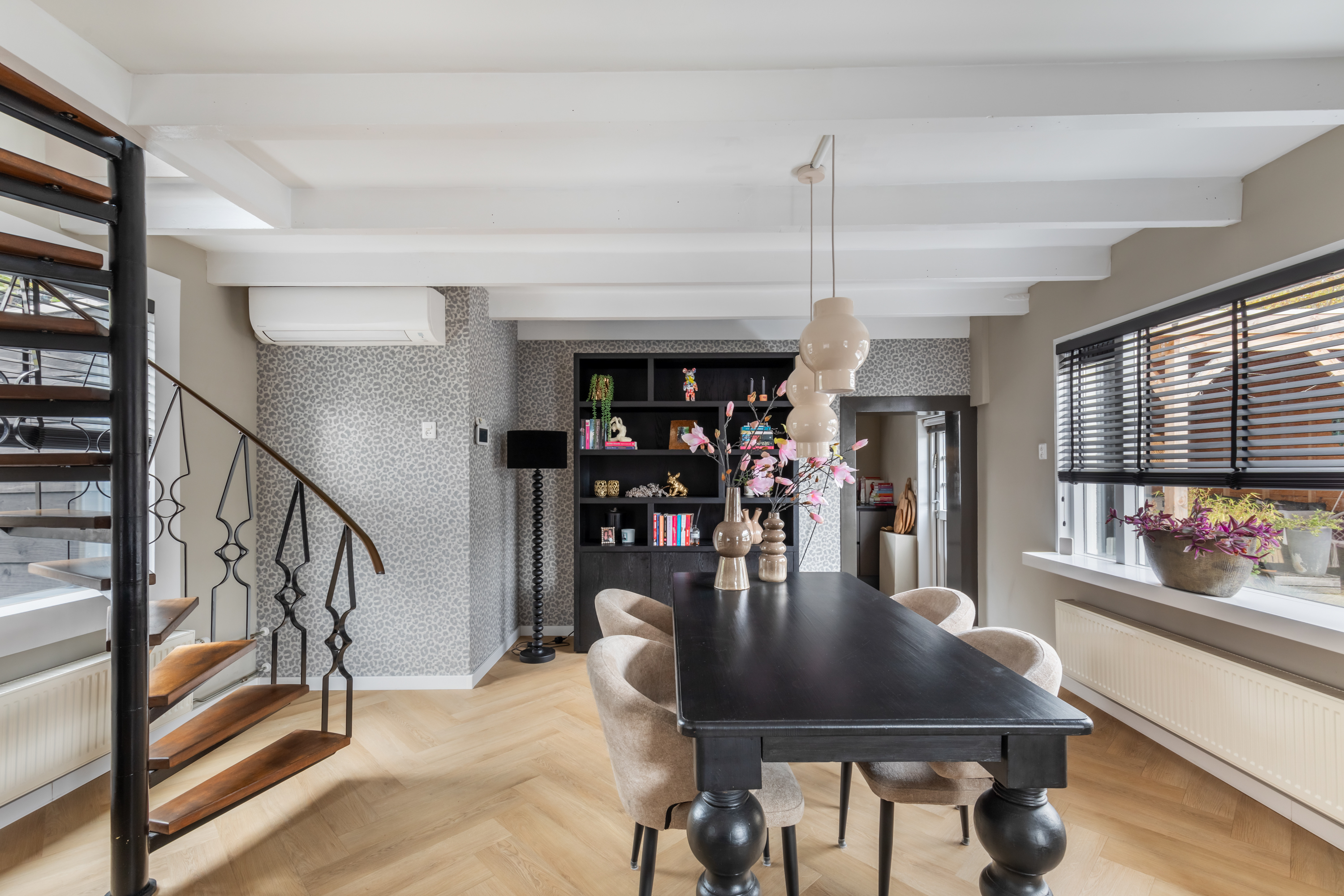 Zeer ruime woonkamer van circa 43 m²! Fraai en verzorgd afgewerkt met gezellige lichtinval door ramen aan de voor- en achterzijde, balkenplafond, airconditioning en een gezellige houtkachel. Middels schuifpui toegang tot de achtertuin. Middels spiltrap toegang tot de eerste verdieping.