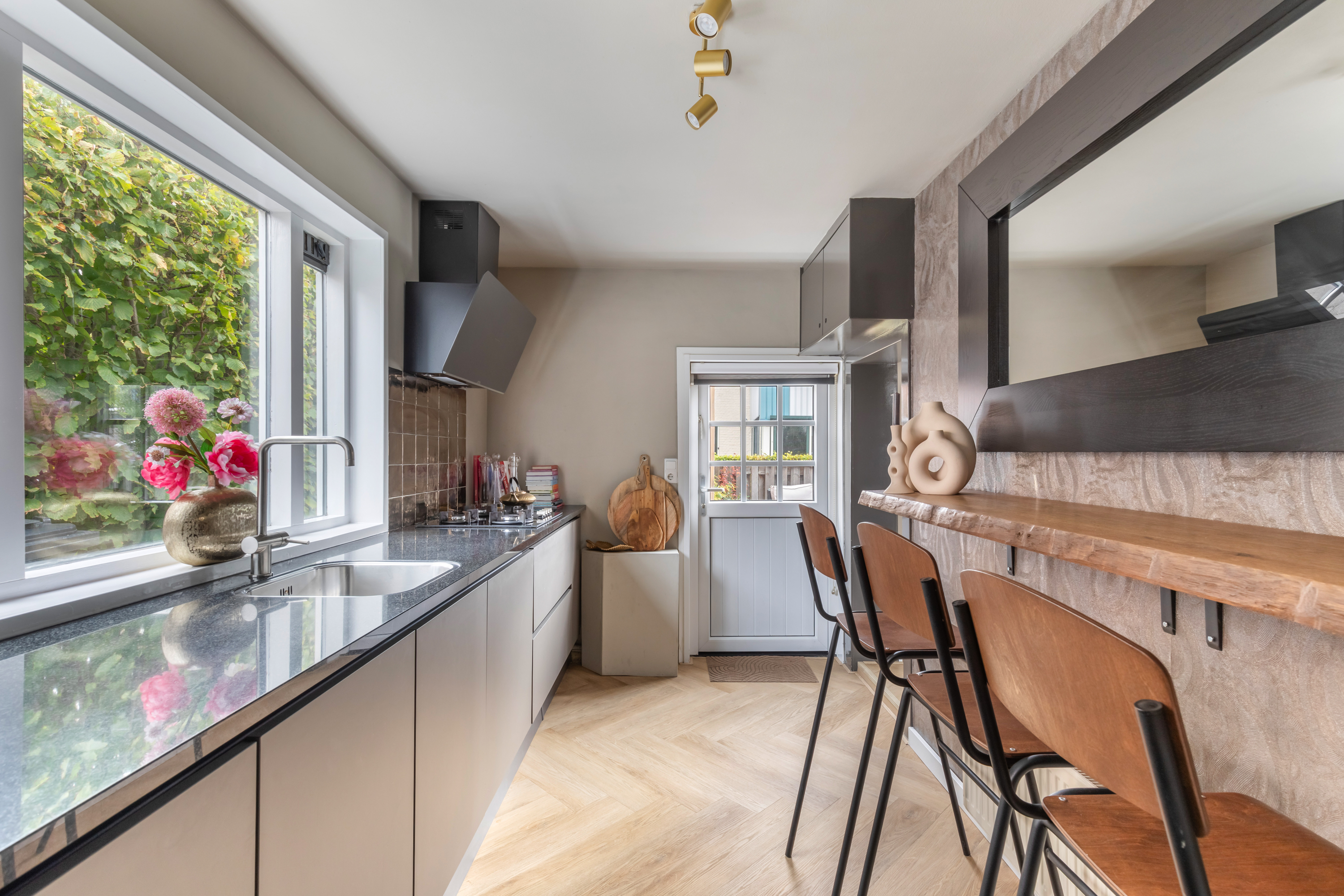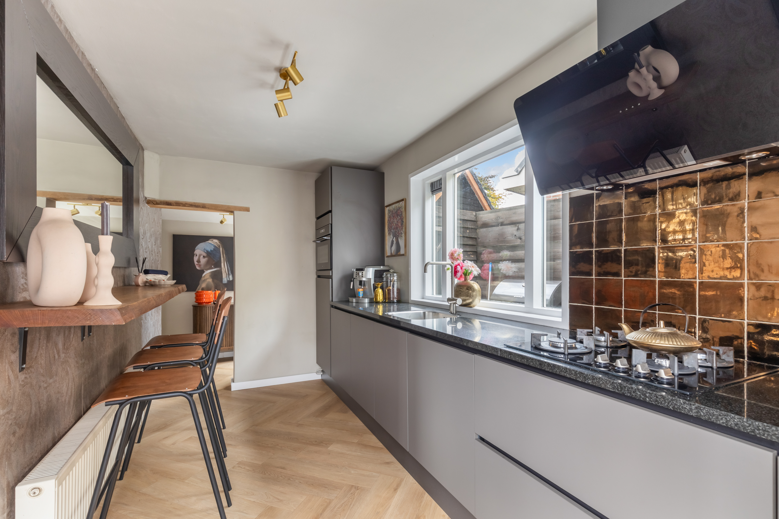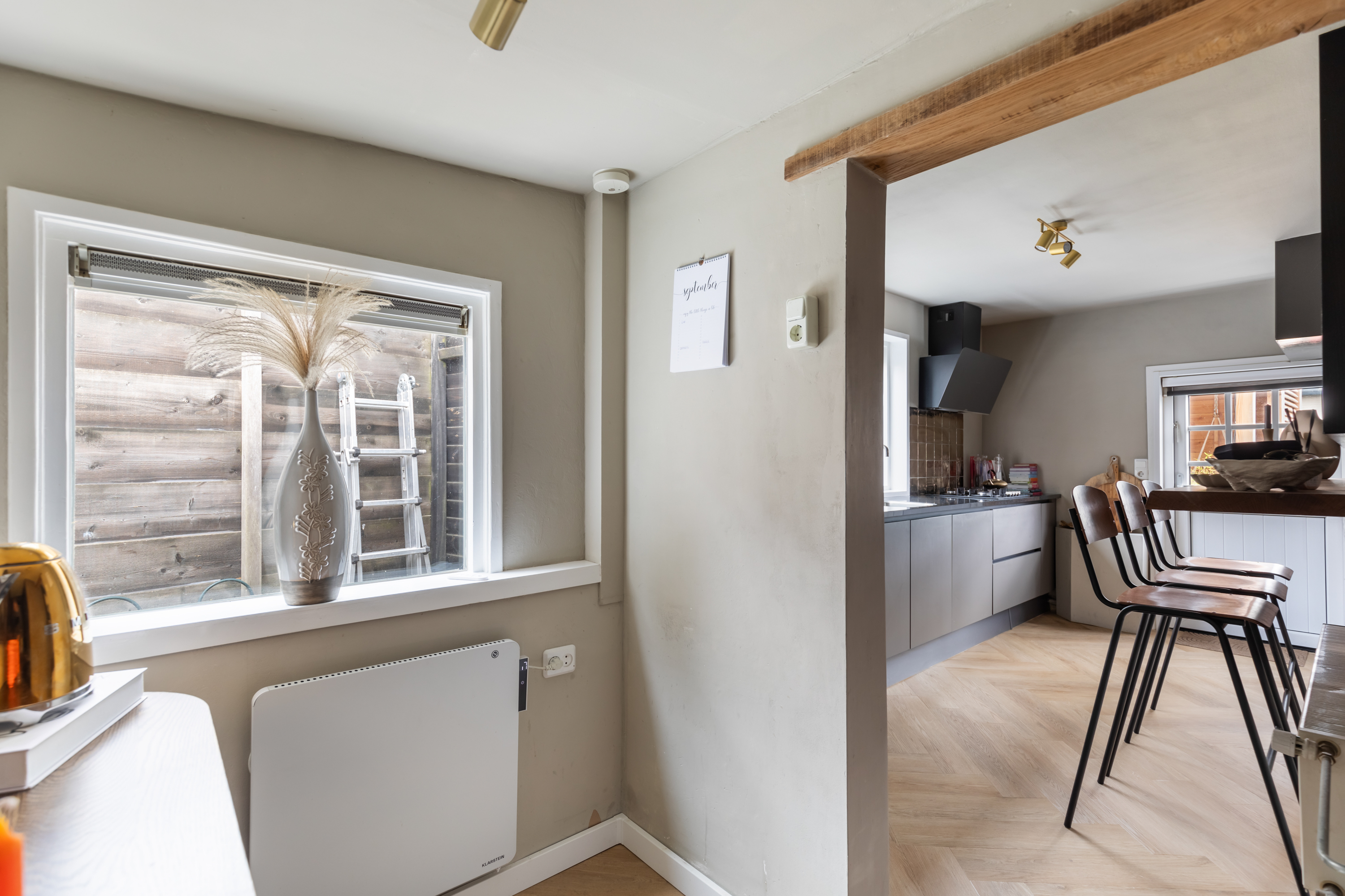 Aansluitend de keuken. Deze is compleet vernieuwd in 2024 en voorzien van een moderne inrichting met o.a. 4-pits gaskookplaat, afzuigkap, vaatwasmachine, oven, koelkast en natuurstenen bovenblad. Hier bevindt zich ook de meterkast (vernieuwd, 10 groepen, 3 aardlekschakelaars). De tweede voordeur geeft toegang tot de voortuin. Naast de keuken een gezellige tussenhal met diverse kast- en bergruimte. Bijkeuken met wasmachine aansluiting en Intergas HR combiketel (huurtoestel à € 37,20 per maand, bouwjaar 2025).