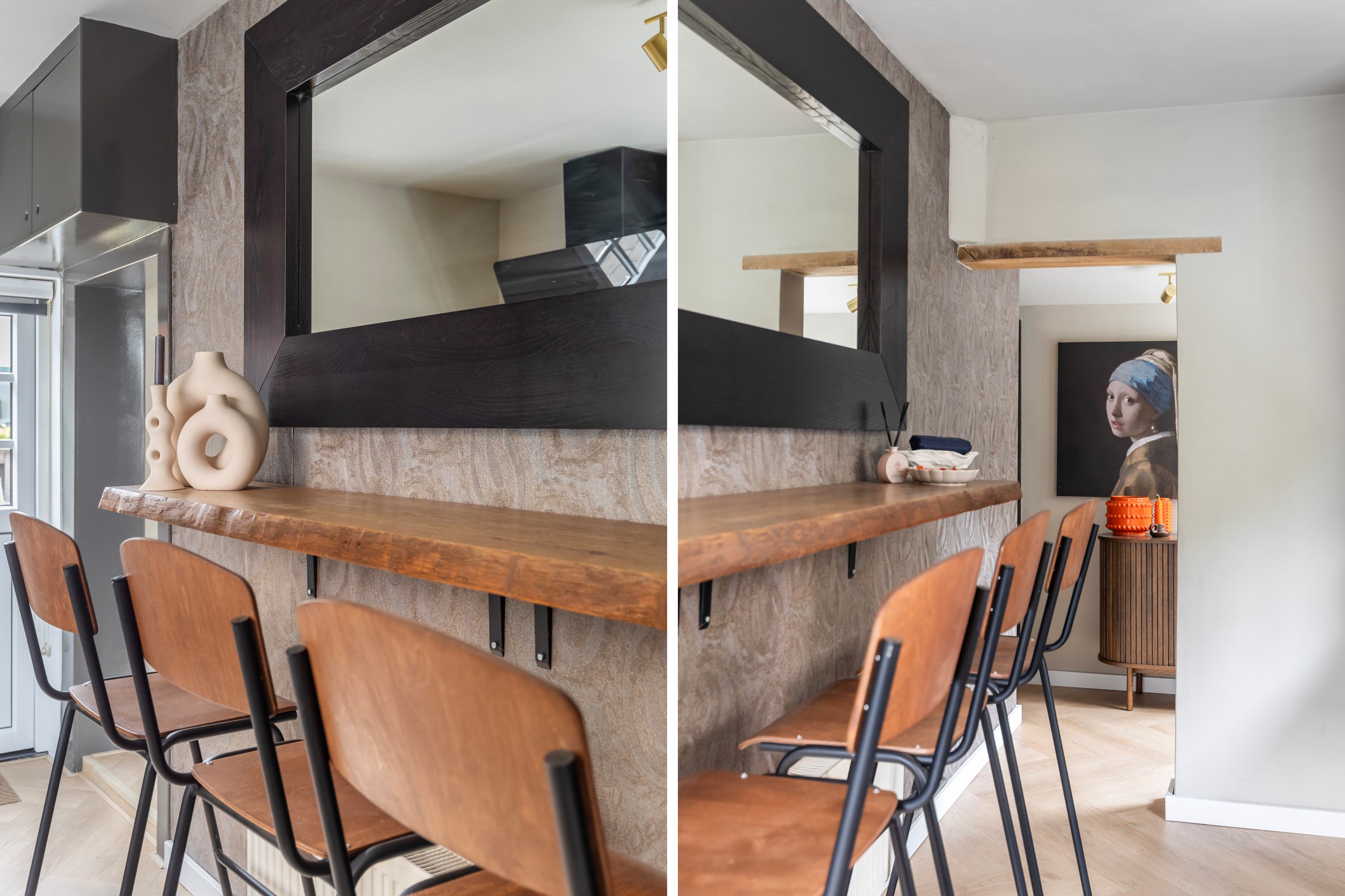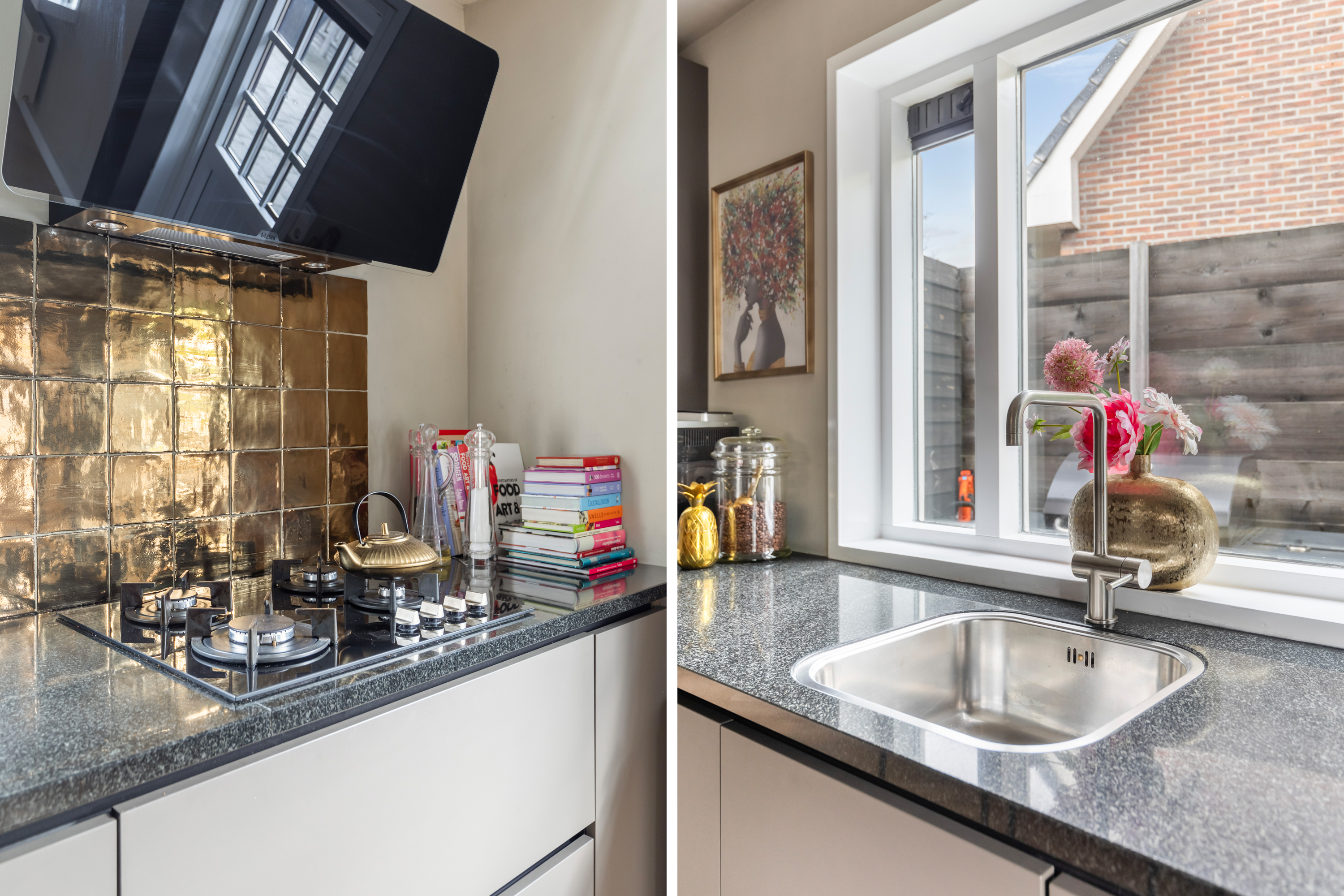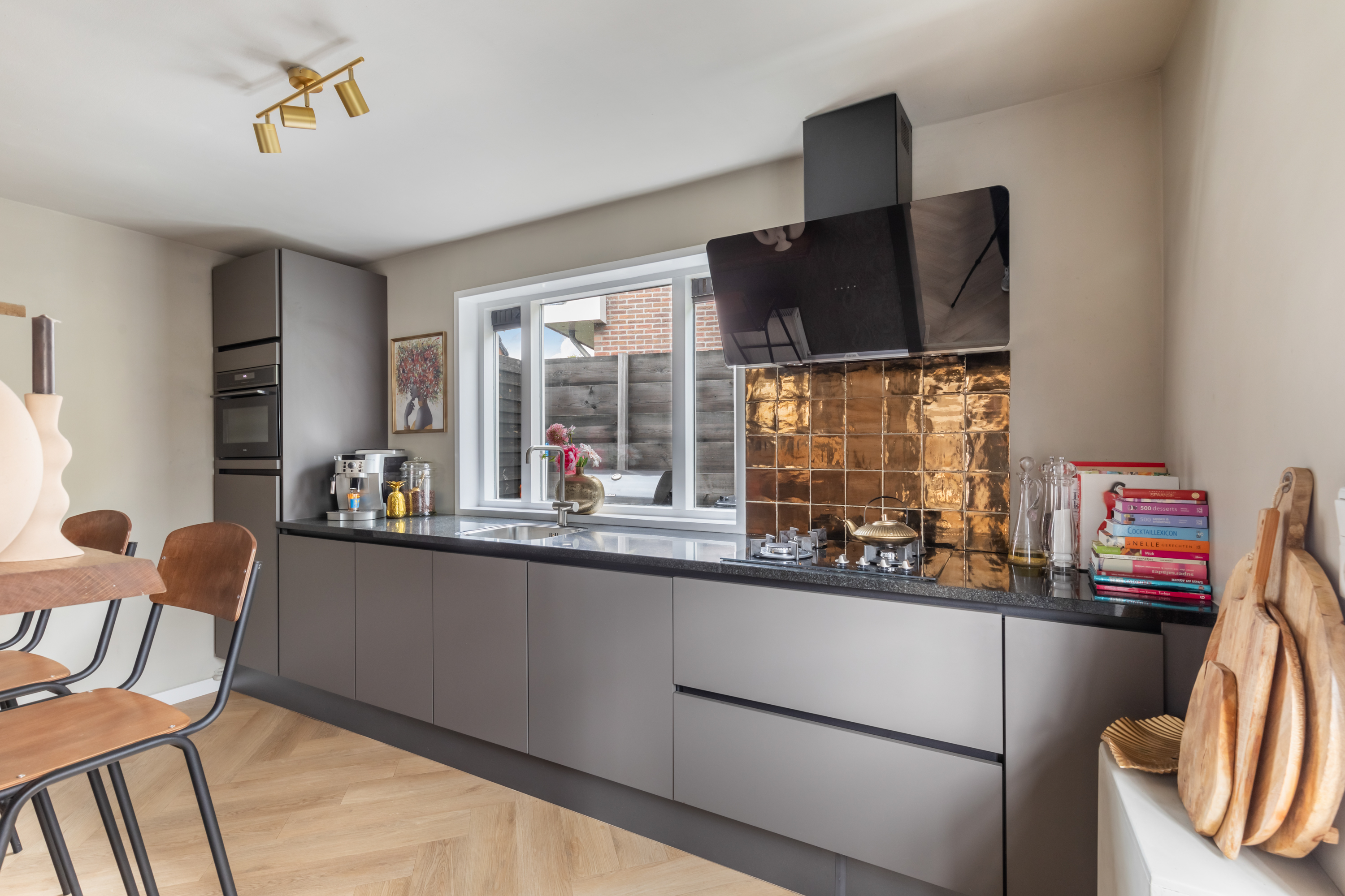 Aansluitend de keuken. Deze is compleet vernieuwd in 2024 en voorzien van een moderne inrichting met o.a. 4-pits gaskookplaat, afzuigkap, vaatwasmachine, oven, koelkast en natuurstenen bovenblad. Hier bevindt zich ook de meterkast (vernieuwd, 10 groepen, 3 aardlekschakelaars). De tweede voordeur geeft toegang tot de voortuin. Naast de keuken een gezellige tussenhal met diverse kast- en bergruimte. Bijkeuken met wasmachine aansluiting en Intergas HR combiketel (huurtoestel à € 37,20 per maand, bouwjaar 2025).