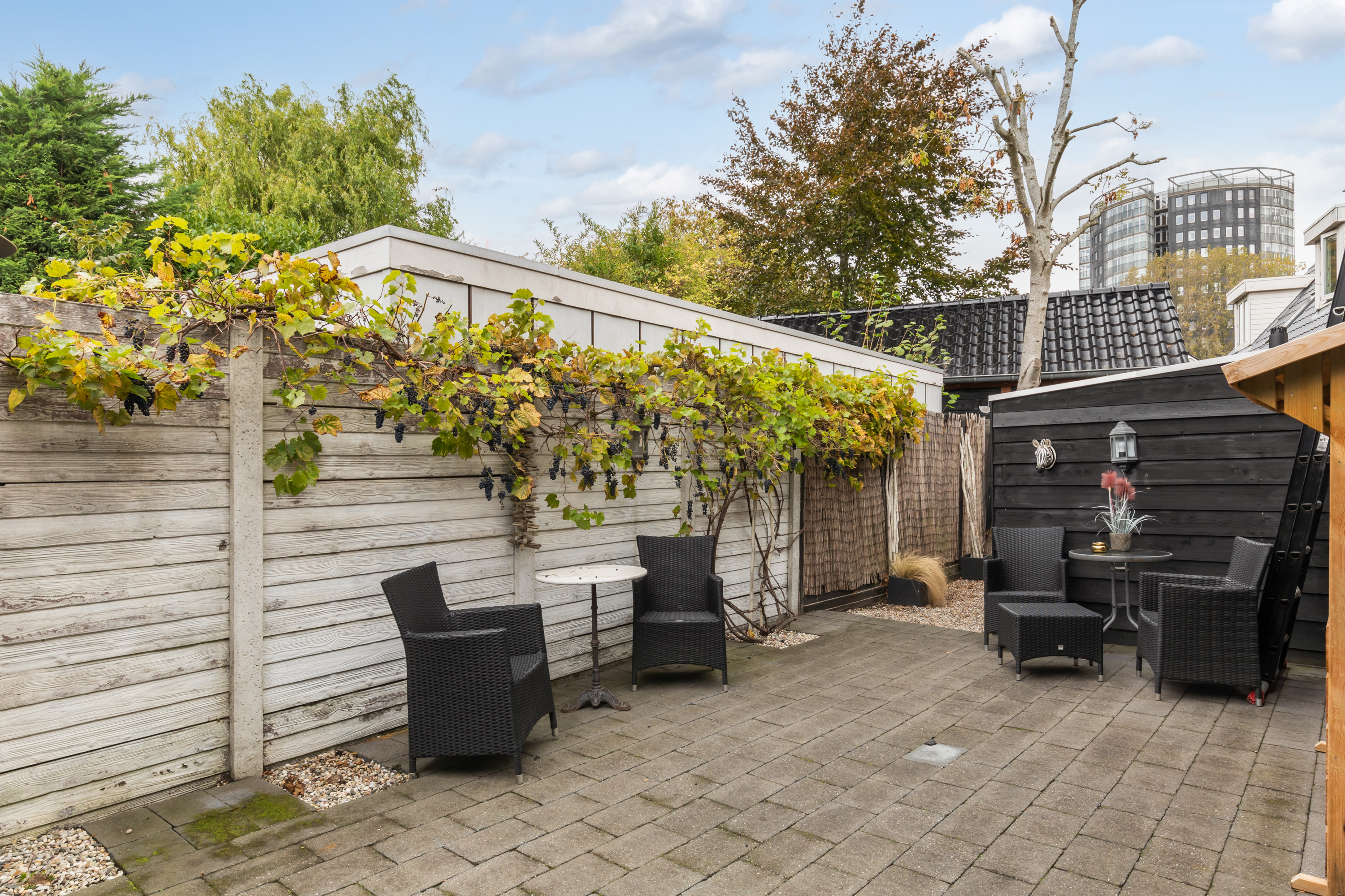 Aan de achterzijde is de houten berging te vinden en een houthok.