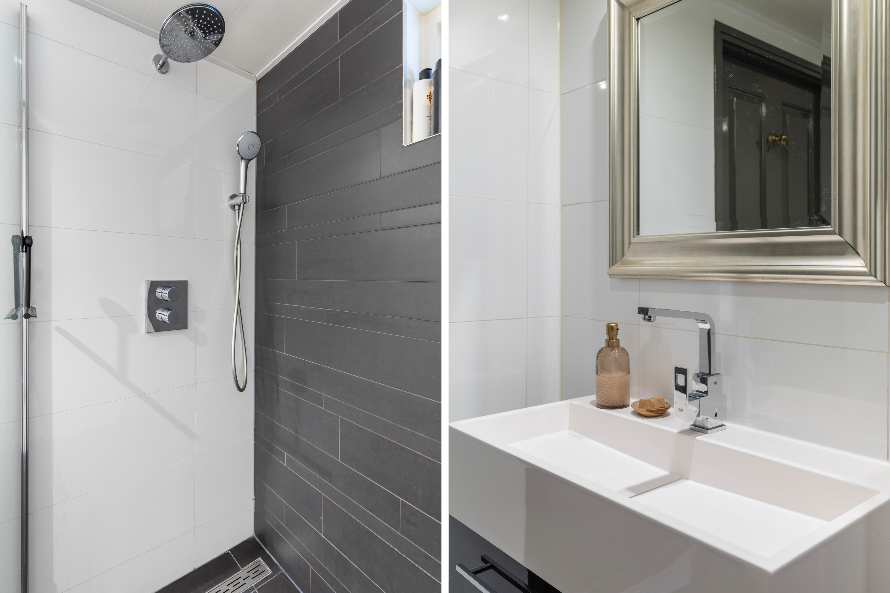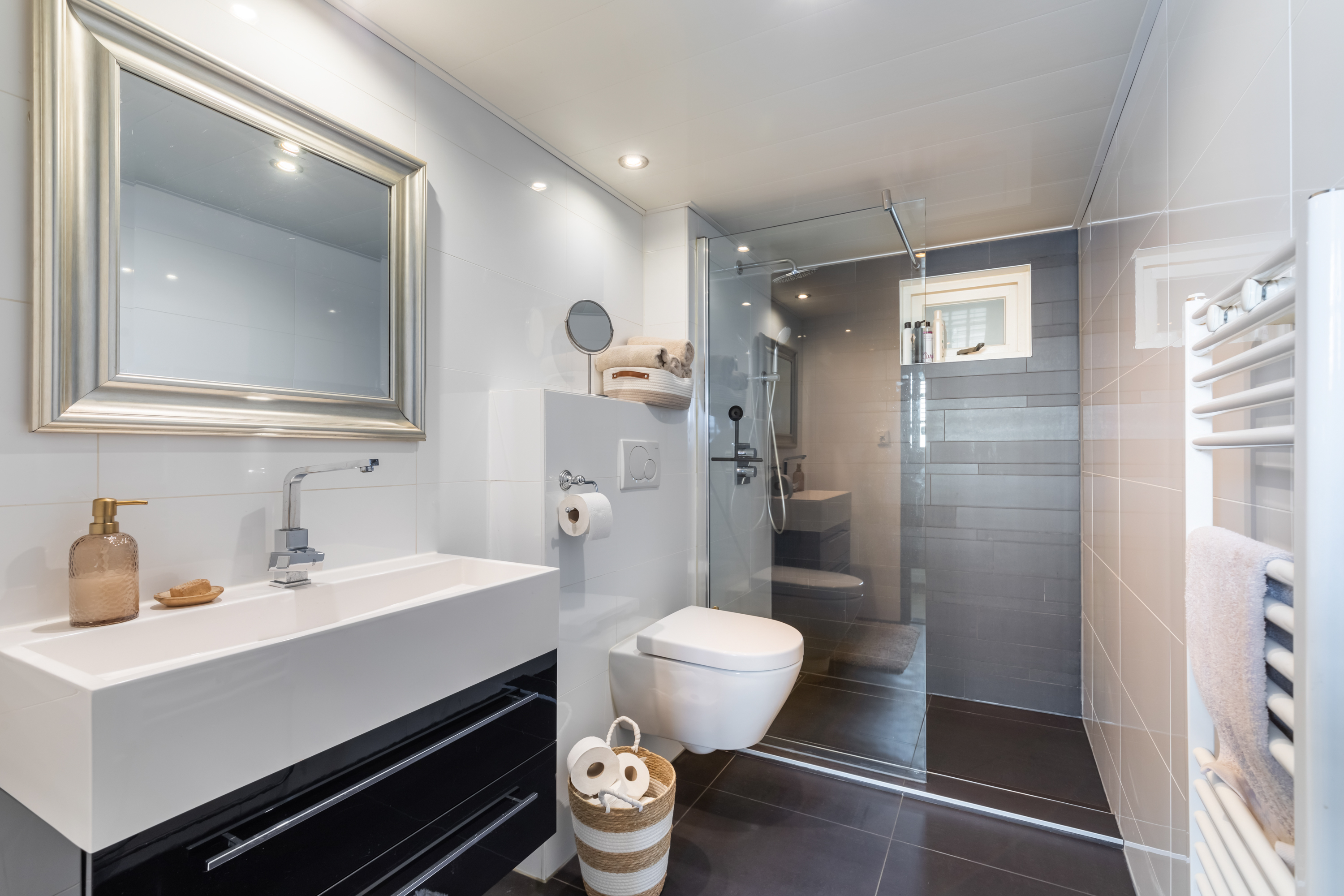 Moderne badkamer, voorzien van een ruime inloopdouche, wastafelmeubel, hangend closet en design radiator. Betegeling tot aan het plafond en een plafond met inbouwverlichting.