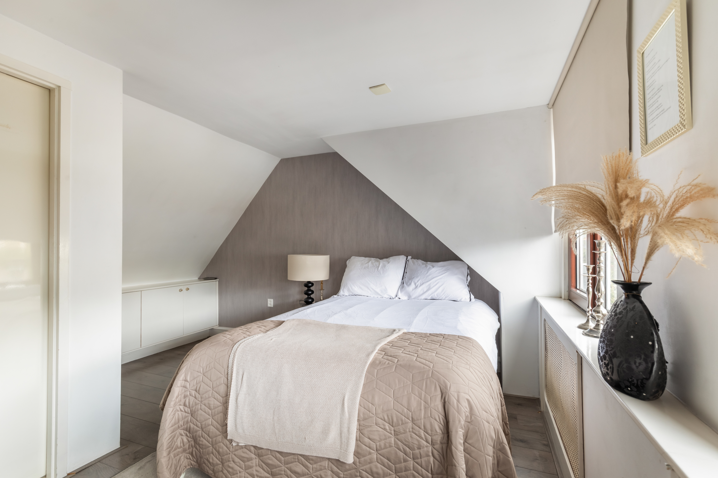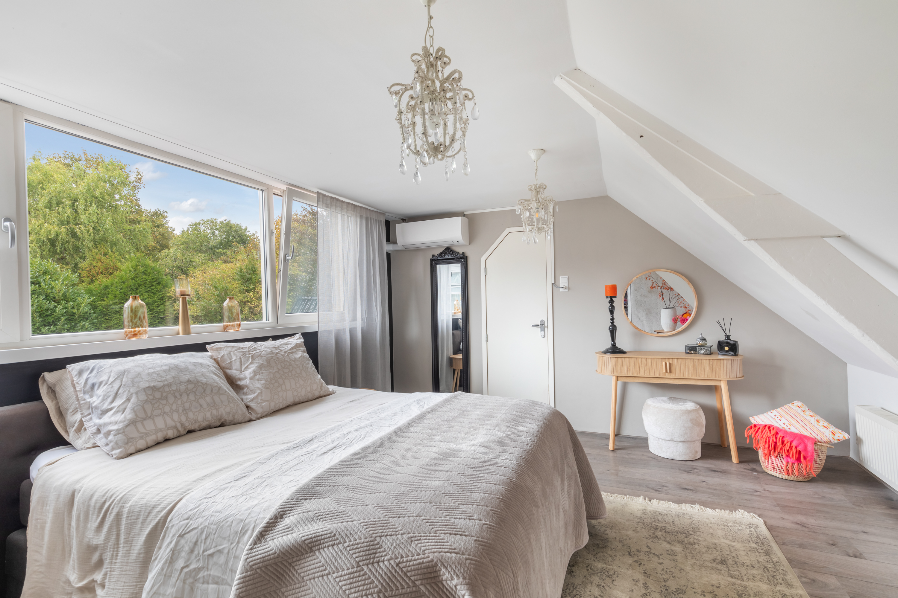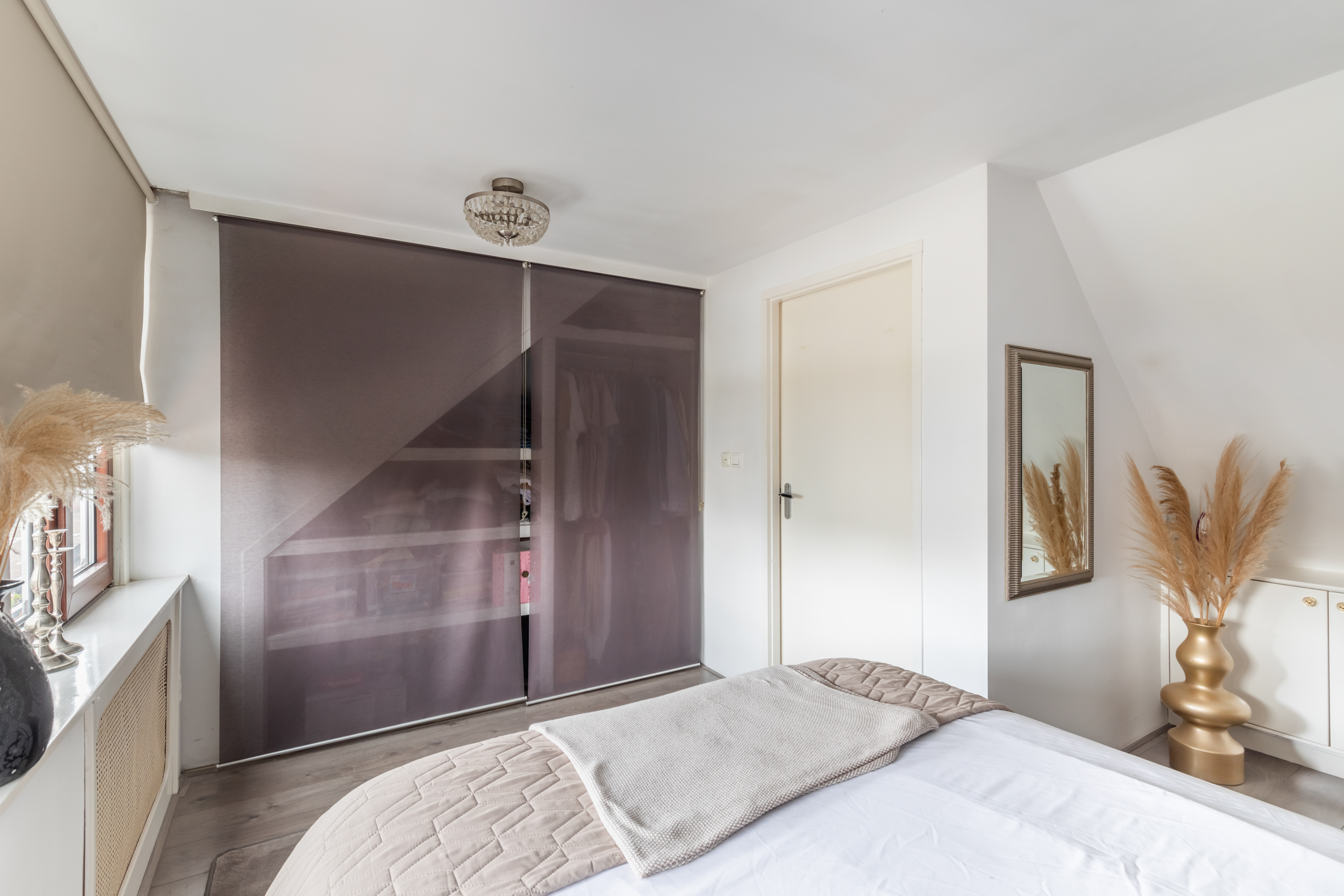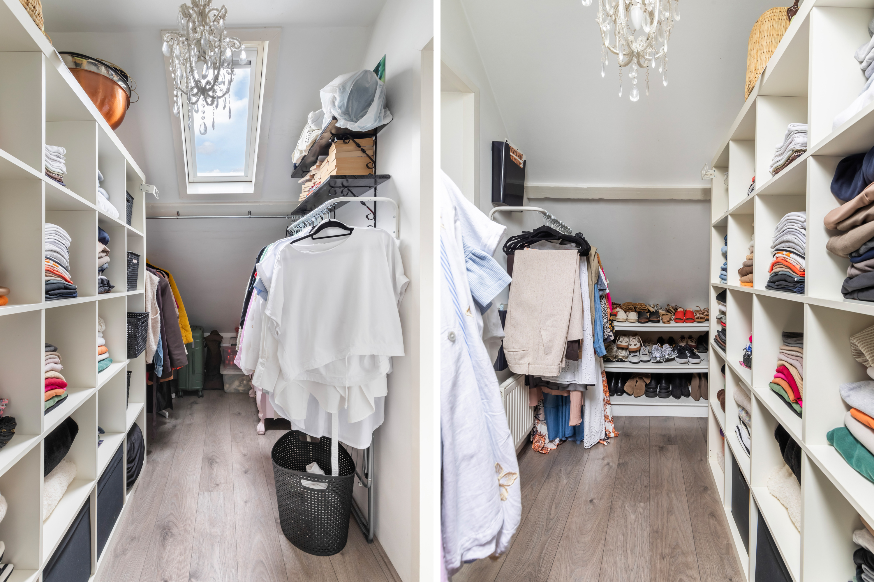Slaapkamer 1, voorzien van een brede dakkapel aan de achterzijde (kunststof) met rolluik en airconditioning. Aansluitend walk-in closet met dakraam.
