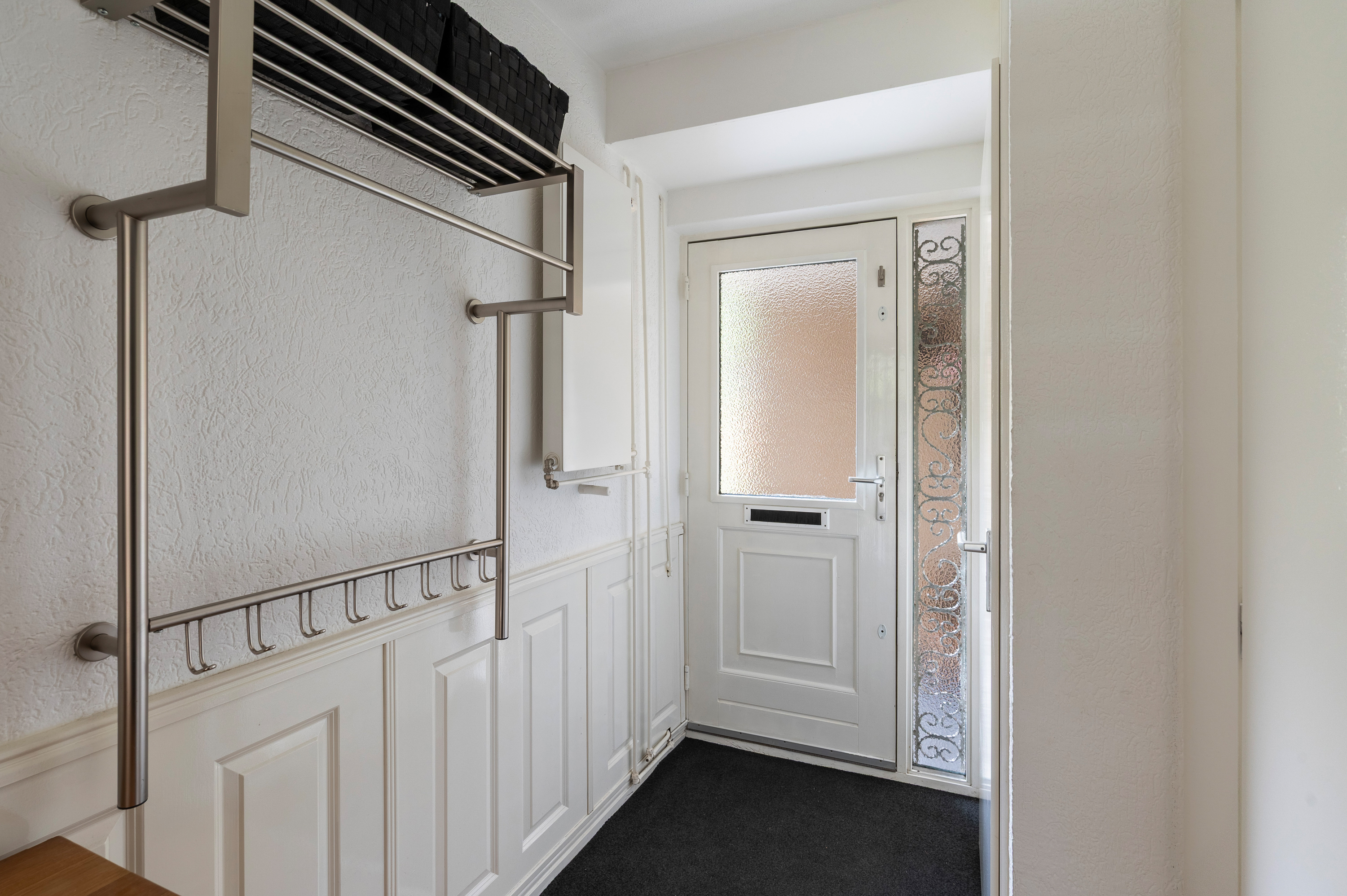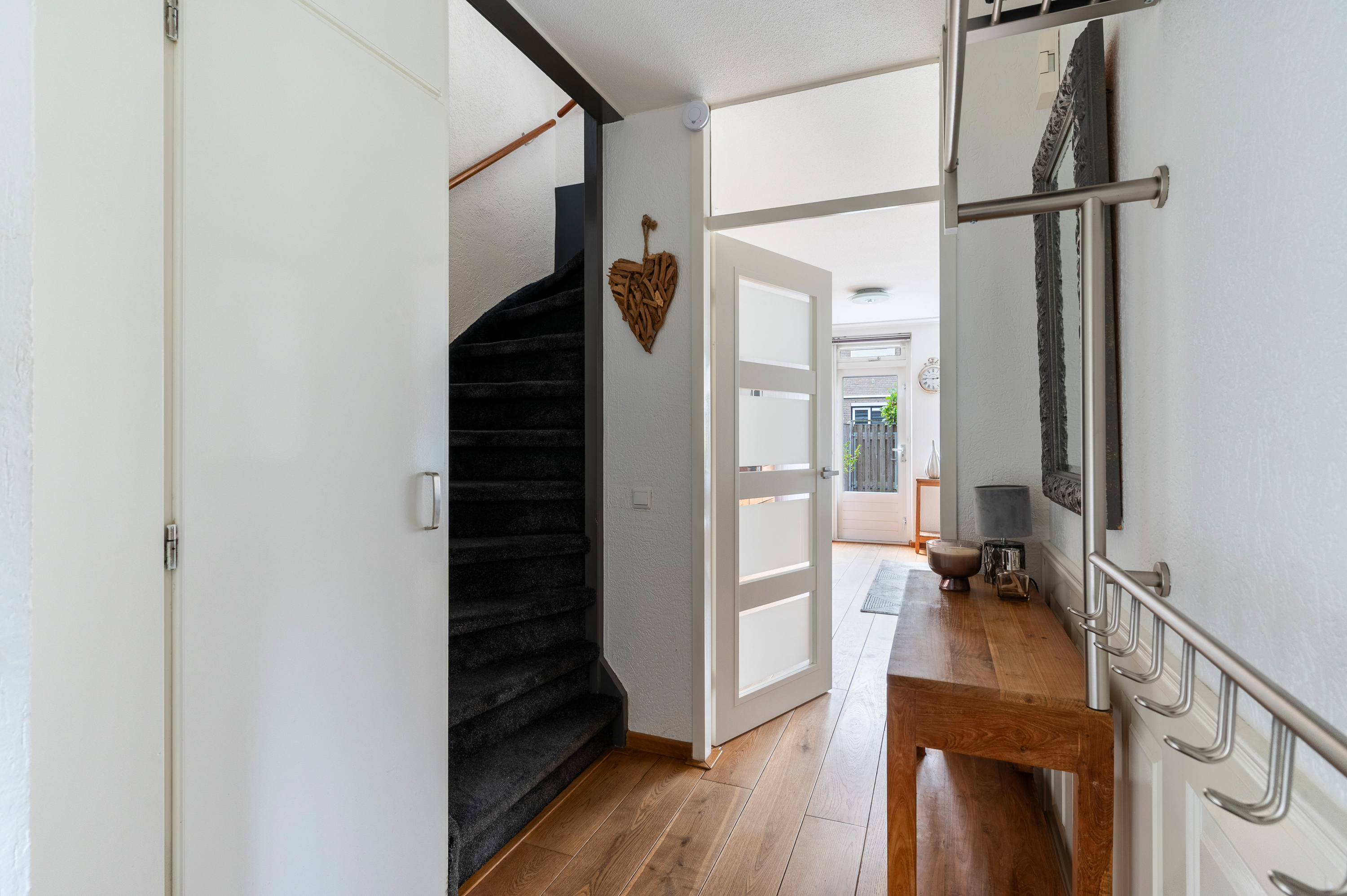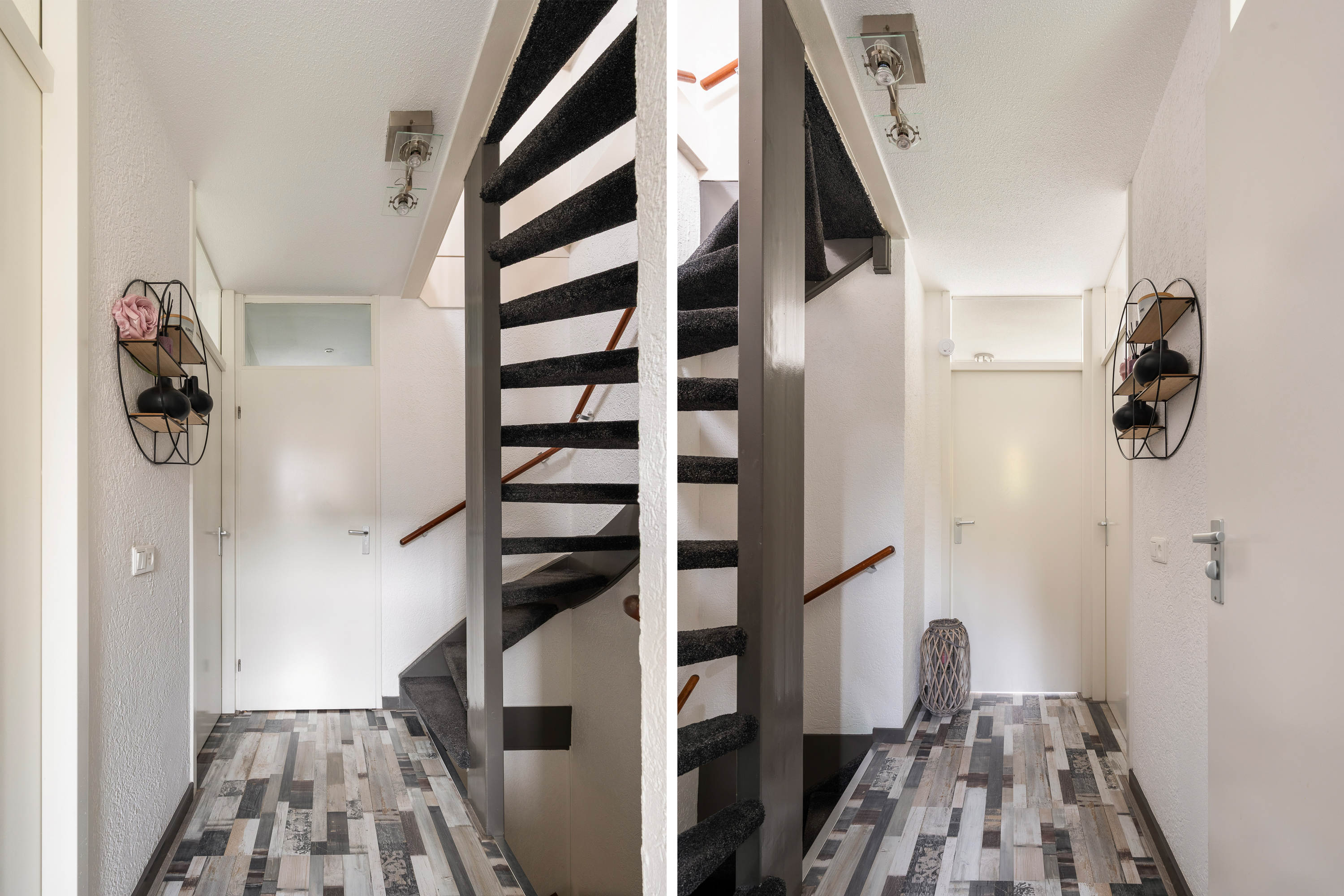 Entree hal/gang met garderobekast/meterkast (vernieuwd) voorzien van 8 groepen, kookgroep, 2 aardlekschakelaars en aansluiting glasvezel. Trapopgang naar de eerste verdieping en tot aan het plafond betegeld modern toilet (2024) met hangend closet en fonteintje.