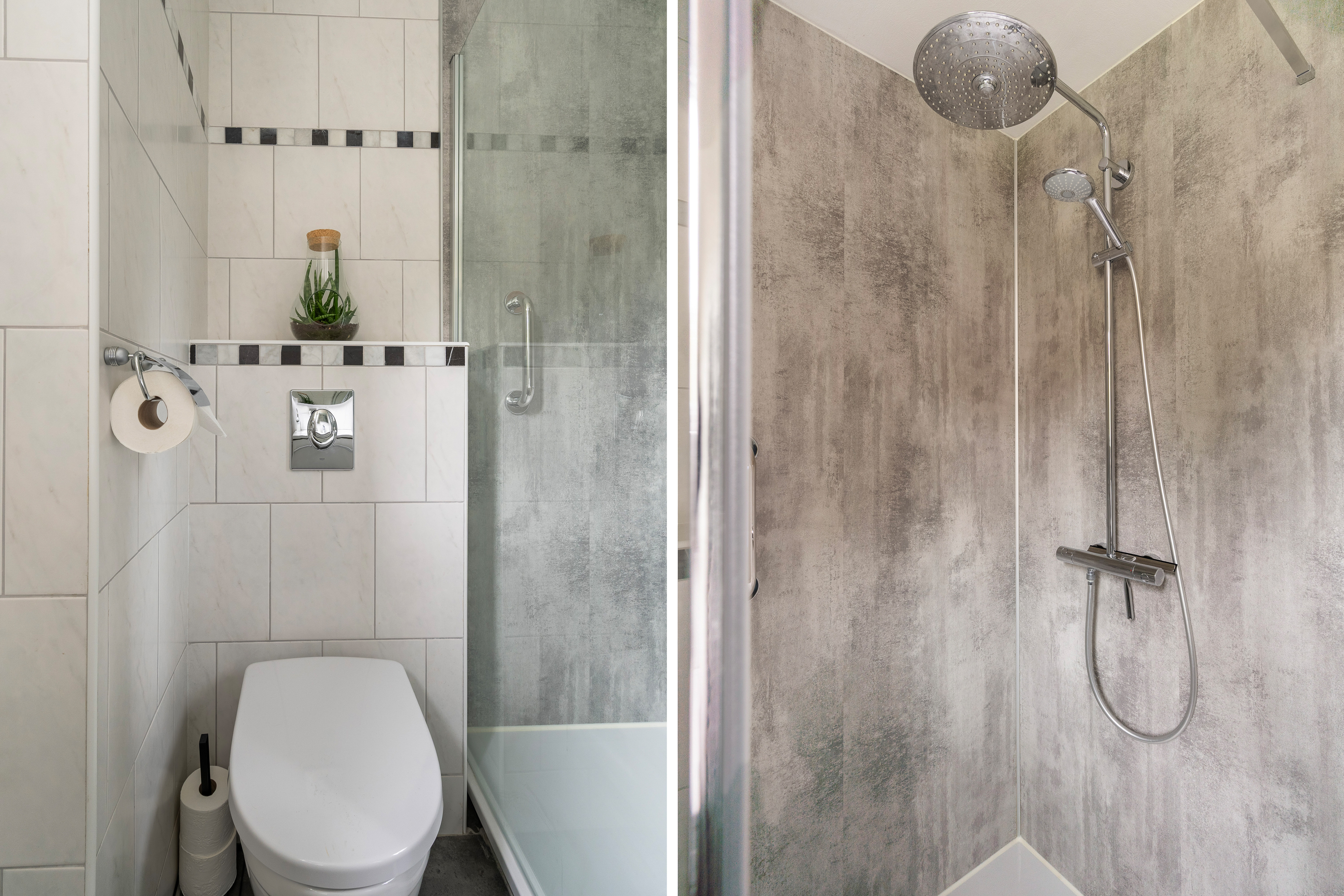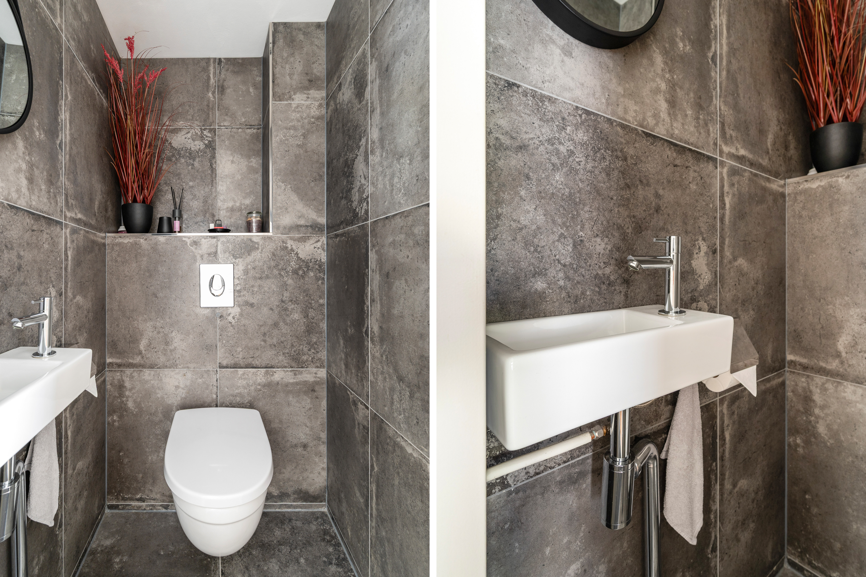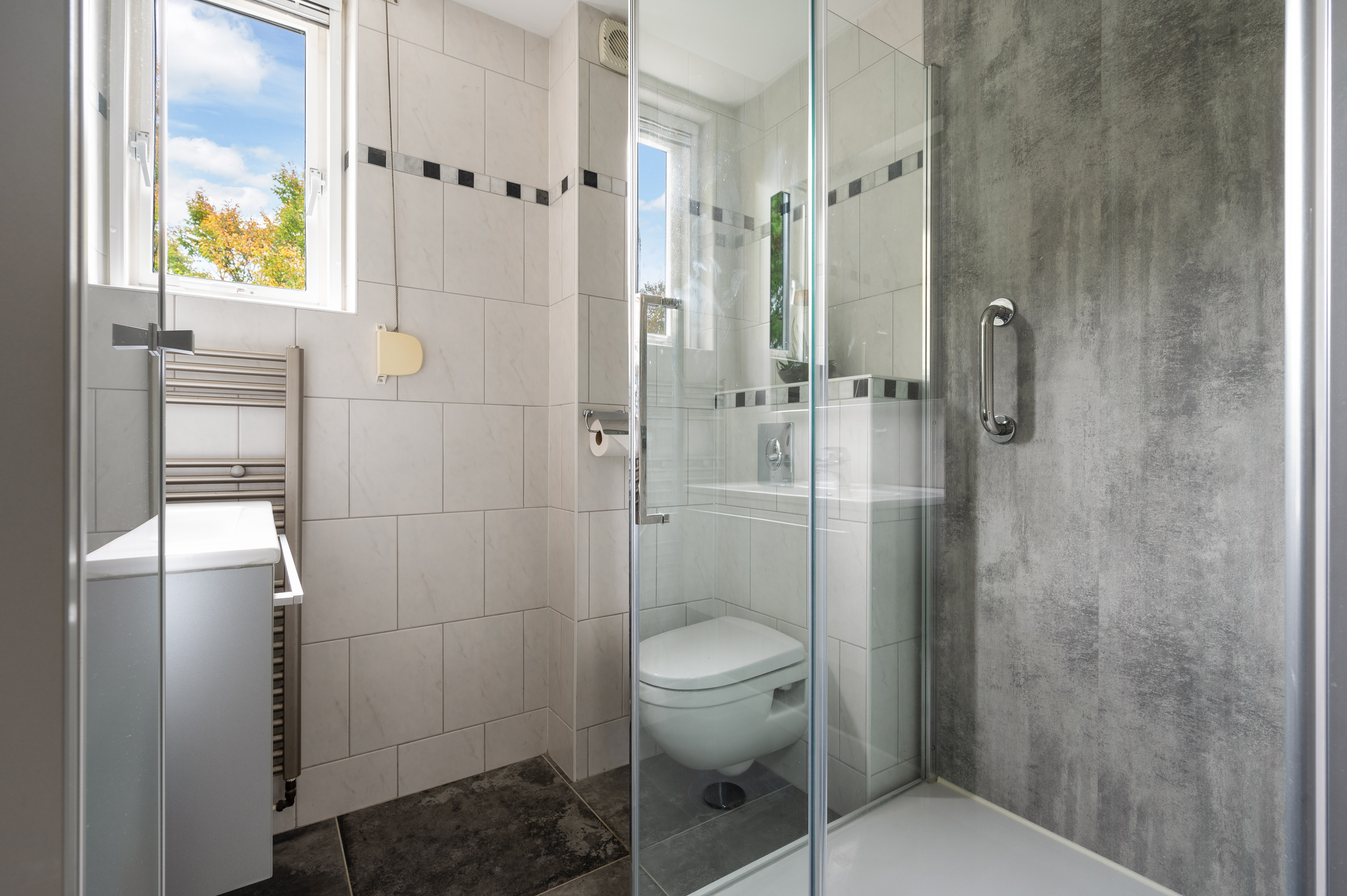 Entree hal/gang met garderobekast/meterkast (vernieuwd) voorzien van 8 groepen, kookgroep, 2 aardlekschakelaars en aansluiting glasvezel. Trapopgang naar de eerste verdieping en tot aan het plafond betegeld modern toilet (2024) met hangend closet en fonteintje.