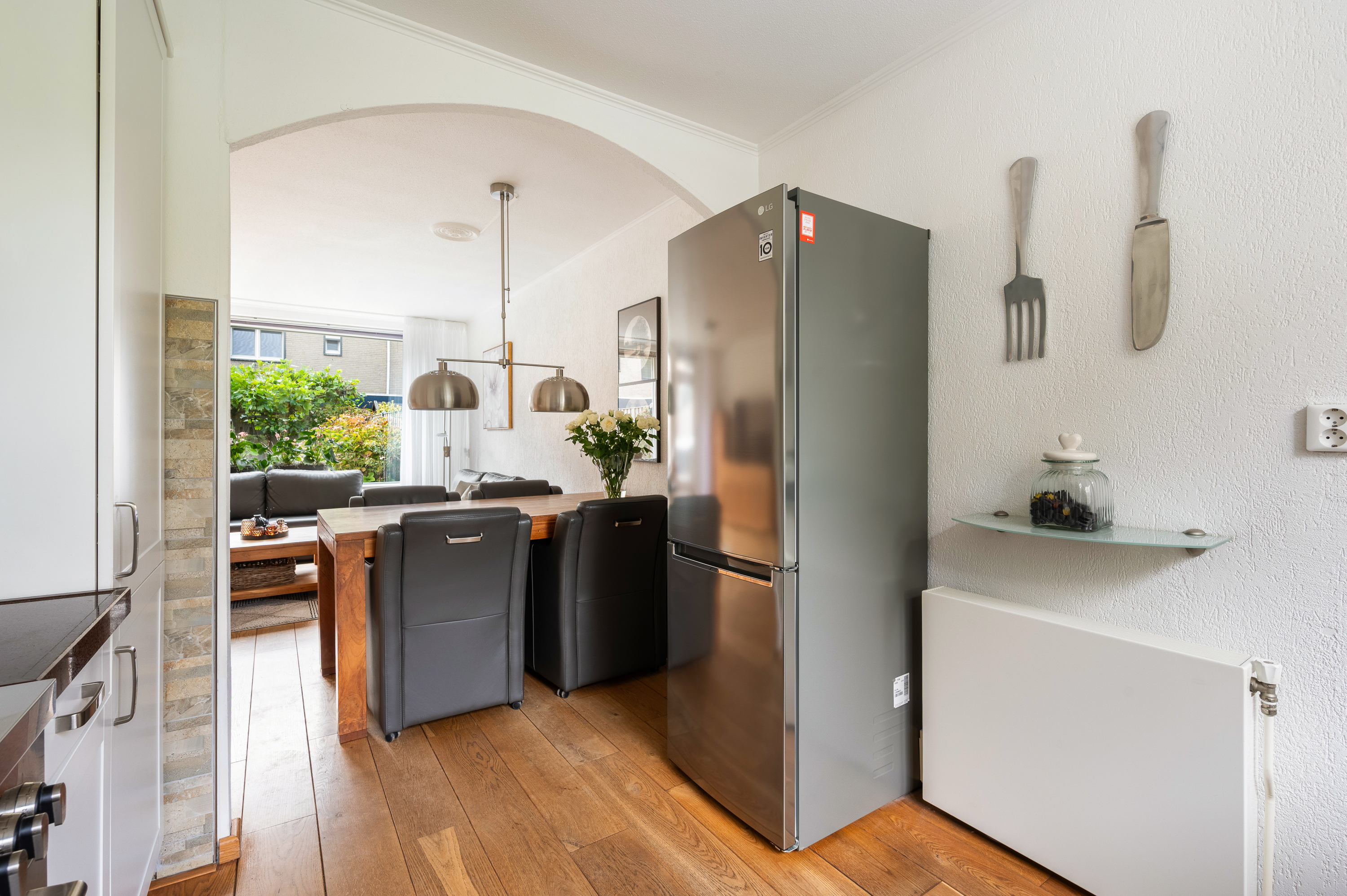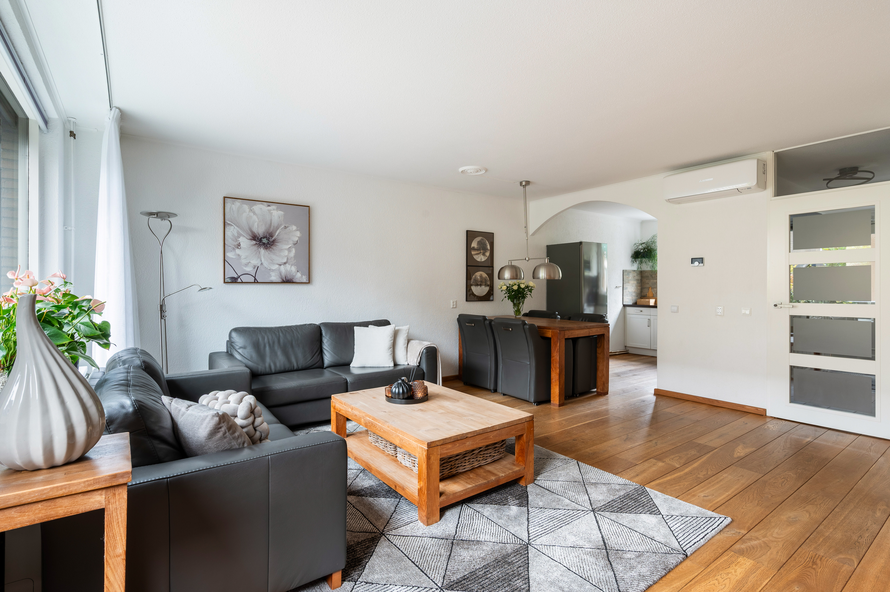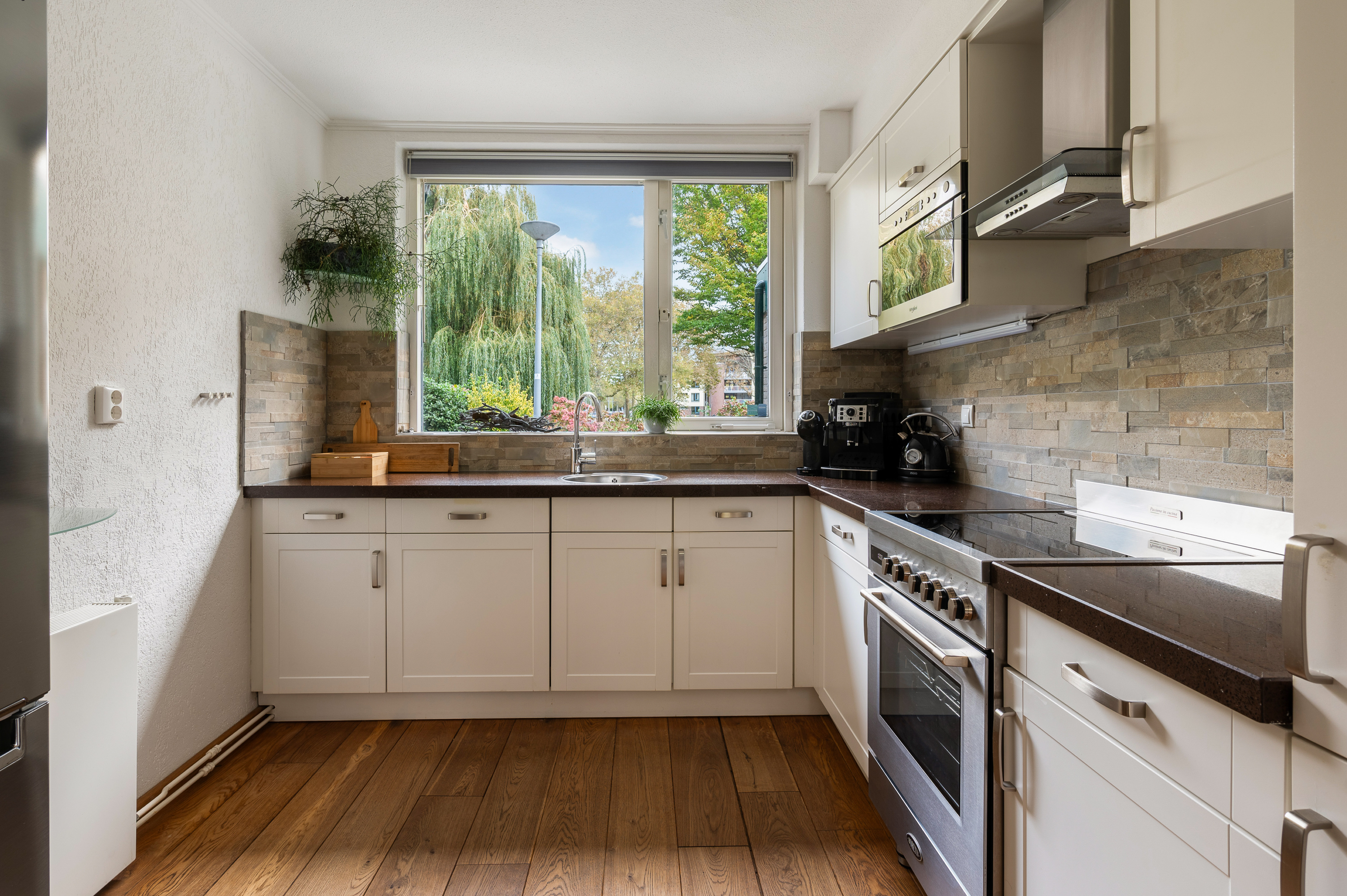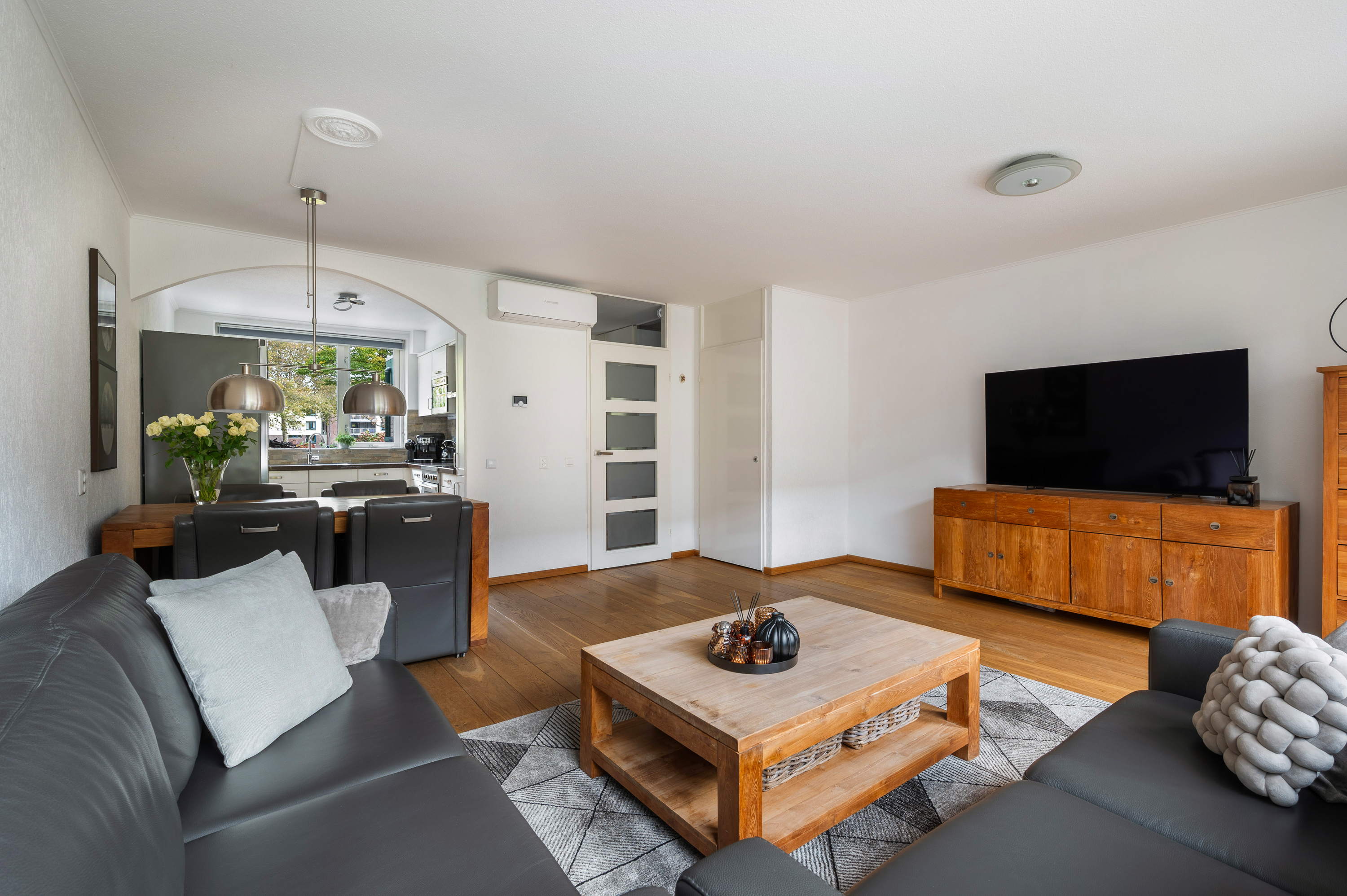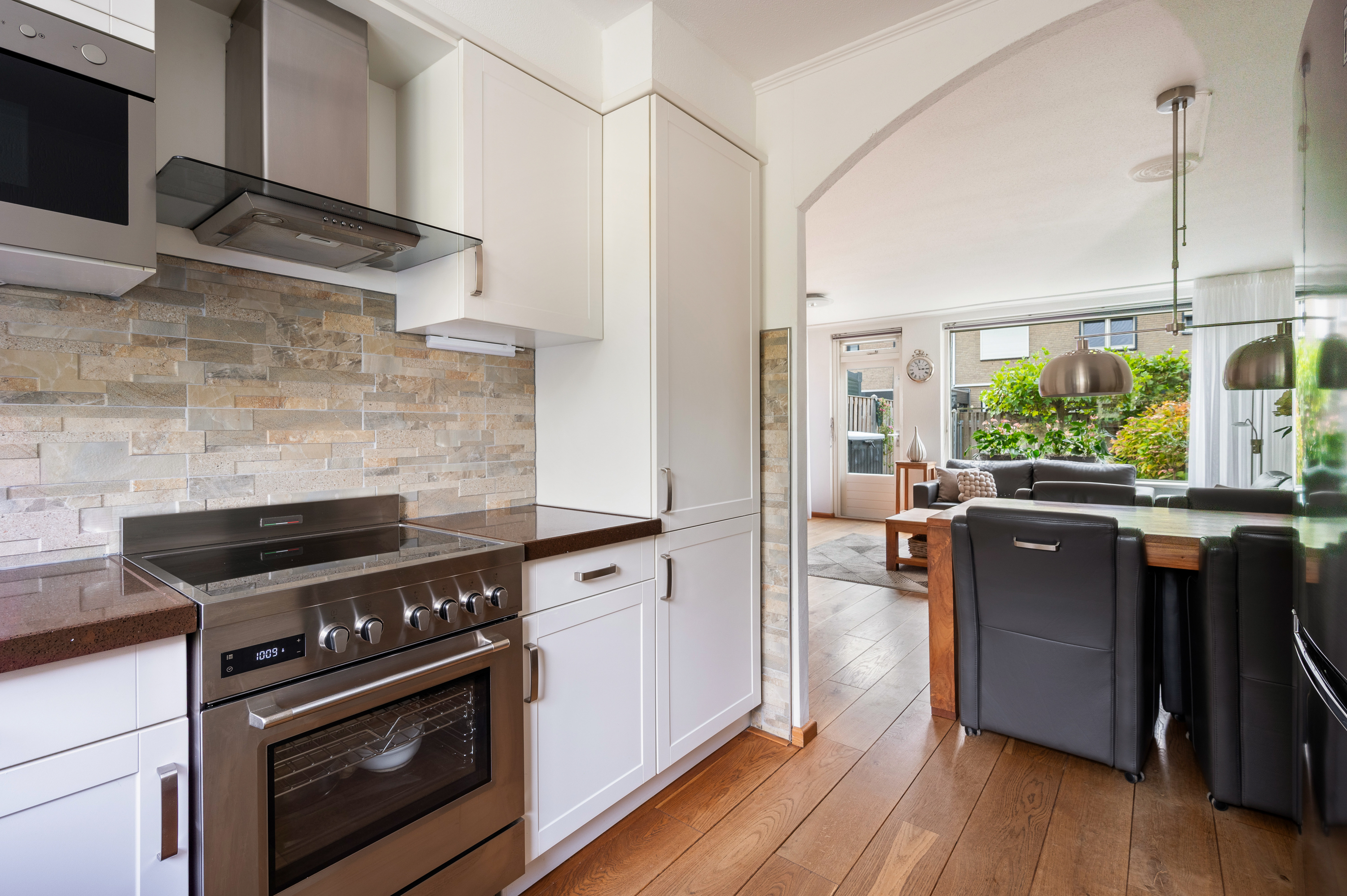 Woonkamer met trapkast en toegang tot de fijne achtertuin. In de woonkamer is een airconditioning geïnstalleerd, bouwjaar 2024, merk Mitsubishi. Aansluitend aan de voorzijde gelegen open keuken. De keuken is geplaatst in hoekopstelling en in 2024 voorzien van compleet nieuwe inbouwapparatuur, o.a. Boretti fornuis met oven en 4-pits inductiekookplaat, afzuigkap, magnetron, vaatwasmachine en koel-/vriescombinatie.
